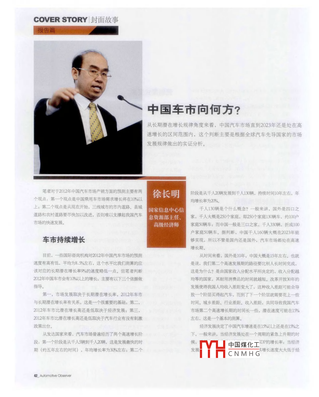 COVER STORY封面故事報告篇中國車市向何方?從長期潛在增長規(guī)律角度來看,中國汽車市場直到2023年還是處在高速增長的區(qū)間范圍內(nèi),這個判斷主要是根據(jù)全球汽車先導(dǎo)國家的市場發(fā)展規(guī)律做出的實證分析。筆者對于2012年中國汽車市場產(chǎn)銷方面的預(yù)測主要有兩徐長明階段是從千人發(fā)展到干人,持時間年左右,年個觀點:第一個觀點是中國乘用車市場需求增長將在10%以均增長率為20形%上;第二個觀點是從現(xiàn)在開始,三線城市的市內(nèi)道路、縣域國家信息中心信千人130輛是個什么概念?一般來講,國外是四口之道路和農(nóng)衣村道路要盡快加以改進,否則難以支起我國汽車息資源部主任、家,干人大概是230個家庭,即20個家庭1X輛車,約10市場的快速發(fā)展。高級經(jīng)濟師家庭輛車;而中國一般是三口之家,千人3輛,折成10戶家庭50輛車。據(jù)判斷,中國千人160輛大概在2023年能車市持續(xù)增長夠?qū)崿F(xiàn),所以不管是國內(nèi)還是國外,汽車市場都處在高速增長期目前,一些國際咨詢機構(gòu)對2012年中國汽車市場的預(yù)測從時間來看,國外是10年,中國大概是15年左右。也就速度有高有低,平均為8.5%左右,這個水平比我們測算的應(yīng)是說,我們第二個高速發(fā)展期的路徑要比別人長時間完成該對應(yīng)的長期潛在增長率9%的速度略低一點。但筆者判斷這是為什么?是由國家收入分配水平所決定的,收入分配越2012年中國車市會有10%以上的增長,主要有以下三個依據(jù)做均等的國家,其耐用消費品的時間就越短。改革開放30年的指導(dǎo)發(fā)展使得我國人均收入差距變大了,這種收入差距可能會導(dǎo)第一,市場發(fā)展取決于長期潛在增長率,2012年車市致一個階層買得起汽車,而到了下一個階層就需要花上一些與長期潛在增長率有關(guān)系,這是一個很重要的基礎(chǔ);第二,時間。城鄉(xiāng)差距、行業(yè)差距、收入差距,共同導(dǎo)致我國汽車012年車市比潛在增長高還是低取決于經(jīng)濟發(fā)展;第三,市場第二個高速增長期的時間長一些,潛在速度可能在15%2012年車市比潛在增長高還是低取決于汽車行業(yè)有沒有刺激左右,這是一個基本的測算政策出臺經(jīng)濟發(fā)展決定了中國汽車增速是在15%以上還是在19之從發(fā)達國家來看,汽車市場普遍經(jīng)歷了兩個高速增長階下,一般來講,當(dāng)經(jīng)濟發(fā)展處在一個周期的緊急上升期的時個階段是從千人5輛到千人2輛,這是發(fā)展最快的時H中國煤化工的增長率,當(dāng)經(jīng)濟期(約五年左右的時間),年均增長率為30%左右;第二個CNMHG增長速度大大低于經(jīng)42 Automotive Observer車觀察 AUTOMOTME OBSERVER01 February 2012濟發(fā)展的速度,有時甚至?xí)秦撛鲩L;當(dāng)經(jīng)濟發(fā)展處在平穩(wěn)千人保有量20輛增長時,乘用車的速度增長最接近于經(jīng)濟發(fā)展的速度第一個高速增長期第二個高速增長期從政策方面來講,2009年出現(xiàn)了一些特殊政策,如汽車■持續(xù)5年左右■持續(xù)10年左右下鄉(xiāng)、養(yǎng)路費取消、油價下降等;2010年又出臺了新政策;■銷量年均增長30%■銷量年均增長20%千人保有量=5■千人保有量=130到了2011年所有優(yōu)惠政策都退出了,車市放緩是因為兩個不利因素的疊加;2012年應(yīng)該不會有什么特別的政策出臺。孕自期銷量平均增速普及期銷量平均增速從目前情況來看,宏觀政策還處在調(diào)控階段,所以2012日本1960-1964358%6日本19651973222%韓國1981-1985250%韓國19861997年不可能對汽車采取全局性的鼓勵政策,但全局性的限制政中國2001-20083046(25%)中國200920231315%策也不太可能出現(xiàn)。這并不排除可能會有區(qū)域性的限購政策出臺,一個城市出臺限購政策可能影響不大,但如果有兩三個、三四個城市出臺這種限購政策后,影響就大了。所以對于2012年中國汽車市場產(chǎn)銷增長測算的一個結(jié)果就是在15%以一乘用車千人保有量下,但肯定是在106上。第一高速期第二高速期改善三線以下公路建設(shè)第二個觀點,就是盡快對三線地區(qū)的城市市內(nèi)道路,縣154°aa1k2043城還有縣以下的道路,包括農(nóng)村道路盡快做出一些改善,就像當(dāng)初做農(nóng)村電網(wǎng)改造、大力刺激農(nóng)村家電消費那樣?,F(xiàn)在對三線城市以下的地方,汽車市場還在自己的規(guī)律中轉(zhuǎn)移,但是那些地方的道路情況遠遠不如北京等一線城市。筆者認為,未來中國汽車市場需求增長點會在二三線城市,特別是三線城市,主要有兩方面的原因:一是由發(fā)展階1~3線城市市場份額變化:量變到質(zhì)變段所決定的,北京、上海、廣州等一線城市2011年千人保有24.7%27.3%量為24%,2012年差不多就能到千人16輛;另一方面是發(fā)展29.3%291%3線規(guī)律所決定的,中國汽車市場還處在第一個高速增長期。39.6%399%39.9%402%■2線正如我們看到的那樣,中國經(jīng)濟正在加速向二三線城市轉(zhuǎn)移,未來這個趨勢還會繼續(xù)延續(xù)下去,主要有兩方面的原32.8%307%■1線因:一個就是東部地區(qū)有產(chǎn)業(yè)轉(zhuǎn)出的壓力,像廣東、上海、江蘇等城市,我國改革開放先是從這些城市開始的,吸引的外資就在這些地方,所以這里會有一大批勞動力密集型的產(chǎn)業(yè)2010年不同級別城市的千人保有量水平中西部地區(qū)現(xiàn)在是在承接產(chǎn)業(yè)