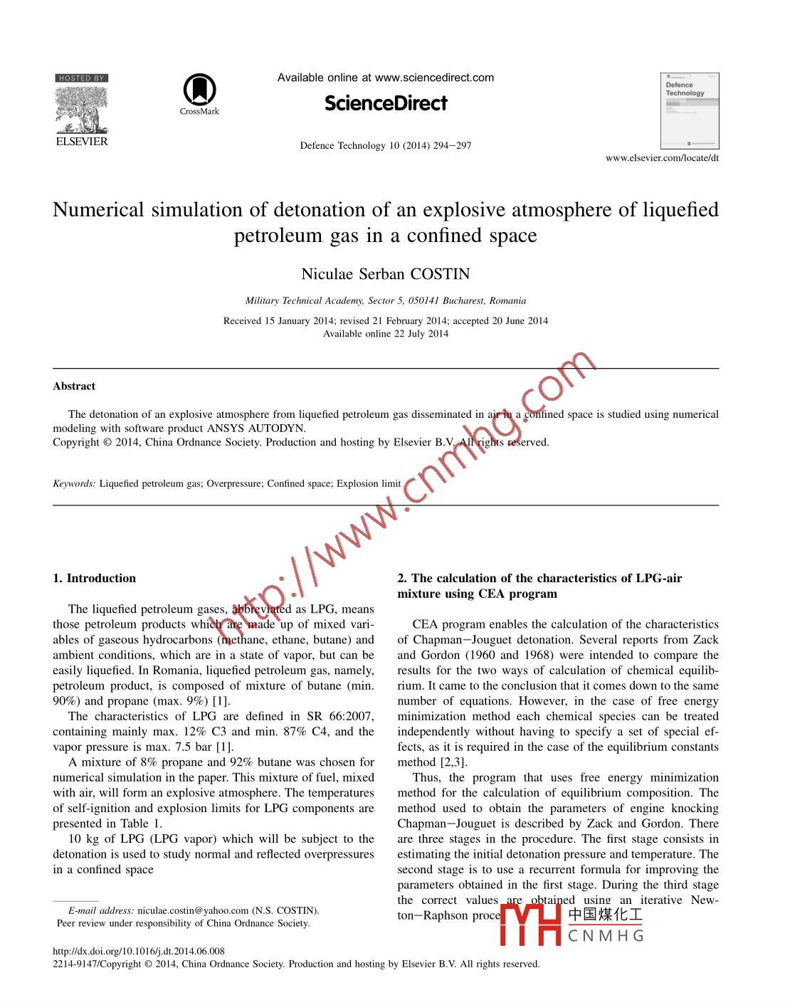Available online at www.sciencedirect.comDefenceTechnology①ScienceDirectCrossMarkEL SEVIERDefence Technology 10 (2014) 294- -297www.elsevier.com/locate/dtNumerical simulation of detonation of an explosive atmosphere of liquefiedpetroleum gas in a confined spaceNiculae Serban COSTINMilitary Technical Academy, Sector 5, 050141 Bucharest, RomaniaReceived 15 January 2014; revised 21 February 2014; accepted 20 June 2014Available online 22 July 2014AbstractThe detonation of an explosive atmosphere from liquefied petroleum gas disseminated in air in a confined space is studied using numericalmodeling with software product ANSYS AUTODYN.Copyright o 2014, China Ordnance Society. Production and hosting by EIsevier B.V. All rights reserved.Keywords: Liquefied petroleum gas; Overpressure; Confined space; Explosion limit1. Introduction2. The calculation of the characteristics of LPG-airmixture using CEA programthose petroleum products which are made up of mixed vari-CEA program enables the calculation of the characteristicsables of gaseous hydrocarbons (methane, ethane, butane) andof Chapman-Jouguet detonation. Several reports from Zackambient conditions, which are in a state of vapor, but can beand Gordon (1960 and 1968) were intended to compare theeasily liquefied. In Romania, liquefied petroleum gas, namely, .results for the two ways of calculation of chemical equllib-petroleum product, is composed of mixture of butane (min.rium. It came to the conclusion that it comes down to the same90%) and propane (max. 9%) [1].number of equations. However, in the case of free energyThe characteristics of LPG are defined in SR 66:2007,minimization method each chemical species can be treatedcontaining mainly max. 12% C3 and min. 87% C4, and theindependently without having to specify a set of special ef-vapor pressure is max. 7.5 bar [1].fects, as it is required in the case of the equilibrium constantsA mixture of 8% propane and 92% butane was chosen formethod [2,3].numerical simulation in the paper. This mixture of fuel, mixedThus, the program that uses free energy minimizationwith air, will form an explosive atmosphere. The temperaturesmethod for the calculation of equilibrium composition. Thof self-ignition and explosion limits for LPG components aremethod used to obtain the parameters of engine knockingpresented in Table 1Chapman- -Jouguet is described by Zack and Gordon. There10 kg of LPG (LPG vapor) which will be subject to theare three stages in the procedure. The first stage consists indetonation is used to study normal and reflected overpressuresestimating the initial detonation pressure and temperature. Thein a confined spacesecond stage is to use a recurrent formula for improving theparameters obtained in the first stage. During the third stagethe correct valuesare obtained using a ierative New-E-mail address: niculae.costin@ yahoo.com (N.S. COSTIN).ton-Raphson proc中國(guó)煤化工Peer review under responsibility of China Ordnance Society.YHCNMH Ghtp:/:.o.o.o/10.016/./.14./6.008 .2214-9147/Copyright◎2014, China Ordnance Society. Production and hosting by Elsevier B.V. All rights reserved.N.S. COSTIN/ Defence Teclmology 10 (2014) 294- -297295Table 1pl1_ P1=0Heat of combustion for various fuels [6].P(7GasFormulaHeat of combustion/(KJ mol ')h"-1h2=0.PropaneC3HgInitial estimated temperature ratio is found by calculatingButaneC4Ho-2877.5the flame temperatures corresponding to enthalpy [9].IsobutaneC.Hno- 2869.0h2= hy :t 3RTi(84MThe program assumes that all gases are ideal processesThe initial estimates for the values (號(hào))o and (號(hào))o .involved, and the interactions between the phases are neglec-corresponding to h2 are improved to give the followingted [8,10]. The equation of state for the gas mixture isrecursive formulas.pV = nRT,1). 1+ Ys.24r5s,2Qk _(9or().-2rs;2QXk(1+ rs2)5 = nRT,2)3R()。where p is pressure (N/m2); V is specific volume (m3/kg); n is(),=()。-4 MrCp,2the number of moles per unit of mass mixture (mol/kg); T isRyY.2 寶一1(10)temperature (K); and R = 8314.51 J/(mol-' K- ).2MICp.2 In+1 (P+)k+1Based on the definition of the gas mixture, n can be written(會(huì))急(11)1=2”,(3)rt+1=an(中)where n is the number of moles; and is the number of moles ofgas per kg of mixture.where M2,Ys.2 and Cp2 are the steady values for (號(hào))。si (語(yǔ))o.In a conventional manner, an average molecular weight ofAfter running the CEA program, the parameters corre-the mixture issponding to a gaseous LPG-air mixture (Table 2) werecalculated, which will be introduced into the model of materialEji n;M;to be used in AUTODYN. The values were calculated ac-MW=4)2mηjcording to the temperature of 18 °C and a pressure of 1 bar.It can be seen from Table 2 that the maximum overpressureFor iterative purposes, since are valid for the shock equa-corresponds to a volume of 4% LPG vapor into the air. We willtions, it is necessary for these three conservation equations tomake the simulation of detonation for this gaseous mixture.be reduced to two3. The detonation of an explosive atmosphere usingP2i=1-ra2(()5)modeling in Ansys AutodynLPG-air mixture is defined as a material using the char-Rr,T2h2=h+2M2|(2)-1|6)acteristics calculated by C.E.A program. One- dimensionalnumerical model of this new defined material, with a pre-For ease of writing the iterative equations, symbols pl anddefined geometry type“wedge", for a spherical explosivehl" are used to replace the right member of the above equa-cargoes in open space is shown in Fig. 1. Detonation point isions. These equations becomein (0,0).Table 2Characteristics of gaseous LPG-air mixture calculated with CEA program.%vol.LPGinDetonation pressureTemperature ofSpeed of detonationDensity reagent products/initialthe airPD [bar] gasdetonation T/(°K)V/(m.sdensity of gas (RHO/RHO).511.8501954.771457.3| 中國(guó)煤化工18.4012786.301777.719.4222814.441830.2MHCNMHG18.7072586.471806.717.6442310.141754.81.745096N.S. COSTIN/ Defence Technology 10 (20