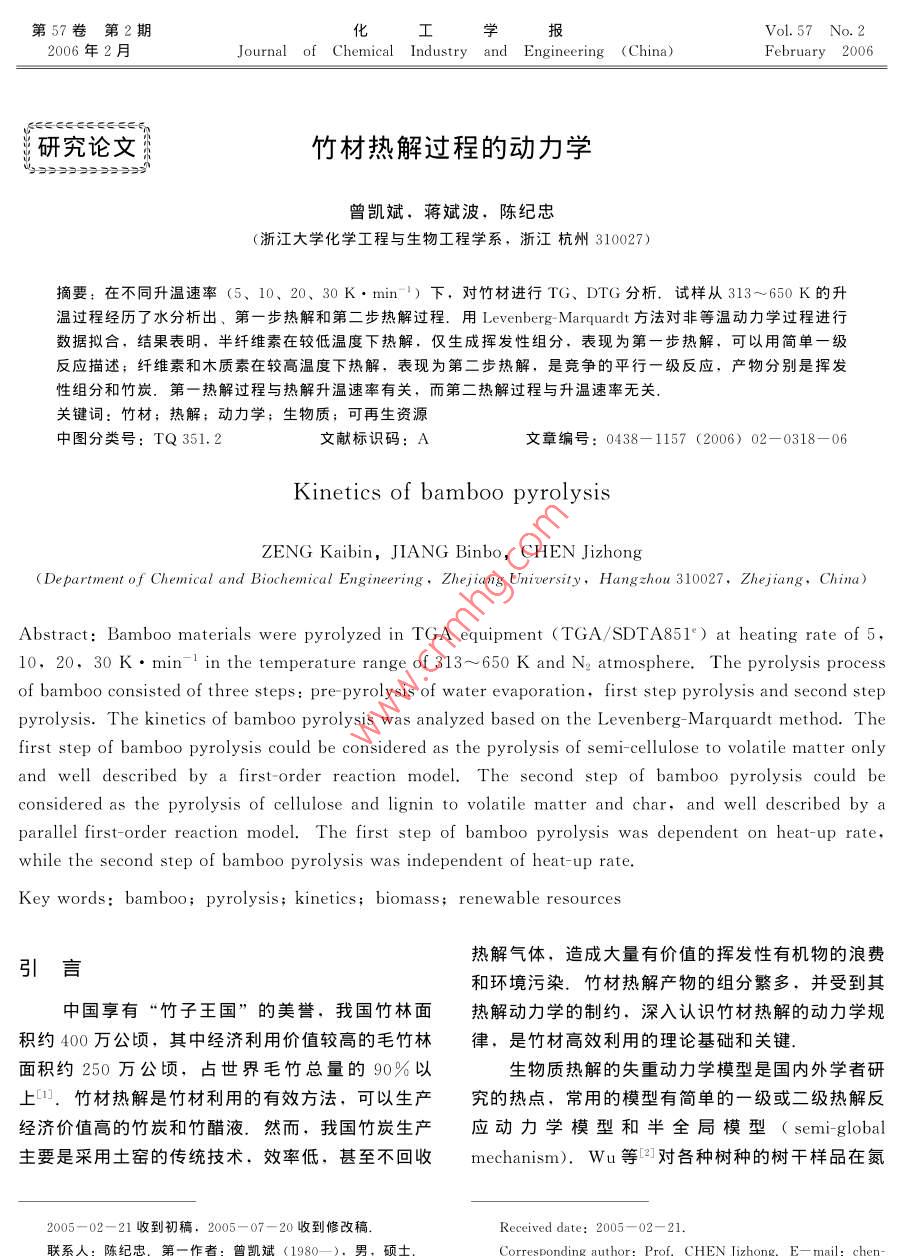 第57卷第2期化工學(xué)報(bào)Vol. 57 No. 22060年2月JoumalofChemnilhndusryandngineing(china)Fdbrury200研究論文竹材熱解過程的動(dòng)力學(xué)曾凱斌,蔣斌波,陳紀(jì)忠浙江大學(xué)化學(xué)工程與生物工程學(xué)系,浙江杭州310027)摘要:在不同升溫速率(5、10、20、30K·min-)下,對(duì)竹材進(jìn)行TG、DTG分析.試樣從313~650K的升溫過程經(jīng)歷了水分析出、第一步熱解和第二步熱解過程.用 Levenberg-Marquardt方法對(duì)非等溫動(dòng)力學(xué)過程進(jìn)行數(shù)據(jù)擬合,結(jié)果表明,半纖維素在較低溫度下熱解,僅生成揮發(fā)性組分,表現(xiàn)為第一步熱解,可以用簡單一級(jí)反應(yīng)描述;纖維素和木質(zhì)素在較高溫度下熱解,表現(xiàn)為第二步熱解,是競(jìng)爭(zhēng)的平行一級(jí)反應(yīng),產(chǎn)物分別是揮發(fā)性組分和竹炭.第一熱解過程與熱解升溫速率有關(guān),而第二熱解過程與升溫速率無關(guān)關(guān)鍵詞:竹材;熱解;動(dòng)力學(xué);生物質(zhì);可再生資源中圖分類號(hào):TQ351.2文獻(xiàn)標(biāo)識(shí)碼:A文章編號(hào):0438-1157(2006)02-0318-06Kiof bbmboo pyrolysis( De partment of Chemical and Biochemical Engineering, Zhejiang University, Hangzhou 310027. Zhejiang, ChineAbstract Bamboo materials were pyrolyzed in TGA equipment (TGA/SDTA851) at heating rate of 5of bamboo consisted of three steps: pre- pyrolysis of water evaporation, first step pyrolysis and second steppyrolysis. The kinetics of bamboo pyrolysis was analyzed based on the Levenberg-Marquardt method. Thefirst step of bamboo pyrolysis could be considered as the pyrolysis of semi-cellulose to volatile matter onlyand well described by a first-order reaction model. The second step of bamboo pyrolysis could beconsidered as the pyrolysis of cellulose and lignin to volatile matter and char, and well described by aparallel first-order reaction model. The first step of bamboo pyrolysis was dependent on heat-up ratewhile the second step of bamboo pyrolysis was independent of heat-up rate.Key words: bambooS; kinetics: biomass; renewable resources熱解氣體,造成大量有價(jià)值的揮發(fā)性有機(jī)物的浪費(fèi)和環(huán)境污染.竹材熱解產(chǎn)物的組分繁多,并受到其中國享有“竹子王國”的美譽(yù),我國竹林面熱解動(dòng)力學(xué)的制約.深入認(rèn)識(shí)竹材熱解的動(dòng)力學(xué)規(guī)積約400萬公頃,其中經(jīng)濟(jì)利用價(jià)值較高的毛竹林律,是竹材高效利用的理論基礎(chǔ)和關(guān)鍵面積約250萬公頃,占世界毛竹總量的90%以生物質(zhì)熱解的失重動(dòng)力學(xué)模型是國內(nèi)外學(xué)者研上.竹材熱解是竹材利用的有效方法,可以生產(chǎn)究的熱點(diǎn),常用的模型有簡單的一級(jí)或二級(jí)熱解反經(jīng)濟(jì)價(jià)值高的竹炭和竹醋液.然而,我國竹炭生產(chǎn)應(yīng)動(dòng)力學(xué)模型和半全局模型( semi-global主要是采用土窯的傳統(tǒng)技術(shù),效率低,甚至不回收 mechanism).Wu等對(duì)各種樹種的樹干樣品在氮2005-02-21收到初稿.2005-07-20收到修改稿Received date: 2005-02-21聯(lián)系人:陳紀(jì)忠第2期曾凱斌等:竹材熱解過程的動(dòng)力學(xué)319氣中進(jìn)行了從473~923K的非等溫?zé)嶂胤治鰧?shí)驗(yàn),結(jié)果表明,木材存在著一個(gè)復(fù)雜的微分熱重1實(shí)驗(yàn)(DIG)峰,這被認(rèn)為是由于兩種主要熱解機(jī)理同1.1實(shí)驗(yàn)原料時(shí)存在的結(jié)果;文麗華等通過對(duì)花梨木、杉木采用浙江杭州老和山生長的毛竹,竹齡3~5水曲柳在327~1070K溫度范圍和不同升溫速率下年,取竹子的下部材料為實(shí)驗(yàn)樣品,預(yù)處理為約進(jìn)行熱解研究,認(rèn)為木材的熱解過程分為水分的解30~40mg、大小為3mm×4mm×5mm的竹塊,吸附、微量失重、熱解和殘留物的緩慢分解4個(gè)階在353K溫度下干燥8h.常見毛竹的原料組成見段,每個(gè)階段對(duì)應(yīng)了不同的物理化學(xué)變化和不表同的熱效應(yīng),并用一級(jí)熱解反應(yīng)模型進(jìn)行描述;Table 1 Chemical components of bamboo/%劉乃安等應(yīng)用 Doyle和 Coats redfern方法對(duì)馬尾松、柳樹等樹木熱解動(dòng)力學(xué)過程分析發(fā)現(xiàn), Sample cellulose Cellulose Lignin Ash Data sourd可用二級(jí)熱解反應(yīng)機(jī)理來模擬;鄧天昇通過M0am713.12.621.03R[8假設(shè)熱解反應(yīng)級(jí)數(shù),建立竹材熱解動(dòng)力學(xué)模型分析了竹材熱解反應(yīng)的反應(yīng)級(jí)數(shù),認(rèn)為熱解反1.2實(shí)驗(yàn)方法應(yīng)級(jí)數(shù)與升溫速率有著一定的關(guān)系,一般為1.5級(jí)或2級(jí)熱解研究采用熱重分析儀(瑞土梅特勒-托利Bradbury等研究了纖維素的熱解,采用半多公司, TGA/SDTA851°,溫度靈敏度:0.01K,全局模型來描述其熱解過程,假設(shè)纖維素首先由質(zhì)量靈敏度0.001mg).在高純氮?dú)夥障逻M(jìn)行熱解個(gè)引發(fā)反應(yīng)生成活性纖維素,活性纖維素繼而發(fā)生實(shí)驗(yàn),升溫速率分別為5、10、20K·min和30竟?fàn)幍钠叫幸患?jí)反應(yīng),其中一個(gè)反應(yīng)生成揮發(fā)性組K·min-1,熱解溫度為室溫~773K.固定天平載分,另一個(gè)反應(yīng)生成焦炭和氣體組分; Koufopa氣流量40ml·min-1,樣品保護(hù)氣流量30nos等認(rèn)為小顆粒生物質(zhì)的熱解過程受動(dòng)力學(xué)機(jī)理控制,熱解總反應(yīng)速率是各組分(纖維素、半纖2熱解動(dòng)力學(xué)模型維素、木質(zhì)素)反應(yīng)速率的總和,在快速等溫?zé)峤鈼l