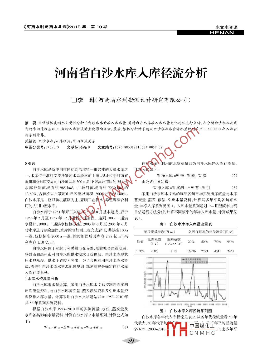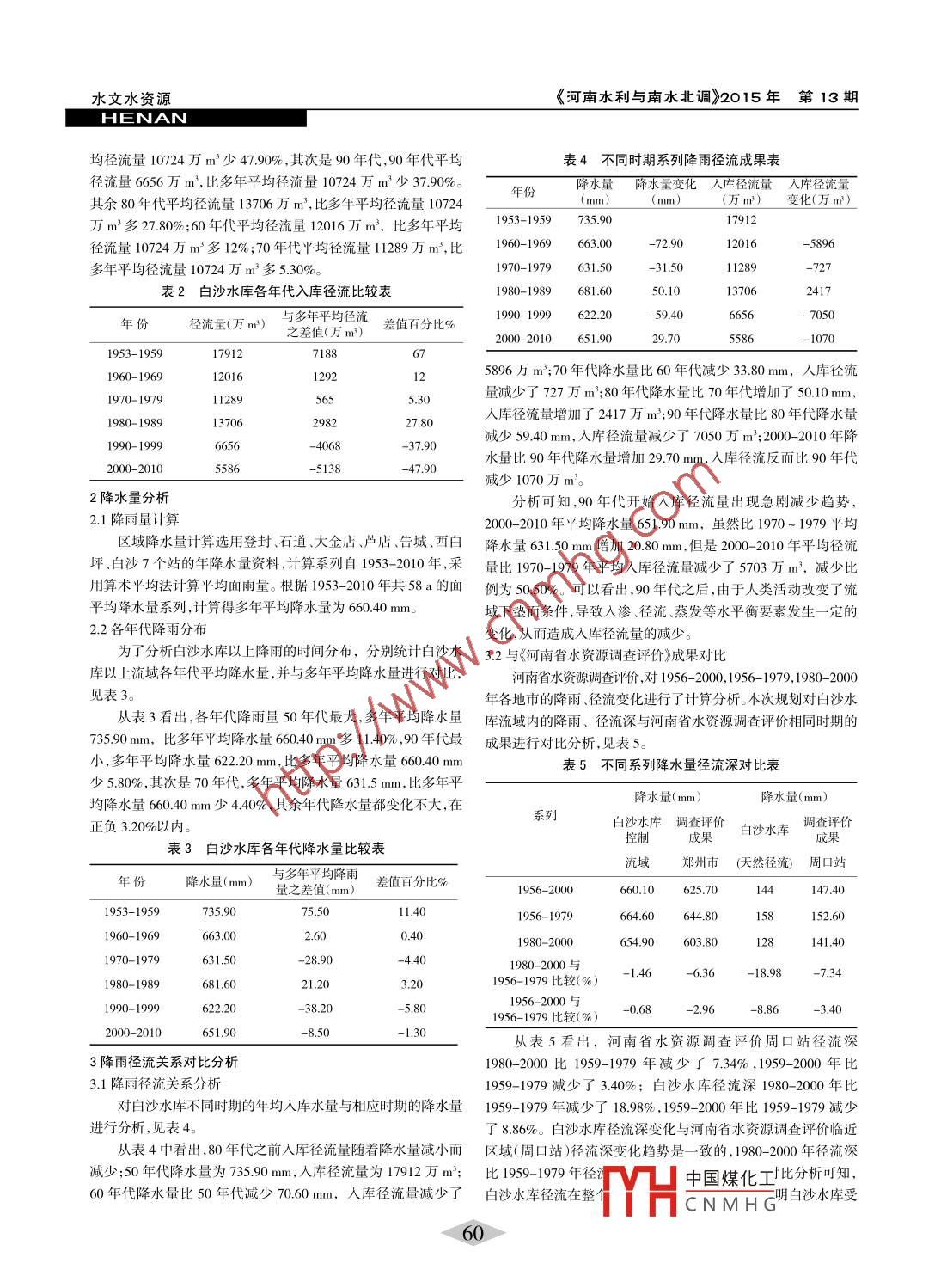 《河南水利與南水北調(diào)》2015年第13期水文水資源HENAN河南省白沙水庫人庫徑流分析口李琳(河南省水利勘測設(shè)計研究有限公司)摘要:文章根據(jù)實測水文資料分析了 白沙水庫的凈入庫水量,并對白沙水庫凈入庫水量變化過程進行分析。在分析白沙水庫流城內(nèi)的降雨過程基礎(chǔ)上,分析入庫徑流的主要影響因素。最后,根據(jù)分析結(jié)果建議白沙水庫水資源配置規(guī)劃采用1980-2010年入庫徑.流系列計算。關(guān)鍵詞:白沙水庫;入庫徑流;降雨徑流關(guān)系中圖分類號:TV673. 9文獻標(biāo)識碼:B 文 章編號: 1673-8853(2015)13-0059-020引言白沙水庫可利用的水資源量即為白沙水庫凈入庫徑流量。白沙水庫是新中國建國初期治淮第一批興建的大型水庫之計算公式如下:一,水庫位于淮河支流沙潁河水系潁河的上游。壩址位于河南省W凈人庫=W來-W蒸-W滲(2)禹州和登封市交界的白沙鎮(zhèn)以北300m,距下游禹州市區(qū)約35 km。由公式(1)(2)得:水庫控制流域面積985km2,占潁河流域面積7230km2的W凈人庫=W實測+OW蓄+W引13.60% ,占穎橋以上潁河山丘區(qū)流域面積1900 km2的51.80%。采用白沙水庫水文站的逐年各旬平均實測出庫流量與水庫白沙水庫是-座以防洪灌溉為主,兼顧工業(yè)供水.養(yǎng)殖等綜合利蓄 變量、蒸發(fā)、滲漏、引出水量資料,計算其多年平均各旬來水用的大( II )型水庫。量,年凈入庫系列見圖1。入庫水量系列通過P- II型頻率曲線白沙水庫于1951年開工興建, 1953年8月基本建成,后于目 估適線方法分析,計算不同頻率的年凈入庫水量,計算成果見1956年2月至1957年12月進行擴建加固,達到100a - -遇洪表1。水設(shè)計, 1000 a - -遇洪水校核標(biāo)準(zhǔn)。2003年6月至2005年6月表1白沙水庫凈入庫徑流量表對水庫進行除險加固,水庫除險加固工程完成后,防洪標(biāo)準(zhǔn)100a年徑流量參數(shù)(萬m2' )各種保證率的年徑流量(萬m2' )一遇,校核標(biāo)準(zhǔn)2000a一遇,除險加固后總庫容2.78億m,興利庫容1.10億m'。均值變差系數(shù)偏差系數(shù)20% 50% 75% 95%白沙水庫位于登封市和禹州市交界處,隨著社會經(jīng)濟發(fā)展,10724 0.852.1316076 7793 4311 2465登封市和禹州市對白沙水庫供水需求日益迫切。白沙水庫現(xiàn)狀用水戶眾多,供水矛盾較為突出。為了合理利用白沙水庫水資1068源,需進行白沙水庫水資源配置規(guī)劃,規(guī)劃前提是確定白沙水庫10人庫徑流系列。1水庫水資源量分析白沙水庫來水量計算,采用白沙水庫水文站控制斷面實測出庫流量資料,與白沙水庫蓄變量、蒸發(fā)滲漏資料及引出水量資料反推入庫水量。計算采用白沙水文站建站以來1953- 2010年WW共58年系列實測資料。陽100n1010100根據(jù)白沙水庫1953- 2010年的實測流量、水位、蒸發(fā)量及圖1白沙水庫 入庫徑流系列圖水庫各類影響水量資料,計算白沙水庫來水量系列。計算公式如白沙水庫各年代入庫徑流見表2,從各年代徑流量看50年W *=Wx+OW蓄+W+W治+W引代最大,50年代平均月“”中國煤化工年平均徑流量(1)多 67% 2002010m,比多年平Y(jié)HCNMHG59水文水資源《河南水利與南水北調(diào)》2015年第13期HENAN均徑流量10724萬m'少47.90%,其次是90年代,90年代平均表4不同時期 系列降雨徑流成果表徑流量6656萬m',比多年平均徑流量10724萬m'少37.90%。年份降水量降水量變化 入庫徑流量 入庫徑流量其余80年代平均徑流量13706萬m',比多年平均徑流量10724mm)萬mP)_變化(萬m2)萬m2多27.80% ;60年代平均徑流量12016 萬m',比多年平均1953-1959 735.9017912徑流量10724萬m'多12%;70年代平均徑流量11289 萬m',比1960-1969 663.00-72.901201-5896多年平均徑流量10724萬m'多5.30%。1970-1979 631.50-31.5011289-727表2白沙水庫各年代入庫徑流 比較表1980-1989 68 1.6050.1013706417徑流量(萬m)與多年平均徑流差值百分比%1990-1999 622.20-59.406656-7050之差值(萬m)2000- -201065 1.9055810701953- 1959718861960- 196912016129215896 萬m;70年代降水量比60年代減少33.80 mm,入庫徑流量減少了727萬m';80年代降水量比70年代增加了50.10 mm, .1970-1979561980- 1989298227. 80人庫徑流量增加了2417萬m';90年代降水量比80年代降水量減少59.40 mm,人庫徑流量減少了7050萬m';2000-2010年降1990- - 1999-40687.90水量比90年代降水量增加29.70mm,人庫徑流反而比90年代2000- 20105586-5138-47.90減少1070萬m'。2降水量分析分析可知,90年代開始人庫徑流量出現(xiàn)急劇減少趨勢,2.1降雨量計算2000- 2010年平均降水量651.90 mm,雖然比1970~ 1979平均區(qū)域降水量計算選用登封、石道、大金店、蘆店、告城、西白降水量631.50mm增加20.80mm,但是2000--2010年平均徑流坪白沙7個站的年降水量資料,計算系列自1953 2010年,采量比 1970-1979年平均人庫徑流量減少了5703萬m,,減少比用算術(shù)平均法計算平均面雨量。根據(jù)1953- 2010年共58 a的面例為 50.0%??梢钥闯?90 年代之后,由于人類活動改變了流平均降水量系列,計算得多年平均降水量為660.40 mm。域下墊面條件,導(dǎo)致人滲、徑流、蒸發(fā)等水平衡要素發(fā)生一定的2.2各年代降雨分布變化,從而造成入庫徑流量的減少。為了分析白沙水庫以上降雨的時間分布,分別統(tǒng)計白沙水3.2 與(河南省水資源調(diào)查評價》成果對比庫以上流域各年代平均降水量,并與多年平均降水量進行對比,河南省水資源調(diào)查評價,對1956- 2000, 1956-1979, 1980- 2000見表3。年各地市的降雨、徑流變化進行了計算分析。本次規(guī)劃對白沙水從表3看出,各