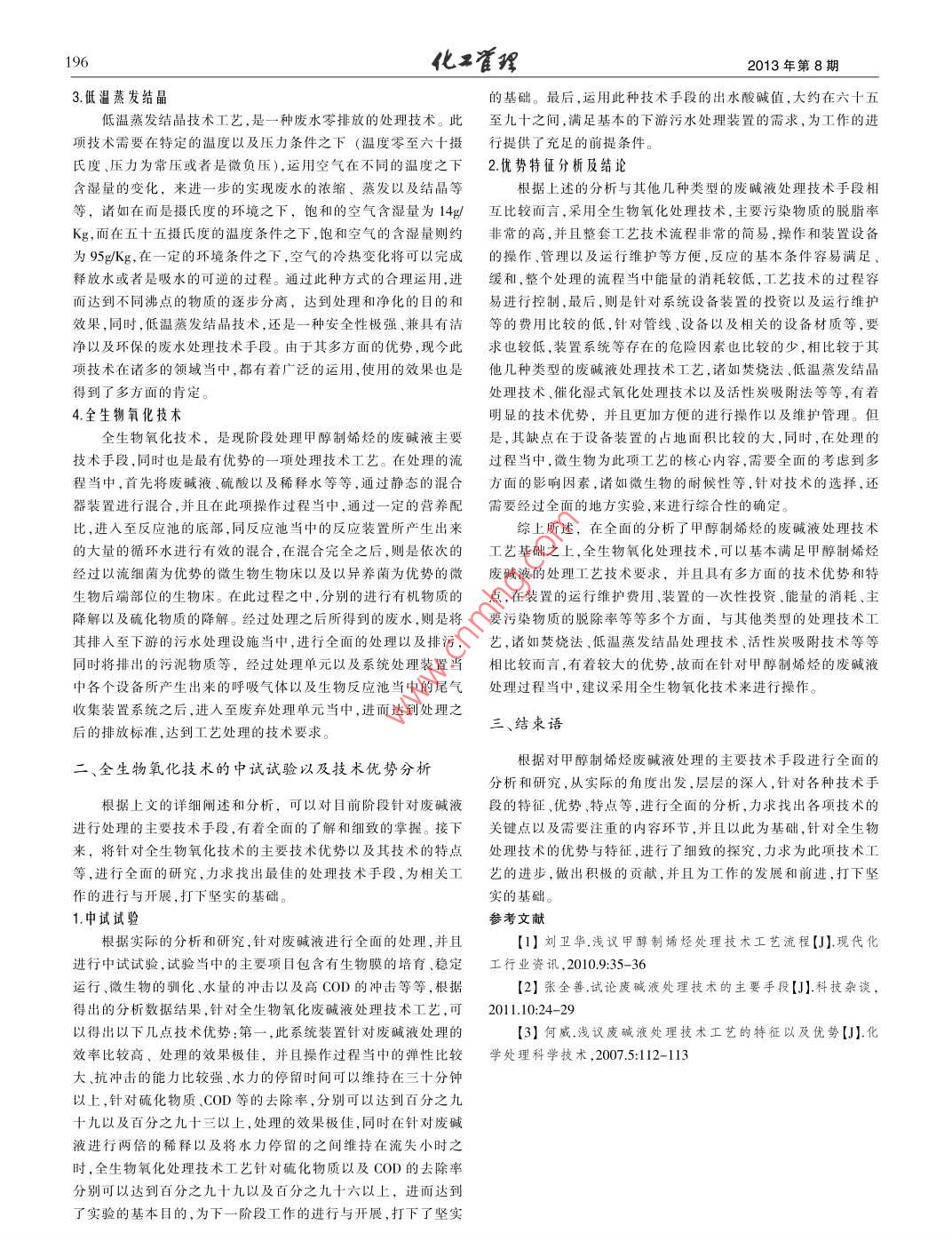能源管理195甲醇制烯烴廢堿液處理方法比較研究劉海峰摘要:論述了甲醇制烯烴廢堿液處理的幾種常用的技術(shù)手段,并且針對各種技術(shù)手段的優(yōu)勢以及特征等,進(jìn)行了深入的研究,力求找出最佳的處理方案,為此項(xiàng)工作的進(jìn)步和發(fā)展做出積極的貢獻(xiàn)。關(guān)鍵詞:甲醇制烯烴廢堿液處理技術(shù)比較研究機(jī)廢水的處理成本,為工作的進(jìn)行打下堅(jiān)實(shí)的基礎(chǔ)。主要的來引言講,現(xiàn)階段的主要廢堿液處理技術(shù)工藝有以下幾種。在近些年以來甲醇制烯烴行業(yè)迅猛的發(fā)展,并且各項(xiàng)工作1.焚燒法也都在穩(wěn)步的前進(jìn)當(dāng)中。針對處理的技術(shù)手段烯烴分離單元主在廢堿液的處理系統(tǒng)當(dāng)中,焚燒法的設(shè)備裝置主要是由尾要采用的是32%的氫氧化鈉溶液進(jìn)行洗滌,去除反應(yīng)氣體當(dāng)中氣凈化設(shè)備、焚燒設(shè)備、前處理設(shè)備、應(yīng)急處理系統(tǒng)設(shè)備等共同存在的=氧化碳等酸性氣體,而在堿洗的過程之中,則會產(chǎn)生出的組成。 采取直接類型的氧化法,對于廢堿液進(jìn)行處理,在經(jīng)過叫少量的乳化油浮油以及烴類聚合物等等,為了更好的避免烴噴 槍等的霧化處理之后,進(jìn)人至焚燒系統(tǒng)的焚燒爐當(dāng)中,即刻通類聚合物在堿液處理的循環(huán)系統(tǒng)當(dāng)中造成相關(guān)的危害,引發(fā)循人 一定量的空氣,使得其中的有害物質(zhì)以及雜質(zhì)等充分的燃燒,環(huán)系統(tǒng)的堵塞等.在處理的技術(shù)過程當(dāng)中,堿液達(dá)到了堿洗塔底同時(shí),在此階段的處理當(dāng)中,還需要注意將焚燒的溫度有效的控之時(shí),就需要立刻的排出,此過程則會產(chǎn)生出大量的廢堿液。在制在1100攝氏度左右,并且保證停留時(shí)間兩秒,進(jìn)而生成大量廢堿液當(dāng)中,含有大量的氫氧化鈉碳酸鈉等無機(jī)鹽,呈強(qiáng)堿性,的水蒸氣及二氧化碳,下一階段,則將氣體通過廢熱鍋爐,將多同時(shí),在廢堿液當(dāng)中還含有苯、二甲醇酚等有機(jī)物質(zhì)。排放之后余的熱量進(jìn)行回收,最后則是經(jīng)過電除塵器除塵處理之后,進(jìn)行會對環(huán)境造成較大的污染和破壞,而在近些年以來,針對廢堿液氣體的排放。運(yùn)用焚燒法處理廢堿液,在處理的過程之中燃料氣的處理技術(shù)工藝,-直以來都是工業(yè)廢水處理研究領(lǐng)城當(dāng)中的消耗的 比較多,并且工藝技術(shù)比較簡單,對于堿液的處理非常徹?zé)狳c(diǎn)之一,同時(shí)也是一大難點(diǎn), 全面的針對其技術(shù)手段進(jìn)行改良底 ,而在處理的過程當(dāng)中,廢熱鍋爐還可以回收一定量的蒸汽,和提高,是當(dāng)前的迫切需求。進(jìn)而可以使用來進(jìn)行工廠內(nèi)部的低壓蒸汽管網(wǎng)以及系統(tǒng)霧化等操作,達(dá)到了能源回收再利用的目的和效果,并且也是在一定程.一、廢堿液處理技術(shù)工藝研究度之上降低了能源的損耗。在處理過程當(dāng)中產(chǎn)生的碳酸鈉,則可針對現(xiàn)階段的主要廢堿液處理技術(shù)工藝進(jìn)行細(xì)致的研究,以作為在污水軟化等操作工藝當(dāng)中使用的投加藥物。但是,運(yùn)用是開展一系列工作的基礎(chǔ)性環(huán)節(jié),也是一個(gè)重點(diǎn)的步驟。 在目前焚燒法的劣勢在于運(yùn)行的成本費(fèi)用比較高,并且設(shè)備的造價(jià)也針對廢堿液的處理技術(shù)當(dāng)中,主要是化學(xué)法應(yīng)用的比較多,而其較高,在焚燒的過程當(dāng)中,容易由于烴類聚合物等結(jié)垢,進(jìn)而導(dǎo)中最為成熟的-種技術(shù)手段,就是高溫之下的濕式氧化技術(shù),此致噴射器當(dāng)中出現(xiàn)堵塞或者是熱量過高等情況,進(jìn)而造成設(shè)備技術(shù)需要在一定的壓力條件以及溫度環(huán)境之下,運(yùn)用液態(tài)化的運(yùn)行和工作的不穩(wěn)定,對相關(guān)處理工藝造成不利影響。水對相關(guān)的氧化反應(yīng)進(jìn)行催化,同時(shí),產(chǎn)生出一個(gè)高氧化的驅(qū)動2.催化濕式氧化法力量,進(jìn)而將廢堿液之中存在的無機(jī)硫化物質(zhì)以及各種類型的此種技術(shù)手段是在濕式氧化處理技術(shù)的基礎(chǔ)和前提之上,逐步有機(jī)物質(zhì),轉(zhuǎn)化成為-.些有機(jī)的物質(zhì),諸如烴類、酚類等,并且在的發(fā)展起來的,通過運(yùn)用穩(wěn)定并且高效的催化劑,來合理的降低這樣的條件之下,針對其中較為復(fù)雜的污染物質(zhì)進(jìn)行分解,降解反應(yīng)的溫度以及反應(yīng)的壓力,進(jìn)而全面的縮短了處理技術(shù)流程成為有機(jī)物,進(jìn)一步的去除其中存在的COD,達(dá)到處理的目的和當(dāng)中的停留時(shí)間,進(jìn)而為處理效率以及處理質(zhì)量的提升做出了效果。生化處理的過程,其主要的目的,就是運(yùn)用相關(guān)的微生物積極的貢獻(xiàn)。催化濕式氧化技術(shù),主要是在一定的溫度以及壓力的技術(shù),在一定的設(shè)計(jì)條件之下,通過生物代謝的方式和技術(shù),的條件之下,在用來進(jìn)行填充的催化劑反應(yīng)裝置當(dāng)中,保i證廢堿將廢堿液以及污水當(dāng)中所含有的有機(jī)物質(zhì)進(jìn)行分解,進(jìn)而全面液處在液體狀態(tài)之下的接觸時(shí)間在30分鐘至兩小時(shí)以內(nèi),同的達(dá)到