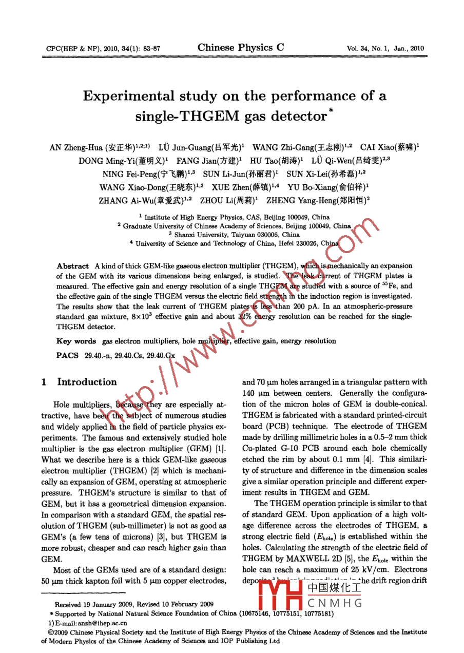 cPc(HEP&NP),2010,34(1):8387Chinese Physics Cvol.34,No.1,Jan.2010Experimental study on the performance of asingle-THGEM gas detectorAN Zheng-Hua(安正華)21) LU Jun- Guang(呂軍光) WANG Zhi-Gang(王志剛)2 CAI Xiao(蔡嘯)DONG Ming-Yi(董明義)2 FANG Jian(方建)} Hu Tao(胡濤)}LUQi-Wen(呂綺雯)23NING Fei-Peng(寧飛鵬}3SUNL-Jun(孫麗君) suN Xi-Lei(孫希磊)2WANG Xiao-Dong(王曉東)3 XUE Zhen(薛鎮(zhèn))14 YU Bo-Xiang(俞伯祥)ZHANG Ai-Wu(章愛武)2 ZHOU L(周莉)} ZHENG Yang-Heng(鄭陽恒)21 Institute of High Energy Physics, CAS, Beijing 100049, China2 Graduate University of Chinese Academy of Sciences, Beijing 100049,China3 Shanxi University, Taiyuan 030006, ChinaUniversity of Science and Technology of China, Hefei 230026, ChinaAbstract A kind of thick GEM-like gaseous electron multiplier(THEM), which is mechanically an expansionof the GEM with its various dimensions being enlarged, is studied. The leak current of THGEM plates ismeasured. The effective gain and energy resolution of a single THGEM are studied with a source of SFe,andhe effective gain of the single THGEM versus the electric field strength in the induction region is investigatedThe results show that the leak current of THGEM plates is less than 200 pA. In an atmospheric-pressurestandard gas mixture, 8x10 effective gain and about 32% energy resolution can be reached for the single-THGEM detectorKey words gas electron multipliers, hole multiplier, effective gain, energy resolutionPAcs29.40.-n,29.40.C8,29.40Gx1 Introductionand 70 um holes arranged in a triangular pattern with140 Hm between centers. Generally the configura-Hole multipliers, because they are especially at- tion of the micron holes of GEM is double-conical.tractive, have been the subject of numerous studies THGEM is fabricated with a standard printed-circuitand widely applied in the field of particle physics ex- board(PCB )technique. The electrode of THGEMperiments. The famous and extensively studied hole made by drilling millimetric holes in a 0.5-2 mm thickmultiplier is the gas electron multiplier (GEm)1. Cu-plated G-10 PCB around each hole chemicallyWhat we describe here is a thick GEM-like gaseous etched the rim by about 0.1 mm [4 This similari-electron multiplier(THGEM)(2 which is mechani- ty of structure and difference in the dimension scalescally an expansion of GEM, operating at atmospheric give a similar operation principle and different experpressure. THGEM's structure is similar to that of iment results in THGEM and GEMGEM, but it has a geometrical dimension expansionThe THGEM operation principle is similar to thatIn comparison with a standard GEM, the spatial res- of standard GEM. Upon application of a high volt-olution of THGEM (sub-millimeter)is not as good as age difference across the electrodes of THGEM,aGEM's(a few tens of microns)[3, but THGEM is strong electric field(Ehole) is established within themore robust, cheaper and can reach higher gain than holes. Calculating the strength of the electric field ofGEMTHGEM by MAXWELL 2D 5], the Hole within theMost of the GEMs used are of a standard design: hole can reach a maximum of 25 kv/cm. Electrons50 um thick kapton foil with 5 um copper electrodedinami- he drift region drift中國煤化工Received 19 January 2009, Revised 10 February 2009CNMHGSupported by National Natural Science Foundation of China(10675146, 10775151, 10775181)1Email: anzh@ihep.accn@2009 Chinese Physical Society and the Institute of High Energy Physics of the Chinese Academy of Sciences and the Instituteof Modern Physics of the Chinese Academy of Sciences and IOP Publishing LtdC(HEP NP)ol.34towards the THGEM under the drift field(Ep)and and pitch 1 mm. Then the copper was etched at athen are focused into the dipole field within the 60 um distance around the hole's rim(Fig. 1).Themicron-hole. The electrons are multiplied within effective area of THGEM is 50 mmx70 mm, and therethe hole under a strong electric field Hole. In an are 3500 holes on the plateatmospheric-pressure standard gas mixture, the ef-Because it is a special new product for the PCBfective gain can reach 10-10 for a single-THGEM industry, the THGEM plate production process is im-GEMs 6]. 10@ effective gain of a double THGEM groups according to the detector's operata ng gelement which is about 50 times larger than a single mature. The created holes are classified into threFor the study on the performance of THGEMn effective area of 50 mmx70 mm ThGeM boardwas produced. The multiplier property and the energy resolution of single THGEM were studied witha source of 56Fe 5.9 ke V X-rays2 The structure of the Them elec-The THGEM plates were designed by us andthen were produced in the PCB industry 7. FR-4(S1141), which is a type of material commonly usedfor making PCBs in industry, is used for the PCBinsulator, because of its good electrical quality es-Fig. 1. A photograph of a 1 mm thick THGEMpecially in terms of fame resistance and dielectricwith 0.3 mm hole diameter, 1 mm pitch andwithstanding and excellent mechanical process abil-60 Hm etched copper rim, preventing dis-ity. The THGEM electrodes are made of double-sidedtarge at high potentialscopper-clad plates. The thickness of the insulatoris 1 mm(=0.04 mm) and the variation of the plate(a) Good holes: The structure of the hole is idealthickness is lower than 3%. The thickness of the cop(Fig. 2(a)). The electric field concentrates on the cen-per electrode is 25 um. The insulator was first drilled ter of the hole. These holes can tolerate higher volwith a hexagonal pattern of holes of diameter 0.3 mmI tages and run stablyabLE natFig. 2.(a)a photo of a typical good hole;(b)a photo of a typical bad hole(b)Flawed holes: Flawed holes are due to techni- Tocal error. The center of the drilled hole and etched shotL中國煤化 Itie tence errohole was not precisely centered, there is more thanC MH Due to the etching10 um displacement between the two centers. Some- process. Some parts of the rim around the ho