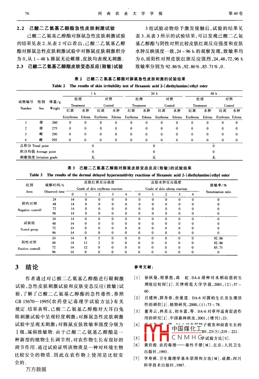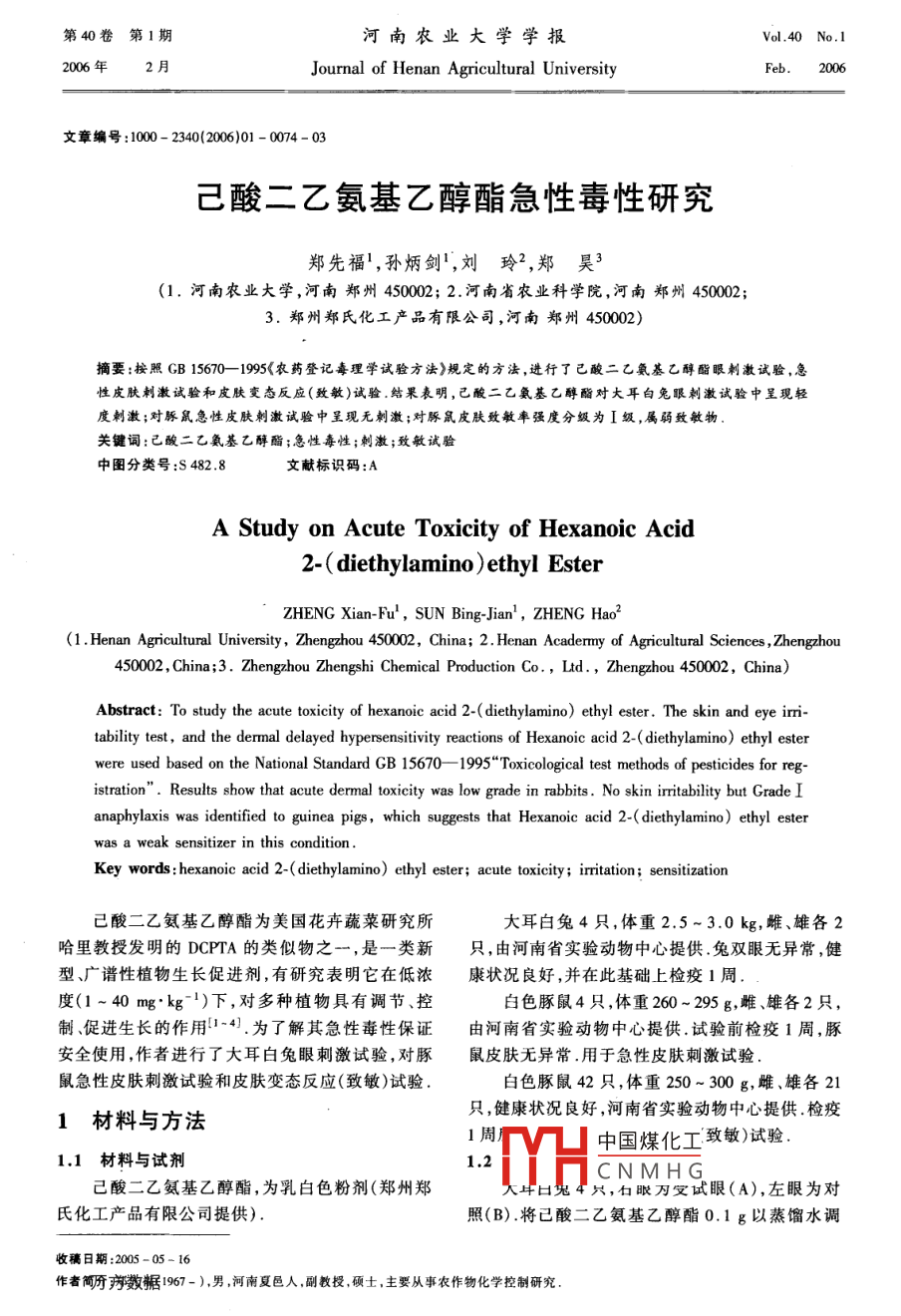 第40卷第1期河南農(nóng)業(yè)大學(xué)學(xué)報(bào)Vol 40 No. 1年2月Journal of Henan Agricultural University文章編號(hào):1000-2340(2006)01-0074-03己酸二乙氨基乙醇酯急性毒性研究鄭先福1,孫炳劍1,劉玲2,鄭昊(1.河南農(nóng)業(yè)大學(xué),河南鄭州45002;2.河南省農(nóng)業(yè)科學(xué)院,河南鄭州4500023.鄭州鄭氏化工產(chǎn)品有限公司,河南鄭州450002)摘要:按照GB1560-1995《農(nóng)藥登記毒理學(xué)試驗(yàn)方法》規(guī)定的方法,進(jìn)行了已酸二乙氨基乙醇酯眼刺激試驗(yàn),急性皮膚刺激試驗(yàn)和皮膚變態(tài)反應(yīng)(致敏)試驗(yàn).鮚果表明,己酸二乙氨基乙醇酯對(duì)大耳白兔眼刺漖試驗(yàn)中呈現(xiàn)輕度刺激;對(duì)豚鼠急性皮膚剌激試驗(yàn)中呈現(xiàn)無刺激;對(duì)豚鼠皮膚致敏率強(qiáng)度分級(jí)為I級(jí),屬弱致敏物關(guān)鍵詞:己釀二乙氨基乙醇酯;急性毒性;刺激;致敏試驗(yàn)中圖分類號(hào):S482文獻(xiàn)標(biāo)識(shí)碼:AA Study on Acute Toxicity of Hexanoic Acid2-( diethylamino )ethyl EsterZHENG Xian-Fu, Sun Bing-Jian, ZHENG Hao2(1. Henan Agricultural University, Zhengzhou 450002, China; 2. Henan Academy of Agricultural Sciences, Zhengzhou450002, China; 3. Zhengzhou Zhengshi Chemical Production Co., Ltd, Zhengzhou 450002, ChinaAbstract: To study the acute toxicity of hexanoic acid 2-(diethylamino)ethyl ester. The skin and eye irritability test, and the dermal delayed hypersensitivity reactions of Hexanoic acid 2-( diethylamino ethyl esterwere used based on the National Standard GB 15670-1995" Toxicological test methods of pesticides for registration. Results show that acute dermal toxicity was low grade in rabbits. No skin irritability but Grade Ianaphylaxis was identified to guinea pigs, which suggests that Hexanoic acid 2-(diethylamino)ethyl esterwas a weak sensitizer in this conditionKey words: hexanoic acid 2-( diethylamino)ethyl ester; acute toxicity; irritation; sensitization己酸二乙氨基乙醇酯為美國(guó)花卉蔬菜研究所大耳白兔4只,體重2.5-3.0kg,雌、雄各2哈里教授發(fā)明的 DCPTA的類似物之一,是一類新只,由河南省實(shí)驗(yàn)動(dòng)物中心提供兔雙眼無異常,健型、廣譜性植物生長(zhǎng)促進(jìn)劑,有研究表明它在低濃康狀況良好,并在此基礎(chǔ)上檢疫1周度(1~40mg·kg-1)下,對(duì)多種植物具有調(diào)節(jié)、控白色豚鼠4只,體重260~295g,雌、雄各2只,制、促進(jìn)生長(zhǎng)的作用1-4).為了解其急性毒性保證由河南省實(shí)驗(yàn)動(dòng)物中心提供試驗(yàn)前檢疫1周,豚安全使用,作者進(jìn)行了大耳白兔眼刺激試驗(yàn),對(duì)豚鼠皮膚無異常用于急性皮膚刺激試驗(yàn)鼠急性皮膚刺激試驗(yàn)和皮膚變態(tài)反應(yīng)(致敏)試驗(yàn)白色豚鼠42只,體重250~300g,雌、雄各211材料與方法只,健康狀況良好,河南省實(shí)驗(yàn)動(dòng)物中心提供.檢疫l周TV凵中國(guó)煤化工致敏)試驗(yàn)1.1材料與試劑1.2CNMHG己酸二乙氨基乙醇酯,為乳白色粉劑(鄭州鄭口見4只,白瞅萬受試眼(A),左眼為對(duì)氏化工產(chǎn)品有限公司提供).照(B).將已酸二乙氨基乙醇酯0.1g以蒸餾水調(diào)收稿日期:2005-05-16作者簡(jiǎn)旁數(shù)據(jù)1967-),男,河南夏邑人,副教授,碩土,主要從事農(nóng)作物化學(xué)控制研究第1期鄭先福等:己已酸二乙氨基乙醇酯急性毒性研究成糊狀置入兔右側(cè)眼結(jié)膜囊內(nèi),輕輕閉合眼瞼1陽性對(duì)照組動(dòng)物去毛區(qū),包扎方法同上分別持續(xù)min,給藥后分別觀察1,24,48,72,96,168h及其以6h,去掉敷料第7d和第14d以同樣方法重復(fù)接后的刺激反應(yīng),記錄結(jié)膜、虹膜和角膜損傷程度.依觸1次據(jù)GB15670-1995《農(nóng)藥登記毒理學(xué)試驗(yàn)方法》判1.4.2激發(fā)接觸致敏14d后進(jìn)行激發(fā)接觸,激斷眼損傷部位,計(jì)算損傷程度積分,并作出刺激性發(fā)前24h將3組動(dòng)物右側(cè)皮膚去毛2cm×2cm,試評(píng)價(jià)5-7驗(yàn)組及陰性對(duì)照組每只動(dòng)物給予試驗(yàn)農(nóng)藥0.1g1.3急性皮膚刺激試驗(yàn)陽性對(duì)照組仍以上述方法配制體積分?jǐn)?shù)為1%的豚鼠4只,試驗(yàn)前24h將豚鼠背部?jī)蓚?cè)毛發(fā)剪2,4-二硝基氯代苯0.1mL斑貼于右側(cè)去毛區(qū).各掉,面積各約6cm2己酸二乙氨基乙醇酯0.5g以蒸組動(dòng)物包扎方法同致敏接觸6h后去除各組受試餾水調(diào)成糊狀,均勻涂于豚鼠左側(cè)皮膚,以右側(cè)作為物,即刻觀察皮膚反應(yīng),以48h后每日觀察1次對(duì)照農(nóng)藥涂抹后,以膠布固定,涂敷持續(xù)時(shí)間4h.因48h無致變反應(yīng),2次激發(fā)并連續(xù)觀察3d試驗(yàn)結(jié)束時(shí),用水洗去殘留的農(nóng)藥給藥后分別觀察觀察激發(fā)接觸后動(dòng)物局部皮膚致敏情況,記錄對(duì)豚鼠皮膚1,24,48h的刺激反應(yīng)分別記錄皮膚紅紅斑或水腫得分?jǐn)?shù),以GB15670-1995《農(nóng)藥登記斑、水腫的程度.依據(jù)GB15670-1995《農(nóng)藥登記毒毒理學(xué)試驗(yàn)方法》中皮膚致敏強(qiáng)度分級(jí)方法判斷致理學(xué)試驗(yàn)方法》判斷反應(yīng)并計(jì)算刺激反應(yīng)評(píng)分4.敏強(qiáng)度5-71.14皮膚變態(tài)反應(yīng)(致敏)試驗(yàn)將豚鼠隨機(jī)分為3組,試驗(yàn)組陰性對(duì)照組,陽2結(jié)果與分析性對(duì)照組各14只2.1己酸二乙氨基乙醇酯眼刺激試驗(yàn)14.1致敏接觸試驗(yàn)前24h將動(dòng)物背部左側(cè)己酸二乙氨基乙醇酯對(duì)大耳白兔眼刺激試驗(yàn)去毛3cm×3cm.將己酸