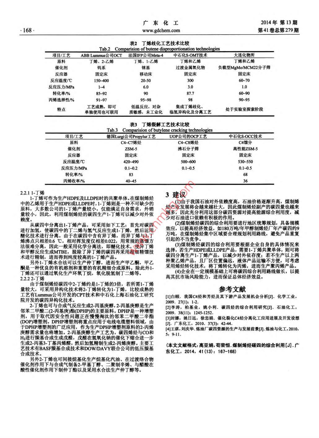 廣東化工2014年第13期.168.www.gdchem.com第41卷總第279期表2 丁烯歧化工藝技術(shù)比較Tab.2_ Comparision of butene disproportionation technologies項目/工藝ABB Lummus公司OCT法國IFP公 司Meta-4中石化S-OMT技術(shù)大連化物所丁烯、2-乙烯丁烯、1-乙烯丁烯和乙烯催化劑鎢系錸基過渡金屬氧化物負載型MgMoMCM22分子篩反應(yīng)器固定床移動床固定床.反應(yīng)溫度/C150-40020-5030060~70反應(yīng)壓力MPa1~3.01.0轉(zhuǎn)化率/%85~92 .987.760-90丙烯選擇性%91-9795~-989890-95工藝成熟,即可低溫反應(yīng),對雜集成丁烯歧化、特點處于實驗室探索階段單獨使用也可聯(lián)用質(zhì)敏感,未工業(yè)化臨氫異構(gòu)化及分離工藝表3丁烯裂解工藝技術(shù)比較Tab.3 Comparision of butylene cracking technologies德國Lurgi公司Propylur工藝UOP公司的OCP工藝中石化S-OCC技術(shù)原料C4~C7烯烴C4~C8烯烴C4餾分催化劑.ZSM-5沸石分子篩高性能ZSM-5420- 490500-600530-5500.1~0.20.1~0.558丙烯收率/%40-45362.2.1 1-丁烯1丁 烯可作為生產(chǎn)HDPE及LLDPE時的共聚單體。在煤制烯烴3建議中的乙烯用于生產(chǎn)HDPE或LLDPE時, 1-丁烯則是一種不可缺少的原料,大多數(shù)公司的1-丁烯產(chǎn)量較小,僅能滿足自身需求,外銷越多,因此充分利用這部分對提高能漏能源完合利用度,量較小,因此,利用煤制烯烴的碳四生產(chǎn)1-丁烯可以減少對外依賴度少對石油進口依賴有積極的作用。進行地區(qū)統(tǒng)籌具各規(guī)模從碳四中分離出1-丁烯產(chǎn)品,可采用如下工藝:首先對碳四(2)煤制烯烴碳四的綜合利用要進進行加氫,使碳四中的丁二烯與氫氣反應(yīng)生成1-丁烯,然后運用效應(yīng),以提高經(jīng)濟效益,如180萬噸/年甲醇制烯烴廠年產(chǎn)碳四約9醚化技術(shù)進行分離。由于在碳四中含有異丁烯,而異丁烯與1-丁萬噸,在煤制烯烴集中區(qū)域要合理規(guī)劃利用路線,避免產(chǎn)品重復(fù)烯沸點只相差0.6 C,相對揮發(fā)度僅相差0.022,用常規(guī)的蒸餾方引起的不當(dāng)競爭。(3)煤制烯烴碳四的綜合利用要根據(jù)企業(yè)自身的具體情況來法很難分離,因此一般采用化學(xué)分離法,即醚化技術(shù),使異丁烯選擇,若生產(chǎn)HDPE或LLDPE產(chǎn)品,需要1-丁烯共聚單體,則可將和甲醇反應(yīng)生成MTBE,脫除了異丁烯的碳四再采用超細精餾技碳四分離生產(chǎn)1-丁烯產(chǎn)品,以減少對外依存度:若不生產(chǎn)以上兩術(shù)進行精制,進而得到純度較高的1-丁烯產(chǎn)品。另外1丁烯水合法可以生產(chǎn)仲丁醇,進而生產(chǎn)甲乙酮,甲乙種聚乙烯產(chǎn)品,廠區(qū)位置偏遠,液體產(chǎn)品運輸不方便,可考慮洞是一種優(yōu)良的有機溶劑和重要的有機精細合成原料。除此外1-采用烯烴轉(zhuǎn)化技術(shù),將丁烯轉(zhuǎn)化為丙烯,進而生產(chǎn)聚丙烯產(chǎn)品。(4)企業(yè)在一定規(guī)模基礎(chǔ)上可將碳四綜合利用路線做長,以提丁烯還可以通過氧化生產(chǎn)環(huán)氧丁烷,氧化脫氫制丁二烯等。高其抗市場風(fēng)險能力,進而保證總體經(jīng)濟效益。2.2.22-丁烯由于煤制烯烴碳四中2- 丁烯約是1-丁烯的3倍,若所需1-丁烯量較大,可采用異構(gòu)化技術(shù)將2-丁烯轉(zhuǎn)化為1-丁烯,比較成熟的參考文獻工藝有Lummus公司開發(fā)的CPT技術(shù)和中石化.上海石油化工研究[1]白頤.我國C4烴和芳烴及其下游產(chǎn)品發(fā)展機會分析[],化學(xué)工業(yè),院開發(fā)的碳四異構(gòu)化技術(shù)。發(fā)時做工化技反應(yīng)生成2-丙基庚醇, 2-丙基庚醇是生2009. 27(); 1-2.丁烯也可與合成氣[2]李濤,柏基業(yè),姚小利.碳四烴的綜合利用研究[0].石油化工,鄰苯二甲酸二(2-丙基庚)酯(DPHP)的主要原料。DPHP是一種增塑2009. 38(11): 1245-1252.劑,用于取代因安全性問題正在慢慢淘汰的鄰苯二甲酸二辛酯[3]封娜,姚日遠,徐忠娟.催化裂化C4烴分離化工應(yīng)用進展及開發(fā)設(shè)想(DOP)增塑劑。DPHP增塑劑將重點應(yīng)用于電線電纜塑料領(lǐng)域,由[]廣東化工,2010. 37(3); 42-44.于DPHP增塑劑的廣泛應(yīng)用,作為生產(chǎn)DPHP增塑劑原料的2-丙烯[4]王湛,劉慶華煉油廠碳四資源的生產(chǎn)與發(fā)展前景[J].煉油與化工, 2010,庚醇需求量也將增加。2-丙基庚醇生產(chǎn)工藝為,碳四烯烴與C0和5: 9-11.H2進行羰基合成生成戊醛,戊醛在氫氧化鈉的催化下縮合進一步生成2-丙基3-丁基丙烯醛,然后加氫精制生成2-丙烯庚醇。主要工(本文文獻格式:高亞娟,茍榮恒.煤制烯烴碳四的綜合利用[J].廣藝技術(shù)有BASF羰基合成技術(shù)和DOWDAVY聯(lián)合公司的低壓羰基東化工,2014, 41 (13): 167-168)合成技術(shù)。另外2-丁 烯也可間接烷基化生產(chǎn)烷基化汽油、在過渡絡(luò)合物催化劑作用下與合成氣制備2-甲基丁醇、二聚制辛烯、與醋酸在酸性催化劑作用下制仲丁酯以及采用水合法生產(chǎn)仲丁醇等。