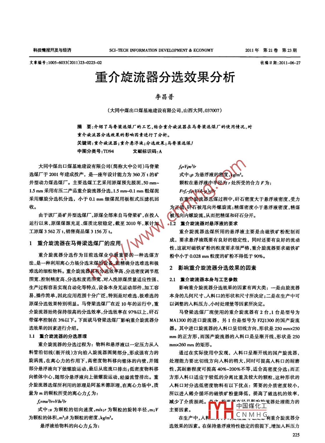 科技情報開發(fā)與經(jīng)濟SCI-TECH INFORMATION DEVELOPMENT ECONOMY2011年第21卷第23期文章編號:1005-6033(2011)23-022502收稿日期:2011-06-27重介旋流器分選效果分析李昌普(大同中煤出口煤基地建設(shè)有限公司,山西大同,037007)摘要:介紹了馬脊梁選煤廠的工藝,結(jié)合重介旋流器在馬脊梁選煤廠的使用情況,對重介旋流器分選效果的影響因素進行了分析。關(guān)鍵詞:重介旋流器;重介悉浮液;分選效果;馬脊梁選煤廠中圖分類號:TD94文獻標(biāo)識碼:A大同中煤出口煤基地建設(shè)有限公司(簡稱大中公司)馬脊梁f o=Vpv lr選煤廠于2001年建成投產(chǎn),是一座年設(shè)計能力為360萬t的礦式中:P為懸浮液的密度,kgm3井型動力煤選煤廠。主要選煤工藝采用原煤預(yù)先脫泥,50mm顆粒在懸浮液中半徑為r處所受的合力F為:15mm采用有壓二產(chǎn)品重介旋流器分選,1.5mm-0.1mm粗煤泥FG=V(8p)升采用螺旋分選機分選,小于0.1mm細煤泥用板框式壓濾機回在重介旋流器選煤過程中,矸石密度大于懸浮液密度,受力為正值,矸石被甩向外螺旋流;精煤密度小于懸浮液密度,精煤由于該廠是礦井型選煤廠,原煤全部來自馬脊梁礦,在投入被甩向內(nèi)螺旋流,從而把精煤和矸石分開。運行以來,原煤煤源充足、煤質(zhì)比較穩(wěn)定,截至2010年,累計加1.2重介旋流器對懸浮液的要求工原煤3562萬t,銷售商品煤3156萬t重介旋流器選煤所用的懸浮液主要是由磁鐵礦粉配制而1重介旋流器在馬脊梁選煤廠的應(yīng)用成,要求懸浮液既要有良好的穩(wěn)定性,同時還要有良好的流動性,這就對磁鐵礦粉的粒度要求很嚴(yán)格,重介旋流器要求磁鐵礦重介旋流器分選作為目前選煤業(yè)中最重要的一種選煤方粉中小于0028mm粒度的礦粉不得低于90%法,是一種利用離心力場分選末煤的設(shè)備,能精確分選難選和極難選的細粒物料。重介旋流器具有分選效率高分選密度調(diào)節(jié)范2影響重介旋流器分選效果的因素圍寬、控制精度高、分選粒度范圍寬、對入洗原煤質(zhì)量適應(yīng)性強、2.1重介旋流器本身與工藝參數(shù)生產(chǎn)過程容易實現(xiàn)自動化等特點設(shè)備本身無運動部件,加工容影響重介旋流器分選效果的因素有兩大類:一是由旋流器易,操作簡單因此應(yīng)用范圍十分廣泛,特別是對難選、極難選的本身的幾何尺寸、入料口的形狀和尺寸所決定;二是在生產(chǎn)中可原煤分選效果特別明顯。馬脊梁選煤廠在近10年的運行中,重以調(diào)整的入料壓力小時處理量等因素所決定。介旋流器始終保持很高的分選效率,分選效率在97%以上,矸石馬脊梁選煤廠現(xiàn)使用的重介旋流器有2臺,1臺是型號為帶煤率控制在3%以下。下面就馬脊梁選煤廠影響重介旋流器分MA1300的進口旋流器,另1臺是型號為FZJ300的國產(chǎn)旋流選效果的因素進行介紹。器。其中進口旋流器的入料口呈切線方向,形狀是250mmx2501.1重介旋流器的分選原理mm的正方形,而國產(chǎn)旋流器的入料口是呈漸開線,形狀是250重介旋流器的分選過程為:物料和懸浮液以一定壓力從入mmx260mm的矩形。料管沿切線(漸開線)方向給入旋流器圓筒部分,形成強有力的通過在實際使用中發(fā)現(xiàn),人料口呈漸開線的國產(chǎn)旋流器旋渦流,在離心力的作用下高密度物料移向錐體的內(nèi)壁,并隨處理能力要比切線方向入料的稍大,同時可提高入料口的耐磨部分懸浮液向下做螺旋運動最后從底流口排出;低密度物料移性,其耐磨程度可提高40%-200%不等適合高密度分選;而正向錐體中心,隨部分懸浮液向上做螺旋運動經(jīng)溢流管排出。重方形入料口適應(yīng)于較低的分離比重及較大的顆粒,這種形狀的介旋流器選煤所利用的原理是阿基米德原理在離心力場中,質(zhì)入料口對分選低密度物料有以下優(yōu)點:需要的介質(zhì)密度較小,量為m的顆粒所受的離心力f為:所以進入稀介循環(huán)的磁鐵礦粉量降低,提高了磁選機的效率∫=m3=vb3r減少了介質(zhì)損耗。式中:為顆粒的切向速度,ms;r為顆粒的旋轉(zhuǎn)半徑,m;V主要因素。vL中國煤化為顆粒的體積,m3;5為顆粒的密度,kg/m3在生產(chǎn)中,人CNMHG響重介旋流器分懸浮液給物料的向心力后為:選效果的因素。在保持懸浮液特性穩(wěn)定的前提下,增加入料壓力李昌普重介旋流器分選效果分析本刊E-mail:bjb@gxinfo.net實踐與創(chuàng)新可以在旋流器內(nèi)部形成穩(wěn)定的空氣柱,從而提高重介旋流器的際生產(chǎn)中具有以下優(yōu)點:物料的離心力大,分選精度高;可降低分選效果,但壓力過大,會加大重介旋流器內(nèi)部的磨損縮短使分選下限;小時處理能力強;懸浮液循環(huán)量小,能耗低,分選比重用壽命同時次生煤泥量會增加,導(dǎo)致懸浮液的黏度加大,影響易于控制。但也存在如下缺點物料由于高速旋轉(zhuǎn)葉輪的撞擊,懸浮液的流動性密度不易控制;壓力過小會使分選效果變差。增加了次生煤泥量。據(jù)分析:馬脊梁選煤廠次生煤泥量在6%左經(jīng)現(xiàn)場使用表明,馬脊梁選煤廠重介旋流器入料壓力在120右,從而增加了煤泥系統(tǒng)的壓力。kPa~130kPa時分選效果最佳。24懸浮液密度的影響小時處理量過大,煤在分選槽內(nèi)不能充分散開,甚至造成物在正常情況下,懸浮液的實際分選密度要高于懸浮液密度料堆積來不及分選就排出機外降低分選效果特別是矸石含01gcm10.2gm3,這是由于懸浮液在旋流器中受離心力作用