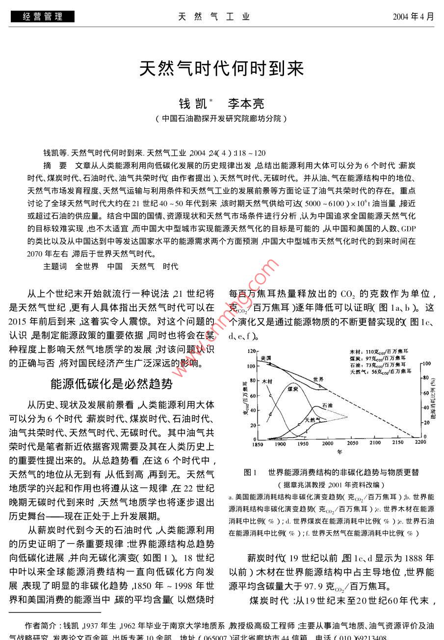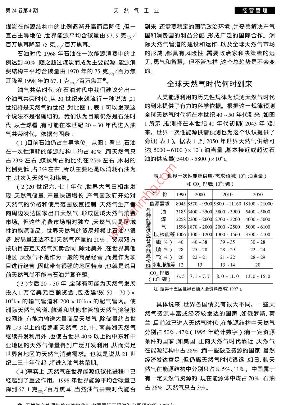 經(jīng)營管理天然氣工業(yè)2004年4月天然氣時(shí)代何時(shí)到來錢凱*李本亮(中國石油勘探開發(fā)研究院廊坊分院)錢凱等.天然氣時(shí)代何時(shí)到來.天然氣工業(yè)2004 24( 4):118-120摘要文章從人類能源利用向低碳化發(fā)展的歷史規(guī)律出發(fā)總結(jié)出能源利用大體可以分為6個(gè)時(shí)代:薪炭時(shí)代、煤炭時(shí)代、石油時(shí)代、油氣共榮時(shí)代由作者提出)天然氣時(shí)代、無碳時(shí)代。并從油、氣在能源結(jié)構(gòu)中的地位、天然氣市場(chǎng)發(fā)育程度、天然氣運(yùn)輸與利用條件和天然氣工業(yè)的發(fā)展前景等方面論證了油氣共榮時(shí)代的存在。重點(diǎn)討論了全球天然氣時(shí)代大約在21世紀(jì)40 ~ 50年代到來,該時(shí)期天然氣供給可達(dá)( 5000 -6100)x10't油當(dāng)量接近或超過石油的供應(yīng)量。結(jié)合中國的國情、資源現(xiàn)狀和天然氣市場(chǎng)條件進(jìn)行分析,認(rèn)為中國追求全國能源天然氣化的目標(biāo)較難實(shí)現(xiàn),也不太適宜,而中國大中型城市實(shí)現(xiàn)能源天然氣化的目標(biāo)是可能的,從中國和美國的人數(shù)、GDP的類比以及從中國達(dá)到中等發(fā)達(dá)國家水平的能源需求兩個(gè)方面預(yù)測(cè)中國大中型城市天然氣化時(shí)代的到來時(shí)間在2070年左右滯后于世界天然氣時(shí)代。主題詞全世界中國天然氣時(shí)代從上個(gè)世紀(jì)末開始就流行一種說法21世紀(jì)將每百萬焦耳熱量釋放出的CO2的克數(shù)作為單位,是天然氣世紀(jì)更有人具體指出天然氣時(shí)代可以在克。,/百萬焦耳)逐年降低可以證明(圖1a、b)。這2015年前后到來,這著實(shí)令人震驚。對(duì)這個(gè)問題的個(gè)演化又是通過能源物質(zhì)的不斷更替實(shí)現(xiàn)的(圖1c、認(rèn)識(shí)是制定能源政策的重要依據(jù),同時(shí)也將會(huì)在某d、e、 f)。種程度上影響天然氣地質(zhì)學(xué)的發(fā)展;對(duì)該問題認(rèn)識(shí)120木材: 110克。/百萬焦耳煤發(fā): 97克cor/百萬焦耳的正確與否將對(duì)國民經(jīng)濟(jì)產(chǎn)生廣泛深遠(yuǎn)的影響。10石油73克百萬熊耳r100天然氣: 56克ca/百萬焦耳能源低碳化是必然趨勢(shì)時(shí)80上木材世R 60-從歷史、現(xiàn)狀及發(fā)展前景看人類能源利用大體油可以分為6個(gè)時(shí)代薪炭時(shí)代、煤炭時(shí)代、石油時(shí)代、然氣20-油氣共榮時(shí)代、天然氣時(shí)代、無碳時(shí)代。其中油氣共榮時(shí)代是筆者新近依據(jù)客觀需要及其在人類歷史上185019002050 2100 2150 2200的重要性提出來的。從總趨勢(shì)看在這6個(gè)時(shí)代中,天然氣的地位從無到有,從低到高再到無。天然氣圖1世界能源消費(fèi)結(jié)構(gòu)的非碳化趨勢(shì)與物質(zhì)更替地質(zhì)學(xué)的興起和作用也將遵從這一規(guī)律在22世紀(jì)(據(jù)章兆淇教授2001年資料改編)晚期無碳時(shí)代到來時(shí),天然氣地質(zhì)學(xué)也將逐步退出a.美國能源消耗結(jié)構(gòu)非碳化演變趨勢(shì)(克a/百萬焦耳);b.世界能源消耗結(jié)構(gòu)非碳化演變趨勢(shì)(克0/百萬焦耳) x0.世界木材在能源歷史舞臺(tái)一現(xiàn)在正處于 上升發(fā)展期。消耗中比例%);d世界煤炭在能源消耗中比例%)e.世界石油從薪炭時(shí)代到今天的石油時(shí)代,人類能源利用在能源消耗中比例% );f世界天然氣在能源消耗中比例% )的歷史證明了一條重要規(guī)律:世界能源結(jié)構(gòu)總趨勢(shì)向低碳化進(jìn)展,并向無碳化演變(如圖1 )。18 世紀(jì)薪炭時(shí)代( 19 世紀(jì)以前圖lc、d顯示為1888年中葉以來全球能源消費(fèi)結(jié)構(gòu)一直向低碳化方向發(fā)以前) :木材在世界能源結(jié)構(gòu)中占主導(dǎo)地位,世界能展表現(xiàn)了明顯的非碳化趨勢(shì),1850 年~1998年世源平均含碳量大于97.9 克/百萬焦耳。界和美國消費(fèi)的能源當(dāng)中碳的平均含量(以燃燒時(shí)煤炭時(shí)代:從19世紀(jì)末至20世紀(jì)60年代末,作者簡(jiǎn)介:錢凱1937年生,1962 年畢業(yè)于南京大學(xué)地質(zhì)系教授級(jí)高級(jí)工程師;主要從事油氣地質(zhì)、油氣資源評(píng)價(jià)及油氣戰(zhàn)略研究發(fā)表論立百全管出版去葵10全部t地址(065007河北省底坊市44信箱由話( 010¥921 3408.第24卷第4期.天然氣工業(yè)經(jīng)營管理煤炭在能源結(jié)構(gòu)中的比例逐漸升高而后降低,但一到來還需要穩(wěn)定的國際政治環(huán)境并妥善解決產(chǎn)氣直占主導(dǎo)地位,世界能源平均含碳量由97.9克/國和消 費(fèi)國的利益分配形成廣泛的國際合作。洲百萬焦耳降至75克。/百萬焦耳。際天然氣管道的建設(shè)和運(yùn)作,以及全球天然氣市場(chǎng)石油時(shí)代:1968年石油在-次能源消費(fèi)中的比的形成都具有風(fēng)險(xiǎn)性,需要政治家和決策者的遠(yuǎn)例達(dá)到40%隨之超過煤炭而成為主要能源能源消見、勇氣和智慧。但不管怎樣這個(gè)總趨勢(shì)是不會(huì)變費(fèi)結(jié)構(gòu)中平均含碳量由1970年的75克co,/百萬焦的。耳降至1998年的67.1克。/百萬焦耳9。全球天然氣時(shí)代何時(shí)到來油氣共榮時(shí)代:在石油時(shí)代中我們建議分出一個(gè)油氣共榮時(shí)代,從20世紀(jì)末就流行一種說法 21人類能源利用的歷史性規(guī)律為預(yù)測(cè)天然氣時(shí)代世紀(