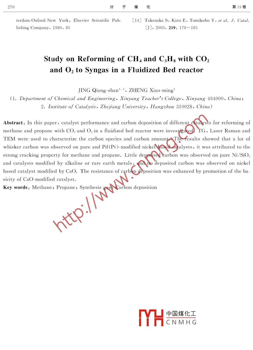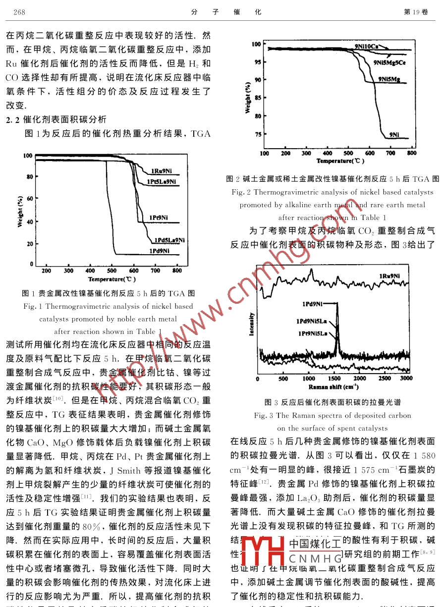 第19卷第4期分子催化2005年8月JOURNAL OF MOLECULAR CATAL YSIS(CHINA)文章編號(hào):1001-3555(2005)0流化床甲烷/倆烷臨氧CO2重整制合成氣反應(yīng)研究井強(qiáng)山2,鄭小明(1.信陽(yáng)師范學(xué)院化學(xué)化工學(xué)院,河南信陽(yáng)4640002.浙江大學(xué)理學(xué)院催化研究所,浙江杭州310028)摘要:研究了流化床反應(yīng)器中甲烷、丙烷臨氧自熱CO2重整制合成氣反應(yīng)中不同催化劑的性能及表面積碳行為.并用熱重分析、激光拉曼及透射電鏡研究了催化劑表面的積碳物種及積碳量.結(jié)果表明,貴金屬Pd、Pt由于對(duì)烷烴有較強(qiáng)的裂解作用,鎳基及貴金屬修飾的鎳基催化劑表面有大量的纖維狀炭生成;堿土和稀土金屬改性的鎳基催化劑有較好的抗積碳性能,大量堿土金屬Cα○修飾微球硅膠后負(fù)載的鎳基催化劑在同等的反應(yīng)條件下沒有發(fā)現(xiàn)積碳.堿土金屬對(duì)催化劑表面堿性的增強(qiáng)是催化劑抗積碳性能提高的原因關(guān)鍵詞:甲烷;丙烷;合成氣;積碳中圖分類號(hào):O643.32文獻(xiàn)標(biāo)識(shí)碼:A天然氣、油田伴生氣、煤層氣和煉廠氣中均含分的燒結(jié)、失活,而且在床層后段進(jìn)行CH4CO2-有大量的甲烷和其它的低碳烷烴.天然氣是甲烷為HO重整反應(yīng)時(shí),催化劑表面會(huì)產(chǎn)生大量積碳.同主的低碳烷烴混合物,儲(chǔ)量特別大;煉廠氣干氣是時(shí),燃燒段的熱量不能有效地供給重整反應(yīng)過程以C~C為主的低碳烷烴、烯烴和甲烷的混合物,不能實(shí)現(xiàn)能量的真正耦合,因此對(duì)反應(yīng)裝置和工藝生成量占煉油總量的3~8%,數(shù)量相當(dāng)巨大,目條件進(jìn)行優(yōu)化如流化床的應(yīng)用已經(jīng)引起重視前主要通過火炬被白白燒掉,既浪費(fèi)了能源又造成丙烷的二氧化碳重整反應(yīng)已有少量文獻(xiàn)報(bào)了對(duì)大氣的污染.在石油資源日益減少的情況下,道-6.相對(duì)甲烷來(lái)講,丙烷更容易裂解,在重整進(jìn)行天然氣和煉廠氣直接轉(zhuǎn)化成合成氣和液體燃料的反應(yīng)溫度下很快深度裂解為碳和氫氣,這樣催化的研究,具有巨大的經(jīng)濟(jì)意義劑表面嚴(yán)重積碳,催化劑的穩(wěn)定性較差.低碳混合甲烷的二氧化碳重整已經(jīng)成為最近20年的研烷烴的臨氧自熱重整則鮮見報(bào)道.作者所在課題組究熱點(diǎn).綜合利用甲烷和二氧化碳這兩種最廉價(jià)的對(duì)甲烷臨氧自熱二氧化碳重整制合成氣做了大量的原料,不僅具有深遠(yuǎn)的環(huán)境效益,而且可以降低生研究-明.本文主要研究流化床反應(yīng)器中甲烷混合產(chǎn)成本和消耗.但甲烷的二氧化碳重整反應(yīng)是一個(gè)丙烷臨氧二氧化碳重整制合成氣反應(yīng)中,貴金屬催強(qiáng)吸熱過程,為了降低這個(gè)過程中的能量消耗,人化劑及鎳基催化劑的反應(yīng)性能及抗積碳性能.稱為自熱重整,從熱力學(xué)上分析;這種混合重整1實(shí)驗(yàn)部分過程,通過同時(shí)引入氧氣和二氧化碳(或水)不僅可1.1催化劑的制備以部分補(bǔ)充單純的重整反應(yīng)所需要的熱量、調(diào)節(jié)產(chǎn)采用工業(yè)用高強(qiáng)度的微球硅膠(SiO2,南京天物中的H2CO比,同時(shí)可以消除反應(yīng)過程中的積化工公司,SEr=363m2/g,粒度:Φ=0.28碳問題3.在傳統(tǒng)的固定床反應(yīng)器中進(jìn)行甲烷臨0.45mm)作載體,催化劑前驅(qū)體及制備方法見表氧重整反應(yīng)時(shí),一個(gè)主要的問題是在催化劑床層進(jìn)催華劑中各組分的含量按催化劑還原后金屬重口段發(fā)生甲烷氧化反應(yīng)(這是一個(gè)強(qiáng)放熱反應(yīng)過量中國(guó)煤化工程),它不僅導(dǎo)致了催化劑床層中存在很大的溫度CNMHG梯度,進(jìn)口段的催化劑因溫度過高導(dǎo)致金屬活性組原料氣為CH4(99.9%)、C3H2(99.9%)、CO2收稿日期:2004-修回日期:2004-11基金項(xiàng)目:國(guó)家自然科學(xué)基金重點(diǎn)資助項(xiàng)目(20433030);教育部博士點(diǎn)基金資助項(xiàng)目(20030335068)作者簡(jiǎn)介:井強(qiáng)山,1970年生,男,博士,E-mail:9 jishan@163,com第4期井強(qiáng)山等:流化床甲烷/丙烷臨氧CO2重整制合成氣反應(yīng)研究267表1催化劑的制備Table 1 Preparation of different catalystPrecursorration met hod9Ni/SiONi(NO3)2·6H2OIPt 9Ni/SiONi(NO3)2.6H,O,H, PtClsdry"co-impregnatiIPd9Ni/SiONi(NO3)2·6H2O,PdCdry co-impregnaticIRu9Ni/SiO,Ni(NO3)2·6H2O,RuCl3·3HO5Ni/10Ca0-SiO.Ni(NO )2.6H, O, Ca(NO:3)24H,Ostepwise ImpregnationIPt 9Ni/5La-SiO,Ni(NO3)2·6H2O,PdCl2,La2(NO)3·nH2Ostepwise impregnationIPd Ni/5La-SiO2Ni(NO3)2·6H2O,PdCl2,L.a2(NO)3·nH2Ostepwise Impregnation(99.99%)和O2(99.99%),用氣體質(zhì)量流量計(jì)射電子顯微鏡(TEM)用于觀察反應(yīng)后催化劑上的(D07-12型,士1.5%F.S)控制.制合成氣反應(yīng)在積碳.樣品反應(yīng)前后的TEM譜圖是在JEM-2020F常壓流化床或固定床石英反應(yīng)器中進(jìn)行,石英管內(nèi)JEOL)型電子顯微鏡上進(jìn)行的徑為12mm,高750mm.評(píng)價(jià)條件如下:催化劑用積碳拉曼表征所使用的儀器為法國(guó) Jobin量2mL;反應(yīng)氣組成V(CH4)/V(C3H)/Yvon公司的 Labram-HR800激光拉曼儀.紫外拉V(O2)=176/10/71/53;程序控溫儀控制反應(yīng)溫度曼表征是在空氣氣氛中室溫條件下進(jìn)行的.HeGd為700℃.反應(yīng)前催化劑在H2(99.9%)氣流(流速激發(fā)光源,激發(fā)波長(zhǎng)為325nm;100%功率時(shí)到達(dá)0mL/min)中程序升溫至650C,還原1h,然后樣品表面的功率1.