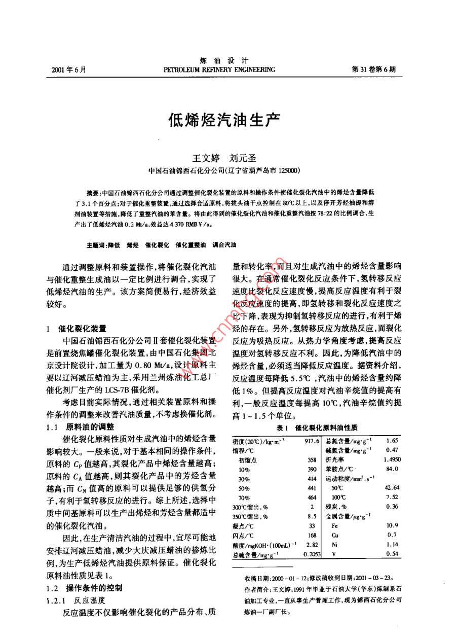 煉油設(shè)計(jì)2001年6月PETROLEUM REFINERY ENCINERING第31卷第6期低烯烴汽油生產(chǎn)王文婷劉元圣中國(guó)石油錦西石化分公司(遼寧省葫蘆島市125000)摘要:中國(guó)石油錦西石化分公司通過(guò)調(diào)整催化裂化裝置的原料和操作條件使催化裂化汽油中的燔烴含量降低了3.1個(gè)百分點(diǎn);對(duì)于催化重整裝置,通過(guò)選擇合適原料.將拔頭油干點(diǎn)控制在80C以上,以及停開(kāi)芳烴抽提和溶劑油裝置等措施,降低了重整禮袖的苯含最。將由此得到的催化裂化汽油和催化重整汽油按78:22的比例調(diào)合,生產(chǎn)出了低烯烴汽油0.2 Mu/a,效益達(dá)4 370 RMB¥/ao主題詞:降低烯烴催化裂化 催化整油調(diào)合汽油通過(guò)調(diào)整原料和裝置操作,將催化裂化汽油量和轉(zhuǎn)化率,而且對(duì)生成汽油中的烯烴含量影響與催化重整生成油以- -定比例進(jìn)行調(diào)合,實(shí)現(xiàn)了很大。在通常催化裂化反應(yīng)條件下,氫轉(zhuǎn)移反應(yīng)低烯烴汽油的生產(chǎn)。該方案簡(jiǎn)便易行,經(jīng)濟(jì)效益速度比裂化反應(yīng)速度慢,提高反應(yīng)溫度有利于裂較好?;磻?yīng)速度的提高,即氫轉(zhuǎn)移和裂化反應(yīng)速度之比下降.表現(xiàn)為抑制氫轉(zhuǎn)移反應(yīng)的進(jìn)行,有利于烯1催化裂化裝置烴的存在。另外,氫轉(zhuǎn)移反應(yīng)為放熱反應(yīng),而裂化中國(guó)石油錦西石化分公司I套催化裂化裝置反應(yīng)為吸熱反應(yīng)。從熱力學(xué)角度考慮,提高反應(yīng)是前置燒焦罐催化裂化裝置,由中國(guó)石化集團(tuán)北溫度對(duì)氫轉(zhuǎn)移反應(yīng)不利。因此,為降低汽油中的京設(shè)計(jì)院設(shè)計(jì),加工量為0. 80 MVa,設(shè)計(jì)原料主烯烴含量,必須適當(dāng)降低反應(yīng)溫度。據(jù)資料介紹,要以遼河減壓蠟油為主,采用蘭州煉油化工總廠反應(yīng)溫度每降低5.5C ,汽油中的烯烴含量約降催化劑廠生產(chǎn)的LCS-7B催化劑。低1%。但提高反應(yīng)溫度對(duì)汽油辛烷值的提高有考慮目前實(shí)際情況,通過(guò)相關(guān)裝置原料和操利,一般反應(yīng)溫度每提高I0C ,汽油辛烷值約提作條件的調(diào)整來(lái)改普汽油質(zhì)量,不考慮換催化劑。高1~1.5個(gè)單位。1.1 原料油的調(diào)整表1催化裂化原料油性質(zhì)催化裂化原料性質(zhì)對(duì)生成汽油中的烯烴含量密度(20C )/kg* m" !917.6總氮含量/mg"g-' 1.65影響較大。-般來(lái)說(shuō),對(duì)于基本相同的操作條件,餾程/賊氟含量/mg'g-' 0.47原料的Cp值越高,其裂化產(chǎn)品中烯烴含量越高;初餾點(diǎn)358 折光率1. . 495010%390| 苯胺點(diǎn)/C原料的CA值越高,則其裂化產(chǎn)品中的芳烴含量30%414| 運(yùn)動(dòng)粘度/m?.s-1越高;而CN值高的原料可以提供足夠的供氫分50%441 50年42.64子,有利于氫轉(zhuǎn)移反應(yīng)的進(jìn)行。綜上所述,選擇中300七餾出,%70%462|殘?zhí)?%100C質(zhì)中間基原料可以生產(chǎn)出烯烴和芳烴含量都適中350C愉出,%8.5 金屬含 最/r%'g-'的催化裂化汽油。凝點(diǎn)/C33F10.9因此,在生產(chǎn)清潔汽油的過(guò)程中,宜盡可能地內(nèi)點(diǎn)/心1680.7安排遼河減壓蠟油,減少大慶減壓蠟油的摻煉比酸度/mgKOH(100mL)-1 2.82 Ni1.14總碗含量/mg"50.2053| V0.54例,為生產(chǎn)低烯烴汽油提供原料保證。催化裂化原料油性質(zhì)見(jiàn)表1。收稿日期2000- 0I - 12;修改稿收到日期:2001 -03 -23。1.2 操作條件的控制作者簡(jiǎn)介:王文婷,1991年畢業(yè)于石袖大學(xué)(華東)煉制系石1.2.1反應(yīng)溫度油加工專業(yè),一直從事生產(chǎn)管理工作,現(xiàn)為錦西石化分公司反應(yīng)溫度不僅影響催化裂化的產(chǎn)品分布、質(zhì)煉油一廠副廠長(zhǎng)。第6期王文婷等.低烯烴汽油生產(chǎn)因此,為使催化裂化汽油的辛烷值不要下降2催化重整裝置太多,又要保證烯烴含量盡可能地少,該裝置反應(yīng)錦西石化分公司催化重整包括催化重整、芳溫度由原來(lái)508C降到503C左右。烴抽提、溶劑油三套裝置。在安排生產(chǎn)低烯烴汽1.2.2劑 油比油時(shí),芳烴抽提和溶劑油裝置停車(chē)。在其它反應(yīng)條件基本相同的情況下,提高劑2.1原料的調(diào)整油比,意味著單位烴分子接觸的催化劑顆粒增多,催化重整裝置的原料性質(zhì)在很大程度上影響有利于氫轉(zhuǎn)移反應(yīng)的進(jìn)行,表現(xiàn)為汽油中烯烴含生成汽油 中的芳烴含量,而重整汽油是成品油中量降低。一般劑油比每增加一一個(gè)單位,汽油中的苯和芳烴的主要來(lái)源。為此,在安排生產(chǎn)低烯烴烯烴含量約降低1.5-3.5個(gè)百分點(diǎn)。汽油時(shí),只安排常頂汽油做催化重整原料,而加氫在操作過(guò)程中,通過(guò)適當(dāng)降低原料預(yù)熱溫度、汽油因芳潛 含量相對(duì)較高,暫停做重整料。催化再生溫度以提高劑油比。該裝置在生產(chǎn)低烯烴汽重整原料性質(zhì)見(jiàn)表3。油時(shí)劑油比由原來(lái)的5. 25提高到5.75。2.2操作條件控制1.2.3 催化劑活性適當(dāng)提高預(yù)分餾塔的塔頂溫度,將拔頭油干催化劑的活性對(duì)生成汽油的烯烴含量有-定點(diǎn)控制在80 C以上,以切除其中的苯組分,降低影響。催化劑活性越高,越有利于氫轉(zhuǎn)移反應(yīng)進(jìn)生成油中的苯含量,其它操作條件見(jiàn)表4,重整生行,表現(xiàn)為汽油中烯烴含量下降。成油性質(zhì)見(jiàn)表5。在操作過(g