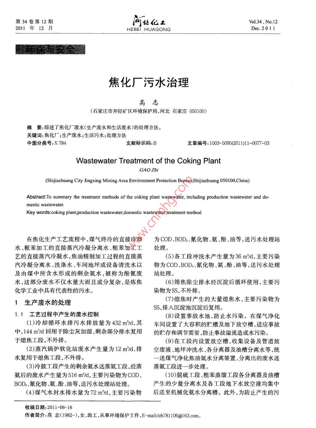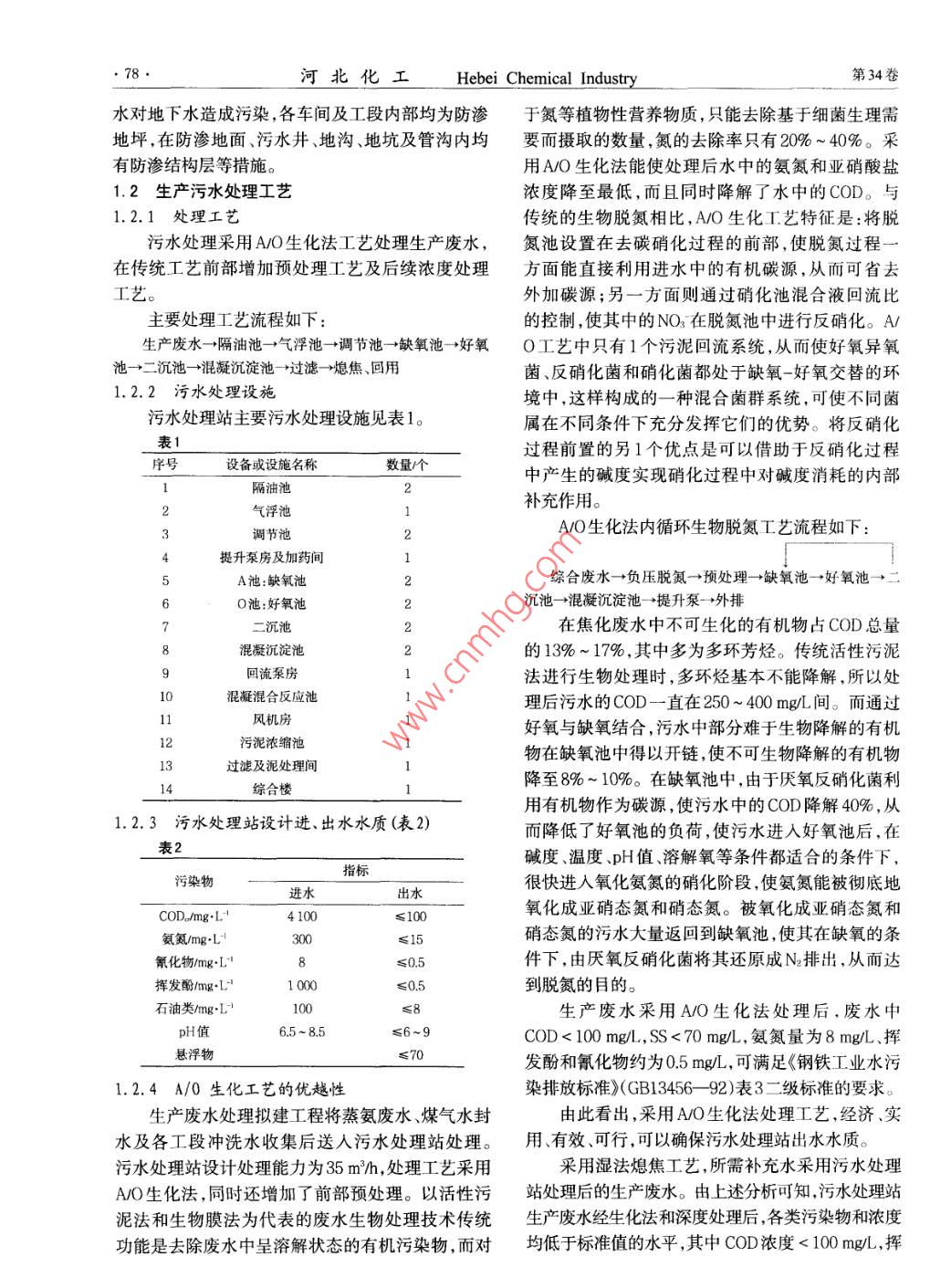 第34卷第12期址xVol 34. No 122011年12月HEBEI HUAGONGDec.2011焦化廠污水治理高志(石家莊市井陘礦區(qū)環(huán)境保護(hù)局,河北石家莊050100)摘要:綜述了焦化廠廢水(生產(chǎn)廢水和生活廢水)的處理方法關(guān)鍵詞:焦化廠;生產(chǎn)廢水;生活污水;處理方法中圖分類號(hào):X784文獻(xiàn)標(biāo)識(shí)碼:B文章編號(hào):1003-5095(2011)11-0077-03Wastewater Treatment of the Coking PlantGAO Zhi(Shijiazhuang City Jingxing Mining Area Environment Protection Bureau, Shijiazhuang 050100, China)Abstract: To summary the treatment methods of the coking plant wastewater, including production wastewater and do-Key words: coking plant; production wastewater domestic wastewater; treatment method在焦化生產(chǎn)工藝流程中,煤氣終冷的直接冷卻為COD、BOD、氰化物、氨、酚、油等,送污水處理站水、粗苯加工的直接蒸汽冷凝分離水、粗苯加工工處理。藝的直接蒸汽冷凝水,焦油精制加工過(guò)程的直接蒸(5)各工段沖洗水產(chǎn)生量為36m/,主要污染汽冷凝分離水、洗滌水、車間地坪或設(shè)備清洗水以物為COD、BOD、氰化物、氨、酚、油等,送污水處理及由煤中所含水形成的剩余氨水,被稱為酚氰廢站處理。水,這部分廢水不僅水量大而且成分復(fù)雜,是煉焦(6)篩焦除塵排水經(jīng)沉淀后循環(huán)使用,主要污化學(xué)工業(yè)中具有代表性的污水。染物為SS,不外排。1生產(chǎn)廢水的處理(7)熄焦時(shí)產(chǎn)生的大量熄焦水,主要污染物為SS,排人沉淀池沉淀后復(fù)用。1.1工藝過(guò)程中產(chǎn)生的廢水控制(8)設(shè)置事故水池,防止水污染。在煤氣凈化(1)冷卻循環(huán)水排污水排放量為432m/d,其車間設(shè)置了大容積的貯槽及地下放空槽,適應(yīng)事故中,144md回用于除塵灰加濕,剩余部分排水復(fù)用的貯存和調(diào)節(jié)需要,防止事故溢流造成水污染。于熄焦工段,不外排(9)在工段內(nèi)設(shè)置放空槽,收集設(shè)備及管道放(2)蒸汽鍋爐軟化站廢水產(chǎn)生量為12m/d,排空廢液、地坪沖洗水、各分離器及油槽分離水等,統(tǒng)水復(fù)用于熄焦工段,不外排。一送煤氣凈化焦油氨水分離裝置,分離出的廢水送(3)冷鼓工段產(chǎn)生的剩余氨水送蒸氨工段,經(jīng)蒸蒸氨工段進(jìn)一步處理氨后的廢水產(chǎn)生量為516m/d,主要污染物為COD(10)脫硫工段、粗苯蒸餾工段各分離器及油槽BOD3、氰化物、氨、酚、油等,送污水處理站處理。產(chǎn)生的少量分離水及各工段地下水放空液均集中(4)煤氣水封水排水量為72mld,主要污染物后送至機(jī)械化氨水分離槽。此外,為防止產(chǎn)生的污收稿日期:2011-06-16作者簡(jiǎn)介:高志(1982-),女,助工,從事環(huán)境保護(hù)工作,E- mail: lzh:8106@163cm78河北化工lebei Chemical Industry第34卷水對(duì)地下水造成污染,各車間及工段內(nèi)部均為防滲于氮等植物性營(yíng)養(yǎng)物質(zhì),只能去除基于細(xì)菌生理需地坪,在防滲地面、污水井、地溝、地坑及管溝內(nèi)均要而攝取的數(shù)量,氮的去除率只有20%~40%。采有防滲結(jié)構(gòu)層等措施。用A/O生化法能使處理后水中的氨氮和亞硝酸鹽1.2生產(chǎn)污水處理工藝濃度降至最低,而且同時(shí)降解了水中的COD。與1.2.1處理工藝傳統(tǒng)的生物脫氮相比,AO生化工藝特征是:將脫污水處理采用AO生化法工藝處理生產(chǎn)廢水,氮池設(shè)置在去碳硝化過(guò)程的前部,使脫氮過(guò)程一在傳統(tǒng)工藝前部增加預(yù)處理工藝及后續(xù)濃度處理方面能直接利用進(jìn)水中的有機(jī)碳源,從而可省去工藝。外加碳源;另一方面則通過(guò)硝化池混合液回流比主要處理工藝流程如下的控制,使其中的NO3在脫氮池中進(jìn)行反硝化。生產(chǎn)廢水→隔油池→氣浮池→調(diào)節(jié)池→缺氧池→好氧O工藝中只有1個(gè)污泥回流系統(tǒng),從而使好氧異氧池→二沉池→混凝沉淀池→過(guò)濾→熄焦、回用菌、反硝化菌和硝化菌都處于缺氧-好氧交替的環(huán)1.2.2污水處理設(shè)施境中,這樣構(gòu)成的一種混合菌群系統(tǒng),可使不同菌污水處理站主要污水處理設(shè)施見(jiàn)表1。屬在不同條件下充分發(fā)揮它們的優(yōu)勢(shì)。將反硝化表1過(guò)程前置的另1個(gè)優(yōu)點(diǎn)是可以借助于反硝化過(guò)程設(shè)備或設(shè)施名稱數(shù)量個(gè)中產(chǎn)生的堿度實(shí)現(xiàn)硝化過(guò)程中對(duì)堿度消耗的內(nèi)部隔油池2氣浮池補(bǔ)充作用3調(diào)節(jié)池21212222AO生化法內(nèi)循環(huán)生物脫氮工藝流程如下提升泵房及加藥間!1池:缺氧池綜合廢水→負(fù)壓脫氮→預(yù)處理→缺氧池→好氧池56789O池:好氧池沉池→混凝沉淀池一提升泵→外排二沉池在焦化廢水中不可生化的有機(jī)物占COD總量混凝沉淀池的13%~17%,其中多為多環(huán)芳烴。傳統(tǒng)活性污泥回流泵房法進(jìn)行生物處理時(shí),多環(huán)烴基本不能降解,所以處混凝混合反應(yīng)池理后污水的COD一直在250~400mg間。而通過(guò)風(fēng)機(jī)房好氧與缺氧結(jié)合,污水中部分難于生物降解的有機(jī)污泥濃縮池物在缺氧池中得以開(kāi)鏈,使不可生物降解的有機(jī)物過(guò)濾及泥處理間綜合樓降至8%~10%。在缺氧池中,由于厭氧反硝化菌利用有機(jī)物作為碳源,使污水中的COD降解40%,從1.2.3污水處理站設(shè)計(jì)進(jìn)、出水水質(zhì)(表2)而降低了好氧池的負(fù)荷,使污水進(jìn)入好氧
