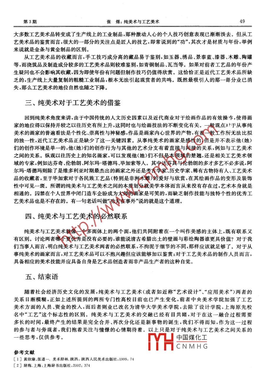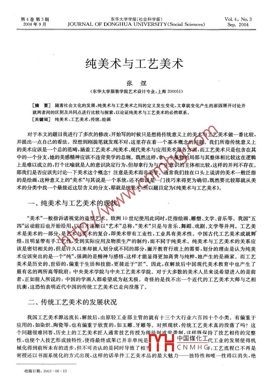 第4卷第3期東華大學(xué)學(xué)報社會科學(xué)版)VoL. 4, No. 32004年9月JOURNAL OF DONGHUA UNIVERSITY(Social Sciences)純美術(shù)與工藝美術(shù)張煜(東華大學(xué)服裝學(xué)院藝術(shù)設(shè)計專業(yè),上海200051)[摘要]隨著社會文化的發(fā)展純美術(shù)與工藝美術(shù)之間的定義發(fā)生變化,文章就變化產(chǎn)生的原因展開討論并就兩者間的區(qū)別及共同點(diǎn)進(jìn)行比較與探索以論證純美術(shù)與工藝美術(shù)的必然聯(lián)系[關(guān)鍵詞]純美術(shù),工藝美術(shù),傳統(tǒng),繪畫對于本文的題目我進(jìn)行了多次的修改,開始寫的時候只是想將傳統(tǒng)意義上的美術(shù)與工藝美術(shù)做一番比較并提出一點(diǎn)自己的看法。沒想到剛提筆就發(fā)現(xiàn)不對,這里存在著一個基本概念的問題。我們所指傳統(tǒng)意義上的美術(shù)應(yīng)該是一個總的范疇涵蓋工藝美術(shù)、純美術(shù)、現(xiàn)代美術(shù)與應(yīng)用美術(shù)等各方面,而工藝美術(shù)只是包含在其中的一個分支她的美感精神應(yīng)該不違背美學(xué)的總綱。既然這樣拿一個事物的局部與其整體相比較這在邏輯上是難以成立的,打個比喻就是人的意識決定行為,但卻拿行為與產(chǎn)生意識的主體相比較,這樣的并列不存在那我們是否應(yīng)該先討論一下美術(shù)這個概念?注意是美術(shù)而非美學(xué)。通常我們掛在口頭上說講的美術(shù)一般泛指的是繪畫,這種意義上的“美術(shù)”與其說是一個系統(tǒng),還不如說是一門技巧來得更為確切,既然要比較那就從美術(shù)的分類中找一個最接近這層含義的分支,那就是純美術(shù),所以題目定為《純美術(shù)與工藝美術(shù)》。、純美術(shù)與工藝美術(shù)的現(xiàn)狀美術(shù)”一般指訴諸視覺的造型藝術(shù)。歐洲10世紀(jì)使用此詞時,泛指繪畫雕塑、文學(xué)、音樂等。我國“五四”運(yùn)動前后也開始沿用,以后才逐漸以“藝術(shù)”總稱,“美術(shù)”只是與音樂、舞蹈、戲劇、文學(xué)等并列。工藝美術(shù)是美術(shù)的一部分,是藝術(shù)與美術(shù)的復(fù)合,即美術(shù)帶有工業(yè)性,工業(yè)具有美術(shù)性。中國古代工藝美術(shù)成就輝煌,且明顯帶有手工藝性,受到實際應(yīng)用及物質(zhì)生產(chǎn)的制約,而不同于純美術(shù)。純美術(shù)與工藝美術(shù)的關(guān)系應(yīng)該是密切相關(guān)的,但是許久以來卻被人劃分成不同的部分,撇開教育行政上的需要,劃分的理由是認(rèn)為純美術(shù)應(yīng)該突出的是一個“純”,強(qiáng)調(diào)的是精神與感悟,這樣才能顯得更加高貴與純粹,她產(chǎn)生的是畫家。而工藝美術(shù)是歷史的、世俗的,偏重于生活和技能,更接近于“匠”。因此,在解放后中國現(xiàn)代美術(shù)教育中也產(chǎn)生了最有名的兩所高等院府:中央美術(shù)學(xué)院與中央工藝美術(shù)學(xué)院。對于大多數(shù)的美術(shù)人員來說希望進(jìn)入的是前者,正如前人所說的:中國的學(xué)畫人都希望成為趙無極。奇怪的是找不出一個近代的工藝美術(shù)大師與之相抗衡,這恐怕表明近代中國的傳統(tǒng)工藝美術(shù)已走向沒落了二、傳統(tǒng)工藝美術(shù)的發(fā)展?fàn)顩r我國工藝美術(shù)源遠(yuǎn)流長,解放后,由原輕工業(yè)部主管的就有十三個大行業(yè)六百四十個小類。有偏重于應(yīng)用的,如染織、陶瓷等,也有偏重于欣賞的,如玉雕、牙雕等。對照現(xiàn)狀,傳統(tǒng)工藝美術(shù)真的沒落了嗎?這個問題很難回答,歷史上的工藝美術(shù)匠人通常技藝傳授為師世詟制·這樣既促持了技藝相傳的完整性,也使個人技藝形成獨(dú)特性,使得最終成果已并非單純是中國煤化工代工業(yè)的發(fā)展使得機(jī)械化得到前所未有的進(jìn)步,但不可否認(rèn)的是同時導(dǎo)致了相CNMHG,工藝流程已不再是密授還以書面系統(tǒng)化的方式出現(xiàn),這樣的話單件工藝美術(shù)品的最大魅力—獨(dú)特性和唯一性得以消失,絕收稿日期:2003-06-13第3期張煜:純美術(shù)與工藝美術(shù)49大多數(shù)工藝美術(shù)品轉(zhuǎn)變成了生產(chǎn)線上的工業(yè)制品,那種激動人心的個人技巧創(chuàng)意表現(xiàn)已漸漸淡去。但從工藝美術(shù)品的鑒賞而言,很大的一部分的關(guān)注點(diǎn)是匠人的技藝,即常說到的“功”,其次才是材質(zhì)與年份,舉例來說就是金條與黃金制品的區(qū)別。從工藝美術(shù)品的收藏而言,手工技巧成分高的藏品易于鑒別,如玉器、繡品、景泰藍(lán)、漆器、木雕、陶罐等,而澆筑品及制造成分較多的工藝美術(shù)品則較難鑒別,如青銅制品、瓦當(dāng)?shù)?。如果對前者工藝品的年份產(chǎn)生疑問也不會影響其收藏,因為即使年份有問題但制作技巧仍值得欣賞。這恰恰正是近代工藝美術(shù)品所缺乏的,生產(chǎn)線上大量復(fù)制的粗糙工業(yè)制品,根本無法引起觀賞者的共鳴。既然最吸引人的那一部分業(yè)已消失,那么工藝美術(shù)的地位自然也隨之下降。三、純美術(shù)對于工藝美術(shù)的借鑒回到純美術(shù)角度來講,由于中國傳統(tǒng)的人文歷史因素以及近代商業(yè)對于繪畫作品的有效操作,使得畫家的地位得以保持并較之以往歷史有所上升,這同時也與繪畫技法的不斷變化有關(guān)。一般觀點(diǎn)x于從事純美術(shù)的