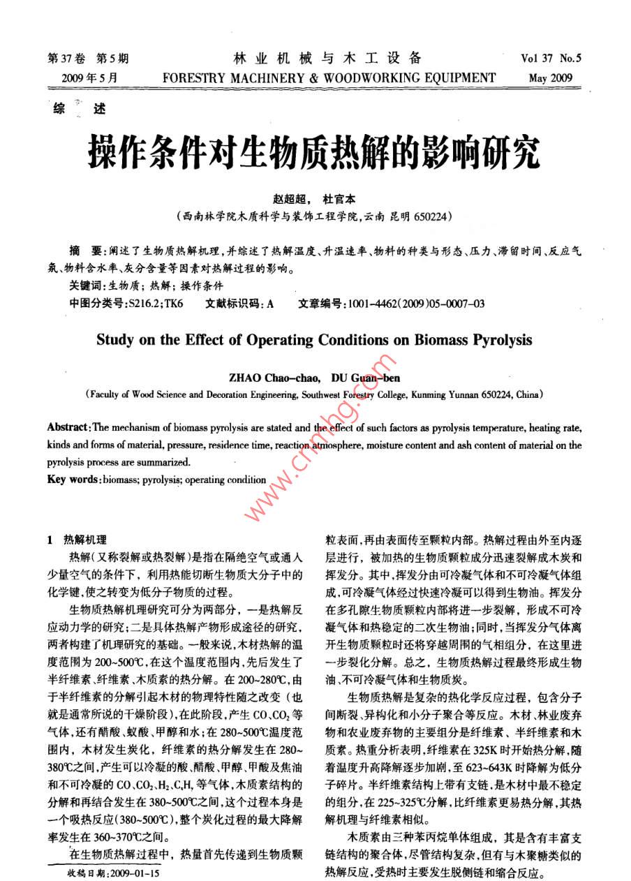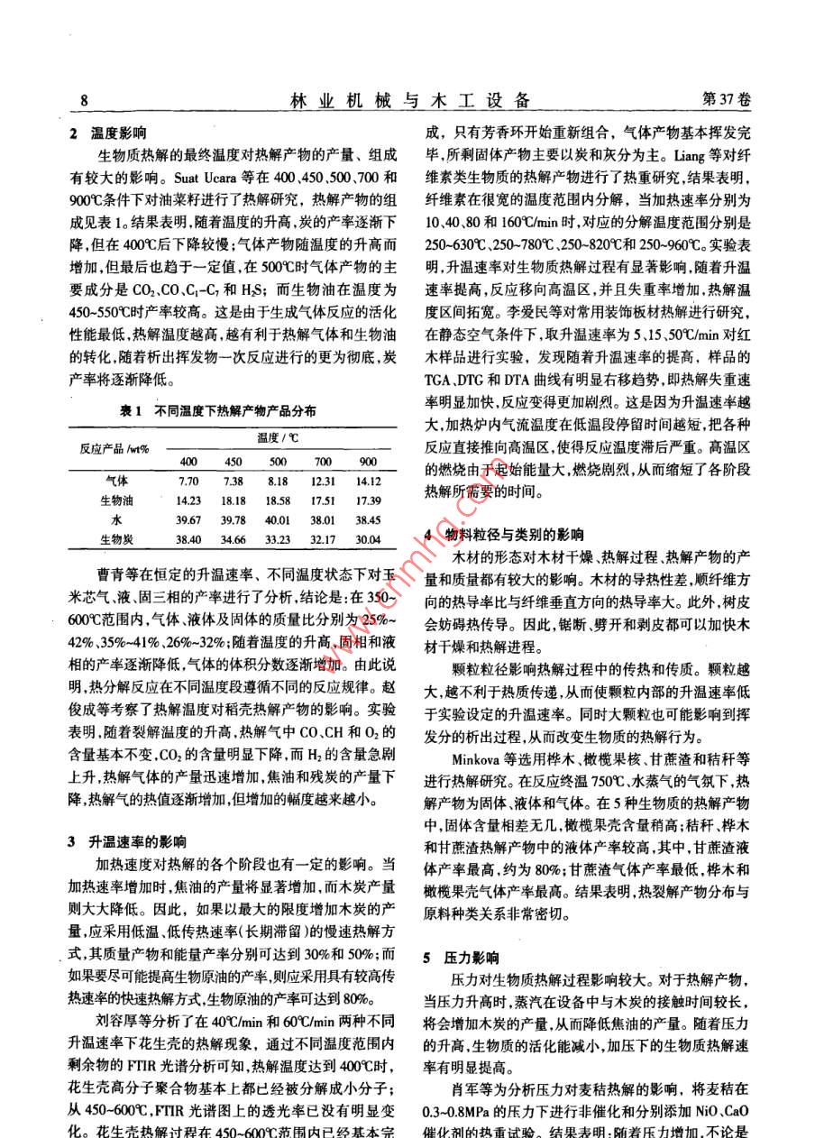 第37卷第5期林業(yè)機(jī)械與木工設(shè)備Vol 37 No52009年5月FORESTRY MACHINERY WOoDWORKING EQUIPMENtMay 2009綜述操作條件對(duì)生物質(zhì)熱解的影響研究趙超超,杜官本(西南林學(xué)院木質(zhì)科學(xué)與裝飾工程學(xué)院,云南昆明6504)摘要:闡述了生物質(zhì)熱解機(jī)理,并綜述了熱解溫度、升溫速率、物料的種類與形態(tài)、壓力、滯留時(shí)間、反應(yīng)氣氛、物料含水率、灰分含量等因素對(duì)熱解過程的影響。關(guān)鍵詞:生物質(zhì);熱解;操作條件中圖分類號(hào):S2162;TK6文獻(xiàn)標(biāo)識(shí)碼:A文章編號(hào):1001-4462(2009)05-0007-03Study on the Effect of Operating Conditions on Biomass PyrolysisZHAO Chao-chao. DU Guan-benFaculty of Wood Science and Decoration Engineering, Southwest Forestry College, Kunming Yunnan 650224, ChinaAbstract: The mechanism of biomass pyrolysis are stated and the effect of such factors as pyrolysis temperature heating ratekinds and forms of material, pressure, residence time, reaction atmosphere, moisture content and ash content of material on thepyrolysis process are summarizedKey words: biomass; pyrolysis; operating condition1熱解機(jī)理粒表面再由表面?zhèn)髦令w粒內(nèi)部。熱解過程由外至內(nèi)逐熱解(又稱裂解或熱裂解)是指在隔絕空氣或通入層進(jìn)行,被加熱的生物質(zhì)顆粒成分迅速裂解成木炭和少量空氣的條件下,利用熱能切斷生物質(zhì)大分子中的揮發(fā)分。其中,揮發(fā)分由可冷凝氣體和不可冷凝氣體組化學(xué)鍵使之轉(zhuǎn)變?yōu)榈头肿游镔|(zhì)的過程。成,可冷凝氣體經(jīng)過快速冷凝可以得到生物油。揮發(fā)分生物質(zhì)熱解機(jī)理研究可分為兩部分,一是熱解反在多孔隙生物質(zhì)顆粒內(nèi)部將進(jìn)一步裂解,形成不可冷應(yīng)動(dòng)力學(xué)的研究;二是具體熱解產(chǎn)物形成途徑的研究,凝氣體和熱穩(wěn)定的二次生物油;同時(shí),當(dāng)揮發(fā)分氣體離兩者構(gòu)建了機(jī)理研究的基礎(chǔ)。一般來說,木材熱解的溫開生物質(zhì)顆粒時(shí)還將穿越周圍的氣相組分,在這里進(jìn)度范圍為200~500℃C,在這個(gè)溫度范圍內(nèi),先后發(fā)生了一步裂化分解??傊?生物質(zhì)熱解過程最終形成生物半纖維素纖維素、木質(zhì)素的熱分解。在200-280,由油、不可冷凝氣體和生物質(zhì)炭。于半纖維素的分解引起木材的物理特性隨之改變(也生物質(zhì)熱解是復(fù)雜的熱化學(xué)反應(yīng)過程,包含分子就是通常所說的干燥階段),在此階段,產(chǎn)生CO、CO2等間斷裂、異構(gòu)化和小分子聚合等反應(yīng)。木材林業(yè)廢棄氣體,還有醋酸、蟻酸、甲醇和水;在280-500℃溫度范物和農(nóng)業(yè)廢棄物的主要組分是纖維素、半纖維素和木圍內(nèi),木材發(fā)生炭化,纖維素的熱分解發(fā)生在280~質(zhì)素。熱重分析表明,纖維素在325K時(shí)開始熱分解隨380℃之間,產(chǎn)生可以冷凝的酸、醋酸、甲醇、甲酸及焦油著溫度升高降解逐步加劇,至623-643K時(shí)降解為低分和不可冷凝的CO、CO2H2CH等氣體,木質(zhì)素結(jié)構(gòu)的子碎片。半纖維素結(jié)構(gòu)上帶有支鏈,是木材中最不穩(wěn)定分解和再結(jié)合發(fā)生在380-500℃C之間,這個(gè)過程本身是的組分,在225-325℃分解,比纖維素更易熱分解,其熱一個(gè)吸熱反應(yīng)(380-500℃),整個(gè)炭化過程的最大降解解機(jī)理與纖維素相似。率發(fā)生在360-370℃之間。木質(zhì)素由三種苯丙烷單體組成,其是含有豐富支在生物質(zhì)熱解過程中,熱量首先傳遞到生物質(zhì)顆鏈結(jié)構(gòu)的聚合體,盡管結(jié)構(gòu)復(fù)雜但有與木聚糖類似的收稿日期:2009-01-15熱解反應(yīng),受熱時(shí)主要發(fā)生脫側(cè)鏈和縮合反應(yīng)。林業(yè)機(jī)械與木工設(shè)備第37卷2溫度影響成,只有芳香環(huán)開始重新組合,氣體產(chǎn)物基本揮發(fā)完生物質(zhì)熱解的最終溫度對(duì)熱解產(chǎn)物的產(chǎn)量、組成畢,所剩固體產(chǎn)物主要以炭和灰分為主。Lang等對(duì)纖有較大的影響。 Suat cara等在400、450,500、700和維素類生物質(zhì)的熱解產(chǎn)物進(jìn)行了熱重研究結(jié)果表明,900℃條件下對(duì)油菜籽進(jìn)行了熱解研究,熱解產(chǎn)物的組纖維素在很寬的溫度范圍內(nèi)分解,當(dāng)加熱速率分別為成見表1。結(jié)果表明隨著溫度的升高,炭的產(chǎn)率逐漸下10,40、80和160/min時(shí),對(duì)應(yīng)的分解溫度范圍分別是降,但在400℃后下降較慢;氣體產(chǎn)物隨溫度的升高而250-630℃、250-780℃250-820℃和250~960℃。實(shí)驗(yàn)表增加,但最后也趨于一定值,在500℃時(shí)氣體產(chǎn)物的主明,升溫速率對(duì)生物質(zhì)熱解過程有顯著影響隨著升溫要成分是CO2、CO、C1-C,和HS;而生物油在溫度為速率提髙,反應(yīng)移向高溫區(qū),并且失重率增加,熱解溫450-550℃時(shí)產(chǎn)率較高。這是由于生成氣體反應(yīng)的活化度區(qū)間拓寬。李愛民等對(duì)常用裝飾板材熱解進(jìn)行研究,性能最低,熱解溫度越高,越有利于熱解氣體和生物油在靜態(tài)空氣條件下,取升溫速率為5、15、50℃min對(duì)紅的轉(zhuǎn)化隨著析出揮發(fā)物一次反應(yīng)進(jìn)行的更為徹底,炭木樣品進(jìn)行實(shí)驗(yàn),發(fā)現(xiàn)隨著升溫速率的提高,樣品的產(chǎn)率將逐漸降低。TGA、DTG和DTA曲線有明顯右移趨勢(shì),即熱解失重速衰1不同溫