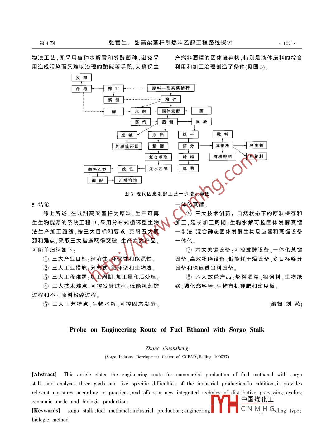 中外能源CHINA FOREIGN ENERGY2006年第11卷甜高粱莖杄制燃料乙醇工程路線探討張管生(中國(guó)地區(qū)開(kāi)發(fā)促進(jìn)會(huì)甜高梁產(chǎn)業(yè)開(kāi)發(fā)中心,北京100037摘要探討了用甜高粱莖桿工業(yè)化生產(chǎn)燃料乙醇的工程路線,分析了工業(yè)生產(chǎn)三個(gè)明確目標(biāo)和要求,五個(gè)具體矛盾和困難。根據(jù)實(shí)踐采取相應(yīng)措施,提岀了分布式加工體系,循環(huán)型經(jīng)濟(jì)模式和生物法生產(chǎn)工藝三位一體的完整工程路線。關(guān)鍵詞甜高粱莖杄燃料乙醇工業(yè)化生產(chǎn)工程路線分布式循環(huán)型生物法1前言標(biāo)就是其經(jīng)濟(jì)性,具體要求是盡可能低的成本,生用玉米、甘蔗等為原料生產(chǎn)燃料乙醇已在美產(chǎn)成本應(yīng)當(dāng)能與汽油價(jià)格競(jìng)爭(zhēng),至少爭(zhēng)取不補(bǔ)貼。國(guó)、巴西等國(guó)得到了廣泛的應(yīng)用,用甜高粱莖桿生經(jīng)調(diào)研,在目前應(yīng)努力把成本控制在4000元/左產(chǎn)燃料乙醇,也在國(guó)內(nèi)外得到了廣泛的認(rèn)可右。如進(jìn)行大規(guī)模生產(chǎn)和進(jìn)一步完善工藝則產(chǎn)品燃用玉米、瓜干等淀粉原料和甘蔗等糖蜜原料,料乙醇完全可以參與市場(chǎng)競(jìng)爭(zhēng)。生產(chǎn)食用、藥用和工業(yè)酒精已是人所共知的傳統(tǒng)產(chǎn)2,2能源性目標(biāo)和低能耗要求業(yè),而生產(chǎn)燃料乙醇,特別是用莖桿而不用糧食生同樣是生產(chǎn)乙醇,我們需要的是燃料用乙醇產(chǎn)燃料乙醇,則完全是一種新的有發(fā)展前景的產(chǎn)而不是生產(chǎn)食用酒精、醫(yī)用酒精和工業(yè)酒精。因此業(yè),特別在中國(guó)必須從實(shí)際出發(fā),探索新的路子不但對(duì)酒精的乙醇含量有明確規(guī)定(9.5%的無(wú)水我國(guó)可再生能源法規(guī)定,把生物液體能源作為乙醇),而且要求經(jīng)過(guò)改性能方便地添加到汽油中。優(yōu)先發(fā)展的領(lǐng)域,“十一五”規(guī)劃更明確地把甜高粱更重要的是要求整個(gè)生產(chǎn)過(guò)程盡可能地節(jié)省電桿制汽油醇作為首選。故許多有識(shí)之士早就開(kāi)展了汽、水、油等能源消耗,實(shí)現(xiàn)低能耗生產(chǎn)。絕不能像這方面工作,但進(jìn)展不大、不快,究其原因是真正用傳統(tǒng)生產(chǎn)酒精那樣,只要質(zhì)量達(dá)到要求,至于能源甜高粱莖杄進(jìn)行工業(yè)化生產(chǎn)存在著與傳統(tǒng)酒精生消耗多少不是關(guān)鍵問(wèn)題,經(jīng)濟(jì)上能有效益即可。通產(chǎn)巨大的差別。無(wú)論是組織路線、生產(chǎn)路線和技術(shù)常的酒精生產(chǎn)也在降低蒸汽等消耗,但主要是為了路線都要有新思想、新作法和新技術(shù)??傊?必須有降低成本,而不是為了降低能耗。而生產(chǎn)燃料酒精創(chuàng)新和突破。我們經(jīng)過(guò)多年的努力探索和具體實(shí)踐,同時(shí)整合相關(guān)資源和技術(shù),對(duì)用甜高粱莖桿工的目標(biāo)是生產(chǎn)能源,如果生產(chǎn)過(guò)程所消耗的能源接近、達(dá)到甚至超過(guò)所生產(chǎn)的能源,就使這種經(jīng)濟(jì)性業(yè)化制造變性燃料乙醇(汽油醇、柴油醇)已取得了突破性進(jìn)展。本文將對(duì)該工程路線探索的目標(biāo)要的生產(chǎn)行為變得毫無(wú)意義,甚至根本就不需要進(jìn)求、瓶頸難點(diǎn)、方法措施和技術(shù)破突作簡(jiǎn)單介紹。行。因此,生產(chǎn)全過(guò)程的能源性目標(biāo)和低能耗要求2目標(biāo)和要求是至關(guān)重要的也是必不可少的。經(jīng)研究,我們認(rèn)為2.1經(jīng)濟(jì)性目標(biāo)和低成本要求般說(shuō)來(lái)甜高粱杄生產(chǎn)燃料乙醇能耗應(yīng)控制在1由于石油的大量消耗和日益短缺及其他一些137以內(nèi),這一點(diǎn)經(jīng)過(guò)努力是能夠達(dá)到的。原因.使原油價(jià)格飛漲。因此尋找替代能源已不可避免,而用生物液體能源添加甚至完全替代汽油和作者簡(jiǎn)介中國(guó)能源研究柴油是共同努力的方向。用玉米等生產(chǎn)燃料乙醇雖會(huì)理事,長(zhǎng)期從事H中國(guó)煤化工和管理及經(jīng)濟(jì)比較成熟,但其成本較高,必須進(jìn)行補(bǔ)貼已是不爭(zhēng)工作?,F(xiàn)為中國(guó)CNMH高粱產(chǎn)業(yè)開(kāi)發(fā)的事實(shí),因此用甜高粱莖桿生產(chǎn)燃料乙醇的首要目中心主任,中國(guó)西部經(jīng)濟(jì)發(fā)展研究中心顧問(wèn)。第4期張管生,甜高粱莖杄制燃料乙醇工程路線探討2.3環(huán)保性目標(biāo)和低污染要求的加工組合,特別是采取自然貯存,既降低了成本眾所周知,城市汽車排氣是大汽污染的主要元又延長(zhǎng)了加工周期,實(shí)現(xiàn)了長(zhǎng)年加工平穩(wěn)生產(chǎn),較兇之一,而采用乙醇汽油則會(huì)大大減少這種污染。好地解決了莖桿保存與加工周期的矛盾。種植甜高粱的過(guò)程可大量吸收二氧化碳,故可達(dá)到3.3提高糖轉(zhuǎn)化率和發(fā)酵率與傳統(tǒng)工藝的矛盾碳平衡,稱為CO2零排放。更重要的是在酒精生產(chǎn)用甜高粱莖桿生產(chǎn)酒精,是因?yàn)榍o桿中所含糖過(guò)程中排放大量污染物,往往是不允許的,甚至?xí)哄N度可高達(dá)22%左右,總糖為16%上下,為此被迫停產(chǎn)關(guān)門(mén)。因此生產(chǎn)過(guò)程必須實(shí)現(xiàn)環(huán)保性目標(biāo)充分利