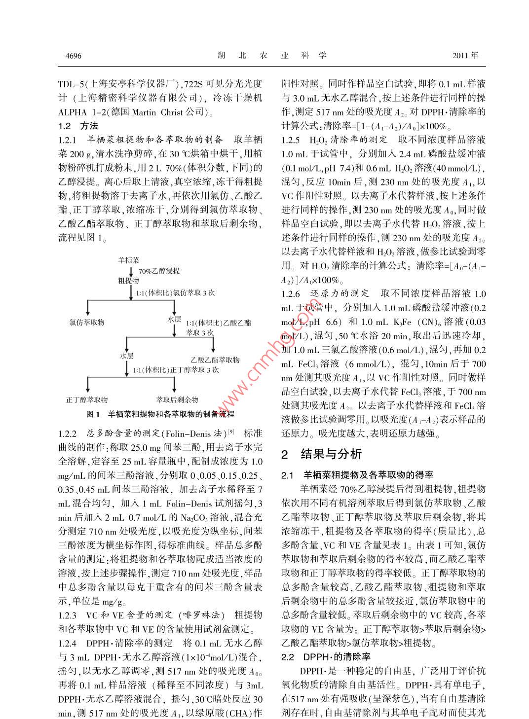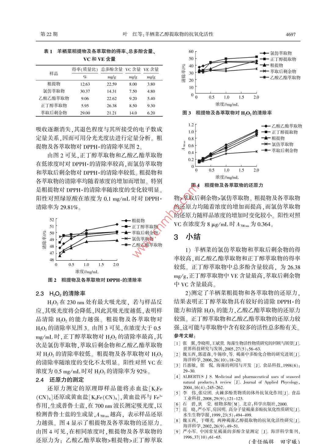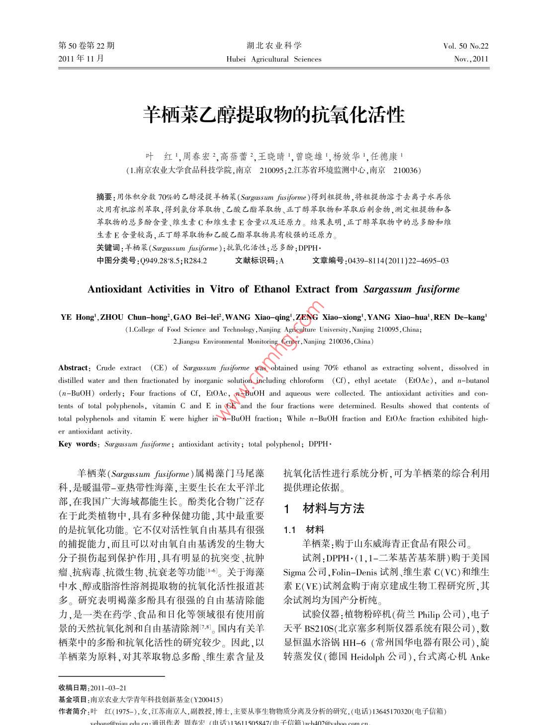 第50卷第22期湖北農(nóng)業(yè)科學(xué)2011年11月Hubei Agricultural SciencesNov. 2011羊棲萊乙醇提取物的抗氧化活性葉紅1,周春宏2,高蓓蕾2,王曉晴1,曾曉雄',楊效華,任德康1(1.南京農(nóng)業(yè)大學(xué)食品科技學(xué)院,南京21095;2江蘇省環(huán)境監(jiān)測中心,南京210036)摘要:用體積分數(shù)70%的乙醇浸提羊棲菜( Sargassum fus forme)得到粗提物,將粗提物溶于去離子水再依次用有機溶劑萃取,得到氯仿萃取物、乙酸乙酯萃取物、正丁醇萃取物和萃取后剩余物,測定粗提物和各萃取物的總多酚含量、維生素C和維生素E含量以及還原力。結(jié)果表明,正丁醇萃取物中的總多酚和維生素E含量較高,正丁醇萃取物和乙酸乙酯萃取物具有較強的還原力關(guān)鍵詞:羊棲菜( Sargassum fusiforme);抗氧化活性;總多酚;DPH中圖分類號:Q9492885;R2842文獻標識碼:A文章編號:0439-8114(201122-4695-03Antioxidant Activities in Vitro of Ethanol Extract from Sargassum fusiformeYE Hong, ZHOU Chun-hong GAO Bei-lei, WANG Xiao-qing, ZENG Xiao-xiong, YANG Xiao-hua, REN De-kang'(1. College of Food Science and Technology, Nanjing Agriculture University, Nanjing 210095, China2 Jiangsu Environmental Monitoring Center, Nanjing 210036, China)Abstract: Crude extract (CE) of Sargassum fusiforme was obtained using 70% ethanol as extracting solvent, dissolved indistilled water and then fractionated by inorganic solution including chloroform (Cf), ethyl acetate (EtOAc), and n-butanoln-BuOH)orderly; Four fractions of Cf, EtOAc, n-BuOH and aqueous were collected. The antioxidant activities and con-tents of total polyphenols, vitamin C and E in CE and the four fractions were determined. Results showed that contents oftotal polyphenols and vitamin E were higher in n-BuOH fraction; While n-BuOH fraction and EtOAc fraction exhibited higher antioxidant activItyKey words: Sargassum fusiforme; antioxidant activity; total polyphenol; DPPH羊棲菜( Sargassum fusiforme)屬褐藻門馬尾藻抗氧化活性進行系統(tǒng)分析,可為羊棲菜的綜合利用科,是暖溫帶-亞熱帶性海藻,主要生長在太平洋北提供理論依據(jù)。部,在我國廣大海域都能生長。酚類化合物廣泛存在于此類植物中,具有多種保健功能,其中最重要材料與方法的是抗氧化功能。它不僅對活性氧自由基具有很強1.1材料的捕捉能力,而且可以對由氧自由基誘發(fā)的生物大羊棲菜:購于山東威海青正食品有限公司分子損傷起到保護作用,具有明顯的抗突變、抗腫試劑:DPPH·(1,1-二苯基苦基苯肼)購于美國瘤、抗病毒、抗微生物、抗衰老等功能1。關(guān)于海藻Siga公司, Folin- Denis試劑、維生素C(VC)和維生中水、醇或脂溶性溶劑提取物的抗氧化活性報道甚素E(VE)試劑盒購于南京建成生物工程研究所,其多。研究表明褐藻多酚具有很強的自由基清除能余試劑均為國產(chǎn)分析純。力,是一類在藥學(xué)、食品和日化等領(lǐng)域很有使用前試驗儀器:植物粉碎機(荷蘭 Philip公司),電子景的天然抗氧化劑和自由基清除劑8。國內(nèi)有關(guān)羊天平BS210s(北京塞多利斯儀器系統(tǒng)有限公司),數(shù)棲菜中的多酚和抗氧化活性的研究較少。因此,以顯恒溫水浴鍋HH-6(常州國華電器有限公司),旋羊棲菜為原料,對其萃取物總多酚、維生素含量及轉(zhuǎn)蒸發(fā)儀(德國 Heidolph公司),臺式離心機Anke收稿日期:2011-03-21基金項目:南京農(nóng)業(yè)大學(xué)青年科技創(chuàng)新基金(Y200415)作者簡介:葉紅(1975-),女,江蘇南京人,副教授,博士,主要從事生物物質(zhì)分離及分析的研究,(電話)13645170320(電子信箱)4696湖北農(nóng)業(yè)科學(xué)011年TDL-5(上海安亭科學(xué)儀器廠),722S可見分光光度陽性對照。同時作樣品空白試驗,即將0.1mL樣液計(上海精密科學(xué)儀器有限公司),冷凍干燥機與3.0mL無水乙醇混合,按上述條件進行同樣的操ALPHA1-2(德國 Martin christ公司)。作,測定517mm處的吸光度A20對DPH清除率的1.2方法計算公式:清除率=[1-(A1-A2)Ab]×100%。1.2.1羊棲萊粗提物和各萃取物的制備取羊梄1.2.5HO2清除率的測定取不同濃度樣品溶液菜200g,清水洗凈剪碎,在30℃烘箱中烘干,用植1.0mL于試管中,分別加入2.4mL磷酸鹽緩沖液物粉碎機打成粉末,用2L70%(體積分數(shù),下同)的(0.mol/,pH74)和06mLHO2溶液(40mmo/),乙醇浸提。離心后取上清液,真空濃縮,凍干得粗提混勻,反應(yīng)10min后,測230m處的吸光度A1,以物,將粗提物溶于去離子水,再依次用氯仿、乙酸乙VC作陽性對照。以去離子水代替樣液,按上述條件酯、正丁醇萃取,濃縮凍干,分別得到氯仿萃取物、進行同樣的操作,測230m處的吸光度A,同時做乙酸乙酯萃取物、正丁醇萃取物和萃取后剩余物,樣品空白試驗,即以去離子水代替HO2溶液,按上流程見圖述條件進行同樣的操作,測230mm處的吸光度A2。以去離子水代替樣液和HO2溶液,做參比試驗調(diào)零羊棲菜70%乙醇浸提用。對HO2清除率的計算公式:清除率=[Aa-(AA2)]/A100%。1:1(體積比)氯仿萃取3次1.2.6還原力的測定取不同濃度樣品溶液1.0mnL于試管中,分別加入1.0mL磷酸鹽緩沖液(0.2氯仿萃取物1:1(體積比)乙酸乙酯mol/L,pH6.6)和1.0mLKe(CN)6溶液(0.03mol/L),混勻,50℃水浴20min,取出后迅速冷卻,加10mL三氯乙酸溶液(0.6mol/L),混勻,再加0.2乙酸乙酯萃取物1:1(體積比)正丁醇萃取3次mL Fecl3溶液(6mmol/L),混勻,10min后于700nm處測其吸光度A1,以VC作陽性對照。同時做樣品空白試驗,以去離子水代替FeCl3溶液,于700mm正丁醇萃取物萃取后剩余物處測其吸光度A2。以去離子水代替樣液和FeCl3溶圖1羊棲菜粗提物和各萃取物的