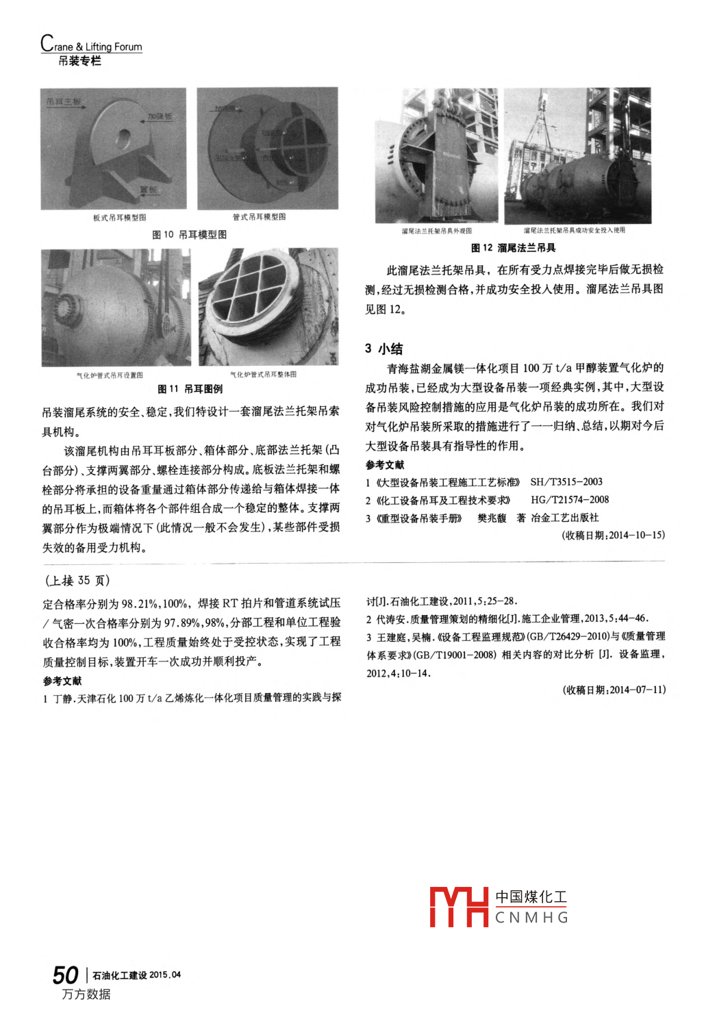 Crane & Liting Forum吊裝專欄大型氣化爐雙機抬吊法吊裝的風險控制劉中培中國化學工程第十一建設有限公司河南開封 475002摘要結合青海鹽湖金屬鎂- -體化項目100萬t/a甲醇裝置-標段氣化爐吊裝,針對本項目氣化爐吊裝所做的各項吊裝風險控制工作,達到氣化爐安全吊裝。其中包括:氣化爐吊裝方案的編制,吊裝方案及吊裝工藝方法的專家論證,氣化爐吊裝地基處理及檢驗,氣化爐吊裝機.索具的選擇,氣化爐吊裝人員.機.索具資質(zhì)審查,氣化爐主、副吊耳的選型及制作等方面論述大型設備吊裝風險控制措施。關鍵詞氣化爐吊裝工藝 拾吊法風險控制中圖分類號TQ082文獻標識碼B文章編號1672- -9323 (2015)04-0047-04隨著我國經(jīng)濟的快速發(fā)展,化工工程建設項目中設備大型吊裝工藝進行吊裝作業(yè)。該抬吊法技術比較成熟,也是最為快捷化發(fā)展趨勢越來越突出;裝置的大型設備工廠化制作和模塊化和技術難度最低的吊裝工藝,同時也是吊裝安全風險較小的方安裝是近幾年設備安裝的主流方向,設備噸位越來越大,吊裝要法之一。求越來越高。立式設備整體吊裝青海鹽湖金屬鎂- -體化項目100 萬t/a甲醇裝置的氣化爐是水煤漿加壓氣化過程的核心設備,具有設備重量大,滑移法抬吊法(322.68t) ,就位高度高(35. 5m) ,就位后高度達到53m,吊裝作業(yè)半徑大等特點,氣化爐吊裝是近幾年化工裝置整體吊裝設備的最為典型的代表之一。 與此同時,設備吊裝的風險相當大。為了解決氣化爐整體順利吊裝,我們針對吊裝的安全性,做了吊裝風險評估,并采取了相關的吊裝安全技術措施。1氣化爐吊裝工藝概述圖1常用立式大型設備吊裝方法匯總整體大型立式設備- -次吊裝方法多種多樣,按照吊裝機具的不同可以分為“吊車法".“門式起重機法”、“桅桿法”;按照吊2大型設備吊裝風險控制措施裝原理可以分為“抬吊法" .“滑移法”、“扳轉(zhuǎn)法"。以上每種吊裝2.1大型設備吊裝方案專家論證方法因吊點的設置,吊裝機具配置、繩索布置形式等因素又分為青海鹽湖金屬鎂- -體化項目 100萬 t/a甲醇裝置- -標段工若干類型。隨著我國大型吊裝機具的現(xiàn)代化和大型化,同時對設程,三臺大型設備氣化爐吊裝,是本項目重中之重。為了保障設備的吊裝安全要求越來越高,扳轉(zhuǎn)法等傳統(tǒng)方法逐漸被淘汰。結備吊裝安全,明確吊裝任務,控制吊裝風險,確保吊裝過程順利合近幾年來行業(yè)內(nèi)的典型吊裝案例,目前經(jīng)常使用的吊裝方法進行,實現(xiàn)安全吊裝,我項目部針對大型設備吊裝方案進行科如圖1所示。學、合理、可行性專家組論證會.專家組針對大型設備吊裝方案由于氣化爐就位在氣化框架35. 5m的基礎上,考慮到吊裝進行科學、合理中國煤化工方案內(nèi)的不足之處,場地的局限性和安裝工期要求等因素,決定采取雙吊車抬吊的及吊裝過程中YHCN M H G注意的相關細節(jié)。經(jīng)過大型設備吊裝方案的專家論證,使氣化爐大型設備吊裝方石油化工建設215.04 | 47.ne & Lifting Forum吊裝專欄板式吊耳模型圖管式吊耳模型圖圖10吊耳模型圖溜尾法蘭托架吊具外硬田富尾法蘭托架吊具成功安全投入使用圖12溜尾法蘭吊具此溜尾法蘭托架吊具,在所有受力點焊接完畢后做無損檢測,經(jīng)過無損檢測合格,并成功安全投入使用。溜尾法蘭吊具圖見圖12。3小結氣化爐管式吊耳設置圖氣化妒管式吊耳整體國青海鹽湖金屬鎂- -體化項目100萬t/a甲醇裝置氣化爐的圖11吊耳圖例成功吊裝,已經(jīng)成為大型設備吊裝- -項經(jīng)典實例,其中,大型設吊裝溜尾系統(tǒng)的安全、穩(wěn)定,我們特設計-套溜尾法蘭托架吊索備吊裝風險控制措施的應用是氣化爐吊裝的成功所在。我們對具機構。對氣化爐吊裝所采取的措施進行了一-歸納、總結,以期對今后該溜尾機構由吊耳耳板部分.箱體部分.底部法蘭托架(凸大型設備吊裝具有指導性的作用。臺部分) .支撐兩翼部分.螺栓連接部分構成。底板法蘭托架和螺參考文獻栓部分將承擔的設備重量通過箱體部分傳遞給與箱體焊接- -體1《大型設備吊裝工程施工工藝標準) SH/T3515- -2003的吊耳板上,而箱體將各個部件組合成-一個穩(wěn)定的整體。支撐兩2化工設備吊耳及工程技術要求)HG/T21574- 2008翼部分作為極端情況下(此情況- -般不會發(fā)生) ,某些部件受損3重型設備吊裝手冊)樊兆馥 著冶金工藝出版社(收稿日期:2014-10-15)失效的備用受力機構。(上接35頁)定合格率分別為98.21%, 10%,焊接RT拍片和管道系統(tǒng)試壓討[J].石油化工建設,2011,5:25- -28./氣密一次合格率分別為97. 89%,98%,分部工程和單位工程驗2代濤安.質(zhì)量管理策劃的精細化[].施工企業(yè)管理,2013,5:44- 46.收合格率均為100%,工程質(zhì)量始終處于受控狀態(tài),實現(xiàn)了工程3王建庭,吳楠.《設備工程監(jiān)理規(guī)范)(GB/T26429- 2010)與 《質(zhì)量管理質(zhì)量控制目標,裝置開車- -次 成功并順利投產(chǎn)。體系要求)(GB/T1900 - 20080相關內(nèi)容的對比分析[I].設備監(jiān)理,2012,4:10-14.1丁靜.天津石化100萬t/a乙烯煉化一體化項目質(zhì)量管理的實踐與探(收稿日期:2014- 07-11)中國煤化工MHCNMHG50 |石油化工建設2015.0