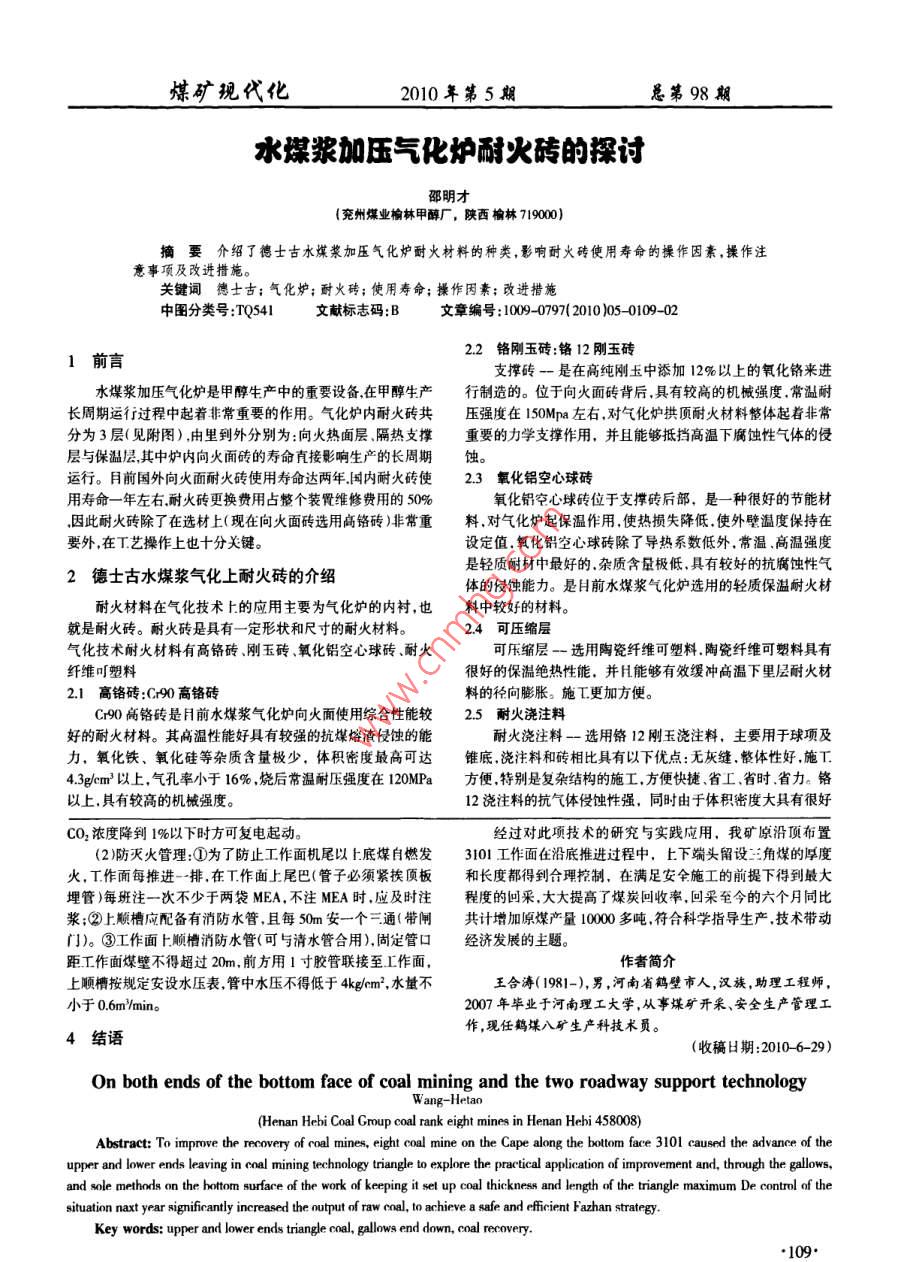 煤礦規(guī)代化2010年第5期忌第98期水煤漿加壓氣化耐火磚的深討邵明才兗州煤業(yè)榆林甲醇廠,陜西榆林719000摘要介紹了德士古水煤漿加壓氣化爐耐火材料的種類,影響耐火磚使用壽命的操作因素,操作注意事項及改進措施。關鍵詞德士古;氣化爐;耐火磚;使用壽命;操作因素;改進措施中圖分類號:TQ541文獻標志碼:B文章編號:10090797(2010)05-010901前言22鉻剛玉磚:鉻12剛玉磚支撐磚一是在高純剛玉中添加12%以上的氧化鉻來進水煤漿加壓氣化爐是甲醇生產(chǎn)中的重要設備在甲醇生產(chǎn)行制造的。位于向火面磚背后,具有較高的機械強度,常溫耐長周期運行過程中起著非常重要的作用。氣化爐內(nèi)耐火磚共壓強度在150Mna左右,對氣化爐拱頂耐火材料整體起著非常分為3層(見附圖),由里到外分別為:向火熱面層、隔熱支撐重要的力學支撐作用,并且能夠抵擋高溫下腐蝕性氣體的侵層與保溫層,其中爐內(nèi)向火面磚的壽命直接影響生產(chǎn)的長周期蝕運行。目前國外向火面耐火磚使用壽命達兩年國內(nèi)耐火磚使23氧化鋁空心球磚用壽命一年左右耐火磚更換費用占整個裝置維修費用的50%氧化鋁空心球磚位于支撐磚后部,是一種很好的節(jié)能材此耐火磚除了在選材上(現(xiàn)在向火面磚選用高鉻磚)非常重料,對氣化爐起保溫作用,使熱損失降低使外壁溫度保持在要外,在工藝操作上也十分關鍵。設定值,氧化鋁空心球磚除了導熱系數(shù)低外,常溫、高溫強度2德士古水煤漿氣化上耐火磚的介紹是輕質(zhì)耐材中最好的,雜質(zhì)含量極低,具有較好的抗腐蝕性氣體的侵蝕能力。是目前水煤漿氣化爐選用的輕質(zhì)保溫耐火材耐火材料在氣化技術上的應用主要為氣化爐的內(nèi)襯,也料中較好的材料。就是耐火磚。耐火磚是具有一定形狀和尺寸的耐火材料24可壓縮層氣化技術耐火材料有高鉻磚、剛玉磚、氧化鋁空心球磚耐火可壓縮層一選用陶瓷纖維可塑料陶瓷纖維可塑料具有纖維可塑料很好的保溫絕熱性能,并H能夠有效緩沖高溫下里層耐火材2.1高鉻磚:C90高鉻磚料的徑向膨脹。施工更加方使C^0高鉻磚是目前水煤漿氣化爐向火面使用綜合性能較2.5耐火澆注料好的耐火材料。其高溫性能好具有較強的抗煤熔渣侵蝕的能耐火澆注料一選用鉻12剛玉澆注料,主要用于球項及力,氧化鐵、氧化硅等雜質(zhì)含量極少,體積密度最高可達錐底,澆注料和磚相比具有以下優(yōu)點:無灰縫、整體性好,施T4.3gcm3以上,氣孔率小于16%,燒后常溫耐壓強度在120MPa方便特別是復雜結(jié)構(gòu)的施工,方便快捷省工、省時省力。鉻以上,具有較高的機械強度。12澆注料的抗氣體侵蝕性強,同時由于體積密度大具有很好CO2濃度降到1%以下時方可復電起動。經(jīng)過對此項技術的研究與實踐應用,我礦原沿頂布置(2)防滅火管理:①為了防止工作面機尾以上底煤自燃發(fā)3101工作面在沿底推進過程中,上下端頭留設三角煤的厚度火,工作面每推進一排,在工作面上尾巴(管子必須緊挨頂板和長度都得到合理挖制,在滿足安全施工的前提下得到最大埋管)每班注一次不少于兩袋MEA,不注MEA時,應及時注程度的回采,大大提高了煤炭回收率,回采至今的六個月同比漿;②上順槽應配備有消防水管,且每50m安一個三通(帶閘共計增加原煤產(chǎn)量10000多噸符合科學指導生產(chǎn),技術帶動門)。③工作面順槽消防水管(可與清水管合用),固定管口經(jīng)濟發(fā)展的主題距工作面煤壁不得超過20m,前方用1寸膠管聯(lián)接至工作面,作者簡介上順槽按規(guī)定安設水壓表管中水壓不得低于4kgm2,水量不王合濟(1981-),男,河南省鶴壁市人,漢族,助理工程師,小于06m/min。2007年畢業(yè)于河南理工大學,從事煤礦開采、安全生產(chǎn)管理工4結(jié)語作,現(xiàn)任鶴煤八礦生產(chǎn)科技術員。(收稿日期:2010-6-29)On both ends of the bottom face of coal mining and the two roadway support technologyWang-HetaoHenan Hebi Coal Group coal rank eight mines in Henan Hebi 458008)Abstract: To improve the recovery of coal mines, eight coal mine on the Cape along the bottom face 3101 caused the advance ofupper and lower ends leaving in coal mining technology triangle to explore the practical application of improvement and, through the gallows,and sole methods on the bottom surface of the work of keeping it set up coal thic kness and length of the triangle maximum De control of thesituation naxt year significantly increased the output of raw coal, to achieve a safe and efficient Fazhan strategy.Key words: upper and lower ends triangle coal, gallows end down, coal recovery109煤礦現(xiàn)代化010年第5期忌第98期的氣密性因此還具有防止拱頂和錐底竄氣現(xiàn)象的發(fā)生。就必然加速熱而磚的侵蝕和滲透提供條件。同時由于渣量增大清渣次數(shù)必然要增加,對爐襯壽命頗具影響。據(jù)統(tǒng)計,生產(chǎn)負荷增加30%,熱面磚使用壽命降低33%8注料開停車次數(shù)的影響也較大。統(tǒng)計結(jié)果顯示投料次數(shù)每增氧化鋁空心球磚加一倍侵損速率將增加一倍;通常開停爐一次,熱面磚侵損5~20mm尤其當渣中CaO含量時尤為明顯35噴嘴的影響倍玉磚噴嘴中心線與氣化爐中心線不重合,偏離度過大或噴嘴高倍磚霧化角過大,也將造成熱面磚壽命降低4高鉻磚使用中的注意事項(1)控制合理的氧煤比。(2)調(diào)整噴嘴的霧化角度圖1氣化爐耐火襯里示意圖(3)調(diào)整以及穩(wěn)定煤灰的成分,穩(wěn)定操作溫度