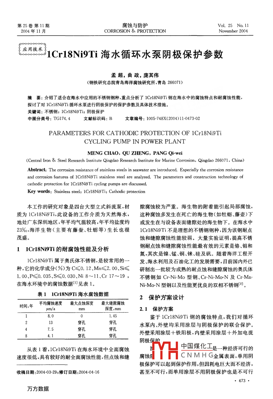 第25卷第11期腐蝕與防護(hù)Vol.25 No. 112004年11 月CORROSION & PROTECTIONNovember 20048應(yīng)用技術(shù)1Cr18Ni9Ti海水循環(huán)水泵陰極保護(hù)參數(shù)孟超,曲政,龐其偉(鋼鐵研究總院青島海洋腐蝕研究所,青島266071)摘要:介紹了適合在海水中應(yīng)用的不銹鋼鋼種,重點(diǎn)分析了1Cr18Ni9Ti鋼在海水中的腐蝕特點(diǎn)和耐腐蝕性能,探討了對(duì)1Cr18Ni9Ti 循環(huán)水泵進(jìn)行陰極保護(hù)的保護(hù)參數(shù)及具體技術(shù)措施。關(guān)鍵詞:不銹鋼; 1Cr18Ni9Ti; 陰極保護(hù)中圖分類號(hào): TG174. 4文獻(xiàn)標(biāo)識(shí)碼: B文章編號(hào): 1005-748X(2004)11-0473-02PARAMETERS FOR CATHODIC PROTECTION OF 1Cr18Ni9TiCYCLING PUMP IN POWER PLANTMENG CHAO, QU ZHENG, PANG Qi-wei(Central lron & Steel Research Institute Qingdao Research Institute for Marine Corrosion, Qingdao 266071, China)Abstract: The corrosion resistance of stainless steels in seawater are introduced. Especially the corrosion resistanceand corrosion features of 1Cr18NI9Ti stainless steel are analyzed. The parameters and construction technology ofcathodic protection for 1Crl8Ni9Ti cycling pumps are discussed.Key words: Stainless steel; 1Cr18Ni9Ti; Cathodic protection本工作的研究對(duì)象是四臺(tái)大型立式斜流泵,材隙腐蝕較為嚴(yán)重。海生物的附著能引起局部腐蝕,質(zhì)為1Crl8Ni9Ti,此設(shè)備的工作介質(zhì)為天然海水,這種腐蝕多發(fā)生在死亡的海生物(如牡蠣、藤壺)下地處廣東深圳地區(qū),年平均氣溫較高,年平均鹽度約或發(fā)生在與設(shè)備表面縫隙處的海生物下。在海水中23%o,海洋生物(主要有藤壺、牡蠣等)生長(zhǎng)也很1Cr18Ni9Ti 不是理想的不銹鋼鋼種,因?yàn)樵撲撃忘c(diǎn)茂盛。蝕和縫隙腐蝕性能較弱。大量實(shí)驗(yàn)證明,提高不銹鋼耐點(diǎn)蝕和縫隙腐蝕性能最有效的元素是鉻、鉬和11Cr18Ni9Ti 的耐腐蝕性能及分析氮,其次是鎳、錳、銅、錸、硅及礬。隨著海洋工程開1Cr18Ni9Ti屬于奧氏體不銹鋼,是較常用的一發(fā) 、海水利用及石油化工的發(fā)展需要,目前國(guó)內(nèi)外已種,它的化學(xué)成分(%)為C≤0.12、Mn≤2.00、Sis <研制出一 批較為成熟的耐點(diǎn)蝕和縫隙腐蝕的奧氏體1. 0、P≤O.035、S≤0.030、Ni8~11、Cr17~19,不銹鋼 如Cr-Ni-Mo型鋼、C-Ni-Mo-N及Cr-Mm在海水環(huán)境中的腐蝕數(shù)據(jù)凹見表1。Ni-Mo-N型鋼以及性能更優(yōu)良的雙相不銹鋼[2}。表11Crl8Ni9Ti 海水腐蝕數(shù)據(jù)2保護(hù)方案設(shè)計(jì)時(shí)間,年平均腐蝕速度最大點(diǎn)蝕深度 最大縫隙腐蝕um/amm深度,mm2.1保護(hù)方案B.01.45鑒于1Cr18Ni9Ti鋼的腐蝕特點(diǎn),我們對(duì)循環(huán)13穿孔孔水泵內(nèi)、外壁均采用涂層與陰極保護(hù)的聯(lián)合保護(hù)。7. 5乳外壁采用涂層+鐵陽(yáng)極,內(nèi)壁采用涂層+外加電流4.1陰極保護(hù)從表1看,1Cr18Ni9Ti在海水環(huán)境中全面腐蝕中國(guó)煤化工是-種經(jīng)濟(jì)可行的速度很低,具有較好的耐全面腐蝕性能,但點(diǎn)蝕和縫腐蝕MYHCNMHG金屬表面,單用陰極保護(hù)可以起到保護(hù)作用,但因耗電巨大而不經(jīng)濟(jì),收稿日期:2004-03-29;修訂日期:2004-04-16甚至不可行,而單用涂層不用陰極保護(hù)也是不可行孟超等:1Cr18Ni9Ti海水循環(huán)水泵陰極保護(hù)參數(shù)的,一是涂層的壽命較短,二是理想狀態(tài)的涂層難以(2)涂層施工:選用環(huán)氧類不銹鋼專用涂料,按實(shí)現(xiàn),一旦涂層有針孔或破損,就會(huì)形成大陰極(涂照涂層施工標(biāo)準(zhǔn)及涂料說(shuō)明書涂刷兩道(一底層覆蓋部分)小陽(yáng)極(針孔或破損部分)的腐蝕電池,- -面)。使腐蝕集中在針孔或破損的局部,這-作用的結(jié)果(3)鐵陽(yáng)極安裝:采用螺栓固定,螺栓是在水泵比不用涂層更為嚴(yán)重,會(huì)加速設(shè)備的點(diǎn)蝕,造成設(shè)備生產(chǎn)時(shí)預(yù)留的。因局部破壞而報(bào)廢。涂層與陰極保護(hù)的聯(lián)合保護(hù),(4)外加電流陰保系統(tǒng)安裝:將輔助陽(yáng)極、參比大大減少了金屬裸露的面積,使得陰極保護(hù)的電流電極用螺栓固定在預(yù)留孔上,將電纜從保護(hù)套管中密度大幅降低,極大地?cái)U(kuò)大了保護(hù)范圍,使陰極保護(hù)引至地面,連接到恒電位儀各相應(yīng)接線柱。變得經(jīng)濟(jì)和可行。4保護(hù)參數(shù)2.2鐵陽(yáng)極選 用碳鋼在海水中,鐵陽(yáng)極有較負(fù)的腐蝕電位,初始電位(1)極化曲線測(cè)量:為了更接近現(xiàn)場(chǎng)的實(shí)際情在-0.68~-0.72V(SCE),穩(wěn)定電位在-0.64 ~況,將1Cr18Ni9Ti試樣經(jīng)打磨處理后放置在空氣-0. 71V(SCE),并且在海水中的腐蝕電位穩(wěn)定,波中暴露一段時(shí)間,測(cè)其在海水中的極化曲線(見圖動(dòng)較小,比銅及銅合金、不銹鋼的腐蝕電位負(fù)1),從極化曲線看自腐蝕電位為-320mV,當(dāng)掃描450mV以上,對(duì)不銹鋼有較高的驅(qū)動(dòng)電位,接近或電位達(dá)到- 600mV時(shí)極化曲線開始變得比較緩和。大于鋁陽(yáng)極對(duì)碳鋼的驅(qū)動(dòng)電位。目前國(guó)內(nèi)對(duì)鐵基犧200-100-牲陽(yáng)極的利用較少,但也有一些實(shí)際應(yīng)用證明,鐵陽(yáng)極保護(hù)能有效防止不銹鋼的腐蝕。用碳鋼做陽(yáng)極在ε -100- 200海水中保護(hù)不銹鋼可達(dá)8年以上,并且鐵陽(yáng)極除具當(dāng)-300:備犧牲陽(yáng)極應(yīng)必備的條件外,還具有成本低、材料來(lái)400-- 500-源廣等優(yōu)點(diǎn),在保護(hù)