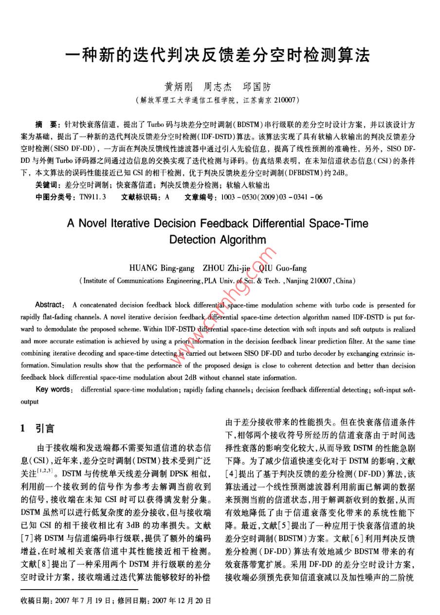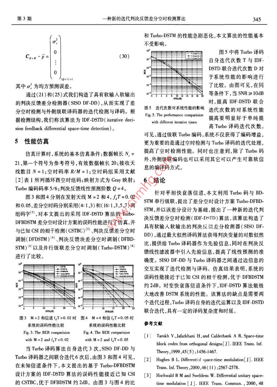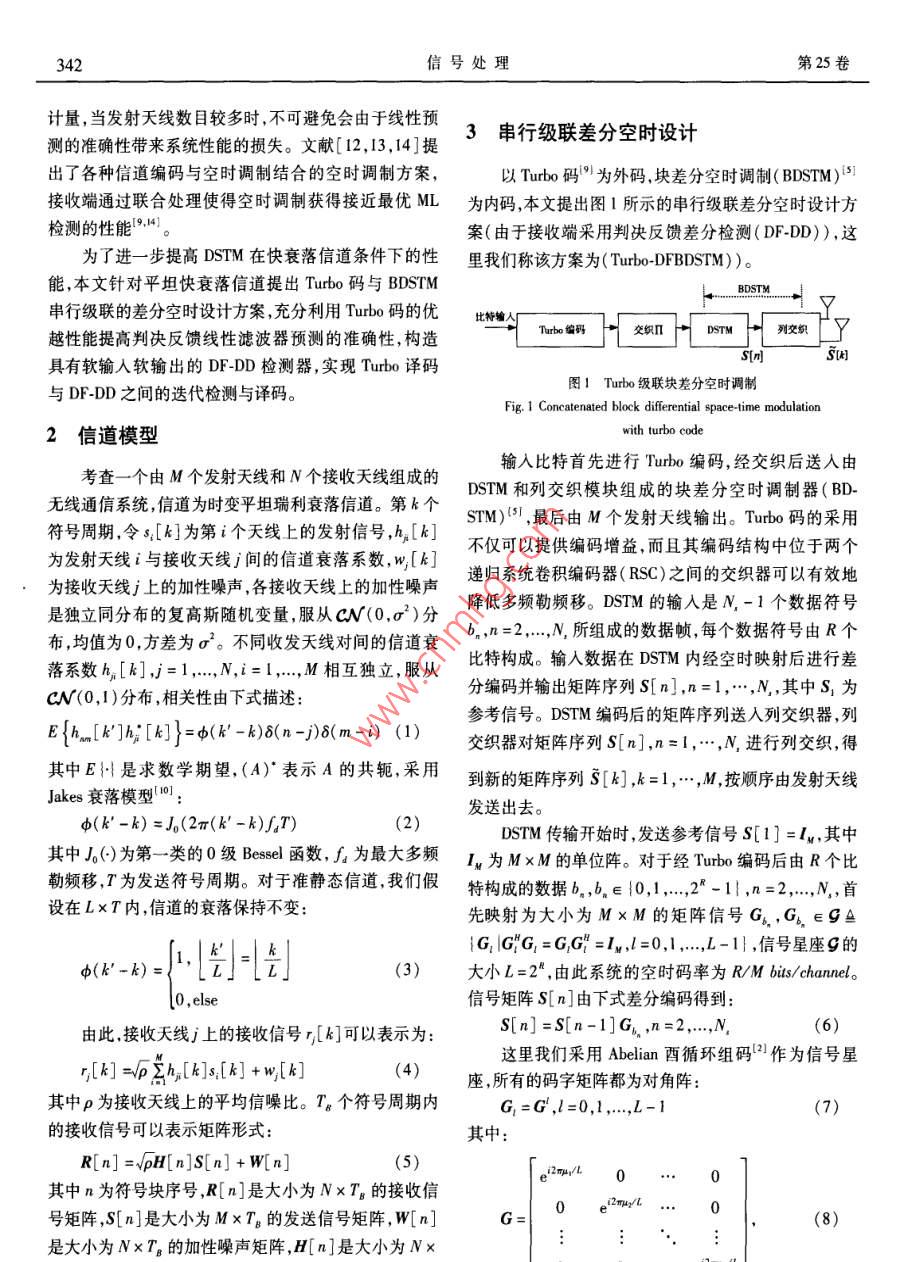 種新的迭代判決反饋差分空時(shí)檢測(cè)算法黃炳剛周志杰邱國(guó)防(解放軍理工大學(xué)通信工程學(xué)院,江蘇南京210007摘要:針對(duì)快衰落信道,提出了Tuto碼與塊差分空時(shí)調(diào)制( BDSTM)串行級(jí)聯(lián)的差分空時(shí)設(shè)計(jì)方案,并以該設(shè)計(jì)方案為基礎(chǔ),提出了一種新的迭代判決反饋差分空時(shí)檢測(cè)(IDF-DSTD)算法。該算法實(shí)現(xiàn)了具有軟輸入軟輸出的判決反饋差分空時(shí)檢測(cè)( SISO DE-DD),一方面在判決反饋線性濾波器中通過引入先驗(yàn)信息,提高了線性預(yù)測(cè)的準(zhǔn)確性,另外, SISO DFDD與外側(cè) Turbo譯碼器之間通過邊信息的交換實(shí)現(xiàn)了迭代檢測(cè)與譯碼。仿真結(jié)果表明,在未知信道狀態(tài)信息(CS)的條件下,本文算法的誤碼性能接近已知CSI的相干檢測(cè),優(yōu)于判決反饋塊差分空時(shí)調(diào)制( DFBDSTM)約2dB。關(guān)鍵詞:差分空時(shí)調(diào)制;快衰落信道;判決反饋差分檢測(cè);軟輸入軟輸出中圖分類號(hào):TN9.3文獻(xiàn)標(biāo)識(shí)碼:A文章編號(hào):1003-0530(2009)03-0341-06A Novel Iterative Decision Feedback Differential Space-TimeDetection AlgorithmHUANG Bing-gang ZHOU Zhi-jie QIU Guo-fangInstitute of Communications Engineering, PLA Univ of Sci. Tech., Nanjing 210007, China)Abstract: A concatenated decision feedback block differential space-time modulation scheme with turbo code is presented forpidly flat-fading channels. a novel iterative decision feedback differential space-time detection algorithm named IDF-DSTD is put for-ward to demodulate the proposed scheme. Within IDF-DSTD differential space-time detection with soft inputs and soft outputs is realizedand more accurate estimation is achieved by using a priori information in the decision feedback linear prediction filter. At the same timecombining iterative decoding and space-time detecting is carried out between SISO DF-DD and turbo decoder by exchanging extrinsic in-formation. Simulation results show that the performance of the proposed design is close to coherent detection and better than decisionfeedback block differential space-time modulation about 2dB without channel state information.Key words: differential space-time modulation; rapidly fading channels; decision feedback differential detecting; soft-input soft-1引言由于差分接收帶來的性能損失。但在快衰落信道條件下,相鄰兩個(gè)接收符號(hào)所經(jīng)歷的信道衰落由于時(shí)間選由于接收端和發(fā)送端都不需要知道信道的狀態(tài)信擇性衰落的影響變化較大,從而導(dǎo)致DSTM的性能急劇息(CS1),近年來,差分空時(shí)調(diào)制(DSTM)技術(shù)受到廣泛下降。為了減少信道快速變化對(duì)于DsTM的影響,文獻(xiàn)關(guān)注13。DSTM與傳統(tǒng)單天線差分調(diào)制DSK相似,[4】提出了基于判決反饋的差分檢測(cè)(DF-DD)算法,該利用前一個(gè)接收到的信號(hào)作為參考去解調(diào)當(dāng)前收到算法通過一個(gè)線性預(yù)測(cè)濾波器利用前面已解調(diào)的數(shù)據(jù)的信號(hào),接收端在未知CSI時(shí)可以獲得滿發(fā)射分集。來預(yù)測(cè)當(dāng)前的信道狀態(tài),用于解調(diào)新收到的數(shù)據(jù),從而DSTM雖然可以進(jìn)行低復(fù)雜度的差分接收,但與接收端有效地降低了由于信道衰落變化帶來的系統(tǒng)性能下已知CSI的相干接收相比有3dB的功率損失。文獻(xiàn)降。最近,文獻(xiàn)[5]提出了一種應(yīng)用于快衰落信道的塊[7]將DSTM與信道編碼串行級(jí)聯(lián),提供了額外的編碼差分空時(shí)調(diào)制( BDSTM)方案。文獻(xiàn)[6]利用判決反饋增益,在時(shí)域相關(guān)衰落信道中其性能接近相干檢測(cè)。差分檢測(cè)(DF-DD)算法有效地減少 BDSTM帶來的有文獻(xiàn)[8]提出了一種采用兩個(gè)DSTM并行級(jí)聯(lián)的差分效衰落帶寬擴(kuò)展。采用DFDD的差分空時(shí)設(shè)計(jì)方案,空時(shí)設(shè)計(jì)方案,接收端通過迭代算法能夠較好的補(bǔ)償接收端必須預(yù)先獲知信道衰減以及加性噪聲的二階統(tǒng)收稿日期:2007年7月19日;修回日期:2007年12月20日342信號(hào)處理第25卷計(jì)量,當(dāng)發(fā)射天線數(shù)目較多時(shí),不可避免會(huì)由于線性預(yù)測(cè)的準(zhǔn)確性帶來系統(tǒng)性能的損失。文獻(xiàn)[12,13,14]提3串行級(jí)聯(lián)差分空時(shí)設(shè)計(jì)出了各種信道編碼與空時(shí)調(diào)制結(jié)合的空時(shí)調(diào)制方案,以Turo碼”為外碼,塊差分空時(shí)調(diào)制( BDSTM)31接收端通過聯(lián)合處理使得空時(shí)調(diào)制獲得接近最優(yōu)ML為內(nèi)碼,本文提出圖1所示的串行級(jí)聯(lián)差分空時(shí)設(shè)計(jì)方檢測(cè)的性能案(由于接收端采用判決反饋差分檢測(cè)(DFDD)),這為了進(jìn)一步提高DSTM在快衰落信道條件下的性里我們稱該方案為( Turbo- DFBDSTM)能,本文針對(duì)平坦快衰落信道提出Tubo碼與 BDSTMBDSTM串行級(jí)聯(lián)的差分空時(shí)設(shè)計(jì)方案,充分利用Turo碼的優(yōu)比特輸人越性能提高判決反饋線性濾波器預(yù)測(cè)的準(zhǔn)確性,構(gòu)造Tuho編碼交織∏具有軟輸入軟輸出的DF-DD檢測(cè)器,實(shí)現(xiàn) Turbo譯碼與DFDD之間的迭代檢測(cè)與譯碼圖! Turbo級(jí)聯(lián)塊差分空時(shí)調(diào)制Fig. 1 Concatenated block differential space-time modulation2信道模型with turbo code輸入比特首先進(jìn)行 Turbo編碼,經(jīng)交織后送入由考查一個(gè)由M個(gè)發(fā)
