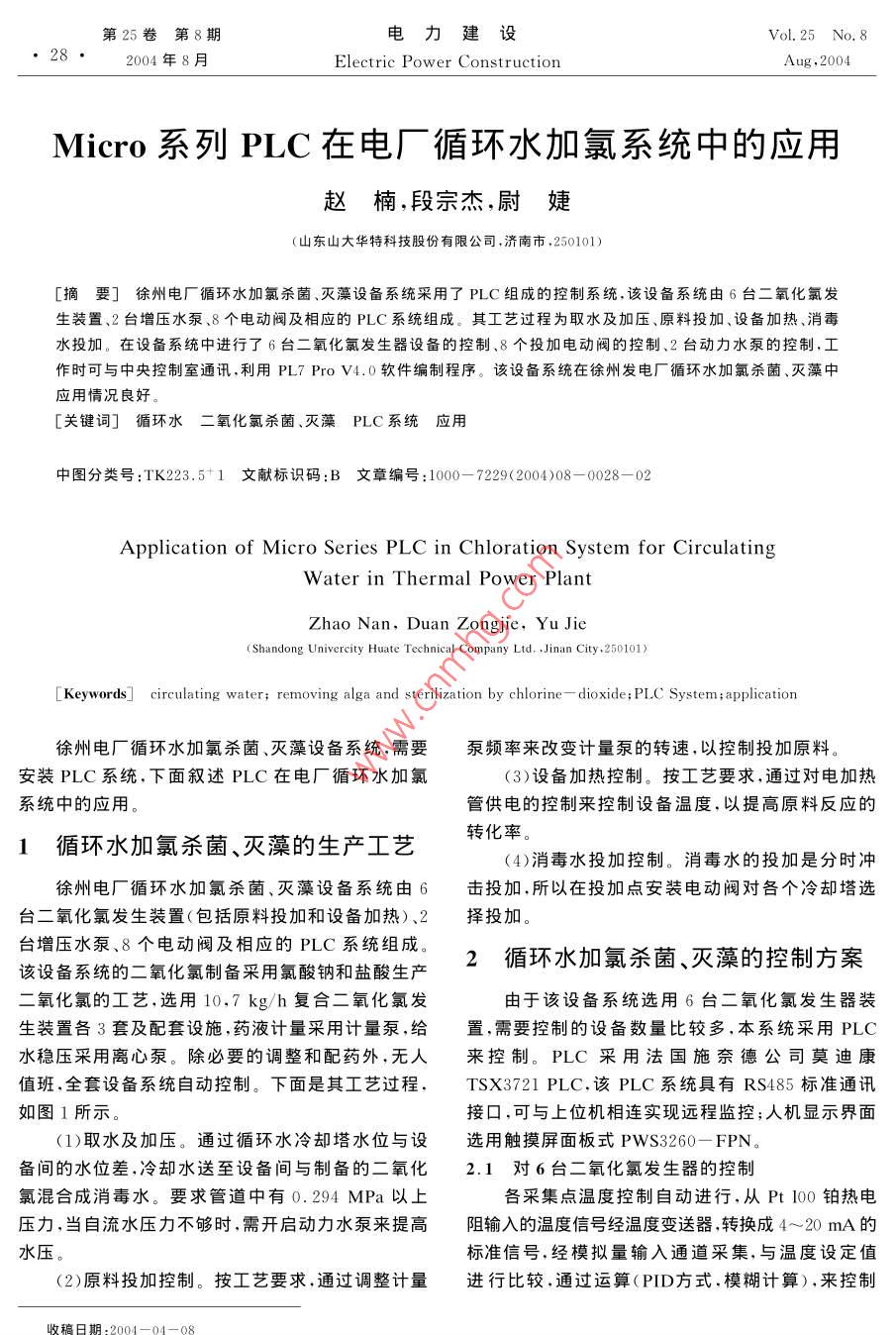 第25卷第8期電力建設2004年8月Electric power constructionAug,2004Micro系列PLC在電廠循環(huán)水加氯系統(tǒng)中的應用趙楠,段宗杰,尉婕(山東山大華特科技股份有限公司,濟南市,250101)[摘要]徐州電廠循環(huán)水加氯殺菌、滅藻設備系統(tǒng)采用了PLC組成的控制系統(tǒng),該設備系統(tǒng)由6臺二氧化氯發(fā)生裝置、2臺增壓水泵、8個電動閥及相應的PLC系統(tǒng)組成。其工藝過程為取水及加壓、原料投加、設備加熱、消毒水投加。在設備系統(tǒng)中進行了6臺二氧化氯發(fā)生器設備的控制、8個投加電動閥的控制、2臺動力水泵的控制,工作時可與中央控制室通訊,利用PL7ProⅤ4.0軟件編制程序。該設備系統(tǒng)在徐州發(fā)電廠循環(huán)水加氯殺菌、滅藻中應用情況良好。[關鍵詞]循環(huán)水二氧化氯殺菌、滅藻PLC系統(tǒng)應用中圖分類號:TK223.51文獻標識碼:B文章編號:1000-7229(2004)08-0028-02Application of Micro Series PLC in Chloration System for Circulatingater in Thermal Power planZhao Nan, Duan Zongjie, Yu JieShandong Univercity Huate Technical Company Ltd, Jinan City, 250101circulating water; removing alga and sterilization by chlorinedioxide; PI C System; application徐州電廠循環(huán)水加氯殺菌、滅藻設備系統(tǒng),需要泵頻率來改變計量泵的轉速,以控制投加原料。安裝PLC系統(tǒng),下面敘述PLC在電廠循環(huán)水加氯(3)設備加熱控制。按工藝要求,通過對電加熱系統(tǒng)中的應用管供電的控制來控制設備溫度,以提高原料反應的1循環(huán)水加氯殺菌、滅藻的生產(chǎn)工藝轉化率(4)消毒水投加控制。消毒水的投加是分時沖徐州電廠循環(huán)水加氯殺菌、滅藻設備系統(tǒng)由6擊投加,所以在投加點安裝電動閥對各個冷卻塔選臺二氧化氯發(fā)生裝置(包括原料投加和設備加熱)、2擇投加臺增壓水泵、8個電動閥及相應的PLC系統(tǒng)組成。該設備系統(tǒng)的二氧化氯制備采用氯酸鈉和鹽酸生產(chǎn)2循環(huán)水加氯殺菌、滅藻的控制方案二氧化氯的工藝,選用10,7kg/h復合二氧化氯發(fā)由于該設備系統(tǒng)選用6臺二氧化氯發(fā)生器裝生裝置各3套及配套設施,藥液計量采用計量泵,給置,需要控制的設備數(shù)量比較多,本系統(tǒng)采用PLC水穩(wěn)壓采用離心泵。除必要的調(diào)整和配藥外,無人來控制。PLC采用法國施奈德公司莫迪康值班,全套設備系統(tǒng)自動控制。下面是其工藝過程,TSX3721PLC,該PLC系統(tǒng)具有RS485標準通訊如圖1所示接口,可與上位機相連實現(xiàn)遠程監(jiān)控;人機顯示界面(1)取水及加壓。通過循環(huán)水冷卻塔水位與設選用觸摸屏面板式PWS3260-FPN備間的水位差,冷卻水送至設備間與制備的二氧化2.1對6臺二氧化氯發(fā)生器的控制氯混合成消毒水。要求管道中有0.294MPa以上各采集點溫度控制自動進行,從Ptl00鉑熱電壓力,當自流水壓力不夠時,需開啟動力水泵來提高阻輸入的溫度信號經(jīng)溫度變送器,轉換成4~20mA的水標準信號經(jīng)模擬量輸入通道采集,與溫度設定值②)原料投加控制。按工藝要求,通過調(diào)整計量進行比較,通過運算(PID方式,模糊計算),來控制第8期Micro系列PLC在電廠循環(huán)水加氯系統(tǒng)中的應用29也號電動閥心口號冷卻塔號二氧化氯發(fā)生器|2號電動閥」→2號冷卻塔[動力水泵2號二氧化氯發(fā)生器3號電動閥3號冷卻塔3號二氧化氯發(fā)生器心4號電動閥心4號冷卻塔循環(huán)水4號三氧化氯發(fā)生器心5號電動閥}“5號冷卻塔5號二氨化氯發(fā)生器“6號電動閥}心6號冷卻塔動力水]6號三氧化氯發(fā)生器“7號電動兩→號冷卻塔8號電動閥]~8號冷卻塔圖1循環(huán)水加氯殺菌、滅藻的生產(chǎn)工藝流程熱量輸岀(智能調(diào)壓模塊)。通過光耦合對投料計量泵頻率控制進行隔離,增強了控制系統(tǒng)的抗干擾能3 Micro TSX-3721PLC的性能力。同時系統(tǒng)還對設備欠水壓、缺水、溫度傳感器短Micro Plc是專為OEM而設計的高性能路、斷路及超溫等故障與設備安全聯(lián)鎖,一旦岀現(xiàn)仼PLC,具有堅固性、緊湊性及可擴展性等特點。其開何故障,在報警的同時設備自動停止運行,以提高設關量I/O最大可達256點,同時具備模擬量I/O、高備的安全性、可靠性速計數(shù)、以及網(wǎng)絡通訊等擴展模板,最大限度地滿足2.2對8個投加電動閥的控制OEM對該設備系統(tǒng)控制的各種需求。TSX-3721因為設備消毒水的投加方式是沖擊式投加,通具有內(nèi)存擴展和通訊擴展端口,最大可擴展至256過控制8個電動閥對通向8個冷卻塔的消毒水進行點。通訊模板包括RS232/RS485電流環(huán)型多協(xié)議投加和停投控制。在設備間中有電動閥的本地控制串行通訊模板、 Modbus plus通訊模板、 FIPWAY/箱,控制箱設有本地控制和遠程控制2種方式。當 FIPIO通訊模板、AS_1通訊模板、 Ethernet/Mo控制方式為遠程控制時,各電動閥的開、關可由遠程dem通訊模板等。上位機控制4PLC控制的程序結構2.3對2臺動力水泵的控制根據(jù)工藝要求,配制消毒水的動力水需有0本設備系統(tǒng)控制由PLC來完成,利用PL7Pro294MPa以上的壓力,在管道上安裝了電接點壓力V4.0軟件編制程序。各工藝段及單體設備的控制表對水壓力進行監(jiān)測。在工作狀態(tài)下,設備間與冷程序相對獨立,部分相同的工藝采用子程序模式。卻塔間的高度差形成的自流水可達到這個壓力,當要求較高精度的溫度控制采用模糊控制,以較好地壓