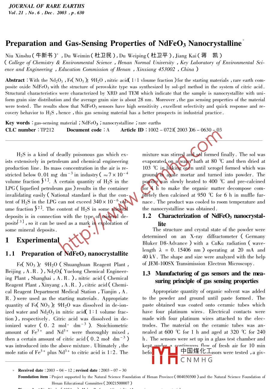 JOURNAL OF RARE EARTHSVol.21,N.6,Dec,2003,p.630Preparation and Gas-Sensing Properties of NdFeo3 NanocrystallineNiu xinshu(牛新書(shū)), Du Weimin(杜衛(wèi)民), Du Weiping(杜衛(wèi)平), Jiang Kai(蔣凱)College of Chemistry Environmental Science, Henan Normal University, Key Laboratory of Environmental Science and Engineering Education Commission of Henan Xinxiang 453002, ChinaAbstract: With the Nd2O3, Fd NO3 ) 9H20, nitric acid 1: I vloume fraction )for the starting materials rare earth com-posite oxide NdFeO3 with the structure of perovskite type was synthesized by sol-gel method in the system of citric acidStructural characteristics were characterized by XRD and TEM which indicate that the sample is nanocrystallite with uform grain size distribution and the average grain size is about 28 nm. Moreover the gas sensing properties of the materialwere tested. The results show that NdFeO3 sensors have high sensitivity excellent selectivity and quick response and recovery behavior to H2s, hence this gas sensing material has a better prospects in industrial practiceKey words: gas-sensing material i NdFeO3' nanocrystalline i rare earthsCLC number: TP212 Document code: A Article ID: 1002-0721(2003 06-0630-03H2S is a kind of deadly poisonous gas which ex- mixture was stirred and sol formed finally. The sol wasists extensively in petroleum and chemical engineering evaporated on a water bath at 80 C and then dried atproduction line. Its mass concentration in the air is re103 C in baking oven until xerogel formed which wasstricted below 0. 01 mg dm-3in industry(=7x 10-4 ground in agate mortar and turned into powder.Thevolume fraction ). A certain quantity of H2S in the powder was slowly heated to 400 C and pre-calcinedPG liquefied petroleum gas )results in the container for 4 h to make the organic matter decompose cominvalidating easily National standard is that the con- pletely then calcined at 950C for 6 h in muffle furtent of H2S in the LPG can not exceed 340 x 10-6 vol- nace. The product was cooled to room temperature andume fraction )2. The content of H2 S in some mineral the nanocrystalline was obtaineddeposits is in connection with the type of mineral de1.2 Characterization of NdFeO3 nanocrystalso it can be used as a mark in exploration oflitesome mineral depositsThe structure and crystal state of the powder were1 ExperimentalBluker D8-Advance ) with a CuKa radiation ( wave1.1 Preparation of NdFeO3 nanocrystallitelength A =0. 15406 nm )operating at 20 mA and40 kv. The shape and size were analyzed with the helpFe( No3b'9H20( Shuanghuan Reagent Plantof JEM-100SX Transimission ElectronBeijing , A.R. ) Nd20 Yuelong Chemical Engineer- 1.3 Manufacturing of gas sensors and the mea-ing plant, Shanghai,A.R.), nitric acid( ChemicalReagent Plant, Xinyang ,AR.), citric acid( Chemisuring principle of gas sensing propertiecal Reagent Department Medical Station Tianjin AAppropriate quantity of organic solvent was addedR.)were used as the starting materials. Appropriatermquantity of Fe NO3 9H20 was dissolved in de-ion- paste obtained was coated onto ceramic tubes whichized water and Nd2O3 in nitric acid 1: I volume frac- have four platinum wires. Electrical contacts weretion), respectively. Citric acid was dissolved in demade with four platinum wires attached to the elecionized water(0. 2 mol. dm-3). Stoichiometric trodes. The material on the ceramic tubes was an-erethoroughly mixednealed at600℃ for 1 h and aged at320℃for240then a certain amount of citric acid(0. 2 mot dm -3h. The sensors were set up in a glass test chamber andwas introduced into the above mixture. Ultimately the keflow of fresh air for 10 minmole ratio of Fe3+ plus Nd+ to citric acid is 1: 2.Thebefo中國(guó)煤化CNMHG12 revised date: 2003-07-30Foundation item: Project supported by the Natural Science Foundation of Henan Province(004030300 )and the Natural Science Foundation ofHenan Educational Committee( 20021500007)Xinshu( 1954-), Male, Professor Speciality: Inorganic nanometer materialshor(E-mailduweimin0081@163.com)Niu X s etPreparation and Gas-Sensing Properties of NdFeO3 Nanocrystalline631en amount of gases were injected into the chamber andmixed by a fan for 30 s. The measuring principle ofgas sensing properties was shown in Fig. 1. The heating voltage Vh)was supplied to either of the coils forheating the sensors and theit voltage( Ve)wassupplied across the sensors and the load resisto( RL)connected in series. The signal voltage( Vout )acrossthe load, which changed with sort and concentration ofgas was measured. The resistance of the load resistor200nmwas alternative and the heating voltage can be adjustedFig 3 TEM photo of nanometer NdFeO( X 50000)within a wide range. The sensitivity for gases S, isdefined as S=RgRa, where R and Ra are the resis-The sensitivity changes of NdFeO3 sensorstance of the sensors in the testing gases/air mixtureby 50 x10 volume fraction H2s gas at dif-and in the air, respectivelyferent temperatures were tested. As shown in Fig 4.2 Results and discussion280C was assumed to be the optimum operating tem-H2s gas which was attributed to the2. 1 Structural characteristics of NdFeosemiconductivity of NdFeO3 and the characters of H2s3 It is well known that NdFeO, has the structure of perte type. The same neodymium atoms at the verFig 2 demonstrates that the structure of NdFeO3tIcefter calcining at 950C for 6 h belongs to the structemperature and left neodymium vacancies. The conture of perovskite type( JCPDS: 82-2421). According ductivity of NdFeO3 was due to the ionizing ofto the scherrer formula, the calculated diameter of theneodymium vacancies5101:VM→∨"Md+3h:.hnpowder is 21 nm or so. The TEM photo of NdFeO3 low-temperature range NdFeO3 showed lower conduc-Fig 3 )shows that the sample particles are uniformtivity because the energy of the system was less thanspherical grains. The average grain size calculated inits band gap energy. With the temperature increasingproportion to the photo is 