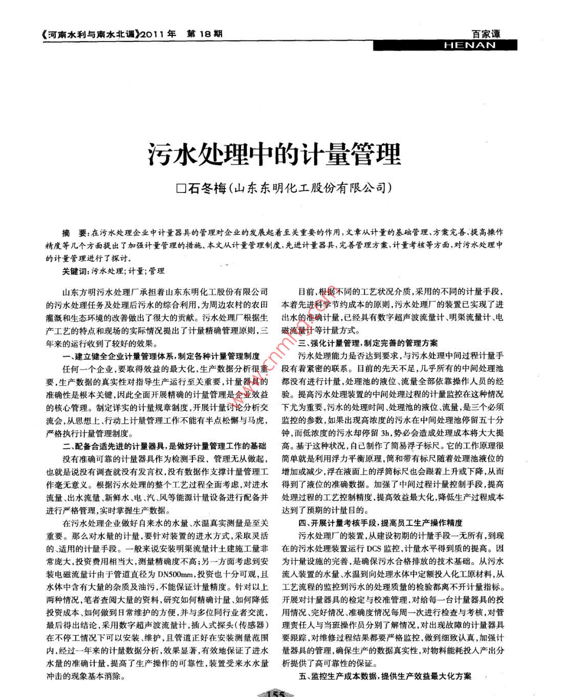 《河南水利與南水北調(diào)》2011年第18期百家譚I HENAN污水處理中的計(jì)量管理口石冬梅(山東東明化工股份有限公司)摘要:在污水處理企業(yè)中 計(jì)量器具的管理對(duì)企業(yè)的發(fā)展起著至關(guān)重要的作用,文章從計(jì)量的基礎(chǔ)管理、方案完善、提高操作精度等幾個(gè)方面提出了加強(qiáng)計(jì)量管理的措施。本文從計(jì)量管理制度,先進(jìn)計(jì)量器具,完善管理方案,計(jì)量考核等方面,對(duì)污水處理中的計(jì)量管理進(jìn)行了探討。關(guān)鍵詞:污水處理;計(jì)量;管理山東方明污水處理廠承擔(dān)著山東東明化工股份有限公司目前,根據(jù)不同的工藝狀況介質(zhì),采用的不同的計(jì)量手段,的污水處理任務(wù)及處理后污水的綜合利用,為周邊農(nóng)村的農(nóng)田本著 先進(jìn)科學(xué)節(jié)約成本的原則,污水處理廠的裝置已實(shí)現(xiàn)了進(jìn)灌溉和生態(tài)環(huán)境的改善做出了很大的貢獻(xiàn)。污水處理廠根據(jù)生出水的準(zhǔn)確計(jì)量,已經(jīng)具有數(shù)字超聲波流量計(jì)、明渠流量計(jì)電產(chǎn)工藝的特點(diǎn)和現(xiàn)場(chǎng)的實(shí)際情況提出了計(jì)量精確管理原則,三磁流量計(jì)等計(jì)量方式。年來(lái)的運(yùn)行收到了較好的效果。三、強(qiáng)化計(jì)量管理,制定完善的管理方案一建立健全企業(yè)計(jì)量管理體系,制定各種計(jì)量管理制度污水處理能力是否達(dá)到要求,與污水處理中間過(guò)程計(jì)量手任何一個(gè)企業(yè),要取得效益的最大化,生產(chǎn)數(shù)據(jù)分析很重段有 著緊密的聯(lián)系。目前的先天不足,幾乎所有的中間處理池要,生產(chǎn)數(shù)據(jù)的真實(shí)性對(duì)指導(dǎo)生產(chǎn)運(yùn)行至關(guān)重要,計(jì)量器具的都沒(méi)有進(jìn)行計(jì)量,處理池的液位、流量全部依靠操作人員的經(jīng)準(zhǔn)確性是根本關(guān)鍵,因此全面開(kāi)展精確的計(jì)量管理是企業(yè)效益驗(yàn)。提高污水處理裝置的中間處理過(guò)程的計(jì)量監(jiān)控在這種情況的核心管理。制定詳實(shí)的計(jì)量規(guī)章制度.開(kāi)展計(jì)量討論分析交下 尤為重要,污水的處理時(shí)間、處理池的液位流量,是三個(gè)必須流會(huì),從思想上.行動(dòng)上計(jì)量管理工作不能有半點(diǎn)松懈與馬虎,監(jiān)控的參數(shù), 如果出現(xiàn)高濃度的污水在中間處理池停留五十分嚴(yán)格執(zhí)行計(jì)量管理制度。鐘,而低濃度的污水卻停留3h,勢(shì)必會(huì)造成處理成本將大大提二、配備合適先進(jìn)的計(jì)量器具,是做好計(jì)量管理工作的基礎(chǔ)高?;谶@種狀況,自己制作了簡(jiǎn)易浮子標(biāo)尺。它的工作原理很沒(méi)有準(zhǔn)確可靠的計(jì)量器具作為檢測(cè)手段,管理無(wú)從做起,簡(jiǎn)單就是利用浮力平衡原理,簡(jiǎn)和帶有標(biāo)尺隨著處理池液位的也就是說(shuō)沒(méi)有調(diào)查就沒(méi)有發(fā)言權(quán),沒(méi)有數(shù)據(jù)作支撐計(jì)量管理工增加或減少,浮在液面上的浮簡(jiǎn)標(biāo)尺也會(huì)跟著上升或下降,從而作毫無(wú)意義。根據(jù)污水處理的整個(gè)工藝過(guò)程全面考慮,對(duì)進(jìn)水得到了 液位的準(zhǔn)確數(shù)據(jù)。加強(qiáng)了中間過(guò)程計(jì)量控制手段,提高流量、出水流量、新鮮水、電、汽、風(fēng)等能源計(jì)量設(shè)備進(jìn)行配備并處理過(guò)程的工藝控制精度、提高效益最大化,降低生產(chǎn)過(guò)程成本進(jìn)行嚴(yán)格管理,實(shí)時(shí)掌握生產(chǎn)數(shù)據(jù)。達(dá)到了預(yù)期的計(jì)量目的。在污水處理企業(yè)做好自來(lái)水的水量.水溫真實(shí)測(cè)量是至關(guān)四、開(kāi)展計(jì)量考核手段,提高員工生產(chǎn)操作精度重要。那么對(duì)水量的計(jì)量要針對(duì)裝置的進(jìn)水方式,采取靈活污水處理廠的裝置,從建設(shè)初期的計(jì)量手段一無(wú)所有 ,到現(xiàn)的適用的計(jì)量手段。- 般來(lái)說(shuō)安裝明渠流量計(jì)t建施工量非在的污水處理裝置運(yùn)行DCS監(jiān)控,計(jì)量水平得到質(zhì)的提高。因常龐大,投資費(fèi)用相當(dāng)大,測(cè)量精確度不高;另-方面考慮到安為 計(jì)量設(shè)施的完善,是確保污水合格排放的技術(shù)基礎(chǔ)。從污水裝電磁流量計(jì)由于管道直徑為DN500mm,投資也十分可觀,且流人裝置的水量、水溫到向處理水體中定額投人化工原材料,從水體中含有大量的雜質(zhì)及油污,不能保證計(jì)量精度。針對(duì)以上工藝流程的監(jiān)控到污水的處理質(zhì)量的檢驗(yàn)都離不開(kāi)計(jì)量指標(biāo)。兩種情況,筆者查閱大量的資料,研究如何精確計(jì)量、如何降低開(kāi)展對(duì)計(jì)量器具的檢定與校準(zhǔn)管理,對(duì)給每-臺(tái)計(jì)量器具的投投資成本、如何做到日常維護(hù)的方便,并與多位同行業(yè)者交流,用情況完好情況、準(zhǔn)確度情況每周-次進(jìn)行檢查與考核,對(duì)管最后得出結(jié)論,采用數(shù)字超聲波流量計(jì),插入式探頭(傳感器)理責(zé)任人與當(dāng)班操作員分別了解情況,對(duì)出現(xiàn)故障的計(jì)量器具在不停工情況下可以安裝、維護(hù),且管道正好在安裝測(cè)量范圍要跟蹤對(duì)維修過(guò)程結(jié)果都要嚴(yán)格監(jiān