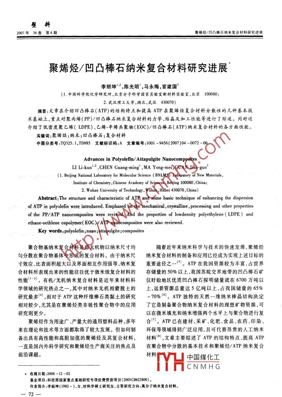 塑料2007年36卷第4期聚烯烴/凹凸棒石納米復(fù)合材料研究進(jìn)展李麗坤'2 ,陳光明' ,馬永梅,官建國(guó)’(1.中國(guó)科學(xué)院化學(xué)研究所,北京分子科學(xué)國(guó)家實(shí)驗(yàn)室新材料實(shí)驗(yàn)室,北京100080;2.武漢理工大學(xué),湖北,武漢430070)摘要:文章在介紹凹凸棒石(ATP)的結(jié)構(gòu)特點(diǎn)和提高ATP在聚烯烴復(fù)合材料分散性的幾種基本技術(shù)基礎(chǔ)上,重點(diǎn)對(duì)聚丙烯(PP)/凹凸棒石納米復(fù)合材料的力學(xué)、結(jié)晶及加工性能等進(jìn)行了綜述。同時(shí)還介紹了低密度聚乙烯( LDPE)、乙烯辛烯共聚物(E0C)/凹凸棒石(ATP)納米復(fù)合材料的各方面性能。關(guān)鍵詞:聚烯烴;納米;凹凸棒石;復(fù)合材料.中團(tuán)分類號(hào):TQ325.1,TD985文獻(xiàn)標(biāo)識(shí)碼:A 文章 編號(hào):1001 - 9456(2007 )04 -0072 -06Advances in Polyolefin/ Attapulgite NanocompositesLI Li-kun',2 ,CHEN Guang-ming' , MA Yong-mei , GUAN Jian guo2(1. Beijing National Laboratory for Molecular Science ( BNLMS) Laboratory of New Materials,Institute of Chemistry,Chinese Academy of Sciences , Beijing 100080,China;2. W uhan University of Technology , Wuhan, Hubei 430070 , China)Abstract:The structure and characteritic of ATP and some basic technique of enbancing the dispersionof ATP in polyolefin were introduced. Emphased on the, mechanical, crystalline , processing and other propertiesof the PP/ATP nanocomposites were. reviwed. And the properties of lowdensity polyethylene ( LDPE) andethane-octhlene. copolymer( EOC)/ ATP nanocomposites were also reviewed.Key words:polyolein; nano ;ttapulgite ;composites聚合物基納米復(fù)合材料是指無機(jī)物以納米尺寸均隨著近年來納米科學(xué)與技術(shù)的快速發(fā)展,聚烯烴勻分散在聚合物基體中形成的復(fù)合材料。由于納米尺納米復(fù)合材料的制備和應(yīng)用已經(jīng)成為實(shí)現(xiàn)上述目標(biāo)的寸效應(yīng)、比表面積超大以及界面相互作用強(qiáng)等,納米復(fù)重要途徑之一5。ATP 在我國(guó)資源較為豐富,占世界合材料所表現(xiàn)出來的性能往往優(yōu)于微米級(jí)復(fù)合材料的存儲(chǔ)量的50%以上,我國(guó)蘇皖交界地帶的凹凸棒石礦性能[-3)。有機(jī)/無機(jī)納米復(fù)合材料是近年來材料科.僅盱眙地區(qū)優(yōu)質(zhì)凹凸棒石探明儲(chǔ)量就在6700萬噸以學(xué)領(lǐng)域的研究熱點(diǎn)之一,其中對(duì)納米無機(jī)相蒙脫土的上,遠(yuǎn)景資源總量達(dá)5億噸以上,占我國(guó)儲(chǔ)量的65%研究最多41,而對(duì)于ATP這種纖維棒石類黏土的研究~70%[6)。ATP獨(dú)特的天然一維納米棒晶結(jié)構(gòu)決定相對(duì)較少,尤其是在聚烯烴類非極性聚合物中的應(yīng)用了它是制備聚合物納米復(fù)合材料的理想礦物資源,可研究則更少。以在微米填充和納米增強(qiáng)兩個(gè)水平上與聚合物進(jìn)行復(fù)聚烯烴作為用途廣、產(chǎn)量大的通用塑料品種,多年合”。ATP 已在建材、采礦、化肥、食品、農(nóng)藥、印染、來在理論和技術(shù)等方面都取得了較大發(fā)展。但如何制環(huán)保等領(lǐng)域得到廣泛應(yīng)用,且可代替昂貴的人工納米備出具有高性能和高附加值的聚烯烴及其復(fù)合材料, .材料[8),文章主要綜述了ATP的結(jié)構(gòu)特點(diǎn)、提高ATP一直是國(guó) 內(nèi)外科學(xué)研究和聚烯烴生產(chǎn)商關(guān)注的焦點(diǎn)及在聚合物中分散的基本技術(shù)和聚烯烴/ATP納米復(fù)合前沿課題。材料中國(guó)煤化工TYHCNMHG收稿日期:006-12 -02基金項(xiàng)目:科技部國(guó)家重點(diǎn)基礎(chǔ)研究專項(xiàng)經(jīng)費(fèi)資助項(xiàng)目(2005CB623800)。作者簡(jiǎn)介:李麗坤(1982-),女,材料學(xué)碩士研究生,主要研究方向:高分子納米復(fù)合材料。塑料2007年36卷第4期聚嬌烴/凹凸櫸石納米復(fù)合材料研究進(jìn)展是一種較微弱的物理吸附力,不同于蒙脫土納米單晶1 ATP的結(jié)構(gòu)特點(diǎn)ATP是一種具有特殊的層鏈狀分子結(jié)構(gòu)的含水富片層之間的強(qiáng)離子鍵作用,所以選擇超聲波處理可獲得均勻分散的納米棒晶。鎂鋁硅酸鹽礦物,1982年發(fā)現(xiàn)于前蘇聯(lián)烏拉爾礦區(qū)的圖2是在甲苯中超聲分散后滴膜法制備ATP的熱液蝕變產(chǎn)物中而得名。1935 年法國(guó)學(xué)者巴朗特(JTEM照片[9)。從圖2可以看出,經(jīng)超聲波分散處理D Laporent)在美國(guó)佐治亞州凹凸堡(Attapulsys)和法后,ATP基本上以單個(gè)棒晶形式分散的。國(guó)奠摩滌( Mormoriron)沉積巖層中也曾發(fā)現(xiàn)這-礦物,并命名為凹凸棒石( Atlapitoleiat..其典型的理論化學(xué)式為:SigMg,O。[ AI](OH)2(OH,)。.4H;O1940年Bradley!"I" 首先闡明了它的結(jié)構(gòu),如圖1所示。圖2 ATP 棒晶的TEM照片0。o超聲波處理過的ATP在聚合物基體中會(huì)再度聚集,增強(qiáng)效果不明顯;以適當(dāng)?shù)墓柰榕悸?lián)劑如K-5501.2對(duì)ATP進(jìn)行表面處理,將硅烷偶聯(lián)劑接枝到ATP棒表面上,從而降低了ATP棒晶的表面自由-0-0- 00-能,可以明顯改善其在PP中的分散。圖1 ATP 晶體的理想結(jié)構(gòu)2.2加入增容劑對(duì) ATP的改性ATP晶體結(jié)構(gòu)為:每個(gè)單元晶層有上、下兩條硅氧PP接枝馬來酸酐(PP-g-MAH)是- -種常用的增容四面體雙鏈晶片,中間夾5個(gè)鋁氧八面體[2) ,每個(gè)單劑,加人PP-g-MAH對(duì)ATP棒晶在PP中的分散狀態(tài)元層相互間通過氧連接成孔道式的晶體結