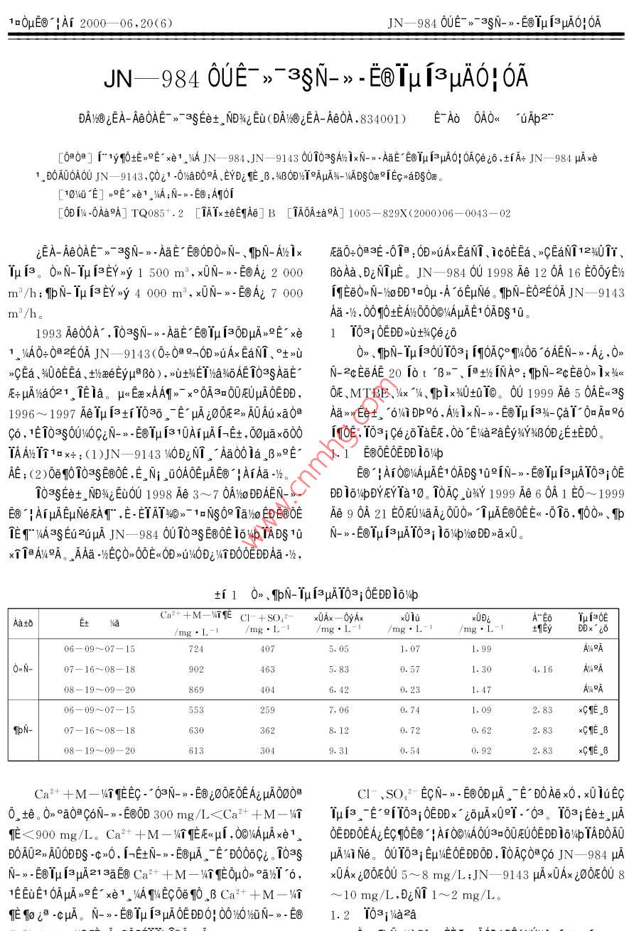 10μE@!A1 2000- -06,20(6)JN- 984 0UE~ >-3SN->- E回Iμ i3uA0:0AJN- 984 0UE >-8N->- E@Tμj3μA0}0ADAN@iEA- AeOAE -》asEet, ,NO死Eu(DAW@EA- AeOA,834001) E AO 0AO< “0Ap2"[0≌02] I"1yq10E9E- xe1.WA JN- 984,JN-9143 6U10∞SA%1xN-. AaE E@TμisμA0|0Aceiδ ,士1A+ JN- 984 μAxe1. ,DOAUOA00 JIN - 9143.C0i1 -0)aD09A、EYD&E .B ,WBODW%TAμA%-HIADSOa9iEcwaDSOa。[10W0“白] 》E° xe1。VA;N-》- E旬;A0i[0D [% -0Aa9A] TQ085+.2 [1AIxteEqAe] B [1A0AtaA] 1005- 829X(2000)06- - 0043- -02jEA- AeOAE- >-3SN->-AaE° 60D0>N-、IpN- A%ix .Ea0:0@3∈-0個(gè)@ :00>UAx EaNT、iCEE、>GEaNT1240TT、μis。0》N-IμisEYy 1 500 m3 , x0N->-E@Ai 2 000BoAa、DiN1μE。JN- 984 00 1998 Ae 12 0A 16 E00yE)%m2/h; IpN-TμfβEY》y 4 000 m3 ,x0N->-E@Ai 7 000iqEeO> N-/60D10μ -A 6EμN(yùn)e。fIN-E02E0AJN- 9143m3/h。Aa 1/,00EAN000C1AμAE10ADS10。1993 Ae00A- ,103SN->-AaE E@μ i30DμA>9E° xe1103; 0E0D>U+%Ceiδ1。xA0ψ0≌≥E0A JN- -9143(0099-0D>uAx EaNT、吐吣0》、TIPN_1μ is0U103i [qOAco 9/400 6AEN->-Ai ,0》>GEa、4U6EEa8 、theeEyμBo ). >u士%∈Ta%46AE 103gAaE'N-2cEeAE 20 1ot B》-、1 INA°; TIpN- 2cEe0> ix%- x° 0A3a0UFUμAOEDD,OFE .MTBE、%4x“4、Ipix30t0TO.00 1999 Ae 5 0AE<3S1996~ 1997 AeIμ i3+1086. E μA;00E2》A0Auxa0eAa>> Eet。76i DP96 ,Av1xN->- E@Tμ i3%- CaT 0=A加96C, 1E10380046CiN->- E@Tμ[β1UAτμAI-Et , ooμa x6001q0E , 103iCe iσTa氏,00”EVazaEyaYWBODβEtEDO。TAAWTn1ox+:(1)JN-9143 40DεNT。Aa00la, B>°E'1.1 EOOEOEDDI6/4pAE;(2)0eq0103SE@OE ,E ,Ni JσOAOEμAE@° |AiAa -%。E1|AOOXAμAE1OADS 109MN->.E@Tμ isμuATOs;OE1038Eet。N陽(yáng)%之Eta0U 1998 Ae 3~7 OAYoDDAEN-》-D 16%MbDYEYTa10. T0AC, u%Y 1999 Ae60A1 E0~ 1999B'!ArμAEμN(yùn)eEA" ,E-ETATNO》- 1oNSO∩a)EDEOEAe 9 0A 21 EOEUNaA;0U0》1μAE@OEE< -016. 100》、ITET" YA3g Eu2uμA JN- 984 00 103s E白OE i6%4p IADS10N->-E@Tμ13μA103i 6%/00>Xx0。x個(gè)≥A/A。。AAa -WEC>0OE< 0D>I/OjNIDOOEDDAa -%,i 10》、IbN-TμisμA103;OEDDi6VbAat0ECa2++M-!TE CI- +SO42x0Ax- -0yAxx0D;A"EoTμuf≥OE/mg. L- 1/mg●L-/mg●L-1/mg. L- !土EyDDx°iδ06-09~07-157244075.051.071.99AA0N-07- 16~08- 189024635. 830.571.304. 16A%哨08- 19~09- 208694046.420.231.47A1%A5532597. 060.741.092. 83xCE ,BIpN-07一16~08- 186303628.120.720.62xGE ,B6133049.310.540.92Ca2++M-V4ηEEC .03N_->- E@ iOOFOE AizμA00OECI-、sO,"- ECN-》- E⑧ODμA、E° DOAex0, x01uEC0, te。0》°a0CON->-E@OD 300 mg/L A0ODS -:>0, 1←∈N->_EBμA. E D006Gi。1035μA\Ni Ne。0U103; Eμ/EOE0D0D, 10AC0*G6 JN- -984 μAN-》- E@Tμi3μA213aE@ Ca2+ + M - AgEOμO》°avT 6,x0Ax j00F0∪5~8 mg/L;JN- -9143 μAxUAx :00FE0U 81EEuE1 0AμA>°E° xe1, NATWNEC0eqO βCa2++M-個(gè)~ 10 mg/L.DiNT 1~2 mg/L。Eπo8 -cμA。N-》- E0Tμ i3uAOEDDO: 00%60%UN-》-回1.2 103;a2a4- Ne/%>>A+1o0μE@!Ai 2000- -06 ,20(6)ti 20N-4a2ax>> EE+Ey%YEYEIqE%T2個(gè)。3 %-/ADg0x -01δE土zA0E0KAε ThE,≥zOE。單/ mem/mm●a-1/mm. aJN- 984 x0 1998 Ae 12 ATANOUμUO>N->.E回3;06-09~-07-1520# 17. 10.100 A3 0.053IqEeOEDD0OA", EOμWhAEA: TOμA%- yADSOee , 10tδEC 5 0A07-16~08-1820# 17.4 0.044 A3 0. 022-Y14i明96,0> N-A"EO+1EyE%%u0 4.0,x1βT 5.07,08-19~09-2020# 14.6 0. 032 A3 0. 032E1OANEAa -136A01-3000 2.5 x600。010o%U0%4 "6A;DA印10O/A -NOA。1-士 AAa -x0E0Ua0A∩O1μA2E xe1.DOA0, Ia。BAEAa>> Eet。μA》> EEDSAE ,NO3rAEEaE10AEti 3 fIbN-/4a2ax>> EE+ EyYAu2 [4i P0UEU ,%6EUAEOOD1 AOEA1 EOi 3EμA%-1%AEδEg。印010。E0E-aZAOE0Ai ,EAE zAOE ,E"AEEawBiaeEEaEcTA:/mm●a/mm. a~(1)EAE@WU0/4-NOA。0》N-0UE16A JN- 984 C° ,形106-09~07-1520#27.80. 100 A0. 072W4u0AOAEO T 46 249t, [qvOJN- 984 96,1999 AeE/%Qu07-16~08- 1816.70.038 A3 0. 1100AOAE回33 336 t,EI%UAzOANUE@ 12913 t,0》N- E《Ae18.10.024 A3 0. 030vUE⑧151it,00AεC°DAE⑨1. 95 0@/t VAFE ,42U0%4 -NOA 15X 1.95≈30 100@/a。+14 1.Nu-01o(2)6U0%4O0VA -NOA。0> N- E1OADAE@ 33 336 t/0A,Et06- 09~07- 16~08-19~0A00 962. 6 kg/0A ,0ONA°”12 0@/kg VAE ,00>N_μAE@07- 1508-1809- 20IAf3E9T@ :962.6X 12/33 336=0. 346 0@/t。iNuO。N- IpN-| 0nN- IpN-| 0*N- 們N-N-E1 0ADAE@ 58 644 t/0A, 191%6 JN- 9143,| 550 C xEEO/NOAi/%| 23.1 22.1| 31.6 20.5| 32.3 22.3950 C xEOW6A:/%| 3.84.66.07.6.|3.53.83 243 kg/0A.00%A 12. 13 0@/kg,W- 2,141 kg/0A,Ea2wE0T/%2.80.7| 2.5 0.4| 2.6 00/%A 14.4 0@/kg ,00PN-μAE⑧° |Ar3EtNT@:(3 243XN6>-莊E/%17.025.4| 34.1 37.2| 32.6 37.412. 13+ 141X14.4)/58 644=0. 704 0/t。No.-~A%/%2.62.2 | 1.7 2.8| 1.9 2.1EyNGo- 1PAA/%3.24.7 2.8 1.5| 3.72.00> N-06E1 0ADAAa -項(xiàng)%UE@)V6 EUCONAE16A -N個(gè)B:15No=~Di/%2.3 5.9| 6.8 2.9| 5.9 2.9X0.704=10.56180x。TaNo-們pAx/%9.5 23.9| 7.6 15.4| 17.4 31.00> N-0E1 6ADAAa -/62uμ1_° |Ai3E士%4 -N0A:EyNO》- 1p10/%35.8 16.2 6.8 7.0| 4.94.433 336X(0. 704-0.346)X12=14.32 10?!鉚VAE但24. 88 100。2 OEDDx* iδσμAEAVU(3)AaE0%U04 -NOA。140DAOCVA96 , 0OW6EUEe+,x0*100ET103$N->- EB@μAOEDDCe io, 10AC xδ3800W們i P、Eet, 0D1 AO0i 3EμA%-lNAEδEg%° AUAμE -NOANUTAEANO:(1)A公1x Iμis0U [940》xe1。VAG° 3GU%b DAECaEj0/ 400 a1o0o。丫0aAo , T03; Eet。Ce i0》0A, 0 -EEyYABODOALE4 )6aA021"0e(1)103; EμEOEDDOD,JN- 984 μAxe1。DOA0EtEDO。(2)a2a》> E氏+ μAEy%YTOE%, 0》、1IbN-μAWa1, i0JN- 9143 A, >2E B0E02100 JN- 9143,0U1P 99E0EμANT°A,C0O》N- 9A01pN-。O> 、MIPN-A-E' i00EμA6%4pTA,JN- 984 >E DORAOU JN- 9143。(2)JN- 984 94BODμI -0%aAE. EYDi 作,BμAl0μa 。WIA. TbN- E0*A0UO》N- ,μ< TPB040 Tu2ODE》" μAO@G6(3)x0ETEuE6,E16A JN- 984 0la。β 103SN-》- .0.te。(3)0E1. ,Nu -0T6/%a10i° ,AvTμ 130U0EDDODEOEOE- E甸' |AiDS 10EOμ%6AE >ylyxux+0A。1。TpN-1. ,Nu P2O。yT B,EμAτ JN- -9143 -0組AE[x+0BWoe] μU0≈x≠OBE- Ao, 1968~ .1991 Ae tTOμoOUBANOE -01Nsσ∞E←%16。1. NuOD ,i9-Ai E6Oy3E,91o%o Ee IA13496 , IpN-印μ0[AEx"0u.0uA102i1E。VEONo BDNI nμADi NT i00E , EμA+ JN- -9143 10DiμA [E0 。aE0E0] 2000 -03- -01