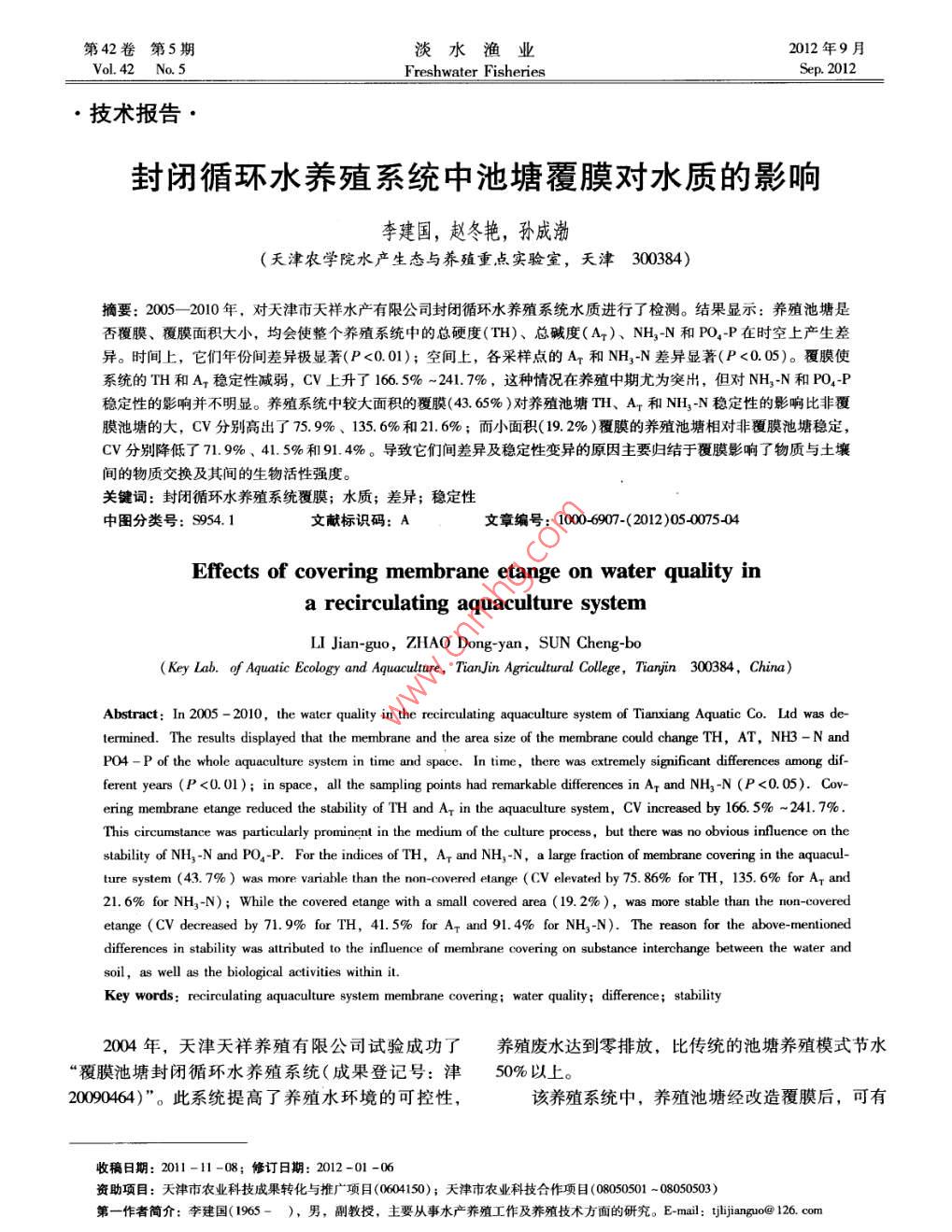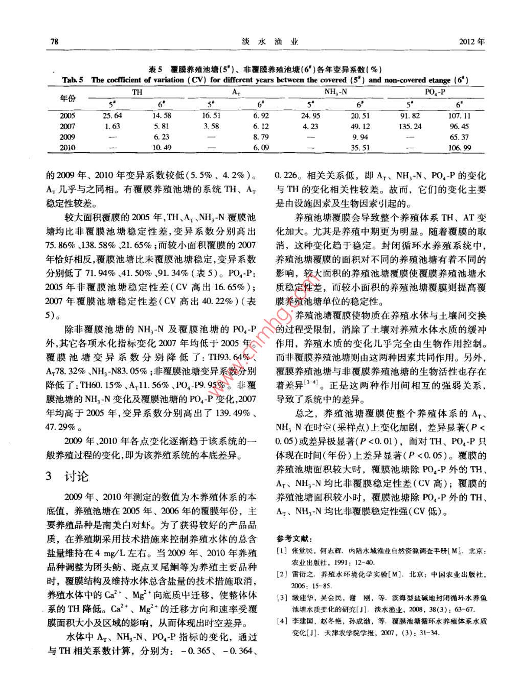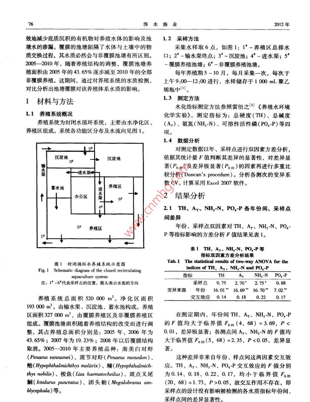 第42卷第5期淡水漁業(yè)2012年9月Vol 42 No 5Freshwater FisheriesSep.2012技術(shù)報告封閉循環(huán)水養(yǎng)殖系統(tǒng)中池塘覆膜對水質(zhì)的影響李建國,趙冬艷,孫成渤(天津農(nóng)學(xué)院水產(chǎn)生態(tài)與養(yǎng)殖重點實驗室,天津300384)摘要;2005-2010年,對天津市天祥水產(chǎn)有限公司封閉循環(huán)水養(yǎng)殖系統(tǒng)水質(zhì)進行了檢測。結(jié)果顯示:養(yǎng)殖池塘是否覆膜、覆膜面積大小,均會使整個養(yǎng)殖系統(tǒng)中的總硬度(TH)、總堿度(A7)、NH2N和PO4P在時空上產(chǎn)生差異。時間上,它們年份間差異極顯著(P<0.01);空間上,各采樣點的Ar和NH3N差異顯著(P<0.05)。覆膜使系統(tǒng)的H和A1穩(wěn)定性減弱,CⅤ上升了1665%-241.7%,這種情況在養(yǎng)殖中期尤為突出,但對NH3N和PO4P穩(wěn)定性的影響并不明顯。養(yǎng)殖系統(tǒng)中較大面積的覆膜(43.65%)對養(yǎng)殖池塘TH、Ar和NH13N穩(wěn)定性的影響比非覆膜池塘的大,Cⅴ分別高出了75.%%、135.6%和21.6%;而小面積〔19.2%)覆膜的養(yǎng)殖池塘相對非覆膜池塘穩(wěn)定CⅤ分別降低了71.9%、41.5%和914%。導(dǎo)致它們間差異及穩(wěn)定性變異的原因主要歸結(jié)于覆膜影響了物質(zhì)與土壤間的物質(zhì)交換及其間的生物活性強度。關(guān)鍵詞:封閉循環(huán)水養(yǎng)殖系統(tǒng)覆膜;水質(zhì);差異;穩(wěn)定性中圖分類號:S954.1文獻標(biāo)識碼:A文章編號:10006907-(2012)050075404Effects of covering membrane etange on water quality ina recirculating aquaculture systemLI Jian-guo, ZHAO Dong-yan, SUN Cheng-boKey Lab. of Aquatic Ecology and Aquaculture, Tian in Agricultural College, Tianyin 300384, China)Abstract: In 2005-2010, the water quality in the recirculating aquaculture system of Tianxiang Aquatic Co. Ltd wastermined. The results displayed that the membrane and the area size of the membrane could change TH, AT, NH3-NPO4-P of the whole aquaculture system in time and space. In time, there was extremely significant differences among dif-ferent years(P<0. O1) in space, all the sampling points had remarkable differences in Ar and NH,-N(P<0. 05).Covering membrane etange reduced the stability of TH and A in the aquaculture system, CV increased by 166.5%-241. 7%This circumstance was particularly prominent in the medium of the culture process, but there was no obvious influence on thestability of NH, N and PO4-P. For the indices of TH, A and NH, - N, a large fraction of membrane covering in the aquaculture system(43. 7%)was more variable than the non-covered etange(CV elevated by 75. 86% for TH, 135. 6% for Ar and21. 6%for NH3-N): While the covered etange with a small covered area(19.2%), was more stable than the non-coveredetange(Cv decreased by 71. 9% for TH, 41. 5% for A and 91. 4% for NH,-N). The reason for the above-mentioneddifferences in stability was attributed to the influence of membrane covering on substance interchange between the water andl as the biological activities withinKey words: recirculating aquaculture system membrane covering: water quality difference; stability2004年,天津天祥養(yǎng)殖有限公司試驗成功了養(yǎng)殖廢水達到零排放,比傳統(tǒng)的池塘養(yǎng)殖模式節(jié)水“覆膜池塘封閉循環(huán)水養(yǎng)殖系統(tǒng)(成果登記號:津50%以上。2000464)”。此系統(tǒng)提髙了養(yǎng)殖水環(huán)境的可控性,該養(yǎng)殖系統(tǒng)中,養(yǎng)殖池塘經(jīng)改造覆膜后,可有收稿日期:2011-11-08;修訂日期:2012-01-06資助項目:天津市農(nóng)業(yè)科技成果轉(zhuǎn)化與推廣項目(004150);天津市農(nóng)業(yè)科技合作項目(08050501-08050503)第一作者簡介:李建國(1965-),男,副教授,主要從事水產(chǎn)養(yǎng)殖工作及養(yǎng)殖技術(shù)方面的研究。E-mal;tjlijianguot@126.com淡水漁業(yè)2012年效地減少底質(zhì)沉積的有機物對養(yǎng)殖水體的影響及池12采樣方法塘水的滲漏。覆膜的池塘阻隔了水體與土壤中的物采集水樣取6點,如圖1:1°-養(yǎng)殖區(qū)總排水質(zhì)交換過程,其水質(zhì)必然會與非覆膜池塘有所區(qū)別。口;2-輸水渠終點;3·-沉淀池;4-進水渠;52005-2010年,隨著養(yǎng)殖結(jié)構(gòu)的調(diào)整,覆膜池塘養(yǎng)-覆膜養(yǎng)殖池塘;6"-非覆膜養(yǎng)殖池塘。殖面積由2005年的43.65%逐步減至2010年的全部每年養(yǎng)殖期5-10月,每月采集一次,每次于非覆膜養(yǎng)殖。這期間,通過對養(yǎng)殖系統(tǒng)的水質(zhì)檢測,上午9:00-12:00進行,水樣儲存于1000mL聚乙對比分析出池塘覆膜對該養(yǎng)殖體系水質(zhì)的影響。烯瓶中①。1材料與方法1.3測定方法水化指標(biāo)測定方法參照雷衍之(2《養(yǎng)殖水環(huán)境1.1養(yǎng)殖系統(tǒng)概況化學(xué)實驗》。測定指標(biāo)為:總硬度(TH)、總堿度養(yǎng)殖系統(tǒng)為封閉水循環(huán)系統(tǒng),主要由水凈化區(qū)、(A-)、氨氮(NH2N)、可溶性活性磷(PO4P)等四養(yǎng)殖區(qū)組成。系統(tǒng)各功能區(qū)分布及水流向見圖1。項1.4數(shù)據(jù)分析對測定數(shù)據(jù)以年、采樣點進行雙因素方差分析,沉淀池沉淀池依據(jù)其統(tǒng)計量F值判斷其差異的顯著性,對差異顯著(P005)及差異極顯著(P0o)的因素再進行多重比進水較分析( Duncan' s procedure)。分析各測次的變異系養(yǎng)殖區(qū)數(shù)CV。計算采用 Excel2007軟件薔水池辦公區(qū)2結(jié)果分析N、PO4P各年份間、采樣點間差異5養(yǎng)殖區(qū)年份、采樣點雙因素對TH、Ar、NH3N、PO4P等指標(biāo)影響的方差分析F值結(jié)果見表1。表1H、Ax、NH3N、PO4P等指標(biāo)雙因