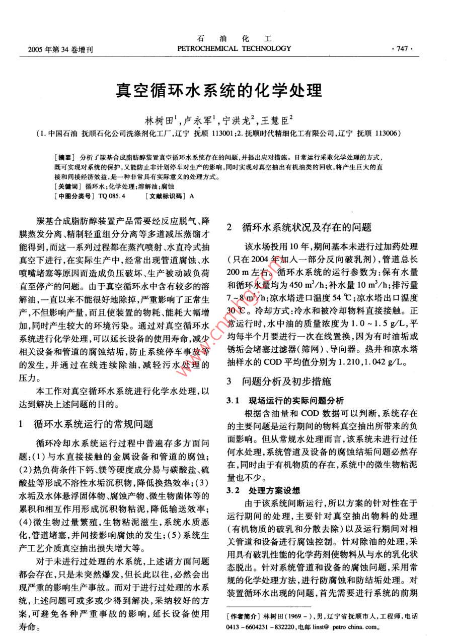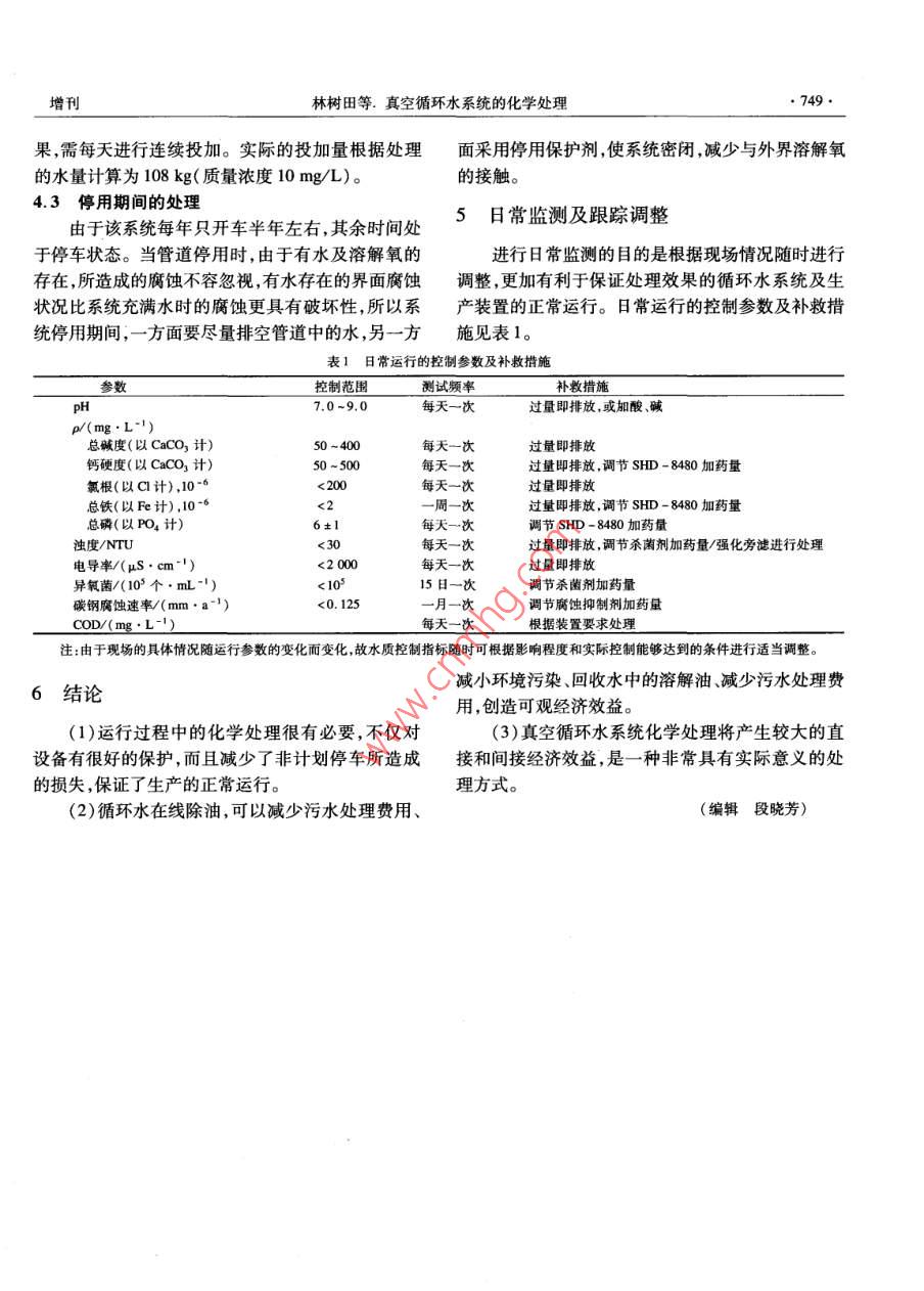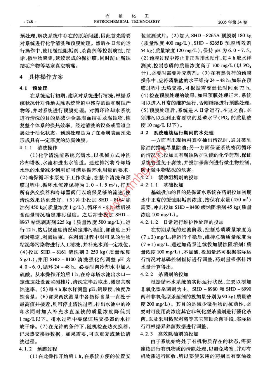 2005年第34卷增刊PETROCHEMICAL TECHNOLOGY747真空循環(huán)水系統(tǒng)的化學處理林樹田1,盧永軍!,寧洪龍2,王慧臣2(1.中國石油撫順石化公司洗滌劑化工廠,遼寧撫順113001;2.撫順時代精細化工有限公司,遼寧撫順113006)[擴要]分析了羰基合成脂肪醇裝置真空循環(huán)水系統(tǒng)存在的問題,并提出應對措施。日常運行采取化學處理的方式既可實現對系統(tǒng)的保護,又能防止非計劃停車對生產的影響,同時實現對真空抽出有機油類的回收將產生巨大的直接和間接經濟效益,是一種非常具有實際意義的處理方式關鍵詞]循環(huán)水;化學處理;溶解油;腐蝕[中圖分類號]TQ0854[文獻標識碼]A羰基合成脂肪醇裝置產品需要經反應脫氣、降膜蒸發(fā)分離、精制輕重組分分離等多道減壓蒸餾才2循環(huán)水系統(tǒng)狀況及存在的問題能得到,而這一系列過程都在蒸汽噴射、水直冷式抽該水場投用10年,期間基本未進行過加藥處理真空下進行,在實際生產中,經常出現管道腐蝕、水(只在2004年加入一部分反向破乳劑),管道總長噴嘴堵塞等原因而造成負壓破壞、生產被動減負荷200m左右。循環(huán)水系統(tǒng)的運行參數為:保有水量直至停產的問題。由于真空循環(huán)水中含有較多的溶和循環(huán)水量均為40m/h;補水量10m3/h;排污量解油,一直以來不能很好地除掉嚴重影響了正常生7-8m3/h;涼水塔進口溫度54℃;涼水塔出口溫度產,不但影響產量,而且使裝置的物耗、能耗大幅增30℃。冷卻方式:冷水和被冷卻物料直接接觸。正加,同時產生較大的環(huán)境污染。通過對真空循環(huán)水常運行時,水中油的質量濃度為1.0-1.5gL,平系統(tǒng)進行化學處理,可以延長設備的使用壽命,減少均每半個月要進行一次在線置換因為有時油垢或相關設備和管道的腐蝕結垢防止系統(tǒng)停車事故等銹垢會堵塞過濾器(篩網)、導向器。熱井和涼水塔的發(fā)生,并通過在線連續(xù)除油,減輕污水處理的抽樣水的COD平均值分別為1.20,1.042g/L壓力。3問題分析及初步措施本工作對真空循環(huán)水系統(tǒng)進行化學水處理,以達到解決上述問題的目的。3.1現場運行的實際問題分析根據含油量和COD數據可以判斷,系統(tǒng)存在1循環(huán)水系統(tǒng)運行的常規(guī)問題的主要問題是運行期間的物料真空抽出所帶來的負循環(huán)冷卻水系統(tǒng)運行過程中普遍存多方面問面影響。但從常規(guī)水處理而言該系統(tǒng)未進行過任題:(1)與水直接接觸的金屬設備和管道的腐蝕;何水處理,系統(tǒng)管道及設備的腐蝕結垢問題必然存(2)熱負荷條件下鈣、鎂等硬度成分易與碳酸鹽、硫在,同時由于有機物質的存在系統(tǒng)中的微生物粘泥酸鹽等形成不溶性水垢沉積物,降低換熱效率;(3)量也不少。水垢及水體懸浮固體物、腐蝕產物、微生物菌體等的2處理方案設想累積和相互作用形成沉積物粘泥,降低輸送效率;由于該系統(tǒng)間斷運行,所以方案的針對性在于(4)微生物過量繁殖,生物粘泥滋生,系統(tǒng)水質惡運行期間的處理,主要針對真空抽出物料的處理化,管道堵塞,并間接影響腐蝕的發(fā)生:(5)系統(tǒng)生(有機物質的破乳和分散去除)以及運行期間對相關管道對于未進行過處理的水系統(tǒng),上述諸方面問題用具有破乳性能的化學藥劑使物料從與水的乳化狀都會存在,只是未突然爆發(fā),但長此以往,必然會出規(guī)的化學處理方法,進行防腐蝕和防結垢處理。對現嚴重的影響生產事故。而對于進行過處理的水系統(tǒng),上述問題可或多或少得到解決,采納較好的方裝置循環(huán)水出現的問題,首先需要進行系統(tǒng)的前期案,可避免各種嚴重事故的影響,延長設備使用[作者簡介]林樹田(1969-),男,遼寧省撫順市人,工程師,電話壽命。0413-6604231-832220,B#Blist@petrochina.com.石油化工PETROCHEMICAL TECHNOLOGY2005年第34卷預處理解決系統(tǒng)中存在的原始問題,因此首先需要裝監(jiān)測試片。(2)加入SHD-8265A預膜劑180kg對系統(tǒng)進行化學清洗和預膜處理。然后在日常的運(質量濃度400mg/L)、SHD-8265B預膜增效劑行操作中,使用緩蝕阻垢劑、殺菌劑等控制腐蝕、結54kg(質量濃度120mg/L),保持pH為6.0~7.5垢、微生物聚集,延續(xù)形成的保護膜,同時防止腐蝕(2)預膜過程中停止非正常排水動作,每4h取水樣結垢產物等堵塞真空噴嘴。測試,控制總磷的質量濃度高于100mg/L(以PO44具體操作方案計),必要時需要補充藥劑。(3)在有熱負荷的預膜操作中,應將磷酸鹽的水平維持24~48h;如果在預4.1預處理膜過程中無熱交換,可根據需要延長時間至72h在系統(tǒng)運行初期,建議對系統(tǒng)進行清洗,根據系(4)檢查預膜處理的效果,如果預膜處理正常,系統(tǒng)統(tǒng)狀況針對性地去除系統(tǒng)管道中殘存的油和腐蝕產可以進入日常的維護運行,否則繼續(xù)進行預膜處理。物等,并對系統(tǒng)進行預膜處理。對循環(huán)冷卻水系統(tǒng)(5)預膜處理后,系統(tǒng)進人日常運行,在這之前,必進行清洗的目的是減少金屬表面結垢及腐蝕物,恢須排污以達到正常要求的總磷水平(PO4的質量濃復整個體系的換熱效率。經過清洗的設備或管道金度10mg/L以下)。屬處于活化狀態(tài)。預膜處理是為了在金屬表面預先4.2系統(tǒng)連續(xù)運行期間的水處理形成具有一定厚度的防腐蝕膜。一方面當出現物料真空抽出情況時,通過破乳4.1.1清洗操作除油的措施盡量除油;另一方面