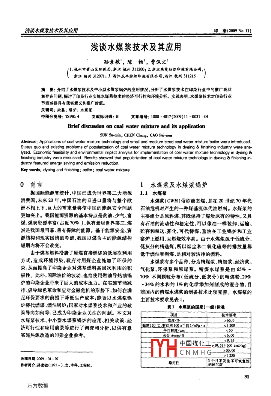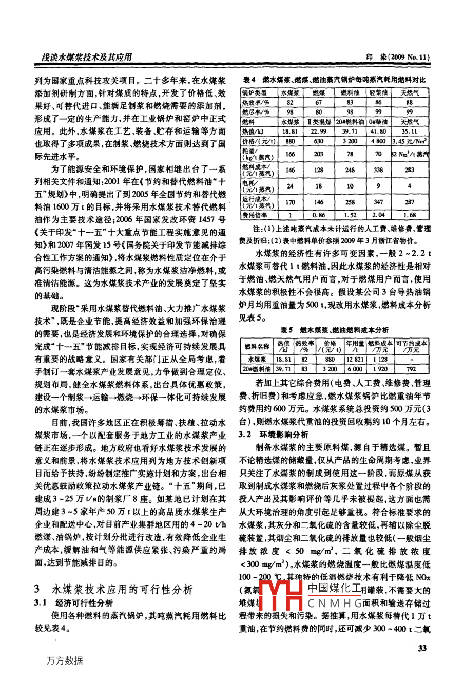 淺談水煤漿技術(shù)及其應(yīng)用印染(2009No.1)淺談水煤漿技術(shù)及其應(yīng)用孫素敏,陳暢,曹佩文31.杭州市蕭山區(qū)環(huán)保局,淅江杭州311200;2.浙江慶茂射織印染有限公司,浙江紹興312071;3.浙江慶豐紡織印染有服公司,漸江杭州311215要:介紹了水煤漿技術(shù)及中小型水煤漿鍋爐的應(yīng)用情況,分析了水煤漿技術(shù)在印染行業(yè)中的推廣現(xiàn)狀和存在問題探討了印染行業(yè)實施水煤漿技術(shù)的經(jīng)濟(jì)可行性和環(huán)境分析。實踐表明,水煤漿技術(shù)對印染行業(yè)節(jié)能減排具有現(xiàn)實意義和推廣價值。關(guān)鍵詞:染整;鍋爐;水煤漿中圖分類號:T1904文獻(xiàn)標(biāo)識碼:B文章編號:1000-4017(2009)11-0031-04Brief discussion on coal water mixture and its applicationSUN Su-min, CHEN Chang, CAO Pei-wenAbstract Applications of coal water mixture technology and small and medium sized coal water mixture boiler were introducedatus quo and existing problems of popularization of coal water mixture technology in dyeing finishing industry were ana-lyzed. Economic feasibility and environmental impact analysis for implementation of coal water mixture technology in dyeingfinishing industry were discussed. Results showed that popularization of coal water mixture technology in dyeing& finishing in-dustry featured energy saving and emission reductionKey words: dyeing and finishing; boiler: coal water mixture0前言1水煤漿及水煤漿鍋爐據(jù)國際能源署統(tǒng)計,中國已成為世界第二大能源1.1水煤漿消費國,未來20年,中國石油的日進(jìn)口量將與整個歐水煤漿(CWM)俗稱液態(tài)煤,是在20世紀(jì)70年代洲不相上下,巨大的需求量將使中國的能源安全問題石油危機(jī)時產(chǎn)生的一種煤基流體代油燃料。水煤漿的更加突出。我國能源資源的基本特點是貧油、少氣、富主要組分是原料煤,其既保持了煤炭原有的特性,又具煤,煤炭資源豐富(占近70%),保有量居世界第三煤有石油的流動性和穩(wěn)定性,可以像油一樣裝卸、運輸、炭是我國最可靠、最有保障的能源?;谀茉窗踩Y貯存和泵送、霧化,可代替煤、重油在工業(yè)鍋爐和工業(yè)源結(jié)構(gòu)和現(xiàn)實國情的考慮,我國以煤為主的能源結(jié)構(gòu)窯爐上燃用,且燃燒效率高。由于水煤漿源于低硫分、短期內(nèi)將不會改變。低灰分的精選煤,所以煙塵和二氧化硫等的排放量都由于煤基燃料沿襲了原煤直接燃燒的低層次利用低于燃油和燃煤,是相對較潔凈的燃料。方式,造成環(huán)境污染,政府對用煤企業(yè)施加了環(huán)保約水煤漿有多個品種,分為精煤漿、精細(xì)漿、經(jīng)濟(jì)漿束從而提高了印染企業(yè)對煤基燃料高層次利用的積氣化漿、環(huán)保漿和原煤漿。精煤水煤漿是由6%~極性。此外,國際油價的波動,也給使用燃油導(dǎo)熱油鍋70%不同顆粒分布(低硫分、低灰分)的精煤粉,29%爐的印染企業(yè)帶來了巨大的成本壓力。在實施節(jié)能減34%的水和約1%的化學(xué)添加劑制成的混合物,目排倡導(dǎo)綠色革命和應(yīng)對金融危機(jī)的形勢下如何在滿前國內(nèi)的精煤水煤漿的制備技術(shù)比較完善。水煤漿的足環(huán)保要求的前提下降低生產(chǎn)成本能否以水煤漿鍋主要技術(shù)要求見表1。爐替代燃煤、燃油鍋爐;國家對水煤漿技術(shù)和產(chǎn)業(yè)的政表1水煤漿的國家(一級)標(biāo)準(zhǔn)策導(dǎo)向如何等,已成為印染企業(yè)關(guān)注的問題。本文對技術(shù)要求水煤漿技術(shù)、中小型水煤漿鍋爐的應(yīng)用、相關(guān)政策、經(jīng)濃度/%濟(jì)可行性和應(yīng)用前景等進(jìn)行了調(diào)查和分析,以供有意照度(如,,m實施熱源改造的印染企業(yè)參考。灰分EYH中國煤化工195460c4CNMH30,00收稿日期:200904-07作者簡介:孫素敏(1975-),女本科,工程師穩(wěn)定性3個月不發(fā)生不可恢復(fù)性染(2009No11wwwcdfn.com.cn水煤漿的主要產(chǎn)地為八一礦、勝利礦、大同礦和撫油鍋爐運行成本髙及燃煤鍋爐污染環(huán)境的問題,是燃順礦。近幾年廣東江蘇浙江等地區(qū)也出現(xiàn)了一些水油、燃煤鍋爐理想的替代產(chǎn)品。典型的水煤漿導(dǎo)熱油煤漿廠和配送中心。水煤漿典型的制備工藝流程如爐系統(tǒng)流程和蒸汽鍋爐系統(tǒng)流程如圖2和圖3所示。圖1。空壓機(jī)葉儲氣罐分油缸}“供車間原料煤水、分散劑煙脫硫劑穩(wěn)定劑點爐油箱輕油泵循環(huán)油泵鼓風(fēng)機(jī)圖1水煤漿制備工藝流程12·水煤漿鍋爐圖2水煤漿導(dǎo)熱油爐系統(tǒng)流程水煤漿鍋爐分懸浮霧化水煤漿鍋爐和流化床水煤「空壓機(jī)“儲氣罐分汽缸供車間漿鍋爐。蒸發(fā)量較少的水煤漿鍋爐(一般不大于10t/h)基本上采用霧化燃燒方式較適宜印染企業(yè)使用。而流化床水煤漿鍋爐屬于大型鍋爐,一般不適印染企業(yè)使用,在此不再贅述。懸浮霧化水煤漿鍋爐又分導(dǎo)熱油爐系列熱水鍋爐系列和汽鍋爐系列,其[爐進(jìn)輕油泵鼓風(fēng)機(jī)‖軟化水特點是:最大限度吸取了燃油、燃煤鍋爐的優(yōu)勢;液態(tài)輸送和霧化燃燒;可實現(xiàn)自動化控制;燃盡率高,燃燒圖3水煤漿蒸汽鍋爐系統(tǒng)流程效率可達(dá)98%-99%,熱效率高達(dá)8%以上;解決了燃燃水煤漿導(dǎo)熱油爐的主要參數(shù)見表2。表2燃水煤漿導(dǎo)熱油爐的主要參數(shù)燃水煤漿導(dǎo)熱油爐規(guī)格/kcl1200160020002500300060001200額定熱功率/MW2.923.5014.00設