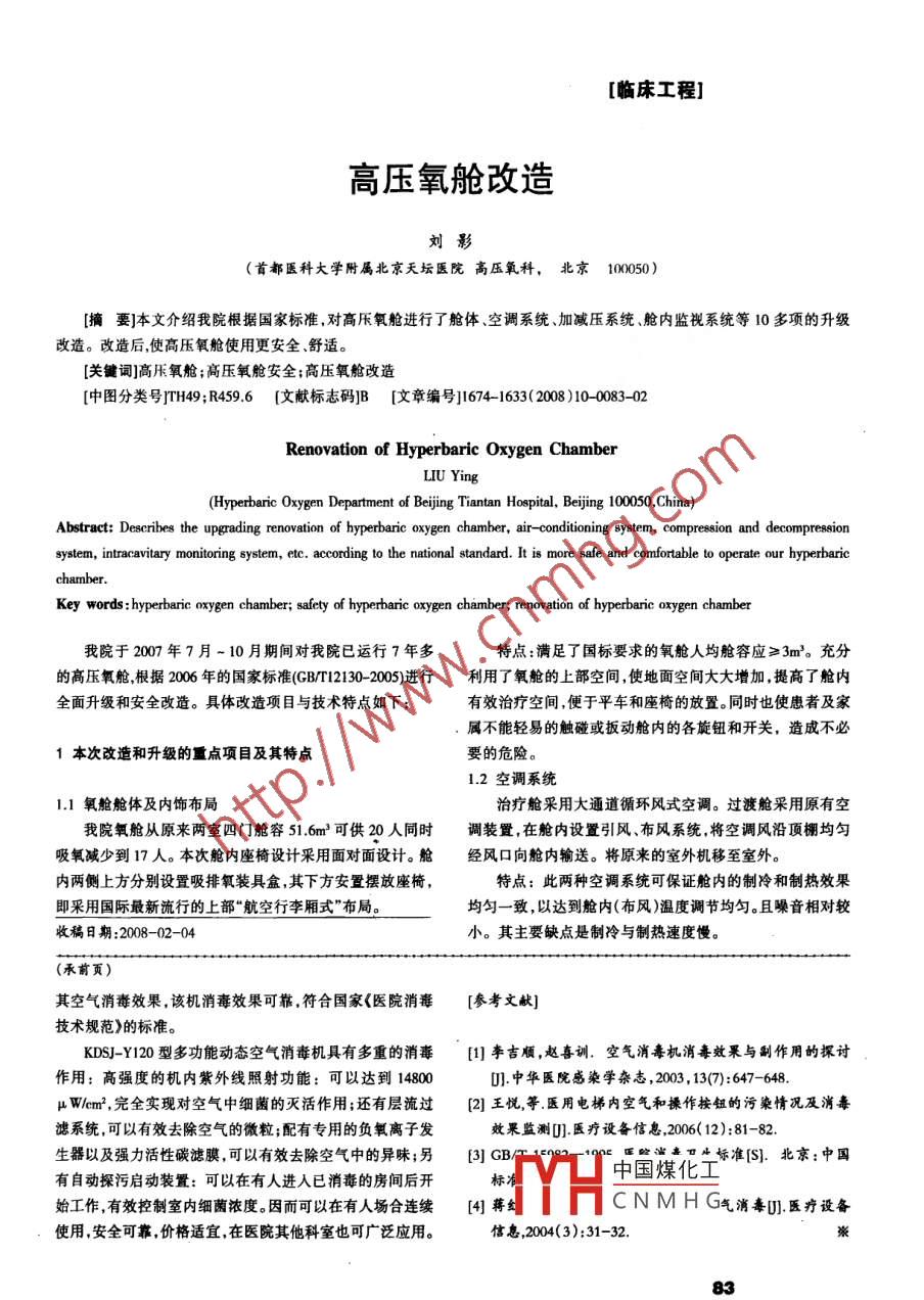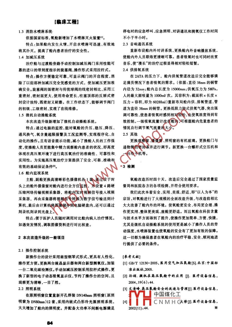 [臨床工程]高壓氧艙改造劉影(首都醫(yī)科大學(xué)附屬北京天壇醫(yī)院高壓氧科,北京100050)[摘要]本文介紹我院根據(jù)國(guó)家標(biāo)準(zhǔn),對(duì)高壓氧艙進(jìn)行了艙體、空調(diào)系統(tǒng)、加減壓系統(tǒng)艙內(nèi)監(jiān)視系統(tǒng)等10多項(xiàng)的升級(jí)改造。改造后使高壓氧艙使用更安全舒適[關(guān)鍵詞]高壓氧艙;高壓氧艙安全;高壓氧艙改中圖分類號(hào)TH49;R4596[文獻(xiàn)標(biāo)志碼]B[文章編號(hào)]1674-1633(2008)100083-02Renovation of Hyperbaric Oxygen ChamberLIU YAbstract: Describes the upgrading renovation of hyperbaric oxygen chamber, air-conditioning system, compression and decompressionsystem, intracavitary monitoring system, etc. according to the national standard. It is more safe and comfortable to operate our hyperbaricchambetKey words hyperbaric oxygen chamber; safety of hyperbaric oxygen chamber; renovation of hyperbaric oxygen chamber我院于2007年7月-10月期間對(duì)我院已運(yùn)行7年多特點(diǎn):滿足了國(guó)標(biāo)要求的氧艙人均艙容應(yīng)≥3m3。充分的高壓氧艙根據(jù)2006年的國(guó)家標(biāo)準(zhǔn)(GBT2302005)進(jìn)行利用了氧艙的上部空間,使地面空間大大增加,提高了艙內(nèi)全面升級(jí)和安全改造。具體改造項(xiàng)目與技術(shù)特點(diǎn)如下有效治療空間,便于平車和座椅的放置。同時(shí)也使患者及家屬不能輕易的觸碰或扳動(dòng)艙內(nèi)的各旋鈕和開關(guān),造成不必1本次改造和升級(jí)的重點(diǎn)項(xiàng)目及其特點(diǎn)要的危險(xiǎn)。1.2空調(diào)系統(tǒng)11氧艙艙體及內(nèi)飾布局治療艙采用大通道循環(huán)風(fēng)式空調(diào)。過(guò)渡艙采用原有空我院氧艙從原來(lái)兩室四門艙容51.6m3可供20人同時(shí)調(diào)裝置,在艙內(nèi)設(shè)置引風(fēng)、布風(fēng)系統(tǒng),將空調(diào)風(fēng)沿頂棚均勻吸氧減少到17人。本次艙內(nèi)座椅設(shè)計(jì)采用面對(duì)面設(shè)計(jì)。艙經(jīng)風(fēng)口向艙內(nèi)輸送。將原來(lái)的室外機(jī)移至室外。內(nèi)兩側(cè)上方分別設(shè)置吸排氧裝具盒,其下方安置擺放座椅,特點(diǎn):此兩種空調(diào)系統(tǒng)可保證艙內(nèi)的制冷和制熱效果即采用國(guó)際最新流行的上部“航空行李廂式”布局均勻一致,以達(dá)到艙內(nèi)(布風(fēng))溫度調(diào)節(jié)均勻。且噪音相對(duì)較稿日期:2008-02-04小。其主要缺點(diǎn)是制冷與制熱速度慢(承前頁(yè))其空氣消毒效果該機(jī)消毒效果可靠符合國(guó)家《醫(yī)院消毒[參考文獻(xiàn)技術(shù)規(guī)范》的標(biāo)準(zhǔn)。KDSJ-Y20型多功能動(dòng)態(tài)空氣消毒機(jī)具有多重的消毒[李吉順,趙喜訓(xùn).空氣消毒機(jī)消毒效果與副作用的探討作用:高強(qiáng)度的機(jī)內(nèi)紫外線照射功能:可以達(dá)到14800U中華醫(yī)院感染學(xué)雜志,2003,13(7):647-648μWcm2,完全實(shí)現(xiàn)對(duì)空氣中細(xì)菌的滅活作用;還有層流過(guò)(2]王悅等醫(yī)用電梯內(nèi)空氣和操作按鈕的污染情況及消毒濾系統(tǒng),可以有效去除空氣的微粒;配有專用的負(fù)氧離子發(fā)效果監(jiān)測(cè)醫(yī)療設(shè)備信息,2006(12):81-82生器以及強(qiáng)力活性碳濾膜,可以有效去除空氣中的異味;另(3]GB險(xiǎn)出嘉口斗標(biāo)準(zhǔn)[S].北京:中國(guó)有自動(dòng)探污啟動(dòng)裝置:可以在有人進(jìn)入已消毒的房間后開中國(guó)煤化工始工作,有效控制室內(nèi)細(xì)菌濃度。因而可以在有人場(chǎng)合連續(xù)[4]蔣CNMHG氣消毒U!醫(yī)療設(shè)備使用,安全可靠,價(jià)格適宜在醫(yī)院其他科室也可廣泛應(yīng)用。信息,2004(3):31-32床工程]1.3消防水噴淋系統(tǒng)停電時(shí)的應(yīng)急呼叫、應(yīng)急照明、對(duì)講通訊和測(cè)氧儀工作時(shí)間依據(jù)國(guó)家標(biāo)準(zhǔn),氧艙新增加了水噴淋滅火裝置不小于半小時(shí)。特點(diǎn):如果艙內(nèi)發(fā)生火情,開啟水噴淋可迅速、有效地2.3音響通訊系統(tǒng)將其撲滅。提高了艙內(nèi)患者治療的安全性。重新布設(shè)艙內(nèi)外對(duì)講系統(tǒng),更換艙內(nèi)外音響播放系統(tǒng)14加減壓系統(tǒng)使艙內(nèi)外人員聯(lián)絡(luò)更清晰可靠?;颊呶鯐r(shí)也可同時(shí)欣賞治療艙與過(guò)渡艙旁路手動(dòng)控制加減壓閥門采用性能可音樂,使“漫長(zhǎng)”的治療過(guò)程顯得相對(duì)輕松短暫??康倪M(jìn)口的帶刻度指示的旋塞閥操作形式采用拉桿式。24供排氧系統(tǒng)特點(diǎn):操作方便穩(wěn)定可靠,可顯示閥門的開啟程度,消在2ATA的壓力下,艙內(nèi)供氧管道改造后完全能夠滿除了以前那種加減壓完全憑感覺的方式,使加減壓更加準(zhǔn)足滿員情況下患者吸氧的需求。(依據(jù):直徑38mm的銅管確安全。旋塞閥的面密封與傳統(tǒng)球閥的線密封相比,采用三內(nèi)徑為32mm;艙內(nèi)總長(zhǎng)度為1500mm;供氧壓力為5MPa重密封,密封面更大,使用壽命更長(zhǎng),柱塞頂部的反唇式密的最大潮吸量為1000m/次。其容積為:截面積x長(zhǎng)度x封設(shè)計(jì)獨(dú)特,既密封又耐磨。在工作狀態(tài)下,能夠調(diào)節(jié)閥門壓力=容積,即為60288ml)重新布局艙內(nèi)供排氧管道,管的初級(jí)、工級(jí)密封,實(shí)現(xiàn)了在線維修。道為直徑38mm的銅管。更換低阻力肺式供氧氣器,突出強(qiáng)1.5微機(jī)自動(dòng)操艙系統(tǒn