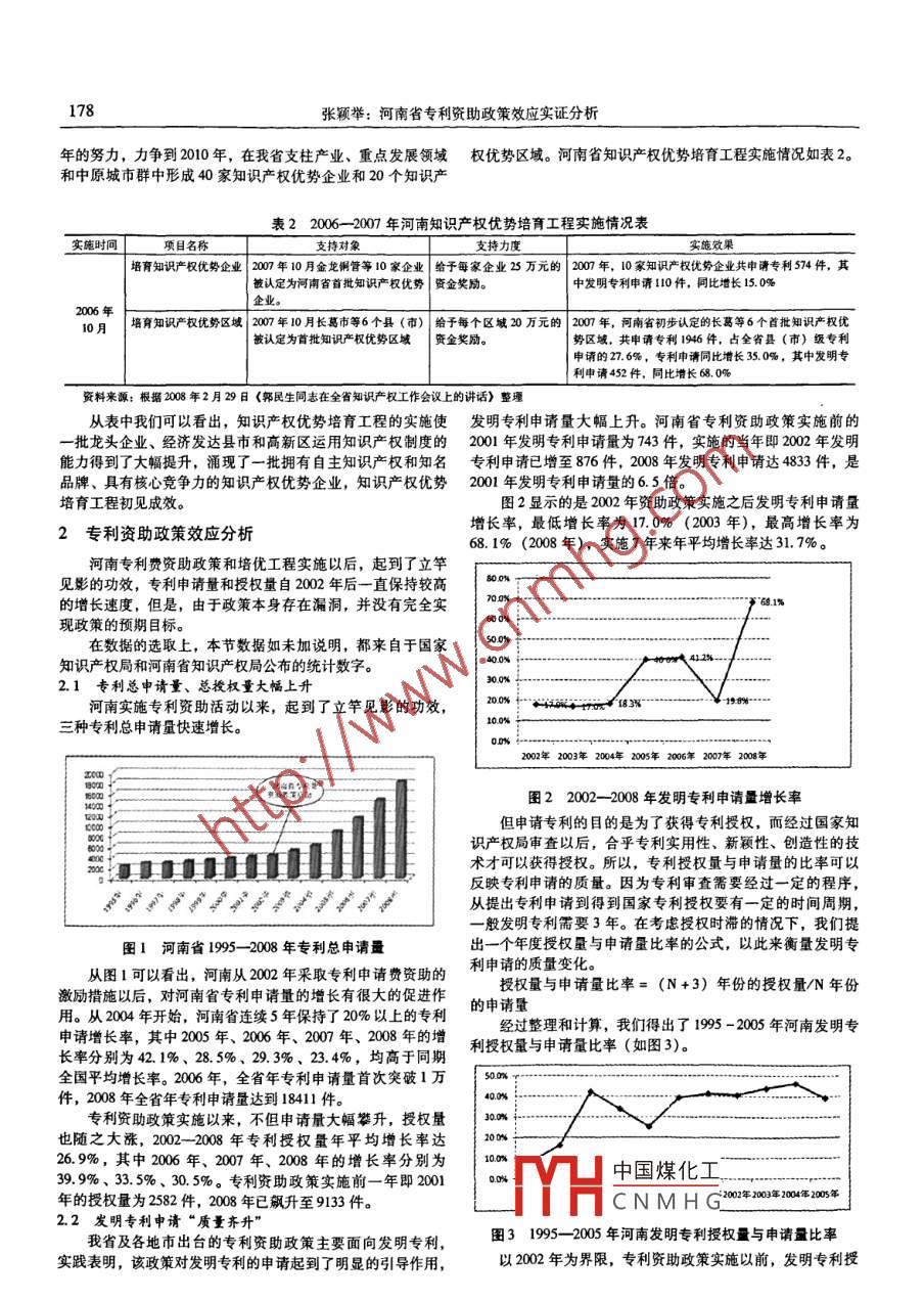 科技管理研究2010年第8期2010 No. 8Science and Technology Management Rescarch文章編號: 1000-7695 (2010) 08 -0177 -04河南省專利資助政策效應(yīng)實證分析張穎舉(河南農(nóng)業(yè)大學(xué),河南鄭州450002)摘要:河南省的專利資助政策通過對受資助專利類型、專利申請者、產(chǎn)業(yè)領(lǐng)域的選擇,有偏重地資助本身專利產(chǎn)出結(jié)構(gòu)中較為薄弱的環(huán)節(jié),將專利創(chuàng)造和中請向符合河南經(jīng)濟利益需求的方向加以引導(dǎo),其實施促進了河南.省專利申請量和授權(quán)量的增長,但并沒有實現(xiàn)優(yōu)化專利產(chǎn)出結(jié)構(gòu)的預(yù)期目標。需要調(diào)整資助類型和范圍,建立梯度資助標準,通過政策優(yōu)化進一步調(diào)整專利產(chǎn)出結(jié)構(gòu)。關(guān)鍵詞:專利資助政策;專利產(chǎn)出結(jié)構(gòu);河南省中圖分類號: G306文獻標識碼: A從公共政策角度看,地方專利資助政策體現(xiàn)了地方政府持河南省企業(yè)和個人開展技術(shù)創(chuàng)新,推動科技進步和經(jīng)濟發(fā)對知識產(chǎn)權(quán)領(lǐng)域管理的宗旨與目的,形成了政府在私權(quán)領(lǐng)域展。河南省的專利資助政策是以本區(qū)域的經(jīng)濟、科技的發(fā)展推動科技進步和經(jīng)濟增長的引導(dǎo)機制。因此政府在制定和實需 要為基礎(chǔ),以專利在市場競爭的價值為標準進行資助,具施專利資助政策時都以本區(qū)域的經(jīng)濟、科技、文化和教育的有明顯的導(dǎo)向性,其政策主要有以下兩個方面構(gòu)成:專利費發(fā)展現(xiàn)狀為基礎(chǔ),同時也應(yīng)以未來一定階段的社會發(fā)展需要資助政策和知識產(chǎn)權(quán)優(yōu)勢培育工程。為愿景,所以不同地區(qū)專利資助政策就會有所不同。河南省l.1 河南省專利費資助政策的專利資助政策正是通過對受資助專利類型、專利申請者、2002年,河南開始設(shè)立專利申請資助資金。該項政策的產(chǎn)業(yè)領(lǐng)域的選揮,利用公共財政有偏重地?zé)o償資助本身專利目的是,政府試圖用財政資助的手段激勵本地區(qū)企業(yè)提高專產(chǎn)出結(jié)構(gòu)中較為薄弱的環(huán)節(jié),將本身社會群體使用專利制度利申請意識,尤其是提高本地區(qū)發(fā)明專利擁有量,達到增強的個體行為向符合河南經(jīng)濟利益需求的方向加以引導(dǎo),在一本地區(qū)知識產(chǎn)權(quán)實力的目標。<河南 省知識產(chǎn)權(quán)戰(zhàn)略綱要》定程度上起到了調(diào)整專利產(chǎn)出結(jié)構(gòu)和優(yōu)化創(chuàng)新資源配置的杠提出:到2020年,把我省建設(shè)成知識產(chǎn)權(quán)制度體系完善、法桿效應(yīng)。制保護有力、專業(yè)人才充足、創(chuàng)造機制活躍、實施效果明顯的知識產(chǎn)權(quán)強省。河南省專利費資助政策的主要內(nèi)容如表1。1 河南省專利資助政策概述2002年以來,河南省出臺一系列專利資助政策,鼓勵支表1 河南省專利費資助政策實施年份資助對象資助專利類型資助條件資助金額河南省的企事業(yè)單位、機1、發(fā)明專利所申請的專利應(yīng)當屬于國1、發(fā)明專利申請費、發(fā)明|1、發(fā)明專利申請代理費的關(guān)和團體2、對促進本領(lǐng)域的技術(shù)進| 家及河南省重點發(fā)展的高專利申請審查費、 發(fā)明專|資助額為每件 300元,其它步與創(chuàng)新有突出作用的實|技術(shù)領(lǐng)城和支柱產(chǎn)業(yè)。利申請維持費、發(fā)明專利|費用按不低于實際發(fā)生額2002年用新型專利50%的比例資助。3、獲得較高市場知名度的2、符合規(guī)定的實用新型專2.符合規(guī)定的實用新型專外觀設(shè)計專利利和外觀設(shè)計專利資助范|利和外觀設(shè)計專利資助金圍參照第一條.I額參照第一條.賢料來源:根據(jù)《河南省專利申請資助資金管理辦法)整理從表中我們可以看出河南省專利費資助政策具有明顯的設(shè)立情況看, 全省共有36個縣(區(qū))設(shè)立專利申請資助資導(dǎo)向性,在資助專利類型中,重點資助發(fā)明專利、選擇性地金,其中新密、長葛兩市年資助金額在100萬元以上(含100資助符合規(guī)定的實用新型專利及外觀設(shè)計專利;在資助條件萬元)”。中,只資助國家和河南省重點發(fā)展的高技術(shù)領(lǐng)域和支柱產(chǎn)業(yè)。省、市、縣(區(qū))三級專利資助資金的設(shè)立,使專利申這種導(dǎo)向性代表了專利費資助政策未來發(fā)展的主流方向。請者可以得到至少三倍的資助,有力地促進了專利申請量的在河南省專利費資助政策出臺以后,各地市包括各縣區(qū)提高。也紛紛出臺了專利費資助政策。根據(jù)2009年6月河南省知識1.2 河南省知識產(chǎn) 權(quán)優(yōu)勢培育工程產(chǎn)權(quán)局對全省專利資助情況的調(diào)查,目前全省18個省轄市中為了提高企業(yè)、區(qū)城運用知識產(chǎn)權(quán)制度的能力和水平,除了開封、信陽、周口3個市外,其余15個省轄市均設(shè)立了形成中國煤化工,2006年河南省知識專利申清資助資金,其中鄭州、洛陽兩市年資助金額均在100產(chǎn)權(quán)局YH全省聯(lián)合實施了“河萬元(含100萬元)以上。從縣、區(qū)一級專利申請資助資金南省知CNMHG總體目標是:通過5收稿日期: 2009 -09 -22,修回日期: 2009-12 -31基金項目:河南省哲學(xué)社會科學(xué)規(guī)劃項目“ 河南知