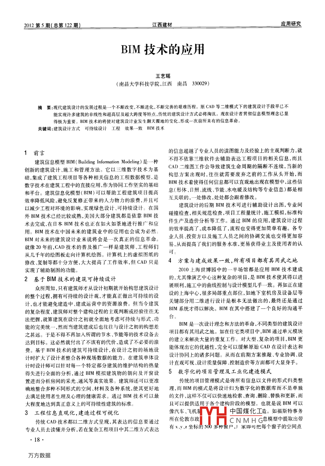 2012第5期(總第122期)江西建材應(yīng)用研究BM技術(shù)的應(yīng)用王藝瑤(南昌大學(xué)科技學(xué)院,江西南昌330029)摘要:現(xiàn)代建筑設(shè)計的發(fā)展過程是一個不斷改變,不斷進(jìn)化,不斷完善的艱難歷程。原CAD等二維模式下的建筑設(shè)計手段早已不能實(shí)現(xiàn)許多建筑的非線性和超高層及超大跨度等特點(diǎn),傳統(tǒng)的建筑設(shè)計方式必將淘汰。現(xiàn)在設(shè)計者貫徹信息模型理念已顯得極為重要。BM技術(shù)的將使對建筑設(shè)計業(yè)發(fā)生翻天覆地的變化形成一次前所未有的信息革命關(guān)鍵詞:建筑設(shè)計方式可持續(xù)設(shè)計工程效果一致BIM技術(shù)1前言的信息超越了專業(yè)人員的讀圖能力及經(jīng)驗(yàn)上的主觀判斷力就建筑信息模型BIM( Building Information Modeling)是一種不得不依靠三維軟件去輔助表達(dá)工程項(xiàng)目的相關(guān)信息,而且創(chuàng)新的建筑設(shè)計施工和管理方法。它以三維數(shù)字技術(shù)為基CAD二維圖工作會導(dǎo)致建筑生命周期的隔斷不連續(xù),當(dāng)新的礎(chǔ)集成了建筑工程項(xiàng)目等各種相關(guān)信息的工程數(shù)據(jù)模型,是構(gòu)思方案出現(xiàn)時,往往就需要廢奔之前的工作從頭開始,而數(shù)字技術(shù)在建筑工程中的直接應(yīng)用作為協(xié)同工作堅(jiān)實(shí)的基礎(chǔ)BM技術(shù)著使得任何信息都可以直觀地出現(xiàn)在模型中,這些信和平臺。建筑信息化模型(BM)可以幫助工程建筑項(xiàng)目提高息(形體、日照、流線節(jié)能水電暖及結(jié)構(gòu)等專業(yè)信息)都是相效率降低風(fēng)險,避免反復(fù)修正帶來的人力物力的浪費(fèi),并且可互關(guān)聯(lián)的,一處修改,處處都會跟著修改以減少工程對環(huán)境的影響,實(shí)現(xiàn)綠色設(shè)計、可持續(xù)設(shè)計:。在國建筑設(shè)計的后期BIM技術(shù)可進(jìn)行輔助設(shè)計出圖,專業(yè)間外BM技術(shù)已經(jīng)比較成熟,美國大部分建筑都是依靠BM技碰撞檢查,相關(guān)規(guī)范檢查,項(xiàng)目工程量統(tǒng)計,施工模擬標(biāo)準(zhǔn)構(gòu)術(shù)去完成在日本BM技術(shù)也正在如火如茶地進(jìn)行推廣和應(yīng)件生產(chǎn)及造價分析等工作。通過BM的應(yīng)用建筑設(shè)計過程用。BIM技術(shù)在中國未來的建筑業(yè)中的應(yīng)用也會成為必然的效率提高了,成本降低了,流程也變得更加簡單有趣。各專BM對未來的建筑設(shè)計業(yè)來說將會是一次真正的信息革命。業(yè)人員投資方以及施工人員之間的協(xié)調(diào)交流也變得更加容就像20年前CAD技術(shù)的普及推廣一樣是建筑師、工程師們易,從而提高了我們的服務(wù)水準(zhǔn),更易獲得業(yè)主及使用者的認(rèn)從幾千年的繪圖板走向計算機(jī)繪圖。計算機(jī)上的虛擬圖紙的可:修改、復(fù)制等都十分方便,大大提高了工作效率,但CAD只是4方案與建成效果一致,所有項(xiàng)目都有其用武之地實(shí)現(xiàn)了輔助制圖的功能。2010上海世博園中的一半場館都是應(yīng)用BM技術(shù)建成2基于BM技術(shù)的建筑可持續(xù)設(shè)計的,尤其像演藝中心這種復(fù)雜的項(xiàng)目,是BM技術(shù)使其得以進(jìn)眾所周知,只有建筑師才從設(shè)計初期就開始構(gòu)思建筑設(shè)計展順利施工中的曲線控制與設(shè)計模型幾乎一致。再如正在建的整個過程擁有可持續(xù)的設(shè)計觀才能真正做出可持續(xù)的設(shè)設(shè)的上海中心,很多局部重點(diǎn)部位,如地下室機(jī)房及設(shè)備層等能避免建造中建成運(yùn)營中的資源浪費(fèi)。但當(dāng)今建筑關(guān)鍵部分用二維進(jìn)行設(shè)計是根本無法做出的最終還是通過的復(fù)雜程度建筑師對整個建構(gòu)過程的主觀判斷或經(jīng)驗(yàn)往往無B系統(tǒng)才得以解決。BM在其中搭建了一個良好的溝通平法把握,就算建筑在設(shè)計之初就全面地考慮可持續(xù)與形式、功臺。能的完美統(tǒng)一,然而當(dāng)建筑建成后也往往與設(shè)計之初的構(gòu)想差BIM是一次設(shè)計理念和方法的革命,不同類型的建筑設(shè)計之甚遠(yuǎn)。于是不得不再加入所謂的節(jié)水、節(jié)能等的技術(shù)設(shè)備去項(xiàng)目都有其用武之地。如在住宅類項(xiàng)目中,BM通過單元模塊達(dá)到目標(biāo)。這必然就付出了不該有的代價,造成了不必要的浪的建立來解決大量的重復(fù)工作。對大型,復(fù)雜的項(xiàng)目,BM更費(fèi)。基于BIM技術(shù)的建筑可持續(xù)設(shè)計,在設(shè)計之初的場地設(shè)能體現(xiàn)出它的優(yōu)越性完全可以緩解原始CAD在設(shè)計表達(dá)和計時擴(kuò)大了設(shè)計者整合各種現(xiàn)場數(shù)據(jù)的能力。在建筑單體設(shè)設(shè)計協(xié)同上的諸多問題。從而在前期方案推敲、專業(yè)協(xié)調(diào)、設(shè)計時設(shè)計師可以針對每一個特定部分建筑的維護(hù)結(jié)構(gòu)的熱量計直觀可視、設(shè)計質(zhì)量保障控制造價等方面都可大顯身手得失進(jìn)行全面的分析,通過BM模擬建筑物的朝向及開窗設(shè)5數(shù)字化的項(xiàng)目管理及工業(yè)化建造模式置進(jìn)而分析房間的采光、通風(fēng)等真實(shí)效果。建筑師還可以更準(zhǔn)傳統(tǒng)的項(xiàng)目管理模式是將所有信息以文件的形式歸類整確地