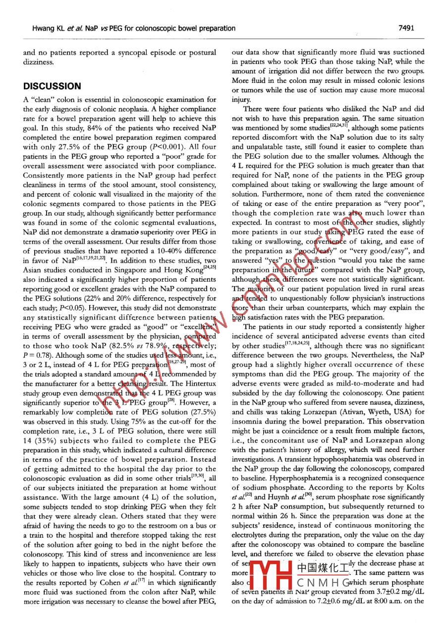PO Box 2345, Beijing 100023, ChinaWorld I Gastroenterol 2005;11(47:7486-7493www.wjgnet.comWorld Journal of Gastroenterology ISSN 1007-9327wjg@wignet.comELSEVIER◎2005 The wjG Press and Elsevier Inc. All rights reserved.●CLINTCAL RESEARCH●Prospective rando mized comparison of oral sodiumphosphate and polyethylene glycol lavage for colonoscopypreparationKai-in Hwang, Wlliam Tzu-Liang Chen, Koung-Hong Hsiao, Hong-Chang Chen, Ting-Ming Huang, Chien-Ming Chiu,Ger-Haur HsuKai-Lin Hwang, Department of Public Health, Chung Shantransverse (94.6% vs 74.4%, P = 0.025) colon. lightlyMedical University, Taichung 402, Taiwan; Center for Clinicalmore patients graded the taste of NaP as "good" or "veryTrials, ChangHua Christian Hospital, Changhua 500, Taiwan,good" compared to the PEG patients (32.5% Vs 12.5%;ChinaP = 0.059). Patients' willingness to take the same prepa-William Tzu-Liang Chen, Koung-Hong Hsiao, Hong-Changration in the future was 68.4% in the NaP compared toChen, Ting-Ming Huang, Chien-Ming Chiu, Ger-Haur Hsu,75% in the PEG group (P = 0.617). There was a signif-Division of Colorectal Surgery at ChangHua Christian Hospital,cant increase in serum sodium and a significant decreaseChanghua 500, Taiwan, ChinaThis study was conducted at the Division of Colorectal Surgery atin phosphate and chloride levels in NaP group on the dayfollowing the colonoscopy without any dlinical sequelae.ChangHua Christian Hospital, Changhua 500, Taiwan, ChinaCorrespondence to: Dir. William Tzu-Liang Chen, Division ofProlonged (>24 h) hemodynamic changes were also ob-Colorectal Surgery, ChangHua Christian Hospital, 135 Nanhsiaoserved in 20-35% subjects of either group.Street, Changhua, 500, Taiwan, China. 37599@cch.org.twTelephone: +886- 4-7238595 Fax: +886-4-7227945CONCLUSION: Both bowel cleansing agents provedReceived: 2005-04-07Accepted: 2005-07-08to be similar in safety and effectiveness, while NaP ap-peared to be more cost-effective. After identifying andexcluding patients with potential risk factors, sodiumphosphate should become an alternative preparation forAbstractpatients undergoing elective colonoscopy in the Taiwan-AIM: To compare the effectiveness, patient acceptability,ese population. ,and physical tolerability of two oral lavage solutions priorG 2005 The W)G Press and Elsevier Inc. AIl rights reserved.to colonoscopy in a Taiwanese population.METHODS: Eighty consecutive patients were random-Key words: Colonoscopy; Bowel preparation; Sodiumized to receive either standard 4 L of polyethylene glycolphosphate; Polyethylene glycol(PEG) or 90 mL of sodium phosphate (NaP) in a splitHwang KL, Chen WTL, Hsiao KH, Chen HC, Huang TM,regimen of two 45 mL doses separated by 12 h, prior toChiu CM, Hsu GH. A prospective randomized comparisoncolonoscopic evaluation. The primary endpoint was theof oral sodium phosphate and polyethylene glycol lavagepercent of subjects who had completed the preparation.for colonoscopy preparation. World J Gastroentero/ 2005;Secondary endpoints included colonic dleansing evalu-11(47): 7486-7493ated with' an overall assessment and segmental evalua-http://www.wjgnet.com/1007-9327/11/7486.asption, the tolerance and acceptability assessed by a self-administered structured questionnaire, and a safety pro-file such as any unexpected adverse events, electrolytetests, physical exams, vital signs, and body weights.INTRODUCTIONRESULTS: A significantly higher completion rate wasColonoscopy has become an essential procedure for thefound in the NaP group compared to the PEG groupdetection and treatment of colonic lesions; therefore,(84.2% vs 27.5%, P<0.001). The amount of fluid SuC-cleansing the bowel for adequate visualization of thetioned was significantly less in patients taking NaP VSmucosa during colonoscopic examination isPEG (50.13+54.8 cc vs 121.13+115.4 c, P<0.001),important. In the past two decades, various boweleven after controlling for completion of the oral solutionpreparation methods have been proposed including castor(P = 0.031). The two groups showed a comparabledinhenulmathanes, phenolphthalein,overall assessment of bowel preparation with a rate of"good" or "excellent" in 78.9% of patients in the NaPand中國(guó)煤化工tion with a low residuegroup and 82.5% in PEG group (P = 0.778). Patientsdiet'TYH.CNMHGansing agents, cleansingenembowel preparations .taking NaP tended to have significantly better colonicThe introduction of polyethylene glycol (PEG) in 1980,segmental cleansing relative to stool amount observedin the descending (94.7% Vs 70%, P = 0.007) andan osmotically balanced solution, gradually replaced the7487Hwang KL et al. NaP vs PEG for colonoscopic bowel preparationrigorous traditional 2 d preparation of enemas, a。MATERIALS AND METHODSliquid diet, and laxatives in various combinationsPatients and methodsAlthough PEG provided safe and effective bowel cleansing,From August 2003 to December 2003, 80 consecutivethe patient was required to take 3-4 Lof a salty tastingpatients who underwent elective colonoscopy weresolution within a short period of time'e61. As repotted,enolled in this study. Eligible patients who had given5-15% of patients were unable to finish the prescribedwritten informed consent were randomized to receivedosagelhio, potenialy resuling in a pootly cleansed coloneither the standard 4 L of PEG (Klean Prep solution;and inadequate colonoscopic assessment'Helsinn Birex Pharmaceuticals Ltd, UK) or 90 mL of NaPOral sodium phosphate (NaP), a highly osmotic(Fleet' Phospho soda*; C.B. Fleet Company, Inc, USA),cathattic containing monobasic and dibasic sodiumin a split regimen of two 45 mL doses separated by 12 h,phosphate, was first evaluated by Vanner et al' in 1990prior to the colonoscopic evaluation. Colonoscopy wasby comparing it with PEG solutions. The mechanism ofscheduled after 8:00 a.m. for all the subiects, and studyNaP is through the osmotic effect of phosphate. Thissubjects werc asked to report to the endoscopy room bydraws large amounts of water 