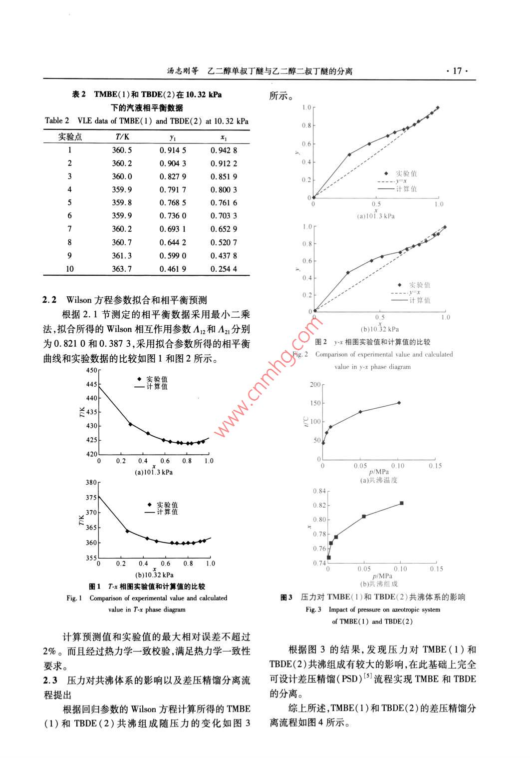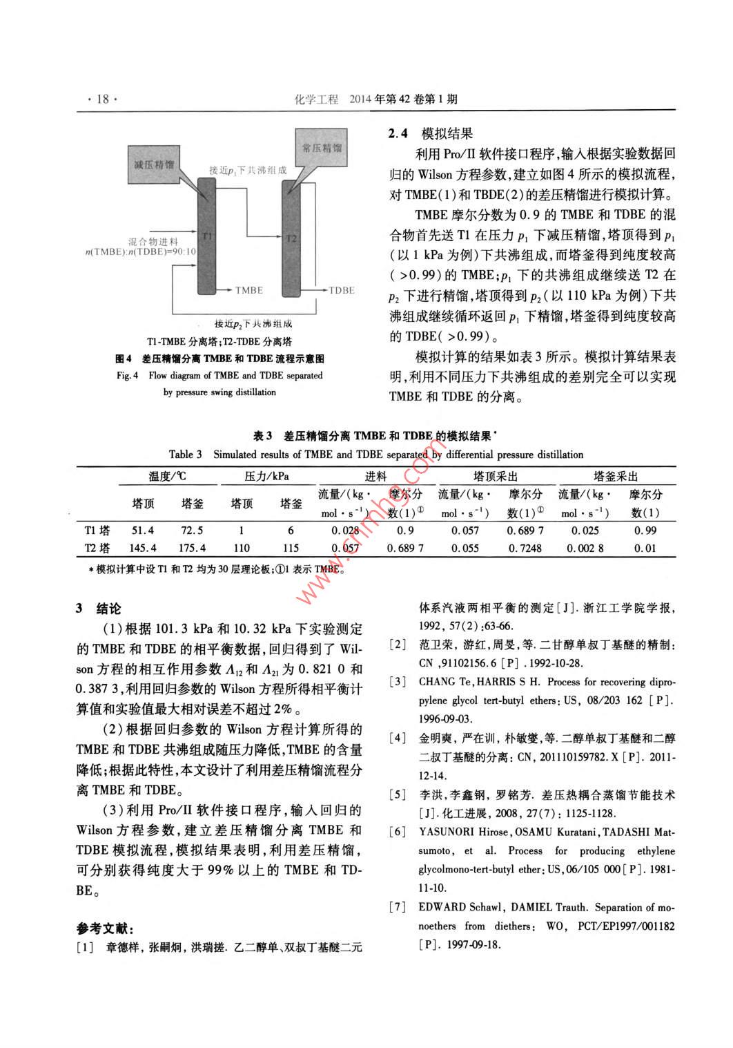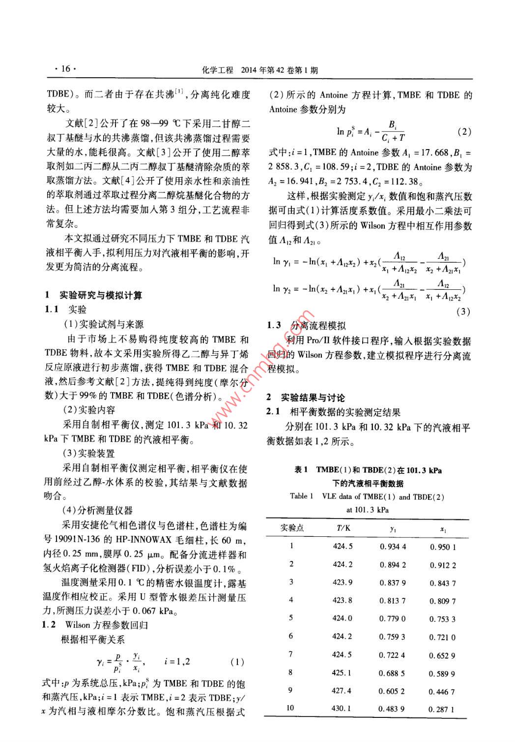 第42卷第1期化學(xué)工程Vol 42 No, I014年1月CHEMICAL ENGINEERING( CHINA)Jan.2014乙二醇單叔丁醚與乙二醇二叔丁醚的分離湯志剛,李紅偉,郭棟,崔敬杰(清華大學(xué)化學(xué)工程系化學(xué)工程國(guó)家重點(diǎn)實(shí)驗(yàn)室,北京10004)搞要:在實(shí)驗(yàn)測(cè)定乙二醇單叔丁醚(TMBE)與乙二醇二叔丁醚(TDBE)相平衡數(shù)據(jù)的基礎(chǔ)上,回歸得到了Wlon方程的相互作用參數(shù)A12和A21,并利用回歸參數(shù)的Wlon方程預(yù)測(cè)了TMBE和TDBE共沸組成隨壓力降低,TMBE的摩爾分?jǐn)?shù)降低。根據(jù)此特性,文中設(shè)計(jì)了利用差壓精餾分離TMBE和TDBE的流程,并在Pro/流程模擬軟件上,建立了差壓精餾分離TMBE和TDBE的模型并進(jìn)行了模擬計(jì)算。模擬結(jié)果表明利用差壓精餾可分別獲得純度摩爾分?jǐn)?shù))大于99%以上的TMBE和TDBE。關(guān)鍵詞:乙二醇單叔丁醚;乙二醇二叔丁醚;Wlon方程;差壓精餾;分離中圖分類號(hào):TQ013.1文獻(xiàn)標(biāo)識(shí)碼:A文章編號(hào):1005-9954(2014)014001504DoI:10.3969/j.isn.1005-9954.2014.01.004Separation of ethylene glycol mono-tert-butyl ether andethylene glycol di-tert-butyl etherTANG Zhi-gang, LI Hong-wei, GUO Dong, CUI Jing-jieState Key Laboratory of Chemical Engineering, Department of Chemical EngineeringTsinghua University, Beijing 100084, China)Abstract: Binary VLe data of ethylene glycol mono-tert-butyl ether (TMBE)and ethylene glycol di-tert-butyl ether(TDBE)were experimentally determined to regress the interaction parameter An and A2 in Wilson equation. Asthe molar fraction of TMBE in azeotrope decreases with the decrease of pressure based on the prediction of wilsonequation, a pressure swing distillation process was designed to separate TMBE and TDBE and simulated by Pro/llsimulation software. The simulation results show that TMBE and TDBE with purity more than 99%( mole fractioncan be obtained separatelyKey words: ethylene glycol mono-tert-butyl ether; ethylene glycol di-tert-butyl ether; Wilson equation; pressureswing distillation; separation乙二醇單叔丁醚(簡(jiǎn)稱TMBE)可與多數(shù)有機(jī)稀釋劑用于印刷油墨中,可大大提高油墨的流變性,溶劑混溶,可溶解氨基/硝基/醇酸/丙烯酸等樹脂。提高髙速印刷的質(zhì)量及光澤度、附著牢度。在室溫(25℃)下可與水混溶。主要用于涂料工業(yè)由于其低毒、低刺激性,在美國(guó)、日本、歐洲已逐中乳膠水分散涂料,因本溶劑的HLB值接近9.0,漸取代了應(yīng)用多年的乙二醇丁醚,大量應(yīng)用于汽車其在分散體系中的功能起著分散劑乳化劑/流變及建筑涂料特別是水分散涂料。劑/助溶劑的作用。它可以提高水分散涂料的干燥乙二醇單叔丁醚通常由異丁烯與乙二醇進(jìn)行加速度、平整度、光亮度、附著牢度。由于其叔丁基結(jié)成反應(yīng)而得,如下所示構(gòu),使其具有較髙的光化學(xué)穩(wěn)定性及安全性。用本50-60℃(CH3)2 C=CH2+ HOCH, CH, OH溶劑制成的水分散涂料,有良好的儲(chǔ)存穩(wěn)定性,特別HOCH, CH2 OC( CH3)3是在冬季低溫的條件下由于生產(chǎn)過程催化劑選擇性有限,生成乙二醇用乙二醇單叔丁醚為溶劑制成的油墨,或作為單叔丁醚的同時(shí)往往伴生乙二醇二叔丁醚(簡(jiǎn)稱收稿日期:201343404作者簡(jiǎn)介:湯志剛(1970—),男,博士,副教授,主要從事化工分離、有機(jī)溶劑制漿等研究,電話:(010)62785495, E-mail:; chg-tang@ tsinghuaedu.cn;李紅偉,通信聯(lián)系人, E-mail: lihw12@qcom。16化學(xué)工程2014年第42卷第1期TDBE)。而二者由于存在共沸,分離純化難度(2)所示的 Antoine方程計(jì)算,TMBE和TDBE的較大。Antoine參數(shù)分別為文獻(xiàn)[2]公開了在98-99℃下采用二甘醇二叔丁基醚與水的共沸蒸餾,但該共沸蒸餾過程需要In P=ABC+t大量的水能耗很高。文獻(xiàn)[3]公開了使用二醇萃式中=1,TMBE的 Antoine參數(shù)A1=17.668,B1=取劑如二丙二醇從二丙二醇叔丁基醚清除雜質(zhì)的萃2858.3,C1=108.59;i=2,TDBE的 Antoine參數(shù)為取蒸餾方法。文獻(xiàn)[4]公開了使用親水性和親油性2=16.941,B2=2753.4,C2=112.38。的萃取劑通過萃取過程分離二醇烷基醚化合物的方這樣,根據(jù)實(shí)驗(yàn)測(cè)定y/x,數(shù)值和飽和蒸汽壓數(shù)法。但上述方法均需要加入第3組分,工藝流程非據(jù)可由式(1)計(jì)算活度系數(shù)值。采用最小二乘法可常復(fù)雜。回歸得到式(3)所示的Wlon方程中相互作用參數(shù)本文擬通過研究不同壓力下TMBE和TDBE汽值A(chǔ)12和A21。液相平衡入手,擬利用壓力對(duì)汽液相平衡的影響,開A發(fā)更為簡(jiǎn)潔的分離流程。ny1=-ln(x1+A1x2)+x2(x,+An2*2 x2+A2I實(shí)驗(yàn)研究與模擬計(jì)算ly=-M+12x)+x2+A21x1x1+A12x21.1實(shí)驗(yàn)(1)實(shí)驗(yàn)試劑與來源1.3分離流程模擬由于市場(chǎng)上不易購(gòu)得純度較高的TMBE和利用Po/Ⅱ軟件接口程序,輸入根據(jù)實(shí)驗(yàn)數(shù)據(jù)TDBE物料故本文采用實(shí)驗(yàn)所得乙二醇與異丁烯回歸的 Wilson方程參數(shù),建立模擬程序進(jìn)行分離流反應(yīng)原液進(jìn)行初步蒸餾,獲得TMBE和TDBE混合程模擬。液,然后參考文獻(xiàn)[2]方法,提純得到純度(摩爾分?jǐn)?shù))大于99%的TMBE和TDBE(色譜分析)。2實(shí)驗(yàn)結(jié)果與討論(2)實(shí)驗(yàn)內(nèi)容2.1相平衡數(shù)據(jù)的實(shí)驗(yàn)測(cè)定結(jié)果采用自制相平衡儀,測(cè)定101.3kPa和10.32分別在101.3kPa和10.32kPa下的汽液相平kPa下TMBE和TDBE的汽液相平衡。衡數(shù)據(jù)如表1,2所示。(3)實(shí)驗(yàn)裝置采用自