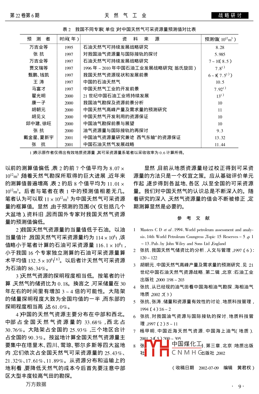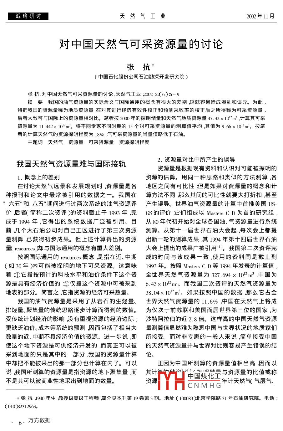 戰(zhàn)略研討天然氣工業(yè)2002年11月對中國天然氣可采資源量的討論張抗中國石化股份公司石油勘探開發(fā)研究院)張抗對中國天然氣可采資源量的討論天然氣工業(yè)20022x6)為~9摘要我國的油氣資源量的實際含義與國際通用的概念有很大的差別這就容易造成混亂和誤導(dǎo)。為此,特把我國的資源量稱為地質(zhì)資源量在對其進行經(jīng)濟有效性校正和預(yù)測采收率的校正后之所得稱為可采資源量后者大致可與國際上的資源量相對比。筆者按2000年的探明儲量和天然氣地質(zhì)資源量47.32×102m3計算其可采資源量為11.442×10}m3。將不同專家不同時期的15個對可采資源量的測算值平均其值為9.66×102m3。按筆者的計算夭然氣的資源探明程度為18%氣可采資源量的當量值略低于石油主題詞天然氣資源量可采資源量資源探明程度我國天然氣資源量難與國際接軌資源量對比中所產(chǎn)生的誤導(dǎo)資源量是根據(jù)現(xiàn)有資料和認識對可能被探明的1.概念上的差別資源的估算。用同一種思路和類似的方法測算,各在討論天然氣遠景和發(fā)展規(guī)劃時,資源量是各地區(qū)之間有可比性;但是如果對資源量的概念和計種報刊和論文中最常被引用的數(shù)據(jù)之一。我國在算方法不同那么其間的可比性就要大打折扣甚至″六五”和八五"期間進行過兩次系統(tǒng)的油氣資源評產(chǎn)生誤導(dǎo)。世界油氣資源量的計算中首推美國US-價后者簡稱二次資評)的資料截止于1993年完GS的評價它們組成以 Masters c d為首的研究組,成于1994年,它得出的系統(tǒng)數(shù)據(jù)廣泛被引用。目從80年代初開始對全球各國油、氣資源量進行系統(tǒng)前幾個大石油公司對自己工區(qū)進行了第三次資源測算。從第十一屆世界石油大會起每次會上都提量測算已獲得初步成果。但上述計算得岀的資源岀新一輪的測算成果其1994年第十四屆世界石油量 resources知與國際通用的概念有重大差別。大會上提出的成果廣被引用1我國第二次資評完按照國際通用的 resources概念是指在近、中期成的時間與該成果一致,使用的資料同是截止到〔如30年肭內(nèi)可能被探眀的地下可采資源。這意味1993年。按照 Masters c d等1994年發(fā)表的計算值著:①它指按預(yù)計的科技水平和油價條件下這個資全世界天然氣資源量為327.694×102m3,中國為源是具有經(jīng)濟價值的②僅指這個資源中可被采到6.43×102m3。而我國二次資評的天然氣資源量為地表的部分。簡言之,它指資源的經(jīng)濟可采數(shù)量。38.04×102m3。如果按照中國的數(shù)據(jù)那么它占全我國的油氣資源量是采用了從巖石的生烴量、世界天然氣資源量的11.6%,中國在天然氣上將成排烴量、聚集量的傳統(tǒng)思路逐步計算而得到的數(shù)值。為僅次于前蘇聯(lián)和美國而居世界第三位的國家為受傳統(tǒng)計劃經(jīng)濟的影響沒有重視資源的經(jīng)濟邊際,沙特阿拉伯的近2.8倍。這樣高的中國天然氣資源更缺乏油價、成本等系統(tǒng)的預(yù)測因而包括了相當大量測算值顯然難為熟悉中國與世界狀況的地質(zhì)家們數(shù)量的近、中期不具經(jīng)濟價值的資源。進一步說即所接受。而對非專家的一般人來說簡單接受中國使這個地下資源是可供經(jīng)濟開發(fā)的,而真正可以被的天然氣資源量并與世界對比則容易產(chǎn)生錯誤的結(jié)采到地面的只是其中的一部分我國的資源量計算論。中卻把不能被采出的那一部分也計算在內(nèi)了??梢哉驗橹袊鶞y算的資源量值相當高因而以說我國所測算的資源量是指資源的地下聚集量而其計i不是其可以被商業(yè)性地采出到地面的數(shù)量。資源中國煤化了與資源量的比值或稱年計天然氣氣層氣CNMHG張抗l940年生教授級高級工程師簡介見本刊第19卷第3期。地址(10∞0863吡京學(xué)院路31號石油研究院。電話(0102312963新·9第22卷第6期天然氣工業(yè)戰(zhàn)略研討溶解氣、凝析油*)的探眀儲量為1.926×10}2m3探量)而后乘以采收率而得到可采資源量值s。校正明程度僅為5.06%,待探明天然氣占全世界的時不同區(qū)域應(yīng)采用不同的的校正系數(shù)和采收率值27.31%僅次于前蘇聯(lián)而居第二位,這樣的對比可此后校正方法及所采用的校正系數(shù)賦值不斷細化能產(chǎn)生重大的誤導(dǎo)對中國天然氣資源的情況得出和完善如對探明和未探明兩類采用不同的有效性過份樂觀的推論。因而在作與世界其它地區(qū)資源校正系數(shù)前者為1后者分不同地區(qū)采用0.1~0.35量對比研究時不能使用中國計算的資源量如胡朝的值)對天然氣還應(yīng)分氣層氣和溶解氣兩類情況賦元從國外實例對比中按資源量預(yù)測我國天然氣高峰值凝析氣并入氣層氣),它們的有效性校正系數(shù)和產(chǎn)量時就說明這個資源量不能采用我國資評中給預(yù)期采收率值都不一致。在此基礎(chǔ)上采用1994年出的數(shù)字而必須采用經(jīng)濟技術(shù)可采的資源量3。的儲量值對二次資評結(jié)果校正,得出全國天然氣可在我國資源量計算中未能充分考慮到可能科技采資源量為6.737×102m6及價格水平下的經(jīng)濟邊際因而在各種參數(shù)中采用萬吉業(yè)和康一子等專家的思路大體與上者相的邊際值都過寬。以碳酸鹽巖中烴源巖的下限而同。他們在校正中不但將探明儲量和探明旳資源量論其有機碳下限多