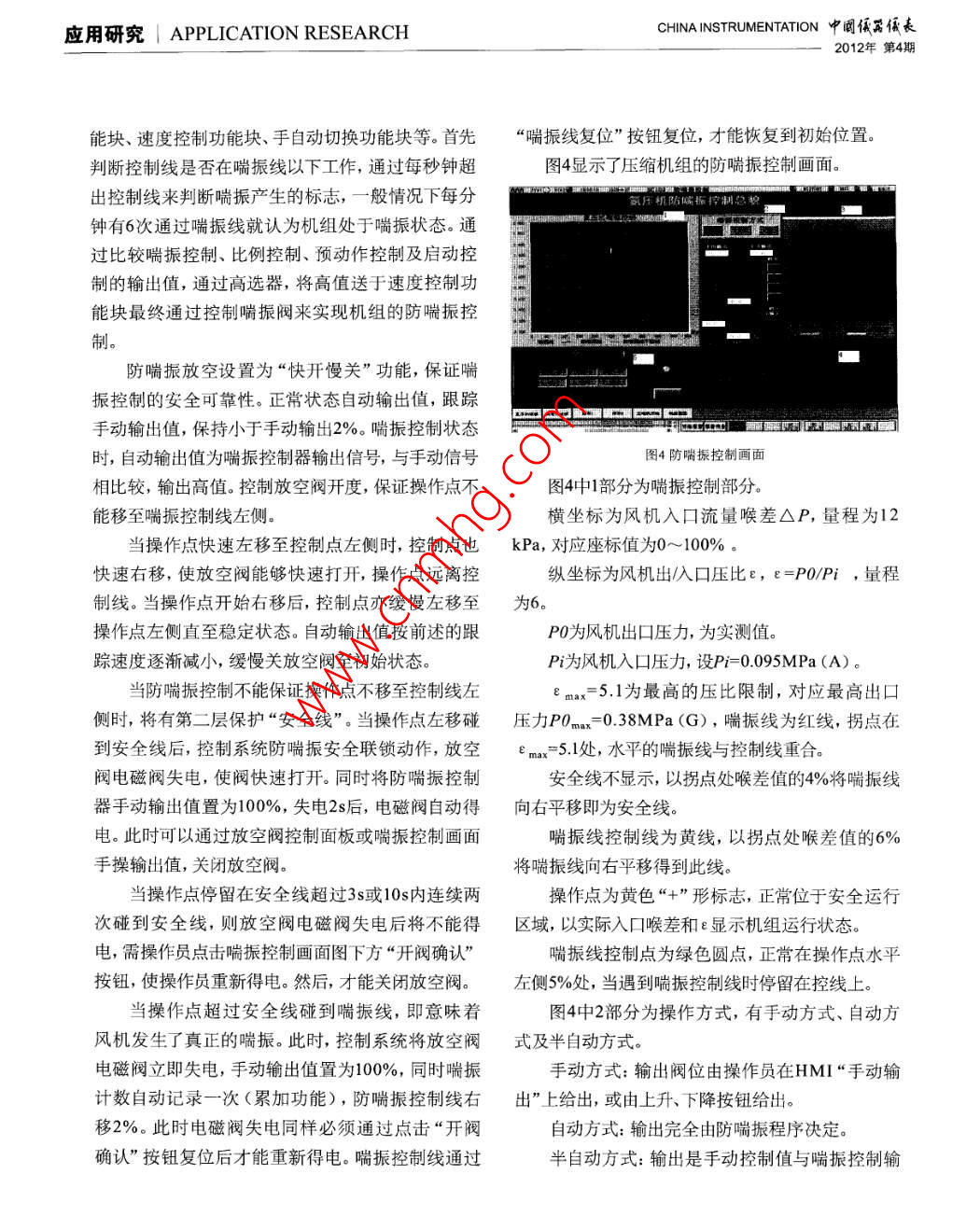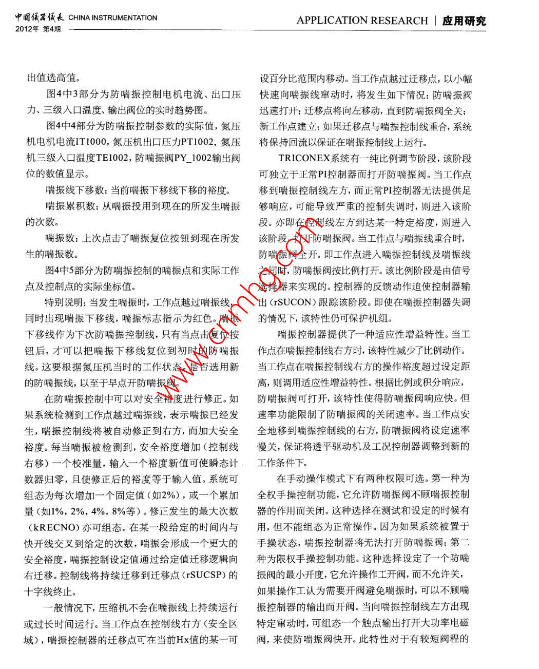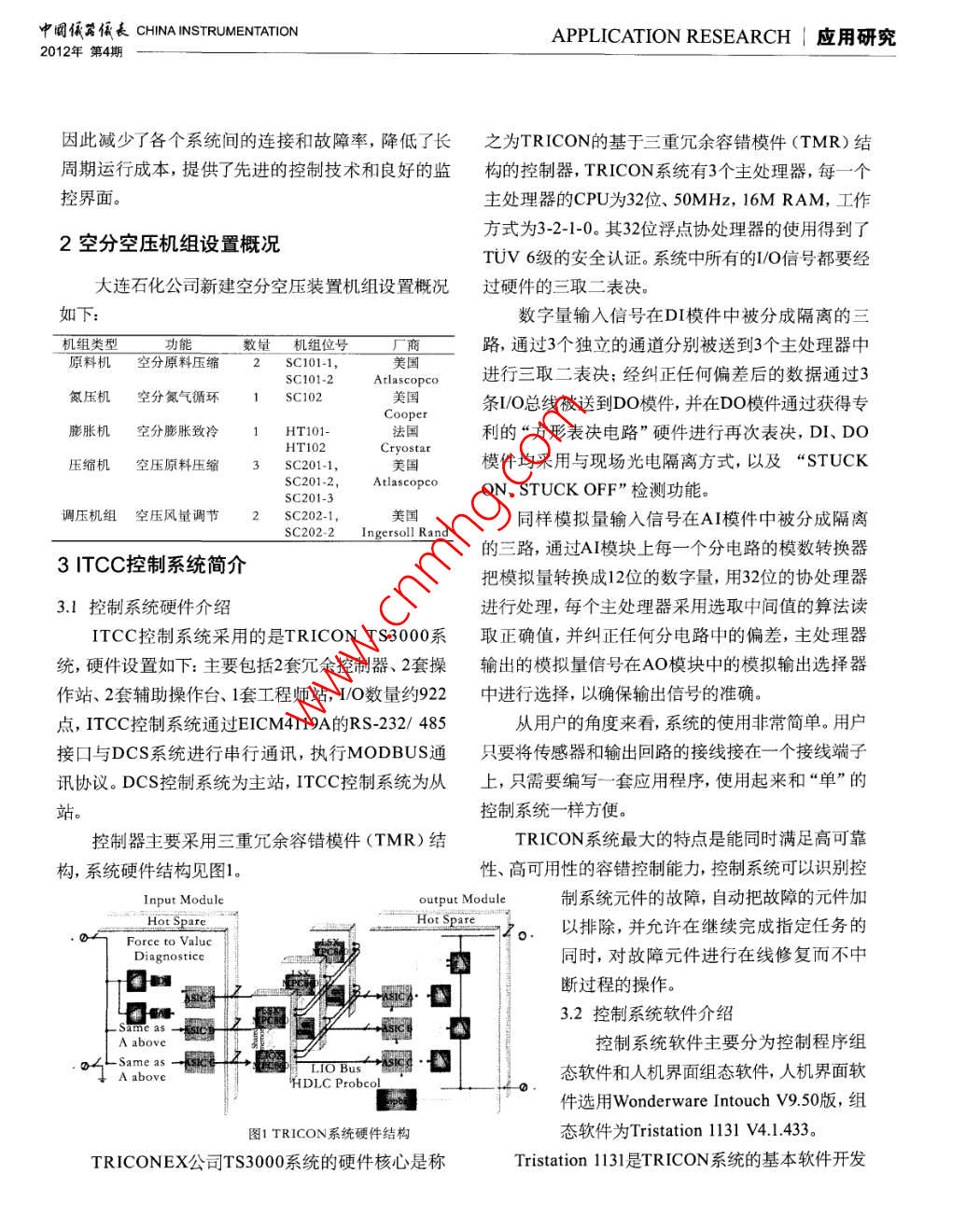 應(yīng)用研究| APPLICATION RESEARCHCHINA INSTRUMENTATION中闞露佞表2012年第4期Tcc控制系統(tǒng)在空分空壓裝置壓縮機(jī)控制中的應(yīng)用The Application of ITCC in Compresseor Control of AirSeparation and Compression Unit王強(qiáng)林唐黎鋒翻(1中國石油工程建設(shè)公司大連設(shè)計分公司,1引言遼寧大連116011壓縮機(jī)組是空分空壓裝置中主要的核心設(shè)備,2中國石油天然氣股份有限公司大連石化公大連石化新建的8000立空分空壓裝置,共有9臺離司,遼寧大連116031)心式壓縮機(jī)組、調(diào)壓機(jī)組、循環(huán)氮壓機(jī)組以及膨脹機(jī)組,其中循環(huán)氮壓機(jī)組以及膨脹機(jī)組沒有備用機(jī)摘要:中國石油大連石化公司為了提高800空分組,連續(xù)性生產(chǎn)顯得尤為重要,機(jī)組控制包括透平空壓裝置壓縮機(jī)控制水平和保護(hù)壓縮機(jī)操調(diào)速控制、防喘振控制、性能控制、負(fù)荷控制、抽氣作的安全,在該工程中設(shè)計采用了ITCC系控制、自保聯(lián)鎖控制,以往設(shè)計需要采用分立儀表統(tǒng)將壓編機(jī)防喘振調(diào)節(jié)、聯(lián)鎖自保、電子調(diào)如獨(dú)立的防喘調(diào)節(jié)器、電子調(diào)速器、負(fù)荷調(diào)節(jié)器、聯(lián)速、負(fù)荷調(diào)節(jié)于一體,經(jīng)過3年多的實(shí)踐檢鎖自保系統(tǒng)、常規(guī)PLC系統(tǒng)等實(shí)現(xiàn),而此類儀表隨驗(yàn),取得了良好的效果,該系統(tǒng)的實(shí)施對壓著長期使用,電子元件的備件和相關(guān)技術(shù)支持會逐縮機(jī)以及裝置整體安全平穩(wěn)運(yùn)行提供了有漸成為問題,最終結(jié)果就是影響機(jī)組的正常可靠運(yùn)利的保證。行,各機(jī)組控制系統(tǒng)相關(guān)軟件一般不會對用戶和維關(guān)鍵詞:壓縮機(jī)一體化控制護(hù)人員開放,成為“黑匣子”,使得用戶自動化管理受到限制,保證不了機(jī)組處于理想運(yùn)行狀態(tài)。Abstract: Dalian petrochemical company of在項(xiàng)目詳細(xì)設(shè)計初期,經(jīng)討論確定采用一套China built a set of separate and pressor air in近年來出現(xiàn)的新型的壓縮機(jī)綜合一體化控制系June2008 There are9 sets of compressors. A set統(tǒng)ITCC壓縮機(jī)組控制系統(tǒng),來實(shí)現(xiàn)對空分空壓裝inconventional of integrated turbine and compressor置壓縮機(jī)組的控制,與傳統(tǒng)的壓縮機(jī)組控制系統(tǒng)相control system was adopted in this item for the比較,它具有高可靠性、功能強(qiáng)大、組態(tài)靈活、容易higtest and best safety. In adition, the control操作等優(yōu)點(diǎn)。是集透平調(diào)速控制、防喘振控制、性能system adopts program logic system,. surge control,掉控制、負(fù)荷分配控制抽氣解耦控制、自保聯(lián)鎖、超interlock system, electrical control and load速保護(hù)控制為一體的綜合化控制系統(tǒng)。它將傳統(tǒng)上control. This system has ran for three years需要多個分立儀表實(shí)現(xiàn)的功能集成在一套可靠性極Key words: Compresseor Intergrated Control高的三重冗余容錯模件(TMR)控制系統(tǒng)中完成,中明佞露長 CHINA INSTRUMENTATIONAPPLICATION RESEARCH應(yīng)用研究2012年第4期因此減少了各個系統(tǒng)間的連接和故障率,降低了長之為 TRICON的基于三重冗余容錯模件(TMR)結(jié)周期運(yùn)行成本,提供了先進(jìn)的控制技術(shù)和良好的監(jiān)構(gòu)的控制器, TRICON系統(tǒng)有3個主處理器,每一個控界面。主處理器的CPU為32位、50MHz,16MRAM,工作2空分空壓機(jī)組設(shè)置概況方式為3-2-1-0。其32位浮點(diǎn)協(xié)處理器的使用得到了TUV6級的安全認(rèn)證。系統(tǒng)中所有的IO信號都要經(jīng)大連石化公司新建空分空壓裝置機(jī)組設(shè)置概況過硬件的三取二表決。如下:數(shù)字量輸入信號在DI模件中被分成隔離的三機(jī)組類型功能數(shù)量機(jī)組位號路,通過3個獨(dú)立的通道分別被送到3個主處理器中料機(jī)空分原料壓縮2c1011,美國SC1012Atlascopco進(jìn)行三取二表決;經(jīng)糾正任何偏差后的數(shù)據(jù)通過3氮壓機(jī)空分氮?dú)庋h(huán)1SC102美國Cooper條IO總線被送到DO模件,并在DO模件通過獲得專膨脹機(jī)空分膨脹致冷1HT101利的“方形表決電路”硬件進(jìn)行再次表決,DI、DOHT102Cryostat壓縮機(jī)空壓原料壓縮3Sc201-1,美國模件均采用與現(xiàn)場光電隔離方式,以及“ STUCKSC201-2, AtlascopcoSC201-3ON、 STUCK OFF”檢測功能。調(diào)壓機(jī)組空壓風(fēng)量調(diào)節(jié)2SC202-1,美國同樣模擬量輸入信號在AI模件中被分成隔離SC202-2 Ingersoll Rand3TCC控制系統(tǒng)簡介的三路,通過A模塊上每一個分電路的模數(shù)轉(zhuǎn)換器把模擬量轉(zhuǎn)換成12位的數(shù)字量,用32位的協(xié)處理器31控制系統(tǒng)硬件介紹進(jìn)行處理,每個主處理器采用選取中間值的算法讀ITCC控制系統(tǒng)采用的是 TRICON TS3000系取正確值,并糾正任何分電路中的偏差,主處理器統(tǒng),硬件設(shè)置如下:主要包括2套冗余控制器、2套操輸出的模擬量信號在AO模塊中的模擬輸出選擇器作站、2套輔助操作臺、1套工程師站,ⅠO數(shù)量約922中進(jìn)行選擇,以確保輸出信號的準(zhǔn)確點(diǎn),ITCC控制系統(tǒng)通過ECM4119A的RS-232/485從用戶的角度來看,系統(tǒng)的使用非常簡單。用戶接口與DCS系統(tǒng)進(jìn)行串行通訊,執(zhí)行 MODBUS通只要將傳感器和輸出回路的接線接