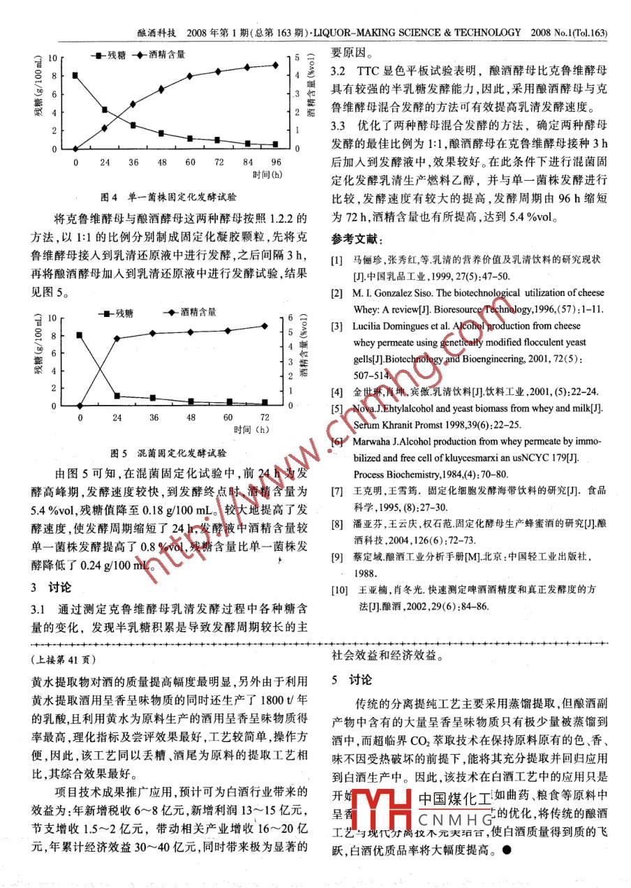 釀酒科技2008年第1期(總第163期)· LIQUOR- MAKING SCIENCE& TECHNOLOGY2008Nol(rol163)混菌固定化發(fā)酵乳清生產燃料乙醇的硏究周珺,肖冬光,郭學武,王艷(天津科技大學天津市工業(yè)微生物重點實驗室,天津300457)摘要:采用克魯維酵母和釀酒酵母混合發(fā)酵,并對混菌固定化發(fā)酵的方法進行研究。結果表明,兩種酵母發(fā)酵的最佳比例為11,釀酒酵母在克魯維酵母接種3h后加入到發(fā)酵液中;在該條件下,發(fā)酵周期由%6h減少至Th。關鍵詞:燃料乙醇;乳清;混菌;固定化酵母中圖分類號:TS262.2;TS2614;Q814文獻標識碼:A文章編號:1001-9286(2008)01-0042-03Study on Whey Fermentation by Mixed Yeast to Produce Fuel EthanolZHoU Jun, XIAO Dong-guang, GUO Xue-wu and WANG Yan(Tianjin Industrial Microbiology Key Lab, Tianjin University of Science and Technology, Tianjin, 300457, China)Abstract: Whey fermentation by mixed yeast (Kluyveromyces marxianus and Saccharomyces cerevisiae )to produce fuel ethanol was studied.The results showed that the best ratio of the two yeast was 1: l, and Saccharomyces cerevisiae was added in the fermenting solution 3 h later afterthe inoculation of Kluyveromycesnus, which could shorten fermentation time from 96 h to 72 hKey words: fuel ethanol; whey; mixed yeast; immobilized yeast乳清是生產干酪或干酪素的副產品,營養(yǎng)豐富,相1.21乳清還原液的制備(w/v)當于除去酪蛋白的脫脂乳的營養(yǎng)。目前國外乳清資源乳清粉12%,pH60;110℃,20min滅菌;初始糖度化研究較多的是利用乳清生產乳清蛋白、乳清粉、乳糖、10.2g/100mL。酒精等產品習;而國內的研究主要集中在利用乳清作122酵母細胞的固定化方法為基料生產調配型果汁乳清飲料、發(fā)酵型乳酸飲料或發(fā)將TY-13與AY-5分別經種子培養(yǎng)后,取酵母種酵型含醇飲料。1998年 Savova J首次利用乳清發(fā)酵子液與海藻酸鈉溶液混合均勻,用注射器滴入CaCl2的生產乙醇。固定化微生物可以進行高密度增殖培養(yǎng)提溶液中造粒,浸泡1h,濾出固定化顆粒,用無菌水洗滌高生物轉化速率,增加穩(wěn)定性。采用固定化、共固定化細2次,再浸泡入CaCl2溶液中進行固化,固化后用生理鹽胞生產酒精、啤酒、果酒及食醋等的研究十分盛行四。水洗滌2次備用。其中,酵母種子液、海藻酸鈉和固化劑Marwaha和 Kennedy用褐藻酸鈉和角叉膠包埋固定化CaCl2的體積比為:1:3克魯維酵母生產乙醇。經試驗發(fā)現,克魯維酵母具有較1.23酵母細胞的增殖培養(yǎng)高的乳糖酶活力,但對半乳糖的發(fā)酵速度較慢,而釀酒將制備好的固定化酵母凝膠顆粒接入到乳清還原酵母不具備乳糖酶活力,但其利用半乳糖能力較好。鑒液中,30℃活化24h。于此,本文采用混菌固定化的方法發(fā)酵乳清生產燃料乙1.24分析方法醇,有效地提高了發(fā)酵速度,縮短了發(fā)酵周期。發(fā)酵液總還原糖含量:菲林滴定法門。1材料與方法發(fā)酵液葡萄糖含量:SBA-40型多功能生物傳感儀。發(fā)酵液酒精含量:快速氧化法圓。1.1材料發(fā)酵液酵母濃度:在620nm下用分光光度法測定。菌種:克魯維酵母( Kluyveromyces marxianus)TY-發(fā)酵液乳糖及半乳糖含量:先取一定量樣液,經適13;釀酒酵母( Saccharomyces cerevisiae)AY-5。當稀釋后測定其中葡萄糖的含量(Glul)。將樣液中乳糖乳清粉:地球牌甜乳清粉,天津奧凱化工貿易有限全部酸解成為葡萄糖和半乳糖,再測定其中的葡萄糖含公司;海藻酸鈉:上?;瘜W試劑廠;氯化鈣:天津市凱通化學試劑有限公司。中國煤化工6×360.32。1.2方法CNMHG收稿日期:2007-09作者簡介:周珺(1982-),女,天津人,碩士研究生研究方向:現代釀造技術周珺,肖冬光,郭學武,王艷·混菌固定化發(fā)酵乳清生產燃料乙醇的研究半乳糖N=G-M-Ghu1。乳糖,同時乳糖被分解為葡萄糖和半乳糖,克魯維酵2結果與分析母也可以較好地利用葡萄糖,但是對半乳糖利用效果并不理想;而釀酒酵母利用葡萄糖和半乳糖能力都較21克魯維酵母發(fā)酵乳清強,可以解除半乳糖積累的問題。所以,確定合適的克以乳清還原液為發(fā)酵培養(yǎng)基,接入克魯維酵母魯維酵母和釀酒酵母的比例,對于發(fā)酵速率和酒精生(TY-13)進行發(fā)酵(20~40h為發(fā)酵高峰期)發(fā)酵過程成量是十分重要的。為考察不同比例的菌種配比對本中,定時測定其酵母生長量乳糖葡萄糖和半乳糖的變實驗的影響,以不同比例的克魯維酵母制成固定化粒化量,并在發(fā)酵結束時,測定酒精含量,結果見表1子,以10%接種量接入發(fā)酵培養(yǎng)基,30℃搖瓶發(fā)酵表1發(fā)酵過程中各種參數變化的測定(ag/100m)60h,結果見圖2。由圖2可知,當兩種酵母的比例為參數時間(h)1:1時,殘?zhí)侵递^低,為0.23g/100mL,而酒精含量較24283248607296高,達到46%Vol葡萄糖殘?zhí)恰艟凭堪肴樘?607817168.942.12210乳糖147.5134124.61119688酒精含量0D值0.1450.2060.220.5810.6080.650.705由表1中3種糖的變化可知,有半乳糖的積累現A53:1211:11:21:3m130象,葡萄糖基本上無積累。表1中酒精含量和OD值的菌株比例變化量可看出在20~40h內酵母生長較快,到達24h圖2菌株比例的確定后乳糖基本分解完畢。達9h時發(fā)酵基本結束發(fā)酵液232兩種酵母加入時間間隔的確定酒精含量為41%Vol為了提高酵母的利用率,進行了兩種酵母加入時間22混合菌發(fā)酵菌株的確定間隔試驗,比較兩種酵母加入的最適間隔時間,結果見在以半乳糖為唯一碳源的TTC平板上,分別點接圖3克魯維酵母A、釀酒酵母B與奶酒酵母C,鑒別它們利用半乳糖的能力由顯色反應可以看出釀酒