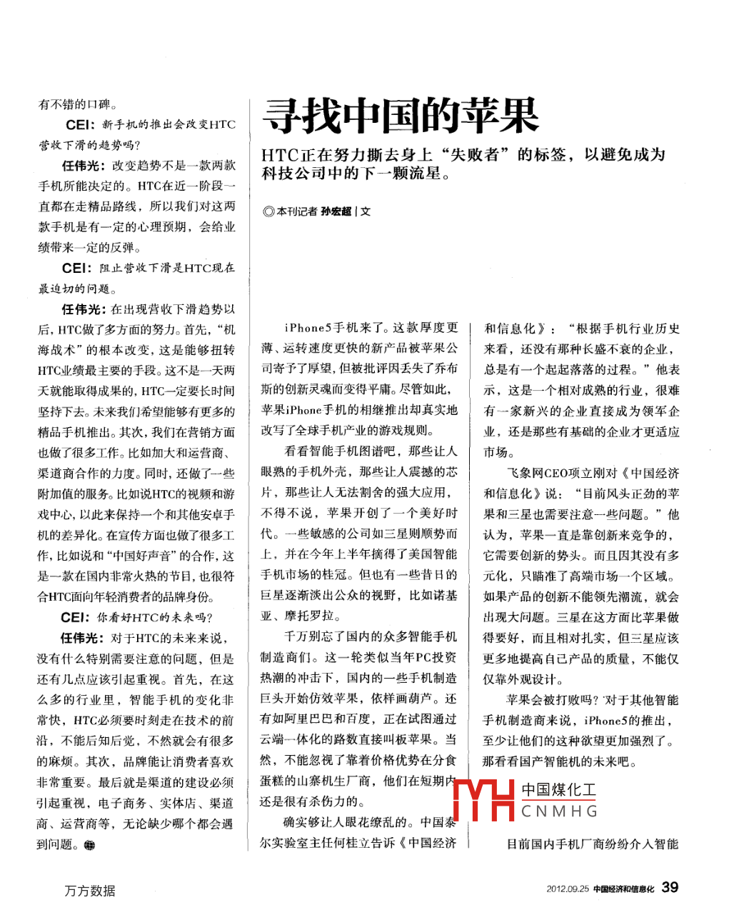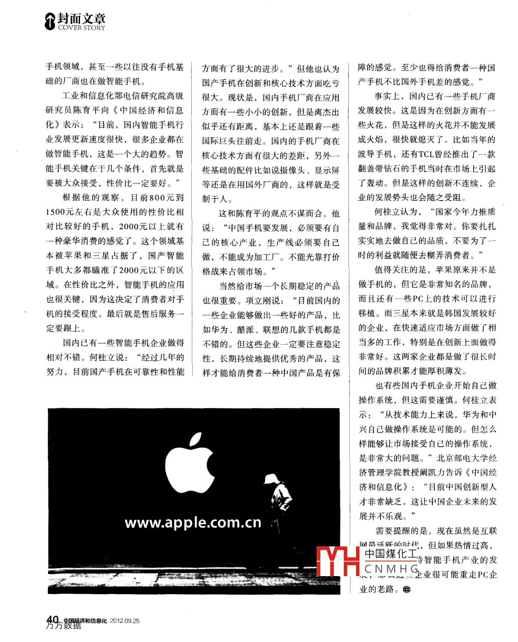 有不錯的口碑。CEl:新手機的推出會改變HTC尋找中國的蘋果營收下滑的趨勢嗎?任偉光:改變趨勢不是一款兩款HTC正在努力撕去身上“失敗者”的標(biāo)簽,以避免成為手機所能決定的。HTC在近一階段一科技公司中的下一顆流星。直都在走精品路線,所以我們對這兩本刊記者孫宏超|文款手機是有一定的心理預(yù)期,會給業(yè)績帶來一定的反彈。CE:阻止?fàn)I收下滑是HTC現(xiàn)在最迫切的問題任偉光:在出現(xiàn)營收下滑趨勢以后,HTC做了多方面的努力。首先,“機i Phone5手機來了。這款厚度更|和信息化》:“根據(jù)手機行業(yè)歷史海戰(zhàn)術(shù)”的根本改變,這是能夠扭轉(zhuǎn)薄、運轉(zhuǎn)速度更快的新產(chǎn)品被蘋果公來看,還沒有那種長盛不衰的企業(yè),HTC業(yè)績最主要的手段。這不是一天兩司寄予了厚望但被批評因丟失了喬布總是有一個起起落落的過程?!彼硖炀湍苋〉贸晒?HTC一定要長時間斯的創(chuàng)新靈魂而變得平庸。盡管如此,示,這是一個相對成熟的行業(yè),很難堅持下去。未來我們希望能夠有更多的蘋果 Phone手機的相繼推出卻真實地有一家新興的企業(yè)直接成為領(lǐng)軍企精品手機推出。其次,我們在營銷方面改寫了全球手機產(chǎn)業(yè)的游戲規(guī)則。業(yè),還是那些有基礎(chǔ)的企業(yè)才更適應(yīng)也做了很多工作。比如加大和運營商看看智能手機圖譜吧,那些讓人市場。渠道商合作的力度。同時,還做了一些眼熟的手機外殼,那些讓人震撼的芯飛象網(wǎng)CEO項立剛對《中國經(jīng)濟附加值的服務(wù)。比如說HTC的視頻和游片,那些讓人無法割舍的強大應(yīng)用,和信息化》說:“目前風(fēng)頭正勁的蘋戲中心,以此來保持一個和其他安卓手不得不說,蘋果開創(chuàng)了一個美好時果和三星也需要注意一些問題。”他機的差異化。在宣傳方面也做了很多工代。一些敏感的公司如三星則順勢而認(rèn)為,蘋果一直是靠創(chuàng)新來競爭的,作比如說和“中國好聲窨”的合作,這上,并在今年上半年摘得了美國智能它需要創(chuàng)新的勢頭。而且因其沒有多是一款在國內(nèi)非?;馃岬墓?jié)目,也很符手機市場的桂冠。但也有一些昔日的元化,只瞄準(zhǔn)了高端市場一個區(qū)域合HTC面向年輕消費者的品牌身份。巨星逐漸淡出公眾的視野,比如諾基如果產(chǎn)品的創(chuàng)新不能領(lǐng)先潮流,就會cE|:你看好HTC的未來嗎?亞、摩托羅拉。出現(xiàn)大問題。三星在這方面比蘋果做任偉光:對于HTC的未來來說千萬別忘了國內(nèi)的眾多智能手機得要好,而且相對扎實,但三星應(yīng)該沒有什么特別需要注意的問題,但是制造商們。這一輪類似當(dāng)年P(guān)C投資更多地提高自己產(chǎn)品的質(zhì)量,不能僅還有幾點應(yīng)該引起重視。首先,在這熱潮的沖擊下,國內(nèi)的一些手機制造僅靠外觀設(shè)計。么多的行業(yè)里,智能手機的變化非巨頭開始仿效蘋果,依樣畫葫蘆。還蘋果會被打敗嗎?對于其他智能???HTC必須要時刻走在技術(shù)的前有如阿里巴巴和百度,正在試圖通過手機制造商來說, iPhone5的推出沿,不能后知后覺,不然就會有很多云端一體化的路數(shù)直接叫板蘋果。當(dāng)至少讓他們的這種欲望更加強烈了。的麻煩。其次,品牌能讓消費者喜歡然,不能忽視了靠著價格優(yōu)勢在分食那看看國產(chǎn)智能機的未來吧。非常重要。最后就是渠道的建設(shè)必須蛋糕的山寨機生廠商,他們在短期中國煤化工引起重視,電子商務(wù)、實體店、渠道還是很有殺傷力的。CNMHG商、運營商等,無論缺少哪個都會遇確實夠讓人眼花繚亂的。中國到問題。爾實驗室主任何桂立告訴《中國經(jīng)濟目前國內(nèi)手機廠商紛紛介入智能20120925中國經(jīng)濟和信息化39封面文章COVER STORY手機領(lǐng)域,甚至一些以往沒有手機基|方面有了很大的進步。”但他也認(rèn)為|障的感覺。至少也得給消費者一種國礎(chǔ)的廠商也在做智能手機。國產(chǎn)手機在創(chuàng)新和核心技術(shù)方面吃虧產(chǎn)手機不比國外手機差的感覺?!惫I(yè)和信息化部電信研究院高級很大?,F(xiàn)狀是,國內(nèi)手機廠商在應(yīng)用事實上,國內(nèi)已有一些手機廠商研究員陳育平向《中國經(jīng)濟和信息方面有一些小小的創(chuàng)新,但是離杰出發(fā)展較快。這是因為在創(chuàng)新方面有化)表示:“目前,國內(nèi)智能手機行似乎還有距離,基本上還是跟著一些些火花,但是這樣的火花并不能發(fā)展業(yè)發(fā)展更新速度很快,很多企業(yè)都在國際巨頭往前走。國內(nèi)的手機廠商在成火焰,很快就熄滅了。比如當(dāng)年的做智能手機,這是一個大的趨勢。智核心技術(shù)方面有很大的差距,另外一波導(dǎo)手機,還有TCL曾經(jīng)推出了一款能手機關(guān)鍵在于幾個條件,首先就是些基礎(chǔ)的配件比如說攝像頭、顯示屏翻蓋帶鉆石的手機當(dāng)時在市場上引起要被大眾接受,性價比一定要好。”等還是在用國外廠商的,這樣就是受了轟動。但是這樣的創(chuàng)新不連續(xù),企根據(jù)他的觀察,目前800元到制于人業(yè)的發(fā)展勢頭也會隨之受阻。1500元左右是大眾使用的性價比相這和陳育平的觀點不謀而合。他何桂立認(rèn)為,“國家今年力推質(zhì)對比較好的手機,2000元以上就有說:“中國手機要發(fā)展,必須要有自量和品牌,我覺