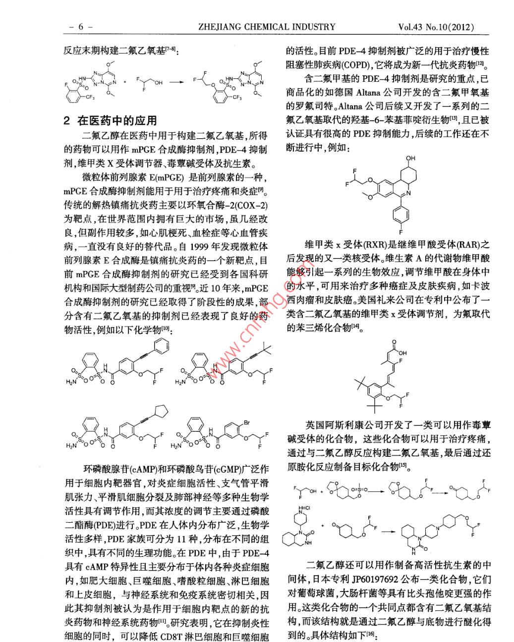 《浙江化工》2012年第43卷第10期章編號:10064184(2012)100005-0第化2,2-二氟乙醇的應(yīng)用蔣強李華徐衛(wèi)國陳忠民戴佳亮楊汪松(浙江省化工研究院有限公司,浙江杭州310023)摘要:綜述了22一二氟乙醇的性質(zhì),并討論了在農(nóng)藥、醫(yī)藥,含氟聚合物等中的應(yīng)用,同時分析了一些含2,2-二氟乙氧基化合物的特性及應(yīng)用。關(guān)鍵詞:2,2-二氟乙醉;二氟乙氧基;特性;應(yīng)用2,2-二氟乙醇(以下簡稱二氟乙醇)是重要含氟前稻田用除草劑中殺草譜最廣的品種。精細化學(xué)品之一,分子式為C2HF2O,CAS號:359五氟磺草胺屬于三唑并嘧啶磺酰胺類除草劑,13-7常溫下為無色液體,沸點96℃,熔點-28℃,通過抑制乙酰乳酸合成酶(AS而起作用。2004年相對密度1296,折射率134其酸性與苯酚相當,9月24日在美國EPA正式注冊登記,2005年在美溶于水、酸、乙醇、乙醚等。二氟乙醇性質(zhì)穩(wěn)定,蒸餾國南部稻區(qū)推廣應(yīng)用,2008年在中國登記,目前在時不分解。二氟乙醇有很多化學(xué)性質(zhì)與乙醇類似,我國登記的劑型為25%的油懸浮劑。其羥基能發(fā)生與乙醇羥基類似的化學(xué)反應(yīng),可以通五氟磺草胺能被土壤迅速吸附,但不會長期滯過醚化、酯化等反應(yīng)合成二氟乙氧基。二氟乙醇可留在土壤中。它能被光解和微生物降解,對水生生由2,2-二氯乙醇與氟化鉀在高沸點乙二醇類溶劑物毒害低,屬于高效低毒的新型農(nóng)藥。五氟磺草胺中反應(yīng)制得,亦可由二氟乙酰鹵還原得到由于二還能和一系列的除草劑復(fù)配使用,如殺草丹、殺草氟乙醇含有二氟甲基的特殊結(jié)構(gòu),被廣泛的用于農(nóng)隆、解草胺、解草惡唑和解草腈等q。藥領(lǐng)域,醫(yī)藥領(lǐng)域及含氟聚合物中五氟磺草胺中的二氟乙氧基可以在反應(yīng)末期1在農(nóng)藥中的應(yīng)用構(gòu)建也可以在反應(yīng)中構(gòu)建。二氟乙醇在農(nóng)藥中主要用于合成五氟磺草胺。反應(yīng)中構(gòu)建二氟乙氧基q五氟磺草胺是由美國陶氏溢農(nóng)公司開發(fā)的廣譜除草劑,主要用于水稻除草??捎行Х莱薏荨⑶Ы鹱右约耙荒晟菘齐s草,并對眾多闊葉雜草有效,如沼生異蕊花、鯉腸、田菁、竹節(jié)花、鴨舌草等。同時,其亦可防除稻田中的抗芐嘧磺隆雜草。有效期長達30~60d,一次用藥能基本控制全季雜草危害,是目ZHEJIANG CHEMICAL INDUSTRY Vol43 No10(2012)反應(yīng)末期構(gòu)建二氟乙氧基副的活性。目前PDE4抑制劑被廣泛的用于治療慢性阻塞性肺疾病(COPD),它將成為新一代抗炎藥物嗎。含二氟甲基的PDE4抑制劑是研究的重點,已商品化的如德國 Altana公司開發(fā)的含二氟甲氧基的羅氟司特。 Altana公司后續(xù)又開發(fā)了一系列的二2在醫(yī)藥中的應(yīng)用氟乙氧基取代的羥基-6-苯基菲啶衍生物嗎,且已被二氟乙醇在醫(yī)藥中用于構(gòu)建二氟乙氧基,所得認證具有很高的PDE抑制能力后續(xù)的工作還在不的藥物可以用作mPGE合成酶抑制劑,PDE4抑制斷進行中例如:劑維甲類X受體調(diào)節(jié)器、毒蕈堿受體及抗生素。微粒體前列腺素 E(mPGE)是前列腺素的一種mPGE合成酶抑制劑能用于用于治療疼痛和炎癥陰傳統(tǒng)的解熱鎮(zhèn)痛抗炎藥主要以環(huán)氧合酶-2(COX-2)為靶點,在世界范圍內(nèi)擁有巨大的市場,雖幾經(jīng)改良,但副作用較多,如心肌梗死、血栓癥等心血管疾病,一直沒有良好的替代品。自1999年發(fā)現(xiàn)微粒體維甲類x受體RXR)是繼維甲酸受體RAR)之前列腺素E合成酶是鎮(zhèn)痛抗炎藥的一個新靶點目后發(fā)現(xiàn)的又一類核受體維生素A的代謝物維甲酸前mPGE合成酶抑制劑的研究已經(jīng)受到各國科研能夠引起一系列的生物效應(yīng),調(diào)節(jié)維甲酸在身體中機構(gòu)和國際大型制藥公司的重視近10年來,mPGE的水平,可用來治療多種癌癥及皮膚疾病,如卡波合成酶抑制劑的研究已經(jīng)取得了階段性的成果,部西肉瘤和皮膚癌美國禮來公司在專利中公布了分含有二氟乙氧基的抑制劑已經(jīng)表現(xiàn)了良好的藥類含二氟乙氧基的維甲類x受體調(diào)節(jié)劑,為氟取代物活性例如以下化學(xué)物叫的苯三烯化合物嗎。英國阿斯利康公司開發(fā)了一類可以用作毒蕈堿受體的化合物,這些化合物可以用于治療疼痛,通過與二氟乙醇反應(yīng)構(gòu)建二氟乙氧基,最后通過還環(huán)磷酸腺苷(cAMP和環(huán)磷酸鳥苷(cCMP廣泛作原胺化反應(yīng)制備目標化合物嗎。用于細胞內(nèi)靶器官,對炎癥細胞活性、支氣管平滑肌張力平滑肌細胞分裂及肺部神經(jīng)等多種生物學(xué)6活性具有調(diào)節(jié)作用,而其濃度的調(diào)節(jié)主要通過磷酸二酯酶PDE進行。PDE在人體內(nèi)分布廣泛,生物學(xué)活性多樣,PDE家族可分為11種,分布在不同的組織中,具有不同的生理功能。在PDE中,由于PDE4具有cAMP特異性且主要分布于體內(nèi)各種炎癥細胞二氟乙醇還可以用作制備高活性抗生素的中內(nèi),如肥大細胞、巨噬細胞、嗜酸粒細胞、淋巴細胞間體,日本專利P60197692公布一類化合物它們和上皮細胞,與神經(jīng)系統(tǒng)和免疫系統(tǒng)密切相關(guān),因?qū)ζ咸亚蚓竽c桿菌等具有比頭孢他啶更強的作此其抑制劑被認為是作用于細胞內(nèi)靶點的新的抗用。這類化合物的一個共同點都含有二氟乙氧基結(jié)炎藥物和神經(jīng)系統(tǒng)藥物叫研究表明,它在抑制炎性構(gòu)