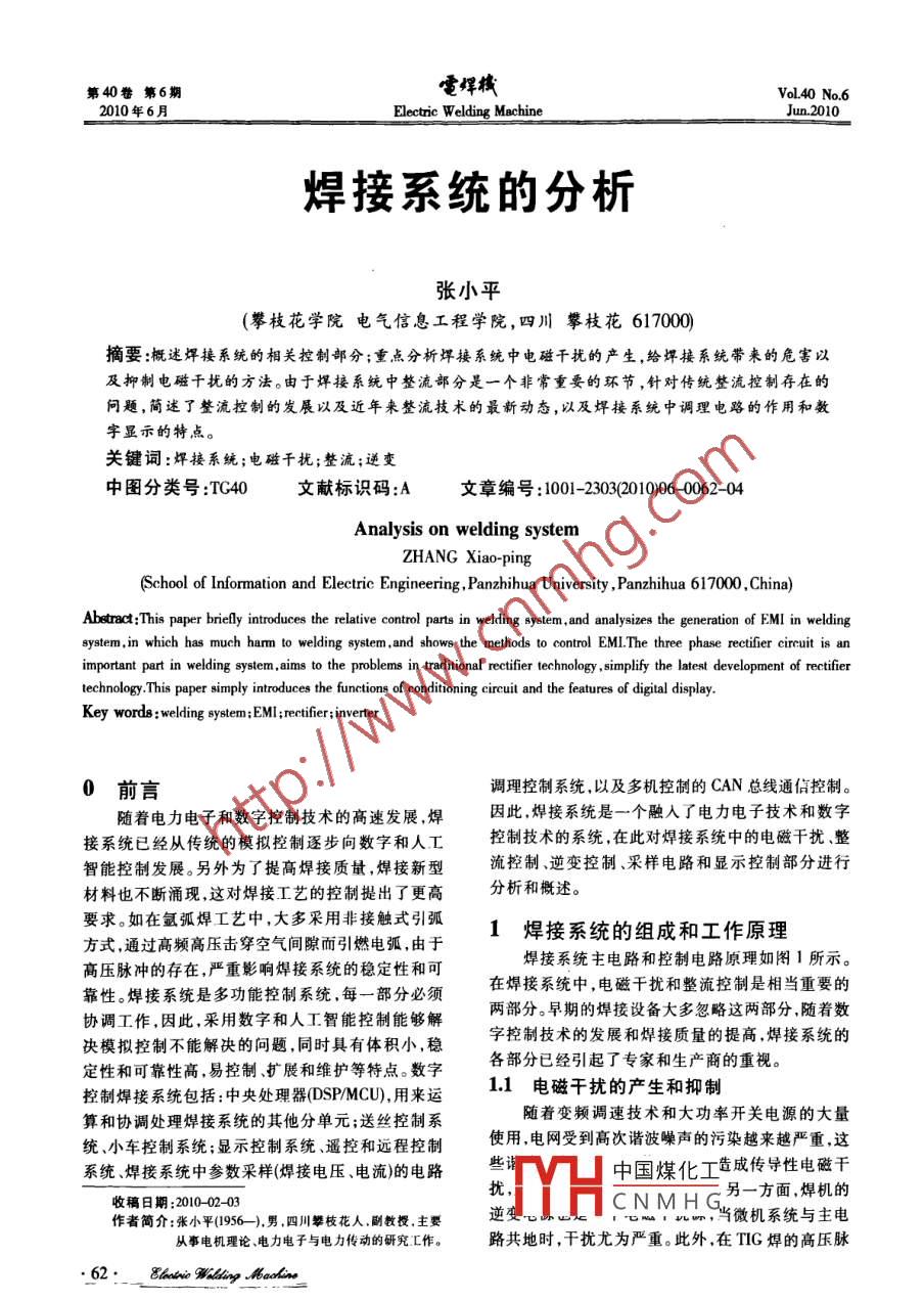 .第40卷第6期電焊棧Vol.40 No.62010年6月Electric Welding MachineJun.2010焊接系統(tǒng)的分析張小平(攀枝花學(xué)院電氣信息工程學(xué)院,四川攀枝花617000)摘要:概述焊接系統(tǒng)的相關(guān)控制部分;重點(diǎn)分析焊接系統(tǒng)中電磁干擾的產(chǎn)生,給焊接系統(tǒng)帶來(lái)的危害以及抑制電磁干擾的方法。由于焊接系統(tǒng)中整流部分是一個(gè)非常重要的環(huán)節(jié),針對(duì)傳統(tǒng)整流控制存在的問(wèn)題,簡(jiǎn)述了整流控制的發(fā)展以及近年來(lái)整流技術(shù)的最新動(dòng)態(tài),以及焊接系統(tǒng)中調(diào)理電路的作用和數(shù)字顯示的特點(diǎn)。關(guān)鍵詞:焊接系統(tǒng);電磁干擾;整流;逆變中圖分類(lèi)號(hào):TC40文獻(xiàn)標(biāo)識(shí)碼:A文章編號(hào):1001-2303(2010)06 -0062 -04Analysis on welding systemZHANG Xiao-ping(School of Information and Electric Engineering , Panzhihua University , Panzhihua 617000 ,China)Abetract:This paper briely intoduces the relative control parts in welding system, and analyies the generation of EMI in weldingsystem,in which has much hamm to welding 8ystem . and shows the methods to control EMI.The three phase rectifer cireuit is animportant part in welding system .aims to the problems in traditional rectifer technology ,simplify the latest development of rectifiertechnology.This paper simply intoduces the functions of conditioning circuit and the features of digital display.Key words :welding system;EMrecifer:inverter0前言調(diào)理控制系統(tǒng),以及多機(jī)控制的CAN總線通信控制。隨著電力電子和數(shù)字控制技術(shù)的高速發(fā)展,焊因此,焊接系統(tǒng)是一個(gè)融入了電力電子技術(shù)和數(shù)字接系統(tǒng)已經(jīng)從傳統(tǒng)的模擬控制逐步向數(shù)字和人工控制技術(shù)的系統(tǒng),在此對(duì)焊接系統(tǒng)中的電磁干擾、整智能控制發(fā)展。另外為了提高焊接質(zhì)量,焊接新型流控制.逆變控制、采樣電路和顯示控制部分進(jìn)行材料也不斷涌現(xiàn),這對(duì)焊接工藝的控制提出了更高分析和概述。要求。如在氬弧焊工藝中,大多采用非接觸式引弧1焊接系統(tǒng)的組成和工作原理方式,通過(guò)高頻高壓擊穿空氣間隙而引燃電弧,由于高壓脈沖的存在,嚴(yán)重影響焊接系統(tǒng)的穩(wěn)定性和可焊接系統(tǒng)主電路和控制電路原理如圖1所示。靠性。焊接系統(tǒng)是多功能控制系統(tǒng),每一部分必須在焊接系統(tǒng)中,電磁干擾和整流控制是相當(dāng)重要的協(xié)調(diào)工作,因此,采用數(shù)字和人工智能控制能夠解兩部分。早期的焊接設(shè)備大多忽略這兩部分,隨著數(shù)決模擬控制不能解決的問(wèn)題,同時(shí)具有體積小,穩(wěn)字控制技術(shù)的發(fā)展和焊接質(zhì)量的提高,焊接系統(tǒng)的定性和可靠性高.易控制、擴(kuò)展和維護(hù)等特點(diǎn)。數(shù)字各部分已經(jīng)引起了專(zhuān)家和生產(chǎn)商的重視??刂坪附酉到y(tǒng)包括:中央處理器(DSP/MCU),用來(lái)運(yùn)1.1電磁干擾的產(chǎn)生和抑制算和協(xié)調(diào)處理焊接系統(tǒng)的其他分單元;送絲控制系隨著變頻調(diào)速技術(shù)和大功率開(kāi)關(guān)電源的大量.統(tǒng),小車(chē)控制系統(tǒng);顯示控制系統(tǒng)、遙控和遠(yuǎn)程控制使用,電網(wǎng)受到高次諧波噪聲的污染越來(lái)越嚴(yán)重,這系統(tǒng)焊接系統(tǒng)中參數(shù)采樣(焊接電壓、電流)的電路中國(guó)煤化工造成傳導(dǎo)性電磁干擾,另一方面,焊機(jī)的收稿日期:2010-02-03逆TYHCNMHG微機(jī)系統(tǒng)與主電作者簡(jiǎn)介:張小平(1956-),男,四川攀枝花人.副教授,主要從事電機(jī)理論電力電子與電力傳動(dòng)的研究工作。路共地時(shí),干擾尤為嚴(yán)重。此外,在TIG焊的高樂(lè)脈.62:_ Ehatis Willing Molin研究與設(shè)計(jì)張小平:焊接系統(tǒng)的分析第6期焊條電弧燜輸出模仍然是不可能的,這方面的研究也是最欠缺的。IF輸出TIG輸出現(xiàn)在焊接系統(tǒng)中首要的是做好接地.屏蔽保護(hù)。另外r變困一整流一濾波一在主電源進(jìn)線處加濾波器(差模、共模),也就是EMI輸人r電話(huà)國(guó)團(tuán)團(tuán)一-謎波一-選變一-空困-整國(guó)濾波器。EMI濾波器的設(shè)計(jì)應(yīng)根據(jù)焊接系統(tǒng)的工作速波狀況進(jìn)行機(jī)理分析和建模,然后對(duì)其抑制,如根據(jù)測(cè)焊條電弧燁輸it試的EMI干擾程度計(jì)算出差模、共模方案參數(shù)的計(jì)TIC輸出算確定。最終設(shè)計(jì)出EMI濾波裝置"。[觸發(fā)馭動(dòng)一r -控制歌動(dòng)設(shè)計(jì)了光電隔離和電平轉(zhuǎn)換電路。CPU的串行鍵盤(pán)焊接電壓通信接口通過(guò)光電隔離,與通信接口在地線上進(jìn)行(參數(shù)設(shè)定)卜中央處理單元樣一焊接電流分離,減少外界信號(hào)對(duì)微機(jī)系統(tǒng)的干擾,由CPU輸DSP調(diào).電網(wǎng)電壓出的信號(hào)幅值為+5V,通過(guò)電平變換,將傳輸?shù)男臗AN總線)-溫度號(hào)電壓升至+25V,這樣即使在傳輸過(guò)程中信號(hào)受到液品顯示故障及運(yùn)(參數(shù)設(shè)定。|行指小燈干擾.也可以在接收端通過(guò)數(shù)字濾波將干擾濾除;另及運(yùn)行顯利外,隔離焊炬操作電路,TIG焊的起動(dòng)和停止都是由圖1焊接系統(tǒng)主電路和控制電路框團(tuán)焊炬上的控制開(kāi)關(guān)操作的,而在高壓脈沖引弧過(guò)程沖引弧