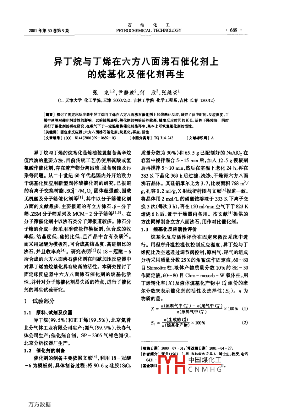 石油化工2001年第30卷第9期PETROCHEMICAL TECHNOLOGY異丁烷與丁烯在六方八面沸石催化劑上的烷基化及催化劑再生張龍2,尹靜波2,何欣2,張繼炎L(1.天津大學(xué)化工學(xué)院天津300072;2.吉林工學(xué)院化學(xué)工程系吉林長(zhǎng)春130012)要]探討了固定床反應(yīng)器中異丁烷與丁烯在六方八面沸石催化劑上的烷基化反應(yīng)研究了反應(yīng)時(shí)間反應(yīng)溫度、丁烯空速等對(duì)催化劑活性的影響。試驗(yàn)結(jié)果表明,催化劑的初始活性較高,隨著反應(yīng)時(shí)間的延長(zhǎng),活性下降較快。同時(shí)進(jìn)行了催化劑的再生研究在載氣下于一定溫度將催化劑熱再生,基本上可恢復(fù)催化劑的活性。[關(guān)詞]固定床反應(yīng)器;六方八面沸石催化劑;烷基化;再生活性[文章編號(hào)]1000-8144(2001)09-0689-03中圖分類(lèi)號(hào)]TQ314.24文獻(xiàn)標(biāo)識(shí)碼]A異丁烷與丁烯的烷基化是煉油裝置制備高辛烷質(zhì)量分?jǐn)?shù)為30%)和655g已配制好的NaAO2在值汽油的重要方法,目前傳統(tǒng)工藝仍使用硫酸或氫容器中攪拌混合5~15min后,加入125g模板劑氟酸作催化劑存在著產(chǎn)物分離困難設(shè)備腐蝕及污后再攪拌5~10min,然后在室溫下老化24h,再在染等問(wèn)題。從二十世紀(jì)60年代起國(guó)內(nèi)外開(kāi)始致力383K下晶化360h后過(guò)濾洗滌、干燥得六方八面于烷基化反應(yīng)用新型固體酸催化劑的研究,已報(bào)道沸石晶體。其硅鋁摩爾比為37比表面積768m2/的有離子交換樹(shù)脂SG^O固體超強(qiáng)酸、固載g,孔容0.2ml/g,X射線衍射圖與文獻(xiàn)4報(bào)道一致無(wú)機(jī)酸及分子篩催化劑等,其中以分子篩催化劑將晶體用2mL的硝酸銨溶液于33K下離子交方面的文獻(xiàn)最多,主要報(bào)道的有立方沸石-分子換3次(每次3h),再在150ml/min空氣下于823K篩ZSM分子篩系列及MCM-2分子篩等13。在焙燒6h后,置于干燥器內(nèi)備用。按文獻(xiàn)(提供的分子篩催化劑中以沸石類(lèi)分子篩報(bào)道較多。沸石分方法同樣制備立方八面沸石,用作對(duì)比催化劑子篩的合成一般采用季銨鹽作模板劑,但合成的收1.3烷基化反應(yīng)活性評(píng)價(jià)率低結(jié)晶度低,硅鋁比低,且產(chǎn)品中含有雜質(zhì)4]。烷基化反應(yīng)活性評(píng)價(jià)在固定床微反系統(tǒng)中進(jìn)而采用冠為模板劑,可合成高結(jié)晶度高硅鋁比的行。用程序升溫控溫儀控制反應(yīng)溫度,異丁烷與丁沸石并且收率高。研究表明以18-冠醚-6烯配比及空速通過(guò)調(diào)節(jié)閥控制原料氣、尾氣的組成所合成的六方八面沸石催化劑在間歇加壓反應(yīng)器中分析采用質(zhì)量分?jǐn)?shù)25%的角鯊?fù)樽鞴潭ㄒ?60對(duì)異丁烯的烷基化具有較高的活性。本研究探討了目 Shimolite柱,液體產(chǎn)物質(zhì)量分?jǐn)?shù)10%的SE-30固定床反應(yīng)器中六方八面沸石催化劑的烷基化活作固定液60-80目Ch-moob-w載體柱,用性并針對(duì)分子篩催化劑易失活的特點(diǎn)進(jìn)行了催化丁烯轉(zhuǎn)化率(X)及液體烷基化產(chǎn)物中(組份的摩劑的再生試驗(yàn)研究。爾分?jǐn)?shù)來(lái)表示催化劑的活性及選擇性(S0)。n為1試驗(yàn)部分物質(zhì)的量X-x(原料氣中C)二(尾氣中C)x100%(1)1.1原料、試劑及儀器異丁烷(99.5%)和正丁烯(99.5%),北京氮普s0=m(生成的C8)、×100%(2)北分氣體工業(yè)有限公司生產(chǎn);氮?dú)?99.9%),長(zhǎng)春氣體公司生產(chǎn);催化劑自制。SP-2305氣相色譜儀,北京分析儀器廠生產(chǎn)。12催化劑的制備[收稿日期]2000-07-31:[修改稿日期】2001-04-27。男吉林雀農(nóng)安具人.攛士生,教授,電話催化劑的制備主要依據(jù)文獻(xiàn)(4,利用18-冠醚[作者簡(jiǎn)介0431-中國(guó)煤化工6為模板劑具體制備過(guò)程將90.6g硅膠(SiO2[金項(xiàng)目CNMH石油化工690PETROCHEMICAL TECHNOL001年第30卷14催化劑的再生表3丁烯空速對(duì)催化劑活性的影響催化劑的再生與活性評(píng)價(jià)在同一裝置上進(jìn)行??账賖10.51.02.05.07.010.0將失活的催化劑在高溫下通入載氣進(jìn)行處理通過(guò)X%96.09.4男.891.09.694改變?cè)偕鷹l件觀察催化劑活性的恢復(fù)情況。S0/%53.8521.5催化劑的物性測(cè)定從表3可見(jiàn),隨著丁烯空速的增大,丁烯轉(zhuǎn)化率采用ST-03表面測(cè)定儀測(cè)定催化劑的比表面變化不大。而Q的選擇性卻逐步減小。這是由于積和孔容;采用IR測(cè)定催化劑的酸中心的性質(zhì);采在烷基化反應(yīng)過(guò)程中,存在著丁烯的低聚副反應(yīng)與用核磁共振、譜儀測(cè)定失活催化劑上積炭成份:采用之相競(jìng)爭(zhēng),當(dāng)丁烯空速增大后,體系中丁烯的濃度增X射線行射儀測(cè)定催化劑的結(jié)構(gòu)。加,且丁烯在分子篩催化劑上的吸附要優(yōu)先于異丁烷,這兩種因素均導(dǎo)致體系中丁烯低聚反應(yīng)發(fā)生程2結(jié)果與討論度逐漸增大,因而目的產(chǎn)物的選擇性逐漸變小。21反應(yīng)條件對(duì)催化劑活性的影響2.1.4兩種沸石烷基化活性的比較2.1.1反應(yīng)時(shí)間在反應(yīng)溫度353K、反應(yīng)壓力101.3kPa、丁烯在反應(yīng)溫度353K、丁烯空速0.5h-1催化劑空速05h的條件下,以立方八面沸石為催化劑,裝添量10g及反應(yīng)壓力101.3kPa下,反應(yīng)時(shí)間對(duì)裝添量為1.0g,反應(yīng)時(shí)間對(duì)催化劑活性的影響見(jiàn)表丁烯轉(zhuǎn)化率及(8選擇性的影響見(jiàn)表1。4。將表
