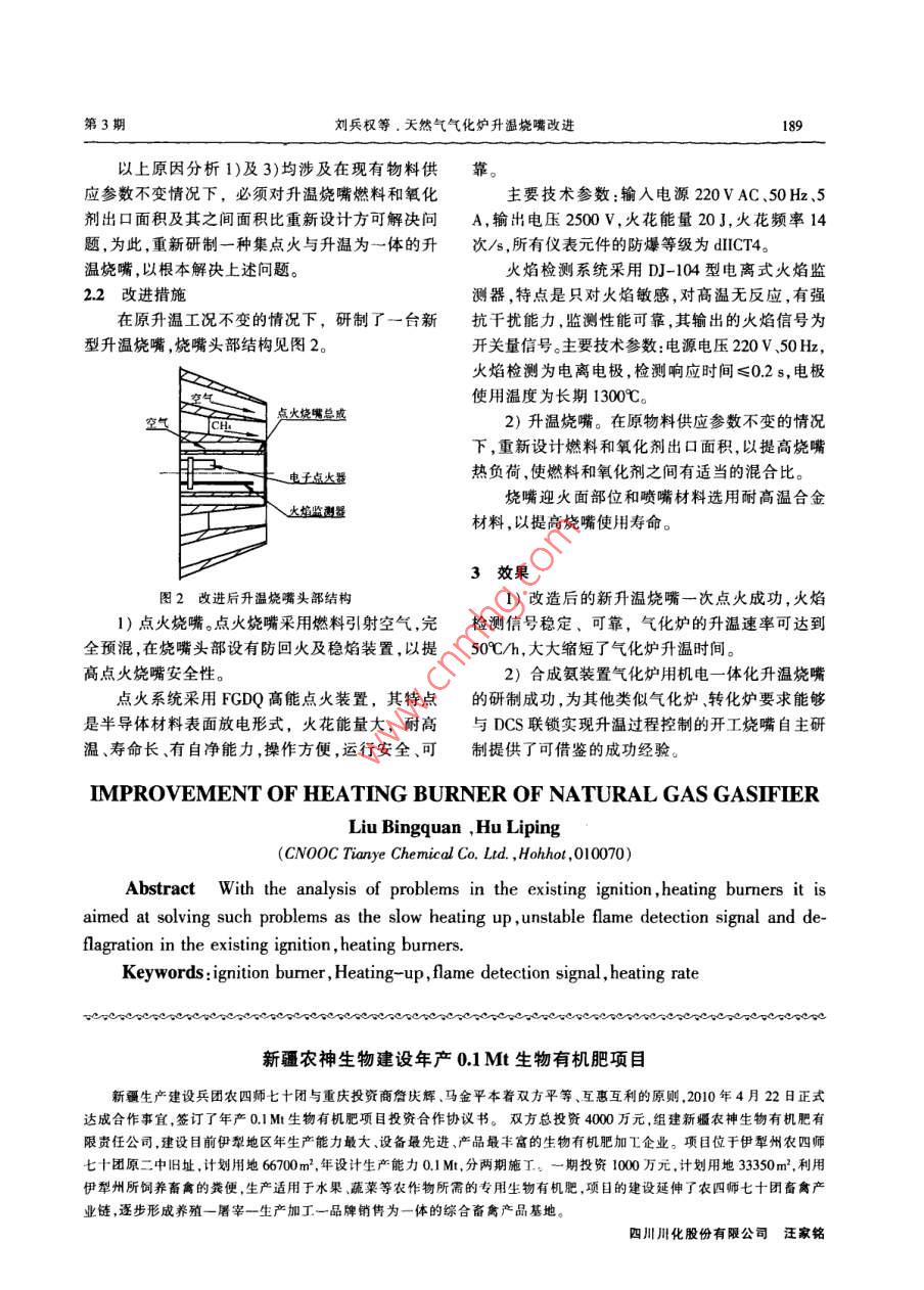 2010年6月大看觸Jun.2010第33卷第3期Large Scale Nitrogenous Fertilizer IndustryVol.33 No.3天然氣氣化爐升溫?zé)旄倪M劉兵權(quán)胡利平(中海石油天野化工股份有限公司,內(nèi)蒙古呼和普特,010070)摘要通過對原點火、升溫?zé)齑嬖诘膯栴}進行分析,有針對性地解決原點火、升溫?zé)齑嬖诘纳郎厮俣嚷?、火檢信號不穩(wěn)定、爆燃等問題。關(guān)鍵詞點火燒嘴升溫火檢信號升溫速率1概述“油改氣”工程中,考慮到謝爾點火燒嘴的高中海石油天野化工股份有限公司300kt/a合可 靠性要求,決定采用謝爾點火燒嘴和天然氣氣成氨裝置原設(shè)計以渣油為原料,采用謝爾氣化爐化工藝燒嘴組合在一-起對氣化爐進行升溫。升溫制取合成氣。隨著國際油價的不斷上漲,以渣油為過程中工藝燒嘴和點火燒嘴的燃料和氧化劑同樣原料制氨成本越來越高,為降低生產(chǎn)成本、提高市采用天然氣和空氣,爐膛壓力為-1.1 kPa,燒嘴頭場競爭力,于2005年進行了以天然氣為原料代替部結(jié)構(gòu)與原謝爾結(jié)構(gòu)基本- -致。渣油的“油改氣”工程。其中對原氣化爐的爐磚進“油改氣”改造工程后,用天然氣工藝燒嘴升行了改造,重新研制了天然氣氣化燒嘴。溫,在升溫過程中出現(xiàn)了以下問題:原謝爾渣油氣化爐的升溫采用在工藝燒嘴中1)升溫速度慢,升溫時間一般需要13d左右,取出工藝假件,將原謝爾點火燒嘴與工藝燒嘴裝在遠(yuǎn)遠(yuǎn)大于原謝爾渣油氣化爐升溫所用時間。一起對氣化爐進行升溫,待升溫結(jié)束后抽出點火燒2)火檢信號不穩(wěn)定。嘴,再將假件裝在工藝燒嘴中,之后投料。升溫過程3)升溫過程中存在爆燃現(xiàn)象。中工藝燒嘴的原氧氣通道通空氣,原渣油通道通液這些問題的存在,嚴(yán)重影響了氣化爐安全高化石油氣,爐膛壓力為-1.1kPa;點火燒嘴的燃料和效運行和企業(yè)的經(jīng)濟效益。氧化劑為液化石油氣和空氣。原謝爾點火燒嘴包括了燃料與氧化劑混合系統(tǒng)、自動點火系統(tǒng)和火焰檢2問題分析及 改造措施測系統(tǒng)?;鹧嫘盘柸詣踊O(jiān)測,并與DCS進行聯(lián)2.1原因分析鎖。謝爾升溫?zé)斓纳郎貢r間- -般需要大約7d。謝1)升溫速度慢,是由于在現(xiàn)有物料供應(yīng)參數(shù)爾升溫?zé)祛^部結(jié)構(gòu)見圖1。下,升溫?zé)鞜嶝?fù)荷不足所引起。2)火檢信號不穩(wěn)定是由于采用原謝爾舊點火燒嘴使用時間長,其中的點火系統(tǒng)和火檢系統(tǒng)老化所液化石通氣致空氣3)氣化爐在升溫過程中所產(chǎn)生的爆燃現(xiàn)象主要是由于燃料和氧化劑混合比不當(dāng)引起。收稿日期:2010-04-22。作者簡介:劉兵權(quán),男,1966年出生.助理工程師。1994年畢業(yè)于內(nèi)蒙古第二機械制造總廠職工中等專業(yè)學(xué)校化工機械專業(yè),現(xiàn)在中海石油天野化工股份有限公司從事設(shè)備維修、運行、管理工圖1原謝爾升溫繞嘴 頭部結(jié)構(gòu)作。聯(lián)系電話:0471-5607214;E- maililbing2quan3@163.com.第3期劉兵權(quán)等.天然氣氣化爐升溫?zé)旄倪M189以上原因分析1)及3)均涉及在現(xiàn)有物料供靠。應(yīng)參數(shù)不變情況下,必須對升溫?zé)烊剂虾脱趸饕夹g(shù)參數(shù):輸人電源220V AC .50 Hz.5,劑出口面積及其之間面積比重新設(shè)計方可解決問A,輸出電壓2500 V,火花能量20J,火花頻率14題,為此,重新研制一種集點火與升溫為一體的升次/s,所有儀表元件的防爆等級為dIICT4。溫?zé)?以根本解決上述問題?;鹧鏅z測系統(tǒng)采用DJ-104型電離式火焰監(jiān)2.2改進措施測器,特點是只對火焰敏感,對高溫?zé)o反應(yīng),有強在原升溫工況不變的情況下,研制了一臺新抗干擾能力,監(jiān)測性能可靠,其輸出的火焰信號為型升溫?zé)?燒嘴頭部結(jié)構(gòu)見圖2。開關(guān)量信號。主要技術(shù)參數(shù):電源電壓220 v、50Hz,火焰檢測為電離電極,檢測響應(yīng)時間≤0.2s,電極使用溫度為長期1300C。點火燒嘴總成空氣I2)升溫?zé)?。在原物料供?yīng)參數(shù)不變的情況下,重新設(shè)計燃料和氧化劑出口面積,以提高燒嘴電子點火器熱負(fù)荷,使燃料和氧化劑之間有適當(dāng)?shù)幕旌媳?。燒嘴迎火面部位和噴嘴材料選用耐高溫合金大焰監(jiān)測器材料,以提高燒嘴使用壽命。3效果圖2改進后升溫?zé)祛^部結(jié)構(gòu)1)改造后的新升溫?zé)煲淮吸c火成功,火焰.1)點火燒嘴。點火燒嘴采用燃料引射空氣,完檢測信號穩(wěn)定、可靠,氣化爐的升溫速率可達(dá)到全預(yù)混,在燒嘴頭部設(shè)有防回火及穩(wěn)焰裝置,以提509C/h,大大縮短了氣化爐升溫時間。高點火燒嘴安全性。2)合成氨裝置氣化爐用機電- -體化升溫?zé)禳c火系統(tǒng)采用FGDQ高能點火裝置,其特點的研制成功,為其他類似氣化爐、轉(zhuǎn)化爐要求能夠是半導(dǎo)體材料表面放電形式,火花能量大,耐高與DCS聯(lián)鎖實現(xiàn)升溫過程控制的開工燒嘴自主研溫、壽命長、有自凈能力,操作方便,運行安全、可制提供了可借鑒的成功經(jīng)驗。IMPROVEMENT OF HEATING BURNER OF NATURAL GAS GASIFIERLiu Bingquan ,Hu Liping(CNOOC Tianye Chemical Co, Ltd. ,Hohhot ,010070)Abstract With the analysis of problems in the existing ignition , heating burners it isaimed at solving such problems as the slow heating up , unstable flame detection signal and de-flagration in the existing ignition , heating burners.Keywords :ignition burmner , Heating- up , fl