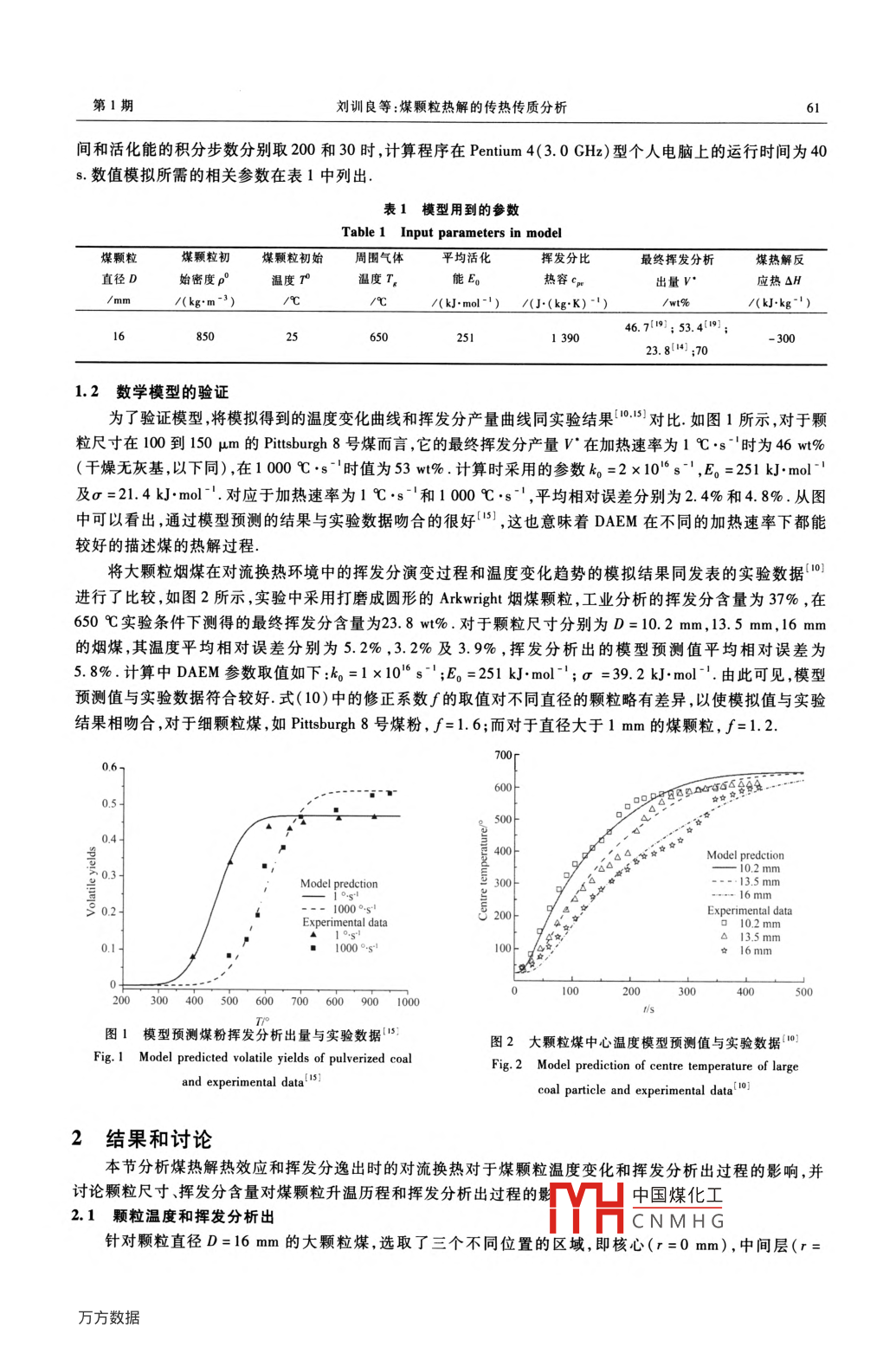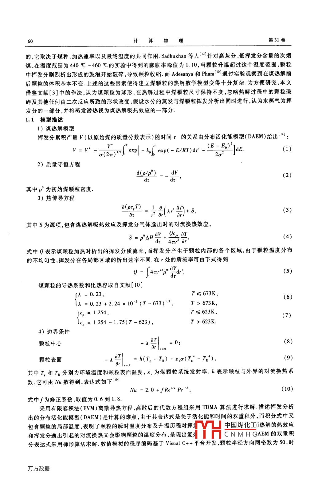 第31卷第1期計算物理Vol 31. No I2014年1月CHINESE JOURNAL OF COMPUTATIONAL PHYSICSJan.,2014文章編號:1001-246X(2014)01-005908煤顆粒熱解的傳熱傳質(zhì)分析劉訓(xùn)良,曹歡,王淦,溫治北京科技大學(xué)機械工程學(xué)院熱能工程系,北京100083)摘要:采用分布活化能模型及能量守恒方程對煤顆粒熱解的傳熱傳質(zhì)過程建立數(shù)學(xué)模型,模型考慮煤熱解的吸熱效應(yīng)及揮發(fā)分逸出時對流換熱的影響.與有關(guān)煤粉和大顆粒煤熱解的實驗數(shù)據(jù)對比,對模型進(jìn)行驗證針對煤顆粒的溫度變化過程和煤熱解過程進(jìn)行數(shù)值分析,研究煤熱解的吸熱效應(yīng)揮發(fā)分氣體逸出的對流效應(yīng)、顆粒尺寸等參數(shù)的影響關(guān)鍵詞:煤熱解;傳熱傳質(zhì);數(shù)學(xué)模型中圖分類號:TQ511.6文獻(xiàn)標(biāo)識碼:A0引言對于流化床中煤粉的燃燒或者移動床氣化爐中煤的氣化而言煤熱解都是一個重要的過程,研究煤熱解規(guī)律并準(zhǔn)確預(yù)測其溫度變化和揮發(fā)分析出速率對于氣化爐的優(yōu)化設(shè)計尤為重要通過一級反應(yīng)模型可以預(yù)測煤的熱解速率,然而由于煤顆粒中揮發(fā)分析出與其溫度分布緊密相關(guān),這種模型過于簡單. Higuera(2.用競爭反應(yīng)模型對移動的單顆粒煤熱解過程進(jìn)行了數(shù)值模擬Chem和 Hayhurst通過改進(jìn)的縮核反應(yīng)模型對大顆粒煤的熱解進(jìn)行了研究此后又采用一級反應(yīng)模型研究了恒溫小顆粒煤的熱解過程. Anthony等人提出了分布活化能模型( distributed activation energy model,DAEM), Solomon等人“提供的相關(guān)實驗數(shù)據(jù)表明這種模型與實際過程符合的很好,該模型是目前最常用的一種煤熱解模型(在揮發(fā)分析出或者熱分解過程中,顆粒內(nèi)部的熱傳遞是反應(yīng)速率的控制因素,而不是煤焦顆粒內(nèi)揮發(fā)分的質(zhì)量傳遞,在多數(shù)有關(guān)煤熱解的研究中,細(xì)煤及煤粉都被認(rèn)為是溫度均勻分布然而,在移動床氣化爐中,煤顆粒的尺寸遠(yuǎn)大于煤粉煤顆粒的尺寸差異及煤的低熱導(dǎo)率導(dǎo)致熱解時顆粒內(nèi)部產(chǎn)生較大的溫度梯度Fu等人發(fā)表了由煤粉壓制而成的大顆粒煤揮發(fā)分析出過程的動力學(xué)參數(shù)Zhao等人采用熱傳導(dǎo)方程和 FG-DVC模型研究了在流化床或固定床中燃燒的大顆粒煤的熱解過程,模型中考慮了煤熱解的熱效應(yīng)但在計算中該項設(shè)為零 Adesanya和Pham建立了在對流環(huán)境中大顆粒煤的熱解通用模型,考慮了熱解的熱效應(yīng)但是未考慮揮發(fā)分逸出時與顆粒的換熱影響Huo等人考慮了兩方面的影響建立了移動床中大顆粒煤的熱解模型,研究其熱解過程并分析了顆粒直徑床層溫度等參數(shù)的影響基于Huo等人提出的數(shù)學(xué)模型,本文重點分析煤熱解熱效應(yīng)和揮發(fā)分逸出所引起的對流換熱對顆粒內(nèi)部溫度的變化和揮發(fā)分析出速率的影響,并詳細(xì)討論煤顆粒尺寸及揮發(fā)分含量對煤顆粒升溫歷程和熱解過程的影響數(shù)學(xué)模型在流化床或者移動床等氣化爐中煤的熱解伴隨著顆粒內(nèi)部傳熱傳質(zhì)現(xiàn)象的發(fā)生.通過對劉易斯數(shù)3的分析可知,顆粒內(nèi)部的傳熱是煤熱解過程的速率控制因素,因而本文重點關(guān)注顆粒內(nèi)部的傳熱揮發(fā)分析出速率與顆粒溫度的變化歷程有著十分緊密的聯(lián)系當(dāng)溫度在650℃以下時,熱解反應(yīng)是吸熱的2.熱解產(chǎn)生的揮發(fā)分物質(zhì)會在顆粒內(nèi)部產(chǎn)生氣流,導(dǎo)致氣體逸出時產(chǎn)生對流換熱現(xiàn)象.煤顆粒尺寸的變化是復(fù)雜多樣收稿日期:2013-03-22;修回日期:2013-06-11基金項目:國家自然科學(xué)基金(51276015)資助項目中國煤化工作者簡介:劉訓(xùn)良(1973-),男,山東博士,副教授主要從事計算流動及傳熱傳質(zhì)分HCNMHGen第31卷的,它取決于煤種、加熱速率以及最終溫度的共同作用 Sadhukhan等人針對高灰分低揮發(fā)分含量的次煙煤,在溫度范圍為440℃~460℃的實驗中得到的膨脹率峰值為1.10,當(dāng)顆粒升溫超過這個溫度范圍,顆粒中揮發(fā)分劇烈析出形成的鼓泡開始破碎,導(dǎo)致顆粒收縮而 Adesanya和Pham10通過實驗觀察到在煤熱解前后顆粒的體積基本不變.上述的這些因素使得建立煤顆粒的熱解數(shù)學(xué)模型變得十分復(fù)雜.為方便研究,本文借鑒文獻(xiàn)[3]中的作法,認(rèn)為煤顆粒為球形,在熱解過程中煤顆粒尺寸保持不變,忽略熱解過程中的顆粒破碎及其他任何由二次反應(yīng)所致的形狀改變假設(shè)水分的蒸發(fā)與煤顆粒揮發(fā)分析出同時進(jìn)行認(rèn)為水蒸氣為揮發(fā)分的一部分,并將蒸發(fā)潛熱視為煤熱解吸熱效應(yīng)的一部分1.1模型描述1)煤熱解模型揮發(fā)分累積產(chǎn)量v(以原始煤的質(zhì)量分?jǐn)?shù)表示)隨時間r的關(guān)系由分布活化能模型(DAEM)給出":(E-E6)2ko exp(-E/rT)dr(1)a(2m)2)質(zhì)量守恒方程d(p/p)_d其中p°為初始煤顆粒密度3)熱傳導(dǎo)方程a(p(3)其中S為源項包含煤熱解吸熱效應(yīng)及揮發(fā)分氣體逸出時的對流換熱效應(yīng)dv Qc aT△H4)式中Q表示煤顆粒加熱時析出的揮發(fā)分質(zhì)流率,而揮發(fā)分產(chǎn)生于顆粒內(nèi)部的各個區(qū)域,由于顆粒溫度分布的不均勻性,揮發(fā)分在各局部區(qū)域的析出速率不同在r處的質