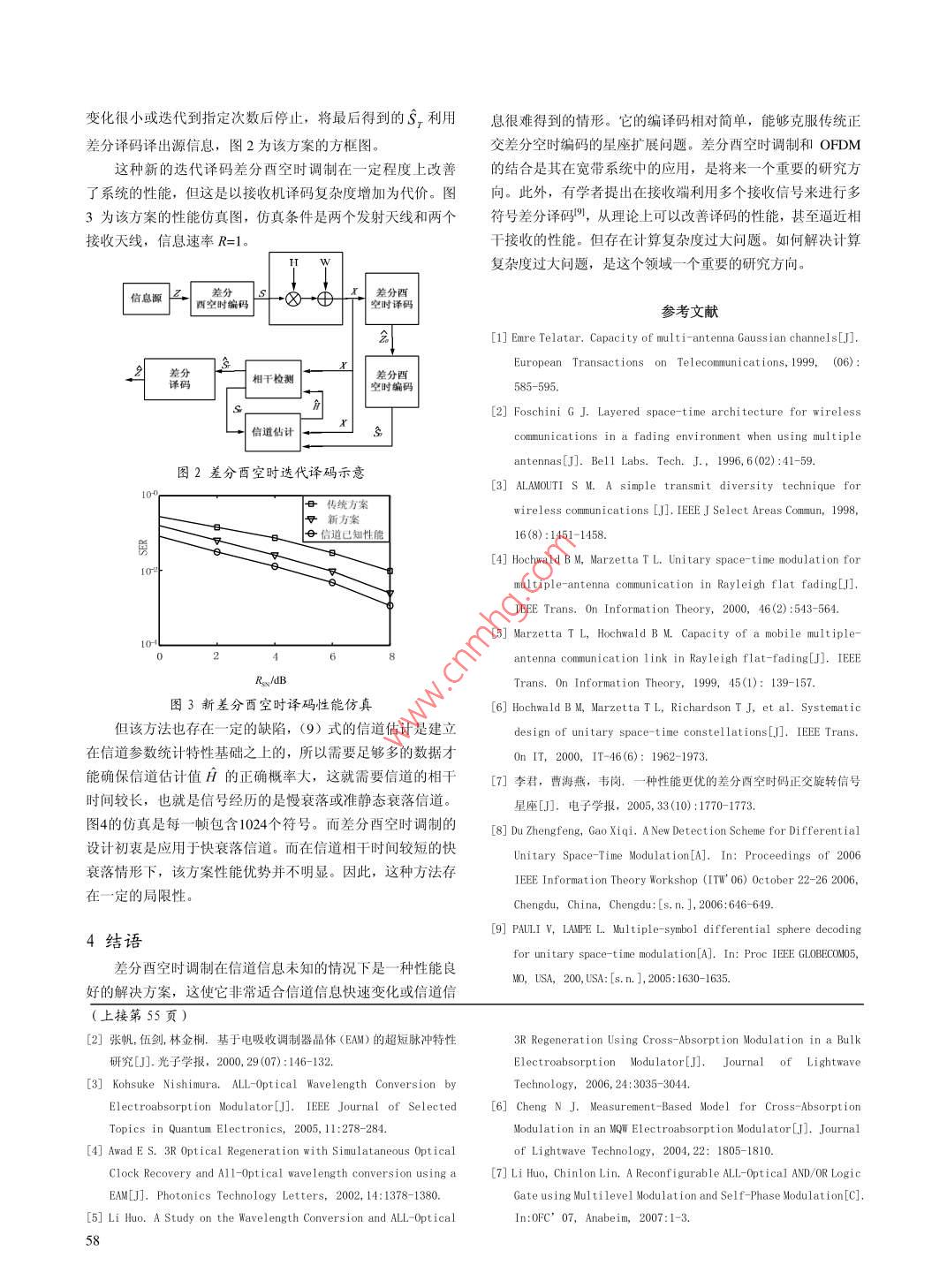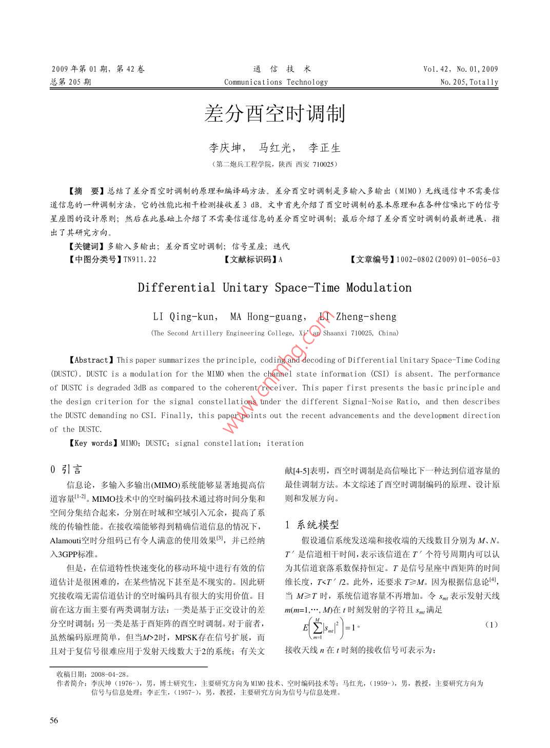 2009年第01期,第42卷通信技術(shù)Vol.42,No.01,2009總第205Communications TechnologyNo 205, Totally差分酉空時調(diào)制李慶坤,馬紅光,李正生第二炮兵工程學(xué)院,陜西西安710025)【摘要】總結(jié)了差分酉空時調(diào)制的原理和編譯碼方法。差分酉空時調(diào)制是多輸入多輸出(MIM0)無線通信中不需要信道信息的一種調(diào)制方法,它的性能比相干檢測接收差3dB。文中首先介紹了酉空時調(diào)制的基本原理和在各種信噪比下的信號星座圖的設(shè)計原則;然后在此基礎(chǔ)上介紹了不需要信道信息的差分酉空時調(diào)制;最后介紹了差分酉空時調(diào)制的最新進(jìn)展,指出了其研究方向【關(guān)鍵詞】多輸入多輸出;差分酉空時調(diào)制;信號星座;迭代【中圖分類號】TN911.22【文獻(xiàn)標(biāo)識碼】A【文章編號】1002-0802(2009)01-0056-03Differential Unitary Space-Time ModulationLI Qing-kun, MA Hong-guang, LI Zheng-sheng(The Second Artillery Engineering College, Xi'an Shaanxi 710025, China)(Abstract) This paper summarizes the principle, coding and decoding of Differential Unitary Space-Time Coding(DUSTC). DUSTC is a modulation for the MIMO when the channel state information (CSI) is absent. The performanceof dUStC is degraded 3dB as compared to the coherent receiver. This paper first presents the basic principle andthe design criterion for the signal constellations under the different Signal-Noise Ratio, and then describesthe dustc demanding no CSI. Finally, this paper points out the recent advancements and the development directionof the dustc(Key words] MIMO: DUSTC: signal constellation: iterati0引言獻(xiàn)[45]表明,酉空時調(diào)制是高信噪比下一種達(dá)到信道容量的信息論,多輸入多輸岀( MIMO)系統(tǒng)能夠顯著地提高信最佳調(diào)制方法。本文綜述了酉空時調(diào)制編碼的原理、設(shè)計原道容量2。MMO技術(shù)中的空時編碼技術(shù)通過將時間分集和則和發(fā)展方向??臻g分集結(jié)合起來,分別在時域和空域引入冗余,提高了系統(tǒng)的傳輸性能。在接收端能夠得到精確信道信息的情況下,1系統(tǒng)模型mou空時分組碼已有令人滿意的使用效果3,并已經(jīng)納假設(shè)通信系統(tǒng)發(fā)送端和接收端的天線數(shù)目分別為入3GPP標(biāo)準(zhǔn)T′是信道相干時間,表示該信道在T′個符號周期內(nèi)可以認(rèn)但是,在信道特性快速變化的移動環(huán)境中進(jìn)行有效的信為其信道衰落系數(shù)保持恒定。T是信號星座中酉矩陣的時間道估計是很困難的,在某些情況下甚至是不現(xiàn)實的。因此研維長度,T2時,MPSK存在信號擴(kuò)展,而且對于復(fù)信號很難應(yīng)用于發(fā)射天線數(shù)大于2的系統(tǒng):有關(guān)文接收天線n在t時刻的接收信號可表示為收稿日期:2008-04-28。作者簡介:李慶坤(1976-),男,博士研究生,主要研究方向為MMO技術(shù)、空時編碼技術(shù)等:馬紅光,(1959-),男,教授,主要研究方向為信號與信息處理:李正生,(1957-),男,教授,主要研究方向為信號與信息處理。h sn=1,…,N其中hm為從發(fā)射天線m到接收天線n的信道系數(shù),假定其在T個符號周期內(nèi)是恒定不變的,并且服從獨立同CNO.1)分布;wnm為服從CNO,1)分布的高斯白噪聲;p為各接收天S線上的平均信噪比。則在T個符號時間間隔內(nèi),式(2)可22v2S3Vz3Vz2vzi其中H={hm}為MN信道系數(shù)矩陣,S={sm}為一個T×M圖1差分西空時調(diào)制原理發(fā)射信號矩陣。T×N矩陣X和W分別表示接收信號和加性在圖1中,V為一個M×M的酉矩陣,信息源中的每噪聲矩陣。R×T比特信息映射為矩陣Φ,φ為T×M的酉矩陣,其中T=2*M,中3的上半部分為MXM的單位陣,下半部分為2酉空時調(diào)制對應(yīng)R×T比特信息的M×M酉矩陣。在差分編碼當(dāng)中,用由于酉矩陣的優(yōu)良正交性,使其編碼和譯碼簡單,所以當(dāng)前的信息矩陣的下半部分v左乘前一個信號矩陣,在空時編碼中有較好的應(yīng)用,尤其在差分空時編碼中更具有即s=V*,這樣,S1的上半部分和S1的下半部分相同。良好的性能。酉空時調(diào)制通過將一定比特的信息映射為酉矩發(fā)射時,在一幀的開始時刻(i=0)發(fā)射一個已知參考矩陣,陣,直接完成了編碼與調(diào)制。一般為單位陣,然后將Si=1…)的下半部分(如圖1)從M假定待發(fā)射的數(shù)據(jù)集合為Z1、Z2,…,∈{0,1…,L-1},個天線在M個符號時間內(nèi)發(fā)射出去。假設(shè)在一幀符號周期內(nèi)其中每個符號代表RXT個比特信息。這就需要一個含有L信道參數(shù)保持恒定(準(zhǔn)靜態(tài)衰落),那么接收信號的形式如個MXT酉矩陣的矩陣集合v={V…VL}作為信號星座(4)式所示。又由于并在Z和集合v內(nèi)的信號矩陣建立一一對應(yīng)關(guān)系。如果信道的頻譜利用率為R,則L=2。一般情況下,取T=M,這由(6)式得:樣發(fā)射信號為S=V,1=1,2,…,V∈ν。接收天線接收到的信S號矩陣為將(7)代入(4)式,得X=V*X1+W。其中W′=X,=S*H+H,t=1,2,…W-V*W1,因為V為酉矩陣,所以W′仍服從均值為0在已知信道信息的情況下,利用最大似然方法譯出信號。如的高斯分布,只是方差增加一倍。這樣Z的最大似然估計表式(5)所示達(dá)式為2,=arg)x, -V,HlZt=argminlX, -V, x,l(8)l=0…L-1=0.L-1在上面的分析中,信號星座的設(shè)計是一個重要的內(nèi)容,從(8)式可以看出,差分酉空時譯碼不需要信道信息,這它直接決定著方案性能的優(yōu)劣。文獻(xiàn)6系統(tǒng)地提出了兩種設(shè)特性對于接受端與未知信道參數(shù)的情況尤其適用