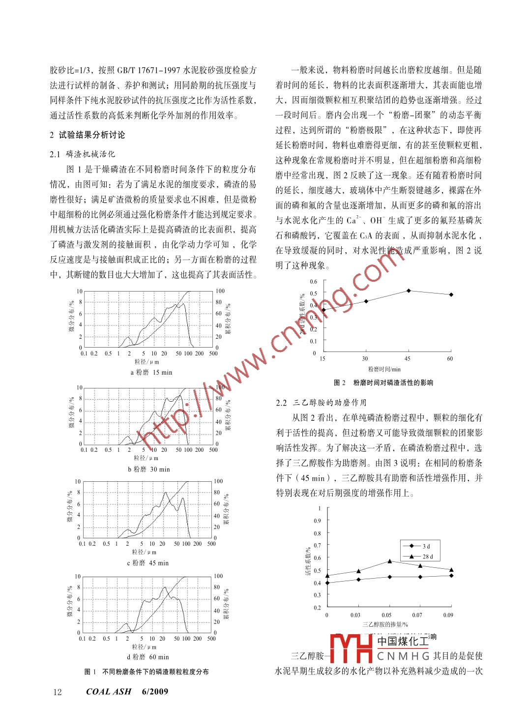 文章編號: 1007-046X (2009) 06-0011-04實驗研究化學(xué)添加劑對磷渣活性的激發(fā)效果研究Study of Activation of Chemical Admixture to Phosphorus Slag朱麗蘋,張召述,夏舉佩,孫彥琳(昆明理工大學(xué)化學(xué)工程學(xué)院,云南昆明650224)摘要:在水泥體系下研究了磷渣的粉磨特性和化學(xué)外加劑對磷渣的活性激發(fā)效果。研究表明:三乙醇胺具有明顯的助磨和活性增強作用,其較佳摻量為磷渣的0.05%,在此基礎(chǔ)上,復(fù)配摻加NaCl、FeC]、 Na,SiO3、 Na,SO、 NaNO,等 化學(xué)外加劑,也能產(chǎn)生早強作用,其中尤以NaCl的作用效果最為明顯,其較佳摻量為磷渣的2.0%。關(guān)鍵詞:外加劑;磷渣;激發(fā)效果中圖分類號: TQ126.3" 16文獻(xiàn)標(biāo)識碼: AAbstract: The ground characteristics of phosphorus slag and activation of chemical admixture to phosphorus slag activity werestudied. Result of the study shows: grinding and activity can be significantly improved with the help of triethanolamine, it wasbetter for 0.05% of phosphorus slag; on this basis, mixed with sodium chloride, ferric chloride, sodium silicate, sodium nitrate,chemical additive, etc., the early strength can also be improved, especially sodium chloride, It was better for 2% of phosphorusslag.Keywords: Chemical admixture; Phosphorous slag; activation effect0前言成分見表1。磷渣是電熱法生產(chǎn)黃磷時排出的-.種以CaSiO3為主要磷渣化學(xué)成分wt,%組成的玻璃體廢渣,每生產(chǎn)1t黃磷要排放磷渣8~12 t。成分CaO SiO2 A12O3 Fe203 MgO P20s F cIs由于磷渣含有氟、磷等可溶物,在雨水淋洗下,容易造成質(zhì)量41.1 47.6 4.13 0.56 1.65 2.11 2.50 1. 16水體污染,此外還占用土地,破壞植被。因磷渣中含有氟、磷等微量組分,是煅燒水泥熟料的理想礦化劑,同化學(xué)外加劑:三乙醇胺、FeCls、 Na2Si03、 NaCl、時,磷渣能代替部分石灰石和黏土提供熟料成分中的CaONa2SO4、NaNO2。以上試劑均為化學(xué)純試劑。和SiOz;磷渣所具有的潛在水化活性可用作混合材生產(chǎn)磷水泥:云南水泥有限公司生產(chǎn)的52.5普通硅酸鹽水渣水泥和復(fù)合硅酸鹽水泥,但實踐表明:摻人磷渣將導(dǎo)致泥,比表面積為350m2/kg,28d抗壓強度為58.5MPa;.標(biāo)準(zhǔn)砂。水泥凝結(jié)時間延長和早期強度降低,因此摻量受到一定限1.2 試驗設(shè)備制。為了克服磷渣硅酸鹽水泥應(yīng)用性能的不足,眾多學(xué)者PE100x 60顎式破碎機,XMQ-67G 型240x 90錐形提出了很多解決措施,并主要集中在機械磨細(xì)和摻加化學(xué)球磨機,72 L筒式球磨機,標(biāo)準(zhǔn)檢驗篩,ISO 行星式膠激發(fā)劑來激發(fā)磷渣的潛在活性兩個方面。但是不同研究者砂攪拌機與膠砂試體成型振實臺,三聯(lián)試模40 mmx得出的結(jié)論不盡相同,至今為止,制約磷渣作為水泥的高40 mmx 160 mm, TYA-100C型電液式抗折抗壓實驗機,摻量活性混合材的關(guān)鍵技術(shù)尚未解決。本文探討了多種化TYA-300C型電液式抗折抗壓實驗機,養(yǎng)護(hù)箱。學(xué)添加劑對磷渣水泥的激發(fā)效果。1.3 試驗方法1實驗部分原狀磷:渣經(jīng)中國煤化工: 的粒狀磷渣,1.1試驗原料經(jīng)干燥后粉磨成目篩余),用MHCNMHG'磷渣:來自云南南磷集團嵩明黃磷廠,其主要化學(xué)50%磷渣粉等量取化水泥作為股凝材料,取水膠比=0.50,6/2009粉煤灰11.膠砂比=1/3,按照GB/T 17671-1997水泥膠砂強度檢驗方- .般來說,物料粉磨時間越長出磨粒度越細(xì)。但是隨法進(jìn)行試樣的制備、養(yǎng)護(hù)和測試;用同齡期的抗壓強度與著時間的延長, 物料的比表面積逐漸增大,其表面能也增同樣條件下純水泥膠砂試件的抗壓強度之比作為活性系數(shù),大, 因而細(xì)微顆粒相互積聚結(jié)團的趨勢也逐漸增強。經(jīng)過通過活性系數(shù)的高低來判斷化學(xué)外加劑的作用效率。一段時間后。磨內(nèi)會出現(xiàn)一個“粉磨-團聚”的動態(tài)平衡過程,達(dá)到所謂的“粉磨極限”,在這種狀態(tài)下,即使再2試驗結(jié)果分析討論延長粉磨時間,物料也難磨得更細(xì),有的甚至使顆粒更粗,2.1磷渣機械活化圖1是干燥磷渣在不同粉磨時間條件下的粒度分布這種現(xiàn)象在常規(guī)粉磨時并不明顯,但在超細(xì)粉磨和高細(xì)粉磨中經(jīng)常出現(xiàn),圖2反映了這一現(xiàn)象。還有隨著粉磨時間情況,由圖可知:若為了滿足水泥的細(xì)度要求,磷渣的易的延長,細(xì)度越大,玻璃體中產(chǎn)生斷裂鍵越多,裸露在外磨性很好;滿足礦渣微粉的質(zhì)量要求也不困難,但是微粉面的磷和氟的含量也逐漸增加,從而更多的磷和氟的溶出中超細(xì)粉的比例必須通過強化粉磨條件才能達(dá)到規(guī)定要求。與水泥水化產(chǎn)生的Ca2、0H~生成了更多的氟羥基磷灰用機械方法活化磷渣實際上是提高磷渣的比表面積,提高石和磷酸鈣,它覆蓋在CsA的表面,從而抑制水泥水化,了磷渣與激發(fā)劑的接觸面積,由化學(xué)動力學(xué)可知,化學(xué)在導(dǎo)致緩凝的同時,對水泥性能造成嚴(yán)重影響,圖2說反應(yīng)速度是與接觸面積成正比的;另一方面在粉磨的過程.明了這種現(xiàn)象。中,其斷鍵的數(shù)目也大大增加了,這也提高了其表面活性。).6|00).580、0.40號0.340 a0.2).10.10.20.5125102050100200500304560粒徑/μma粉磨15 min粉磨時間/min圖2粉磨時間對磷渣 活性的影響2.2三乙醇胺的助磨作用.60年40從圖2看出,在單純磷渣粉磨過程中,顆粒的細(xì)化有利于活性的提高,但過粉磨又可能導(dǎo)致微細(xì