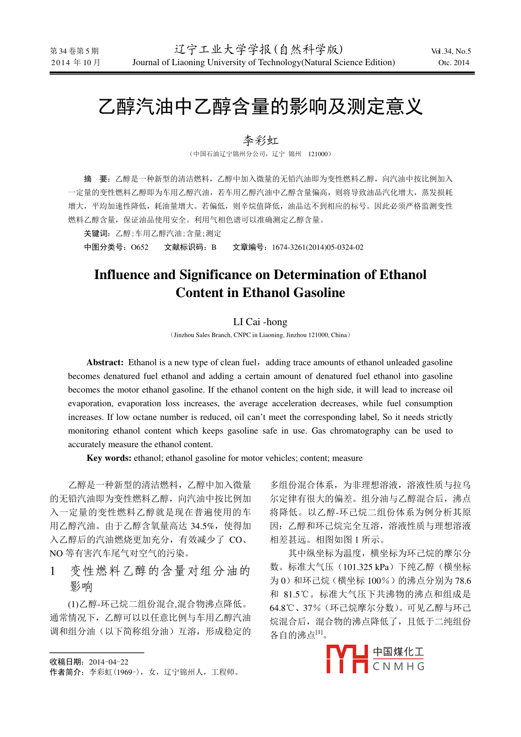 第34卷第5期遼寧工業(yè)大學學報(自然科學版)Vd.34,No.52014年10月Journal of liaoning University of Technology(Natural Science Edition)Otc.2014乙醇汽油中乙醇含量的影響及測定意義李彩虹(中國石油遼寧錦州分公司,遼寧錦州121000摘要:乙醇是一種新型的清潔燃料,乙醇中加λ微量的無鉛汽油即為變性燃料乙醇,向汽油中按比例加入定量的變性燃料乙醇即為車用乙醇汽油,若車用乙醇汽油中乙醇含量偏高,則將導致油品汽化增大,蒸發(fā)損耗增大,平均加速性降低,耗油量増大。若偏低,則辛烷值降低,油品達不到相應的標號。因此必須嚴格監(jiān)測變性料乙醇含量,保證油品使用安全。利用氣相色譜可以準確測定乙醇含量關鍵詞:乙醇;車用乙醇汽油;含量;測定中圖分類號:O652文獻標識碼:B文章編號:16743261(2014)05-032402Influence and significance on Determination of ethanoContent in ethanol gasolineLI Cai-hon(Jinzhou Sales Branch, CNPC in Liaoning, Jinzhou 121000, ChinaAbstract: Ethanol is a new type of clean fuel, adding trace amounts of ethanol unleaded gasolinebecomes denatured fuel ethanol and adding a certain amount of denatured fuel ethanol into gasolinebecomes the motor ethanol gasoline. If the ethanol content on the high side, it will lead to increase oilevaporation, evaporation loss increases, the average acceleration decreases, while fuel consumptioncreases. If low octane number is reduced, oil can't meet the corresponding label, So it needs strictlymonitoring ethanol content which keeps gasoline safe in use. Gas chromatography can be used toaccurately measure the ethanol contentKey words: ethanol; ethanol gasoline for motor vehicles; content; measure乙醇是一種新型的清潔燃料,乙醇中加入微量多組份混合體系,為非理想溶液,溶液性質與拉鳥的無鉛汽油即為變性燃料乙醇,向汽油中按比例加爾定律有很大的偏差。組分油與乙醇混合后,沸點入一定量的變性燃料乙醇就是現(xiàn)在普遍使用的車將降低。以乙醇-環(huán)已烷二組份體系為例分析其原用乙醇汽油。由于乙醇含氧量高達34.5%,使得加因:乙醇和環(huán)已烷完全互溶,溶液性質與理想溶液入乙醇后的汽油燃燒更加充分,有效減少了CO、相差甚遠。相圖如圖1所示NO等有害汽車尾氣對空氣的污染。其中縱坐標為溫度,橫坐標為環(huán)己烷的摩爾分1變性燃料乙醇的含量對組分油的數(shù)。標準大氣壓(101.325kPa)下純乙醇(橫坐標影響為0)和環(huán)己烷(橫坐標100%)的沸點分別為78.6和81.5℃。標準大氣壓下共沸物的沸點和組成是(1)乙醇-環(huán)己烷二組份混合,混合物沸點降低64.8℃、37%(環(huán)己烷摩爾分數(shù))??梢娨掖寂c環(huán)己通常情況下,乙醇可以以任意比例與車用乙醇汽油烷混合后,混合物的沸點降低了,且低于二純組份調和組分油(以下簡稱組分油)互溶,形成穩(wěn)定的各自的沸點中國煤化工收稿日期:2014-04-22作者簡介:李彩虹(1969-),女,遼寧錦州人,工程師。CNMHG李彩虹:乙醇汽油中乙醇含量的影響及測定意義325是偏低,都會影響油品的性能、質量2變性燃料乙醇含量的測定及意義70根據(jù)GB18351—2004《車用乙醇汽油》標準,票682013年之前是采用“現(xiàn)場快速檢驗法”來測定變性燃料乙醇含量。這個試驗的優(yōu)點在于操作簡單并且能夠快速得出試驗結果,但它的影響因素卻是多方0.20.40.60.81.0面的:首先,要正確選擇10mL移液管且移液管必環(huán)己烷/%須校驗,使其準確度達到10.00±0.01mL,以保證加圖1乙醇環(huán)己烷相圖入乙醇汽油中的蒸餾水量準確無誤。另外,絕不可(2)乙醇與組分油混合,50%餾出溫度降低以用10mL量筒代替l0nL移液管來量取蒸餾水組分油主要是由烷烴、環(huán)烷烴、芳香烴等烴類化合其次,操作方式要準確無誤。在試驗過程中,一定物以及少量非烴化合物組成的混合物,組分油與乙要將具塞量筒上下顛倒20次,使組分油與變性燃醇混合后,由于共沸效應,混合物存在最低恒沸點,料乙醇充分混合均勻,將混合物靜置20min,使油為最低恒沸混合物,50%餾岀溫度明顯降低。中的水完全析岀,沉落到量筒底部,分成界面清晰以錦州石化分公司生產(chǎn)的93號乙醇汽油調和的油一水兩相,再讀取數(shù)據(jù),準確至0.5mL。同時組分油實測數(shù)據(jù)分析:錦州石化分公司主要采用遼由于各油田原油成分的不同、試驗環(huán)境溫度的變化河油田、大慶油田的原油煉制組份油。以2013年等因素也影響“現(xiàn)場快速檢驗法”結果的準確性上半年的遼河油田原油為例(20℃密度為9942由于錦州石化公司生產(chǎn)的車用乙醇汽油調和組分kg/m3)分析數(shù)據(jù)見表1油中,環(huán)烷烴和芳香烴含量相對髙些,導致乙醇在表1原油族組成組分油中的溶解度增大,體現(xiàn)在“快速法”中,表名稱數(shù)值現(xiàn)為水相體積相對減小,試驗結果偏低。另外在冬CA芳香環(huán)上的碳原子占分子總碳原子的百分數(shù)21.0CP烷基鏈上的碳原子占分子總碳原子的百分數(shù)51.0季,試驗環(huán)境溫度偏低,乙醇在組分油中的溶解度CN環(huán)烷環(huán)上的碳原子占分子總碳原子的百分數(shù)28將減小,則試驗中水相體積相對増大,試驗結果偏RA芳香環(huán)數(shù)高。而用“色譜法”測定變性燃料乙醇含量時,由R環(huán)烷環(huán)數(shù)于色譜柱溫是恒定的,試驗的內標物為標準物質,總環(huán)數(shù)利用該批原油煉制的93號組分油飽和蒸氣壓就不存在上述情況,經(jīng)將大量試驗數(shù)據(jù)相對比發(fā)為57we:10%餾出溫度為58℃:50%餾出溫