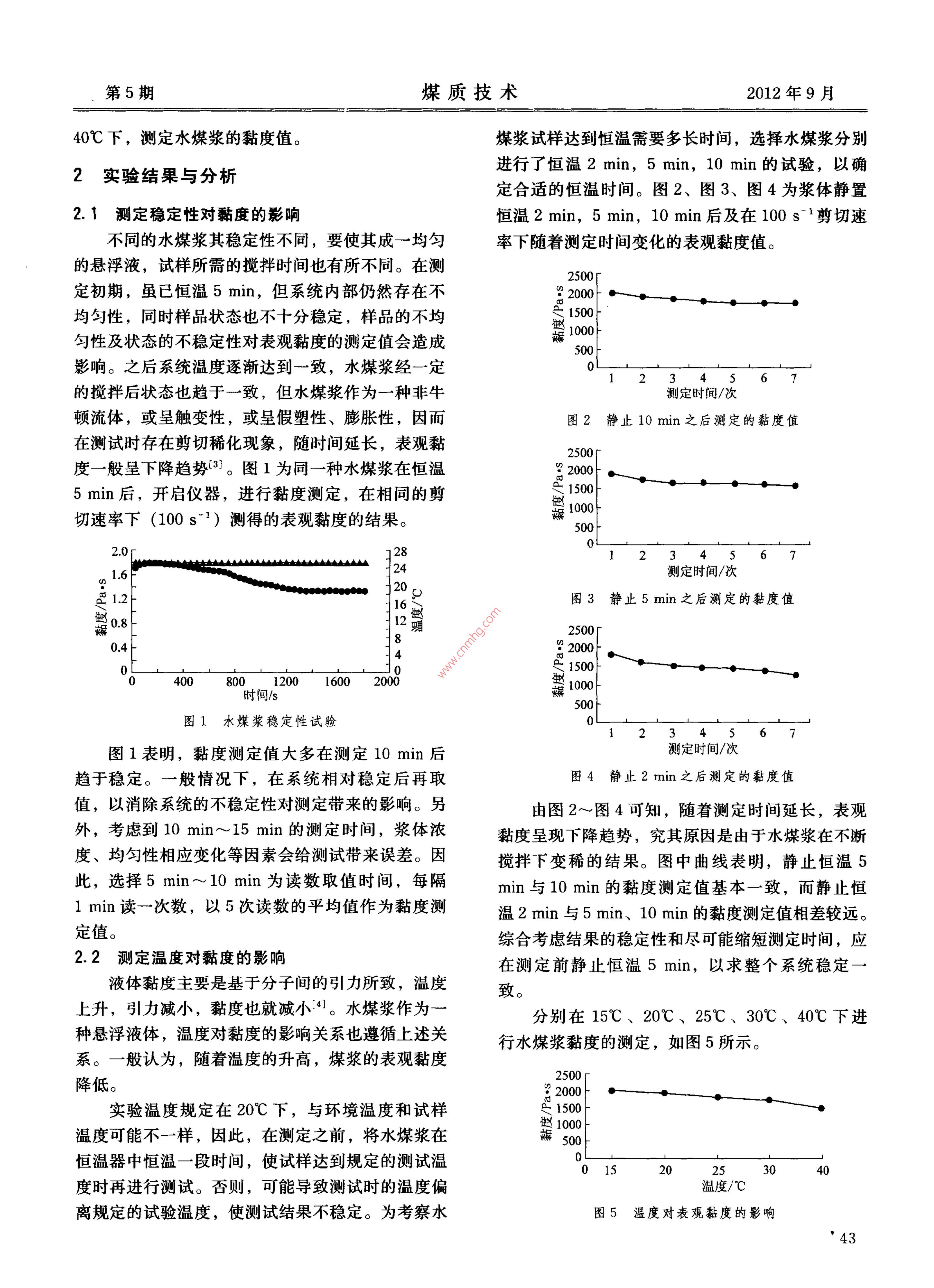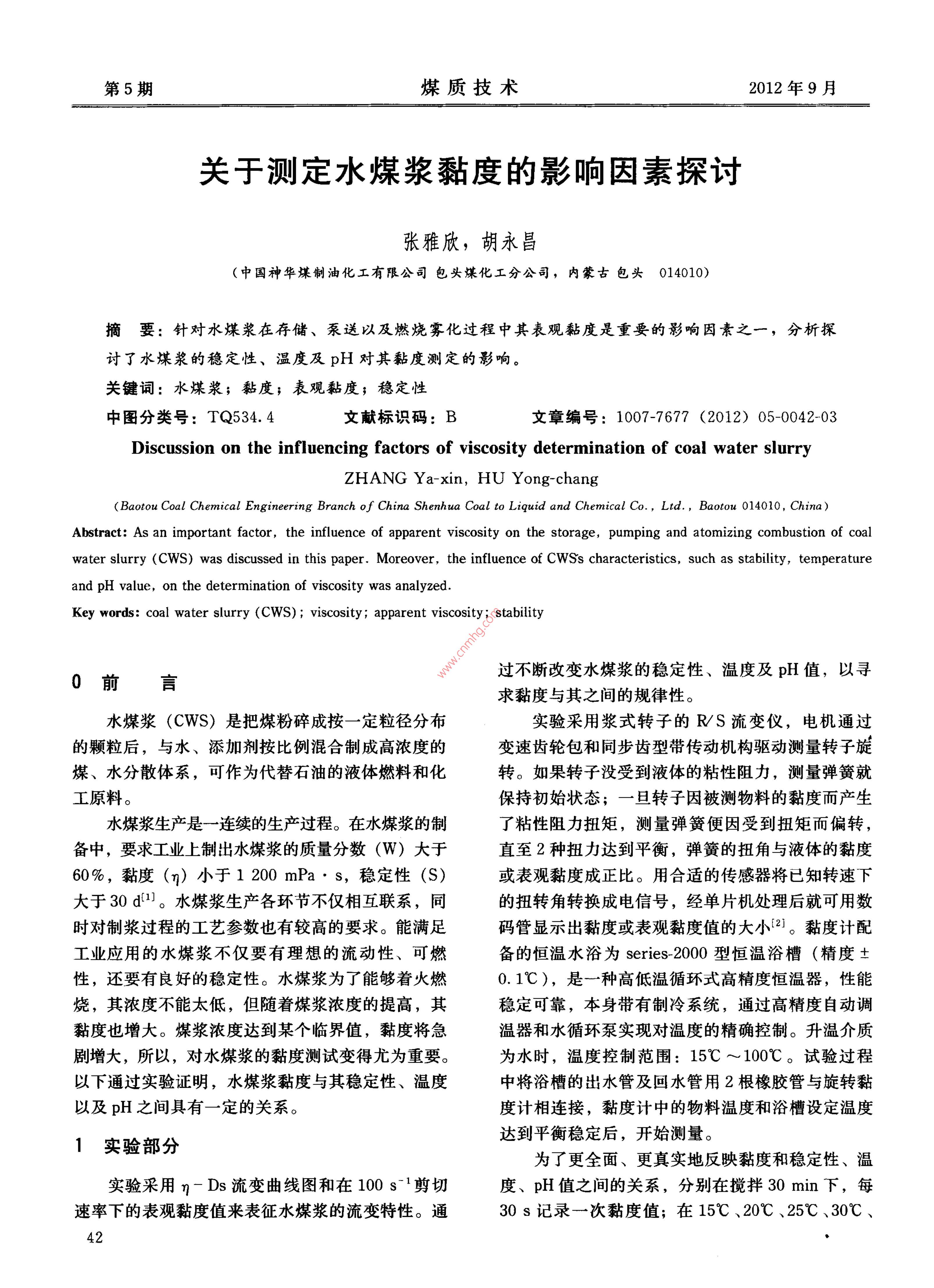 第5期煤質(zhì)技術(shù)2012年9月關(guān)于測(cè)定水煤漿黏度的影響因素探討張雅欣,胡永昌(中因神華煤制油化工有限公司包頭煤化工分公司,內(nèi)蒙古包頭014010)摘要:針對(duì)水煤漿在存儲(chǔ)、泵送以及燃燒霧化過(guò)程中其表觀黏度是重要的影響因素之一,分析探討了水煤漿的穩(wěn)定性、溫度及pH對(duì)其黏度測(cè)定的影響。關(guān)鍵詞:水煤漿;黏度;表觀黏度;穩(wěn)定性中圖分類號(hào):TQ534.4文獻(xiàn)標(biāo)識(shí)碼:B文章編號(hào):1007-7677(2012)05-0042-03Discussion on the influencing factors of viscosity determination of coal water slurryZHANG Ya-xin, HU Yong-changBaotou Coal Chemical engineering Branch of China Shenhua Coal to Liquid and Chemical Co, Ltd, Baotou 014010, China)Abstract: As an important factor, the influence of apparent viscosity on the storage pumping and atomizing combustion of coalwater slurry (Cws)was discussed in this paper. Moreover, the influence of CWSs characteristics, such as stability, temperatureand pH value, on the determination of viscosity was analyzedKey words: coal water slurry(CWS);viscosity; apparent viscosity; stability0前言過(guò)不斷改變水煤漿的穩(wěn)定性、溫度及pH值,以尋求黏度與其之間的規(guī)律性。水煤漿(CWS)是把煤粉碎成按一定粒徑分布實(shí)驗(yàn)采用漿式轉(zhuǎn)子的RS流變儀,電機(jī)通過(guò)的顆粒后,與水、添加劑按比例混合制成高濃度的變速齒輪包和同步齒型帶傳動(dòng)機(jī)構(gòu)驅(qū)動(dòng)測(cè)量轉(zhuǎn)子旋煤、水分散體系,可作為代替石油的液體燃料和化轉(zhuǎn)。如果轉(zhuǎn)子沒(méi)受到液體的粘性阻力,測(cè)量彈簧就工原料。保持初始狀態(tài);一旦轉(zhuǎn)子因被測(cè)物料的黏度而產(chǎn)生水煤漿生產(chǎn)是一連續(xù)的生產(chǎn)過(guò)程。在水煤漿的制了粘性阻力扭矩,測(cè)量彈簧便因受到扭矩而偏轉(zhuǎn),備中,要求工業(yè)上制出水煤漿的質(zhì)量分?jǐn)?shù)(W)大于直至2種扭力達(dá)到平衡,彈簧的扭角與液體的黏度60%,黏度(n)小于1200mPa·s,穩(wěn)定性(S)或表觀黏度成正比。用合適的傳感器將已知轉(zhuǎn)速下大于30d1。水煤漿生產(chǎn)各環(huán)節(jié)不僅相互聯(lián)系,同的扭轉(zhuǎn)角轉(zhuǎn)換成電信號(hào),經(jīng)單片機(jī)處理后就可用數(shù)時(shí)對(duì)制漿過(guò)程的工藝參數(shù)也有較高的要求。能滿足碼管顯示出黏度或表觀黏度值的大小21。黏度計(jì)配工業(yè)應(yīng)用的水煤漿不僅要有理想的流動(dòng)性、可燃備的恒溫水浴為 series-2000型恒溫浴槽(精度±性,還要有良奷的穩(wěn)定性。水煤漿為了能夠著火燃0.1℃),是一種高低溫循環(huán)式高精度恒溫器,性能燒,其濃度不能太低,但隨著煤漿濃度的提高,其穩(wěn)定可靠,本身帶有制冷系統(tǒng),通過(guò)高精度自動(dòng)調(diào)黏度也增大。煤漿濃度達(dá)到某個(gè)臨界值,黏度將急溫器和水循環(huán)泵實(shí)現(xiàn)對(duì)溫度的精確控制。升溫介質(zhì)劇增大,所以,對(duì)水煤漿的黏度測(cè)試變得尤為重要。為水時(shí),溫度控制范圍:15℃~100℃。試驗(yàn)過(guò)程以下通過(guò)實(shí)驗(yàn)證明,水煤漿黏度與其穩(wěn)定性、溫度中將浴槽的出水管及回水管用2根橡膠管與旋轉(zhuǎn)黏以及pH之間具有一定的關(guān)系。度計(jì)相連接,黏度計(jì)中的物料溫度和浴槽設(shè)定溫度1實(shí)驗(yàn)部分達(dá)到平衡穩(wěn)定后,開始測(cè)量為了更全面、更真實(shí)地反映黏度和穩(wěn)定性、溫實(shí)驗(yàn)采用nDs流變曲線圖和在100s1剪切度、pH值之間的關(guān)系,分別在攪拌30min下,每速率下的表觀黏度值來(lái)表征水煤漿的流變特性。通30s記錄一次黏度值;在15℃、20℃、25℃、30℃42第5期煤質(zhì)技術(shù)2012年9月40℃下,測(cè)定水煤漿的黏度值。煤漿試樣達(dá)到恒溫需要多長(zhǎng)時(shí)間,選擇水煤漿分別2實(shí)驗(yàn)結(jié)果與分析進(jìn)行了恒溫2min,5min,10min的試驗(yàn),以確定合適的恒溫時(shí)間。圖2、圖3、圖4為漿體靜置2.1測(cè)定穩(wěn)定性對(duì)黏度的影響恒溫2min,5min,10min后及在100s1剪切速不同的水煤漿其穩(wěn)定性不同,要使其成一均勻率下隨著測(cè)定時(shí)間變化的表觀黏度值。的懸浮液,試樣所需的攪拌時(shí)間也有所不同。在測(cè)2500定初期,雖已恒溫5min,但系統(tǒng)內(nèi)部仍然存在不·均勻性,同時(shí)樣品狀態(tài)也不十分穩(wěn)定,樣品的不均e1500勻性及狀態(tài)的不穩(wěn)定性對(duì)表觀黏度的測(cè)定值會(huì)造成1000500影響。之后系統(tǒng)溫度逐漸達(dá)到一致,水煤漿經(jīng)一定01234567的攪拌后狀態(tài)也趨于一致,但水煤漿作為一種非牛測(cè)定時(shí)間/次頓流體,或呈觸變性,或呈假塑性、膨脹性,因而圖2靜止10min之后測(cè)定的黏度值在測(cè)試時(shí)存在剪切稀化現(xiàn)象,隨時(shí)間延長(zhǎng),表觀黏2500度一般呈下降趨勢(shì)3。圖1為同一種水煤漿在恒溫20005min后,開啟儀器,進(jìn)行黏度測(cè)定,在相同的剪15001000切速率下(100s1)測(cè)得的表觀黏度的結(jié)果。50002.01.624測(cè)定時(shí)間/次16圖3靜止5min之后測(cè)定的黏度值0825000.4200015004008001200160020001000時(shí)間/s500圖1水煤漿穩(wěn)定性試驗(yàn)023567圖1表明,黏度測(cè)定值大多在測(cè)定10min后測(cè)定時(shí)間/次趨于穩(wěn)定。一般情況下,在系統(tǒng)相對(duì)穩(wěn)定后再取圖4靜止2min之