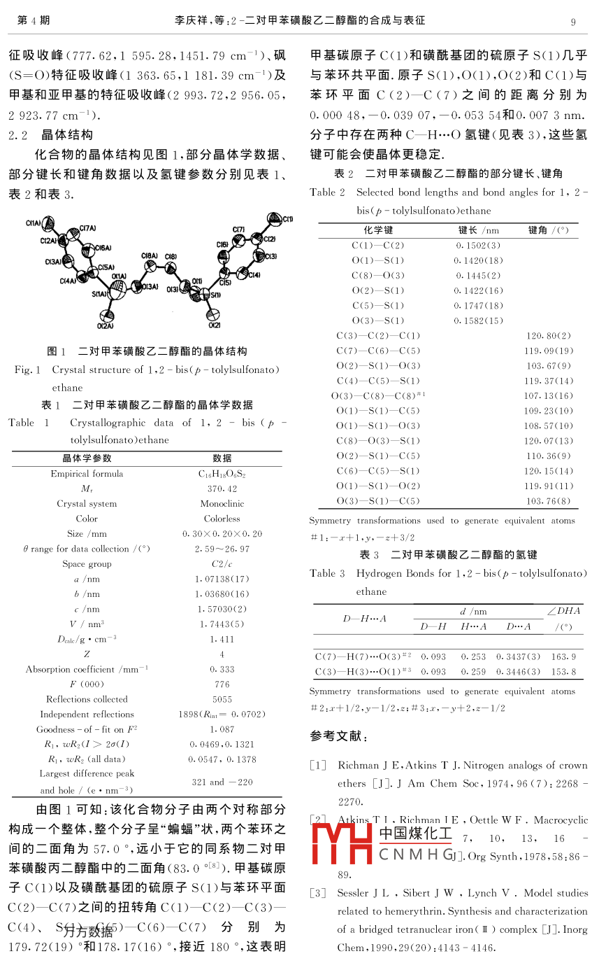 第29卷第4期武漢工程大學(xué)學(xué)報ol. 29 No 42007年07月J. Wuhan Inst, Tech,Jul.2007文章編號:1004-4736(2007)04-0008-0二對甲苯磺酸乙二醇酯的合成與表征李慶祥*,沈云軍(武漢工程大學(xué)化工與制藥學(xué)院,湖北省新型反應(yīng)器與綠色化學(xué)工藝重點實驗室,湖北武漢430074)摘要:以對甲苯磺酰氯和乙二醇為原料合成了二對甲苯磺酸乙二醇酯,采用紅外光譜和元素分析對其進(jìn)行了表征,并用Ⅹ-射線晶體衍射的方法測定了其晶體結(jié)構(gòu),該晶體屬于單斜晶系,C2/c空間群,晶胞參數(shù)a=1.07138(17)mm,b=1.03680(16)nm,c=1.5703(2)nm;每個晶胞中所含分子數(shù)Z=4,晶體密度計算值Dk=1.4llg/cm3.整個分子結(jié)構(gòu)呈“蝙蝠”狀,分子間存在C-H…O弱相互作用.紅外光譜和元素分析」實驗結(jié)果一致關(guān)鍵詞:乙二醇;對甲苯磺酰氯;二對甲苯磺酸乙二醇酯;晶體結(jié)構(gòu)中圖分類號:O623.42+6.1文獻(xiàn)標(biāo)識碼:A0引言1.3結(jié)構(gòu)表征產(chǎn)品取樣,分別在240C型元素分析儀和二對甲苯磺酸乙二醇酯是一種重要的有機(jī)中1 mpact420型紅外光譜儀上對樣品進(jìn)行元素分析間體,廣泛用于含氮大環(huán)化合物的合成與橋和紅外光譜測定(KBr壓片)聯(lián)1-3.本研究以乙二醇和對甲苯磺酰氯為原料1.4晶體結(jié)構(gòu)的測定合成了二對甲苯磺酸乙二醇酯,用Ⅹ射線晶體衍選取一顆大小為0.3mm×0.2mm射的方法測定了它的晶體結(jié)構(gòu),并采用紅外光譜0.2mm的單晶(適合X射線結(jié)構(gòu)分析的單晶由和元素分析對其進(jìn)行了表征·二對甲苯磺酸乙二該化合物的乙醇溶液在室溫下緩慢揮發(fā)得到)用醇酯的合成路線如下于結(jié)構(gòu)分析,在 SMART APEX-CCD單晶衍射TOCH CH- OH+2C~010℃儀上,于292(2)K下用MoKa射線TsOCH, CHOTs+ 2HCI(λ=0.071073nm),以ga掃描方式在SO.-)5.20°≤20≤56.00°內(nèi)共收集5055個衍射點,其1實驗部分中1898個(Rmn=0.0702)獨立衍射點,1563個Ⅰ>2σ(1)的可觀察衍射點用于結(jié)構(gòu)分析和結(jié)構(gòu)修1.1試劑與儀器正,全部數(shù)據(jù)經(jīng)Lp因子和經(jīng)驗吸收校正.晶體結(jié)乙二醇、對甲苯磺酰氯、甲苯、三乙胺和無水構(gòu)采用 SHELXS97程序由直接法解出.對氫原乙醇均為分析純試劑子和非氫原子分別采用各向同性和各向異性熱參240C型元素分析儀,美國P-E公司; Impact數(shù),用全矩陣最小二乘法進(jìn)行結(jié)構(gòu)修正,精修采用420型紅外光譜儀,美國 Nicolet公司; SMART SHELXI97程序完成APEX-CCD單晶衍射儀,德國 Bruker公司2二對甲苯磺酸乙二醇酯的合成結(jié)果與討論乙二醇5.0g(0.08mol)溶于50mL甲苯2.1結(jié)構(gòu)表征中,以冰水浴冷卻至θC后,在攪拌下同時緩緩滴2.1.1元素分析C1H1OS2,實測值(計算入30.1g(0.16mol)對甲苯磺酰氯的甲苯值)/%:C,52.01(51.88);H,4,87(4.90)(200mL)溶液和19.5g(0.19mol)三乙胺,滴完2.1.2紅外光譜分析產(chǎn)品的紅外光譜數(shù)據(jù)后在室溫下繼續(xù)反應(yīng)3h,蒸干甲苯,得到的白色中國煤化工72,2956.05,2923.77,固體用水洗滌三次,無水乙醇重結(jié)晶,得白色晶體CNMHG.65,1181.39,777.6224.91g,收率83.4%,熔點119~120C紅外光譜分析表明:產(chǎn)品結(jié)構(gòu)中存在苯環(huán)特收稿日期:2007-04-19基金自然科學(xué)基金(No:20571058);湖北省自然科學(xué)基金(No:2005ABA022)1964-),男,湖北松滋人,副教授,博士.研究方向:生物無機(jī)化學(xué).*通訊聯(lián)系人李慶祥,等:2-二對甲苯磺酸乙二醇酯的合成與表征征吸收峰(777.62,1595.28,1451.79cm-1)、砜甲基碳原子C(1)和磺?;鶊F(tuán)的硫原子S(1)幾乎(S=O)特征吸收峰(1363.65,1181.39cm-1)及與苯環(huán)共平面.原子S(1),O(1),O(2)和C(1)與甲基和亞甲基的特征吸收峰(2993.72,2956.05,苯環(huán)平面C(2)-C(7)之間的距離分別為923.77cm-1)0.00048,-0.03907,-0.05354和0.0073nm2.2晶體結(jié)構(gòu)分子中存在兩種C—H…O氫鍵(見表3),這些氫化合物的晶體結(jié)構(gòu)見圖1,部分晶體學(xué)數(shù)據(jù)、鍵可能會使晶體更穩(wěn)定部分鍵長和鍵角數(shù)據(jù)以及氫鍵參數(shù)分別見表1表2二對甲苯磺酸乙二醇酯的部分鍵長、鍵角表2和表3Table 2 Selected bond lengths and bond angles for 1, 2bis(p-tolylsulfonato )ethane化學(xué)鍵鍵長/mm鍵角/()C(AlC(1)—C(2)0.1502(3)CaLO(1)-S(1)0.1420(18)C(8)—O(3)的0.1422(16C(5)-S(1)0.1582(15)C(3)C(2)C(1)120.80(2)圖1二對甲苯磺酸乙二醇酯的晶體結(jié)構(gòu)(7)-C(6)-C(5)119.09(19)Fig. 1 Crystal struc103.67(9(4)C(5)-S(1)119.37(1thandO(3)-C(8)—C(8)107.13(16)表1二對甲苯磺酸乙二醇酯的晶體學(xué)數(shù)據(jù)O(1)-S(1)-C(5)109.23(10Table 1 Crystallographic data of 1.2bis (pO(1)-S(1)O(3)108.57(10)tolylsulfonato )ethaneC(8)-0(3)-S(1120.07(13)晶體學(xué)參數(shù)數(shù)據(jù)O(2)-S(1)—C(5110.36(9)rmulaChiSo szC(6)-C(5)—S(1)20.15(14)O(1)-S(1)-O(2)119.91(11)MonoclinicO(3)-S(1)—C(5)103.76(8)ColorlessSymmetry transformations used to generate equivalent atoms#1:-x+1,y,-z+3/2range for data collection /()2.59~26.9表3二對甲苯磺酸乙二醇酯的氬鍵1.07138(17)Table 3 Hydrogen Bonds for 1, 2-bis(p-tolylsulfonato)1.03680(16)1.57030(2)1.7443(5)D—H….4D-HH…AD…A/(°)al/g·cmC(7)—H(7)…0(3)#20.0930.2530.3437(3)163.9Absorption coefficient /mm -C(3)H(3)…O(1)#30.0930.2590.3446(3)153F(000)Symmetry transformations used to generate equivalent atordent reflections1898(Rm=0.0702)Goodness -of -fit on F1.087參考文獻(xiàn)R1,tR2(l>20(10.0469,0.1321RI, wR,(all data)0.0547,0.1378[1 Richman J E, Atkins T J Nitrogen analogs of crown32land-220nd hole/(e·nm-3)ethers [J. J Am Chem Soc, 1974, 96(7):2268由圖1可
