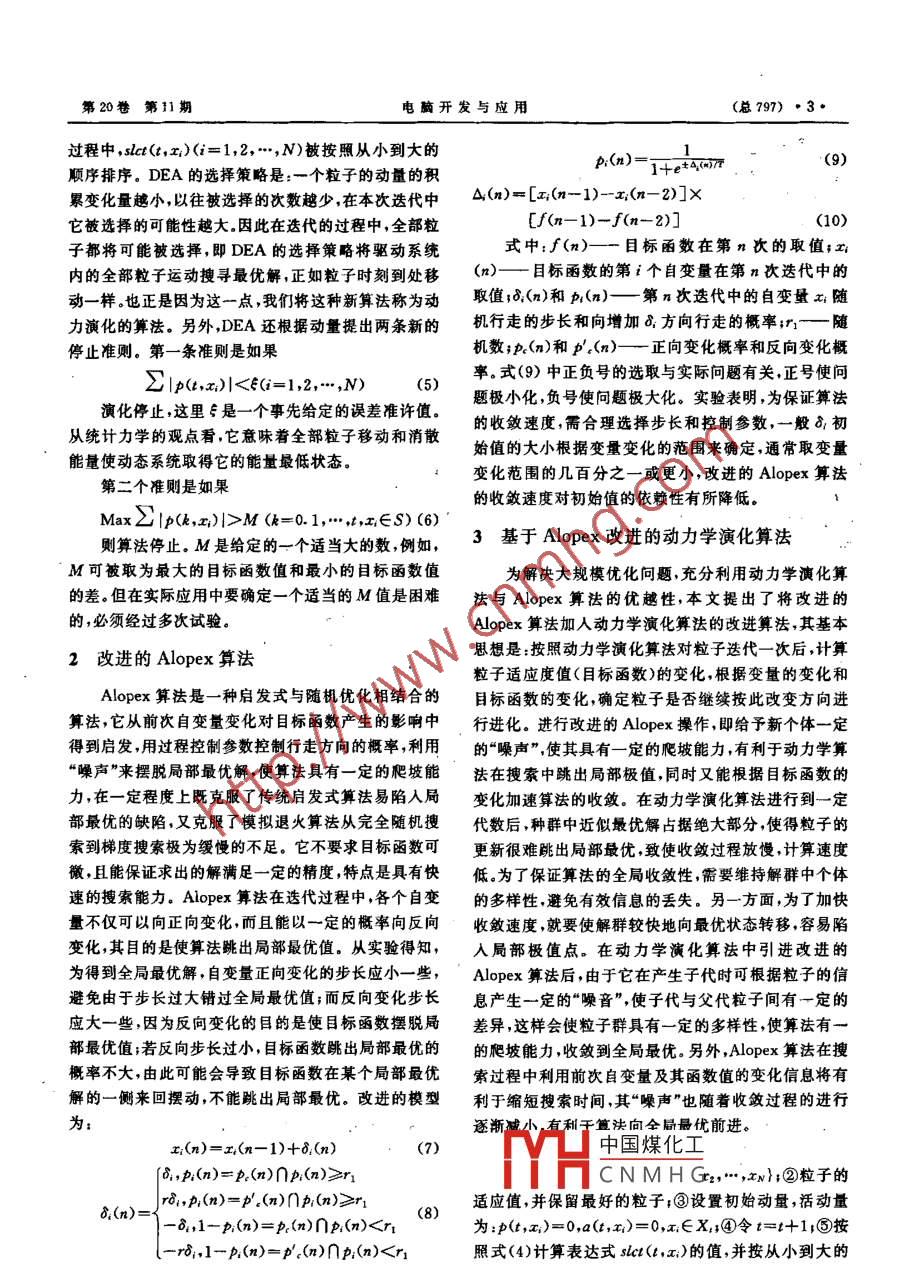 ·2·(總796)利用 Alopex改進(jìn)的動(dòng)力學(xué)演化算法2007年文章編號(hào):1003-5850(2007)11-000204利用 Alopex改進(jìn)的動(dòng)力學(xué)演化算法An Dynamical Evolutionary Algorithm Improved by alopex姜欹1樂(lè)慶玲(武漢科技大學(xué)計(jì)算機(jī)學(xué)院武漢430081)(2湖北大學(xué)武漢430062)摘要】通過(guò)將動(dòng)力學(xué)演化算法( Dynamical Evolutionary Algorithm,DEA)與一種隨機(jī)優(yōu)化方法—— Alopex算法相結(jié)合,提出一種改進(jìn)的動(dòng)力學(xué)演化算法。改進(jìn)的算法改善了動(dòng)力學(xué)演化算法擺脫局部極小點(diǎn)的能力,對(duì)典型函數(shù)的測(cè)試表明:改進(jìn)算法的全局搜索能力有了顯著提高,特別是對(duì)多峰函數(shù)能鈔有效地避免早熟收斂問(wèn)題【關(guān)鍵詞】動(dòng)力學(xué)演化算法, Alopex,進(jìn)化計(jì)算中圖分類(lèi)號(hào):TP301.6文獻(xiàn)標(biāo)識(shí)碼:AABSTRACT A stochastic optimization algorithm is proposed by combining dynamical evolutionary algorithm (DEA)with Alopexalgorithm that is a stochastic optimization method. The proposed algorithm improves the ability of breaking away from localminima. The experiment results demonstrate that the proposed algorithm is superior to the original dynamical evolutionaryKEYWORDS dynamical evolutionary algorithm, Alopex, evolutionary computation從20世紀(jì)90年代初期開(kāi)始,演化計(jì)算與生物學(xué);群描述成一個(gè)動(dòng)力系統(tǒng),種群中的所有個(gè)體被看成是計(jì)算機(jī)科學(xué)數(shù)學(xué)物理學(xué)以及其他學(xué)科的交叉研究在動(dòng)力學(xué)中相互作用的粒子,它們的宏觀行為可描述成理論和應(yīng)用方面都取得了很大進(jìn)展,但是仍然有一些一個(gè)微分方程系統(tǒng)將這個(gè)系統(tǒng)和算法策略合并在問(wèn)題尚未解決,首先是過(guò)早收斂(在演化早期階段喪失起,定義了演化算法的一個(gè)最優(yōu)控制問(wèn)題。利用最優(yōu)控種群的多樣性),以及缺乏合適的停止準(zhǔn)則的問(wèn)題。參制理論中的 Pontryagin最大值原理,對(duì)演化算法進(jìn)考文獻(xiàn)[5]中提出了一種基于統(tǒng)計(jì)力學(xué)理論的動(dòng)力學(xué)行了最優(yōu)軌線(xiàn)分析,提出了演化算法的最優(yōu)軌線(xiàn)理論,演化算法(DEA)。它把種群看作一個(gè)動(dòng)力學(xué)系統(tǒng),把定義了一個(gè)起核心作用的 Hamilton函數(shù)。種群中的個(gè)體看作是粒子,系統(tǒng)中每個(gè)粒子有一個(gè)動(dòng)設(shè)有一個(gè)最小值優(yōu)化問(wèn)題量P(,x)和一個(gè)活動(dòng)量a(t,xi)以模擬分子運(yùn)動(dòng)這ninf(x)(x∈s)兩個(gè)參數(shù)聯(lián)合控制選擇操作并驅(qū)使粒子在解空間內(nèi)移f(x)是目標(biāo)函數(shù),S是它的可行的解的集合動(dòng)搜尋,提出了基于最優(yōu)控制論的兩個(gè)停止準(zhǔn)則來(lái)測(cè)在DEA中,將N個(gè)已編碼的解類(lèi)比為動(dòng)力學(xué)系試系統(tǒng)是否在統(tǒng)計(jì)力學(xué)意義上取得它的最低的能量或統(tǒng)中的粒子x1,x2,x3,…,x。演化算法中的演化代數(shù)者最大的熵的狀態(tài)。在此記為時(shí)間L。下面介紹一下動(dòng)力學(xué)演化算法中的盡管DEA已被成功地應(yīng)用于各種優(yōu)化問(wèn)題及實(shí)相關(guān)概念際工程領(lǐng)域但是當(dāng)面對(duì)復(fù)雜的優(yōu)化問(wèn)題,尤其是多粒子x在t時(shí)刻的動(dòng)量p(t,x)被定義為峰、多極值的多模態(tài)函數(shù)優(yōu)化問(wèn)題時(shí),由于目標(biāo)問(wèn)題存p(, ti)=f(u,xi)-f(t-1,x在著眾多的局部極值因此不可避免地存在著早熟、收∫(t,x)是在t時(shí)刻時(shí)粒子x的目標(biāo)函數(shù)值斂速度慢等缺陷。為提高動(dòng)力學(xué)演化算法對(duì)復(fù)雜問(wèn)題定義了一個(gè)活動(dòng)量a(t,x),如果在t時(shí)刻x被選全面最優(yōu)解的探測(cè)能力,本文提出了將DEA與擇參加進(jìn)化操作,則粒子x在t時(shí)刻的活動(dòng)量被定義Alopex相結(jié)合的思想,并設(shè)計(jì)和實(shí)現(xiàn)了算法。通過(guò)實(shí)為a(,x)=a(-1,xz)+1驗(yàn)證明,這一方法能夠提高DEA的全局收斂性能否則保持不變綜合這兩個(gè)參數(shù)我們定義了一個(gè)新的選擇策略1動(dòng)力學(xué)演化算法(DEA)sla(t,x)=λ∑|p(k,x)1+(1-x)a(,x)動(dòng)力學(xué)演化算法(DEA)最初是由武漢大學(xué)李元(k=0,1,…,t)(4香教授于2002年提出,其基本思想是將演化算法的種中國(guó)煤化工條件的比重。在選代CNMHG2007-08-27收到,2007-09-25改回·基金項(xiàng)目:武漢科技大學(xué)青年基金資助項(xiàng)目(No.2006XY22)“作者簡(jiǎn)介:姜毅,男1978年生,講師在讀博士,研究方向:智能計(jì)算。第20卷第11期電腦開(kāi)發(fā)與應(yīng)用總797)·3·過(guò)程中,slct(t,x)(=1,2,…,N)被按照從小到大的P: (n)順序排序。DEA的選擇策略是:一個(gè)粒子的動(dòng)量的積1+e+4, 7T累變化量越小,以往被選擇的次數(shù)越少,在本次迭代中△(n)=[x;(n-1)-x(n-2)]它被選擇的可能性越大因此在選代的過(guò)程中,全部粒[f(n-1)-f(n-2)]子都將可能被選擇,即DEA的選擇策略將驅(qū)動(dòng)系統(tǒng)式中:f(n)—一目標(biāo)函數(shù)在第n次的取值;x內(nèi)的全部粒子運(yùn)動(dòng)搜尋最優(yōu)解,正如粒子時(shí)刻到處移(n)—目標(biāo)函數(shù)的第個(gè)自變量在第n次迭代中的動(dòng)一樣。也正是因?yàn)檫@一點(diǎn)我們將這種新算
