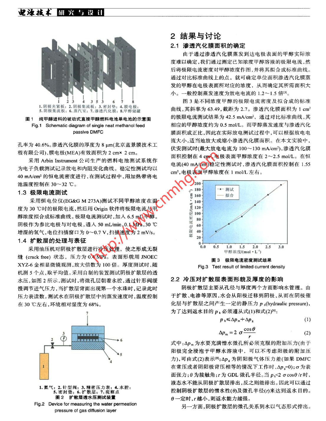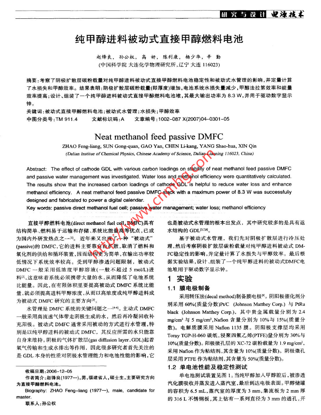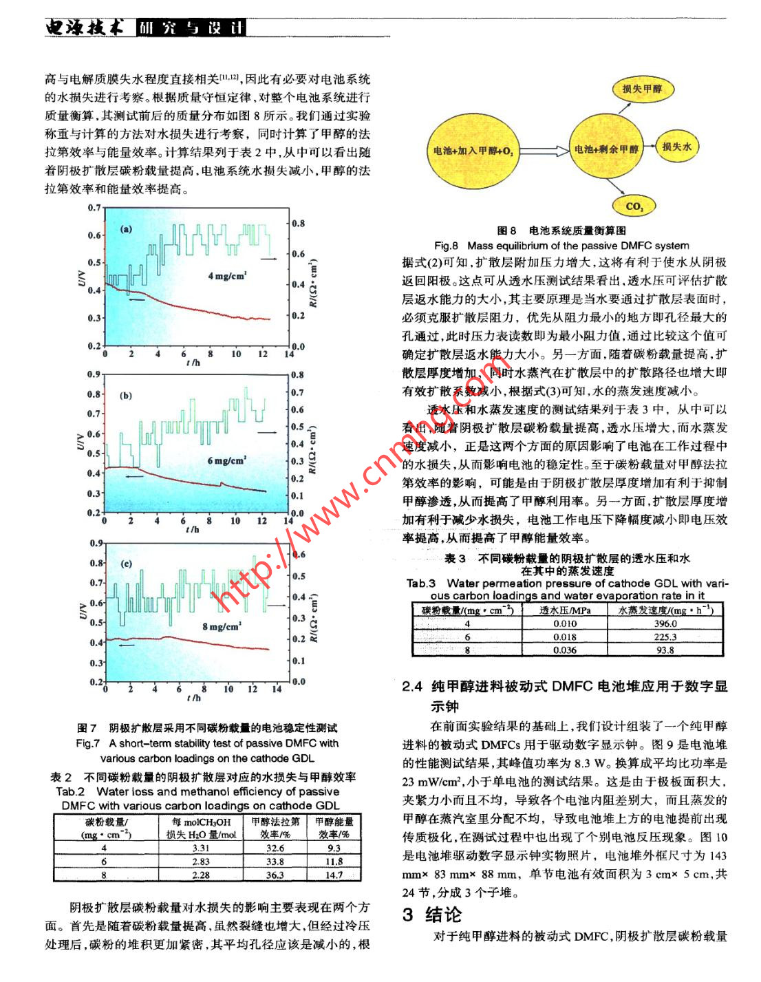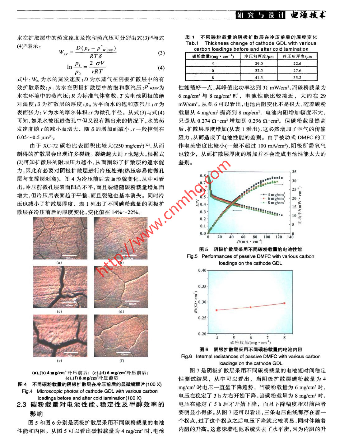 研究與設(shè)迅電源技術(shù)純甲醇進(jìn)料被動式直接甲醇燃料電池趙鋒良,孫公權(quán),高妍,陳利康,楊少華,辛勤(中國科學(xué)院大連化學(xué)物理研究所,遼寧大連116023)摘要:考察了陰極擴(kuò)散層碳粉載量對純甲醇進(jìn)料被動式直接甲醇燃料電池穩(wěn)定性和被動式水管理的影響,并定量計(jì)算了水損失和甲醇效率。結(jié)果表明:陰極擴(kuò)散層碳粉載量(即厚度)增加,電池系統(tǒng)水損失量減少,甲醇法拉第效率和能量效率提高;設(shè)計(jì)、組裝了一個(gè)純甲醇進(jìn)料被動式直接甲醇燃料電池堆,其最大輸出功率為8.3W,并用于驅(qū)動數(shù)字顯示鐘。關(guān)鍵詞:被動式直接甲醇燃料電池;被動式水管理;水損失;甲醇效率中圖分類號:TM 911.4文獻(xiàn)標(biāo)識碼:A文章編 號:1002-087 X(2007)04- -0301-05Neat methanol feed passive DMFCZHAO Feng-liang, SUN Gong quan, GAO Yan, CHEN Li-kang, YANG Shao-hua, XIN Qin(Dalian Institue of Chemical Physics, Chinese Academy of Science, Dalian Liaoning 116023, China)Abstract: The effect of cathode GDL with various carbon loadings on stability of neat methanol feed passive DMFCand passive water management was investigated. Water loss and methanol efficiency were quantitatively calculated.The results show that the increased carbon loadings of cathode GDL is helpfut to reduce water loss and enhancemethanol efficiency. A neat methanol feed passive DMFC stack with a maximum power of 8.3 W was successfullydesigned and fabricated to power a digital calendar.Key words: passive direct methanol fuel cell; passive water management; water loss; methanol efficiency直接甲醇燃料電池(direct methanol fuel cell, DMFC)具有也是被動式水管理的根本出發(fā)點(diǎn),其中研究較多的是具有返結(jié)構(gòu)簡單燃料易于運(yùn)輸和存儲、系統(tǒng)比能量高等優(yōu)點(diǎn),已成水結(jié)構(gòu)的GDLD.7M。為國內(nèi)外研發(fā)熱點(diǎn)之一。近年來又出現(xiàn)了一種“被動式”基于被動式水管理,我們先對陰極擴(kuò)散層進(jìn)行冷壓處(passive)的DMFC,它的進(jìn)料主要靠自由擴(kuò)散,取消了燃料和理,然后考察陰極擴(kuò)散層碳粉載量對純甲醇進(jìn)料被動式DM-氧化劑的供給和循環(huán)裝置,因而結(jié)構(gòu)更為簡單,在輸出功率較FC穩(wěn)定性的影響,并定量計(jì)算了水損失與甲醇效率。最后根低情況下系統(tǒng)效率較高。受到甲醇滲透問題限制,被動式據(jù)實(shí)驗(yàn)結(jié)果,設(shè)計(jì)、組裝了一個(gè)純甲醇進(jìn)料的被動式DMFC電DMFC-般采用低濃度甲醇溶液(- - 般不超過5 molL)進(jìn)池堆用于驅(qū)動數(shù)字顯示鐘。料,這意味著系統(tǒng)必須攜帶大量的水,從而降低了電池系統(tǒng)1實(shí)驗(yàn)比能量。因此,在有限體積里要提高被動式DMFC系統(tǒng)比能1.1膜電極制備,量,就必須提高進(jìn)料甲醇濃度,從而以高濃度或純甲醇進(jìn)料成采用轉(zhuǎn)壓法(decal method)制備膜電極。陰陽極催化劑分為被動式DMFC研究的主要方向”。水管理是DMFC系統(tǒng)的關(guān)鍵問題之_1。主動式DMFC別采用60%(質(zhì)量分?jǐn)?shù))PvC (Johnson Matthey Corp.)與PtRu一般采用高流 速氣體帶走陰極生成的水,然后再冷凝回收補(bǔ)black (Johnson Matthey Corp.),其中貴金屬載量分別為2.4充陽極。被動式DMFC通常采用被動的方式進(jìn)行水管理,特mg/cm2與5 mg/cm?,Nafion含量分別為10%與15%(質(zhì)量分別是以純甲醇進(jìn)料的被動式DMFC,其反應(yīng)所需的水只能靠數(shù))。電解質(zhì)膜采用Nafion1135膜。陰陽極支撐層均采用自身來維持。陰極的氣體擴(kuò)散層(gas difusion layer , GDL)起著Toray TGP-H-060碳紙,浸聚四氟乙烯(PTFE)量分別為30%與氧氣傳輸和生成水排出等作用,因此很多研究者首先關(guān)注的10%(質(zhì)量分?jǐn)?shù))。陽極微孔層的XC-72碳粉載量為1.9 mg/cm',是GDL本身的性質(zhì)對陰極水管理能力和電池性能的影響,它采用Nafion作為粘結(jié)劑,其含量為10%(質(zhì)量分?jǐn)?shù))。陰極微孔層采用PTFE作為粘結(jié)劑,其含量為50%(質(zhì)量分?jǐn)?shù))。1.2單電池性能及穩(wěn)定性測試收稿日期:2006- -12- -05作者簡介:趙鋒良(1977--),男,福建省人,碩士生,主要研究方向單電池測試裝置見圖1。當(dāng)純甲醇加人甲醇腔后,被滲透為直接甲醇燃料電池。汽化膜吸收并蒸發(fā)進(jìn)入蒸汽室,最后到達(dá)電極表面。甲醇儲罐Biography: ZHAO Feng- liang (1977- -),male, candidate for的容積為6.5 mL,蒸汽室的厚度為3 mm,集流板為2 mm厚master.的316L不銹鋼板,其上鉆有--系列直徑為3mm的通孔,開聯(lián)系人:孫公權(quán)3012007.4 Vol.31 No.4電源技術(shù)研究馬設(shè)證2結(jié)果與討論2.1滲透汽化膜面積的確定由于通過滲透汽化膜蒸發(fā)到達(dá)電極表面的甲醇實(shí)際濃度難以確定,我們通過測定已知濃度甲醇溶液的極限電流,然后將極限電流密度對甲醇濃度作圖,并將其擬合成標(biāo)準(zhǔn)曲線。通過對比標(biāo)準(zhǔn)曲線上的點(diǎn),就可確定單位面積滲透汽化膜蒸發(fā)的甲醇在電極表面所對應(yīng)的濃度,從而確定其所需面積大小。一般控制蒸發(fā)速度為放電電流的1.2~1.5 倍P)。圖3是不同濃度甲醇的極限電流密度及擬合成的標(biāo)準(zhǔn)5.陰極集流板: 6.燕汽室: 7.滲透汽化膜: 8.甲醇儲罐曲線,其斜率為63.49 ,截距為2.7。滲透汽化膜面積為1 cm2圖1 純甲醇進(jìn)料的被動式直接甲醇燃料電池單電池的示意圉的極限電流測試結(jié)果為42.5 mA/cm2
